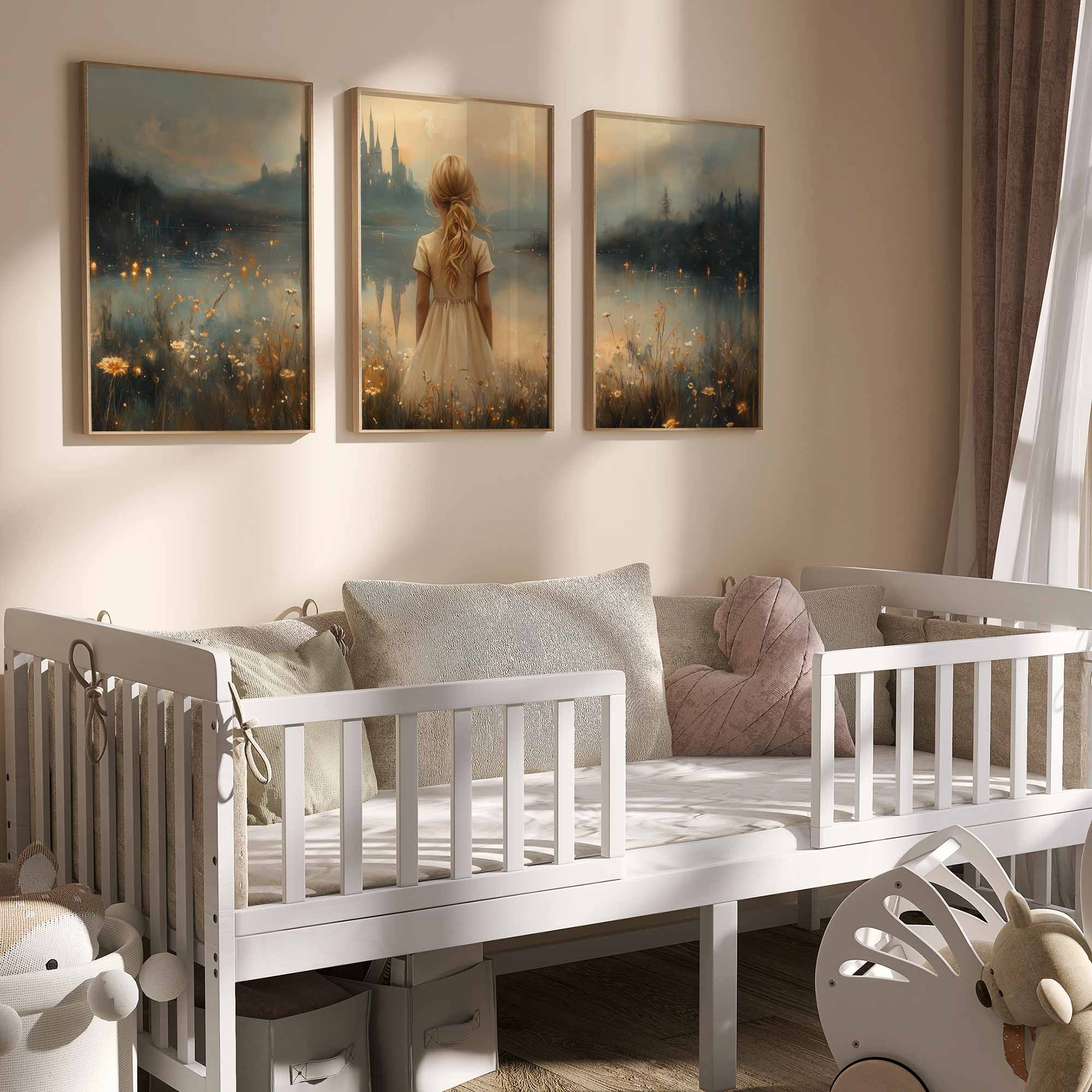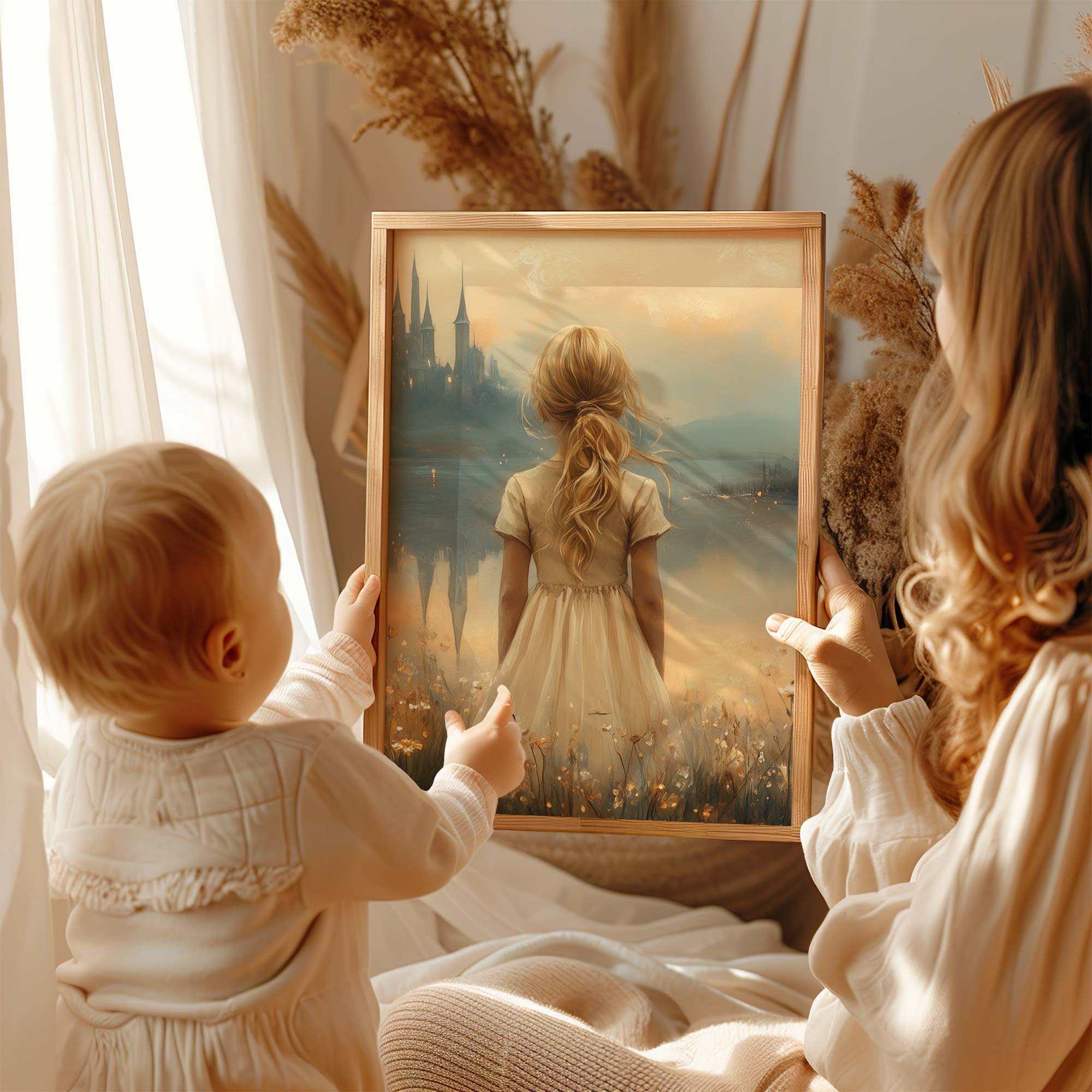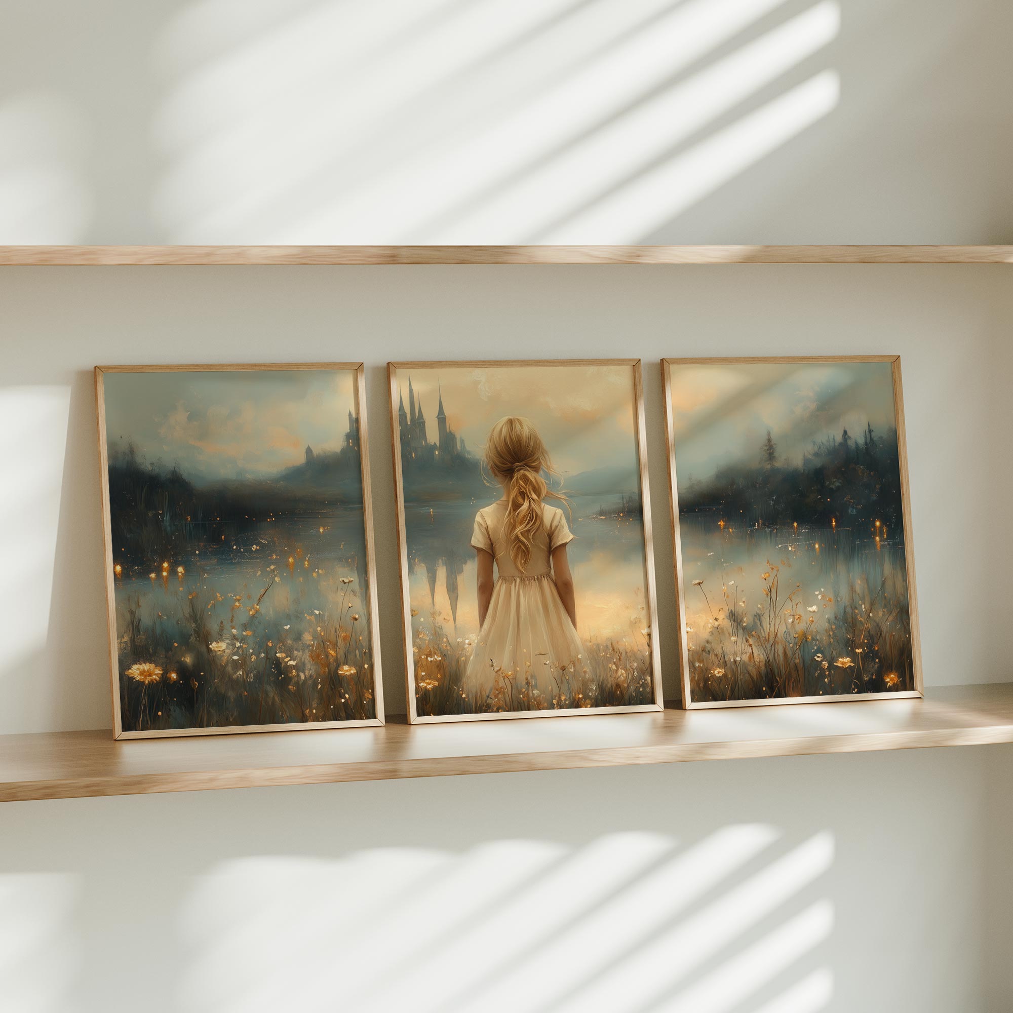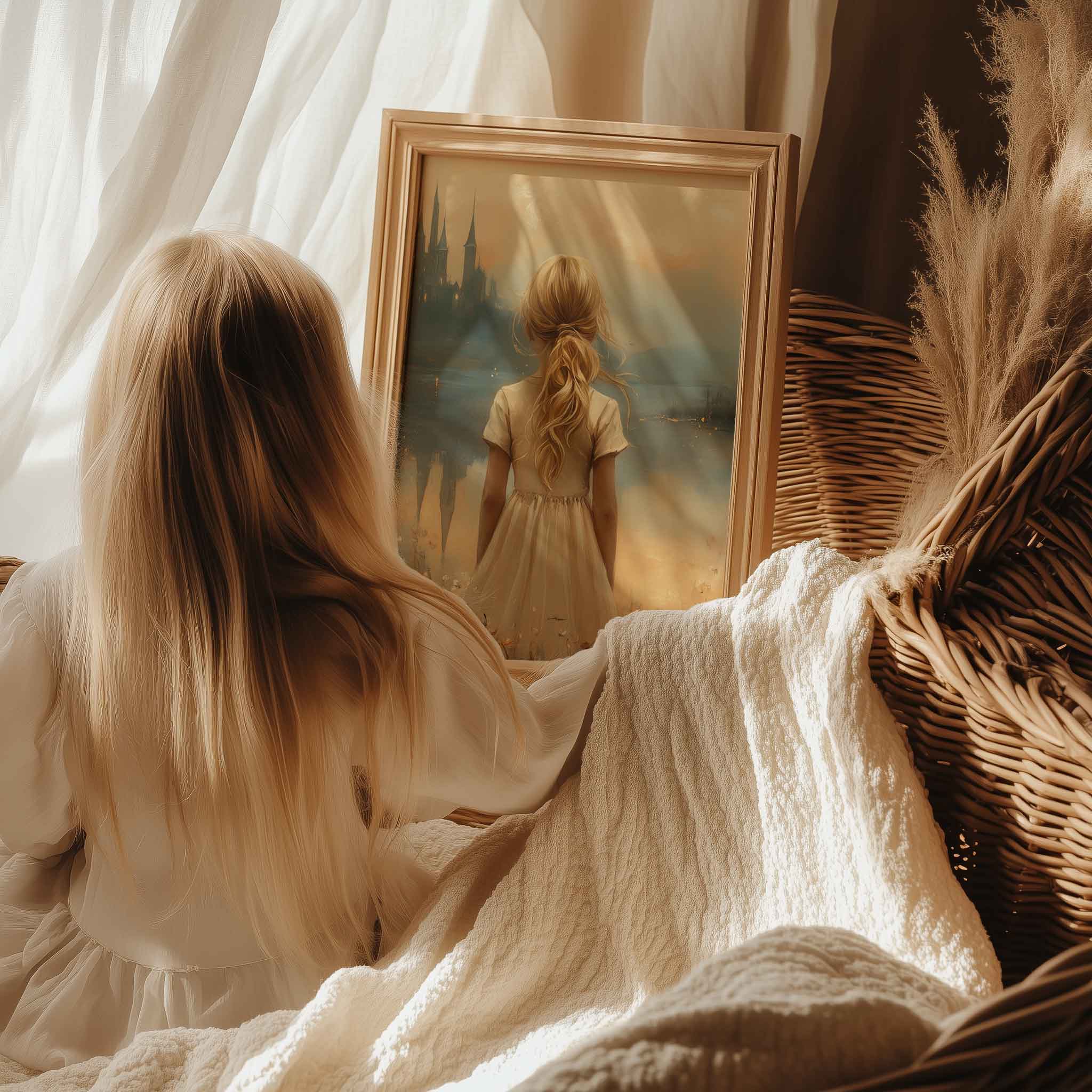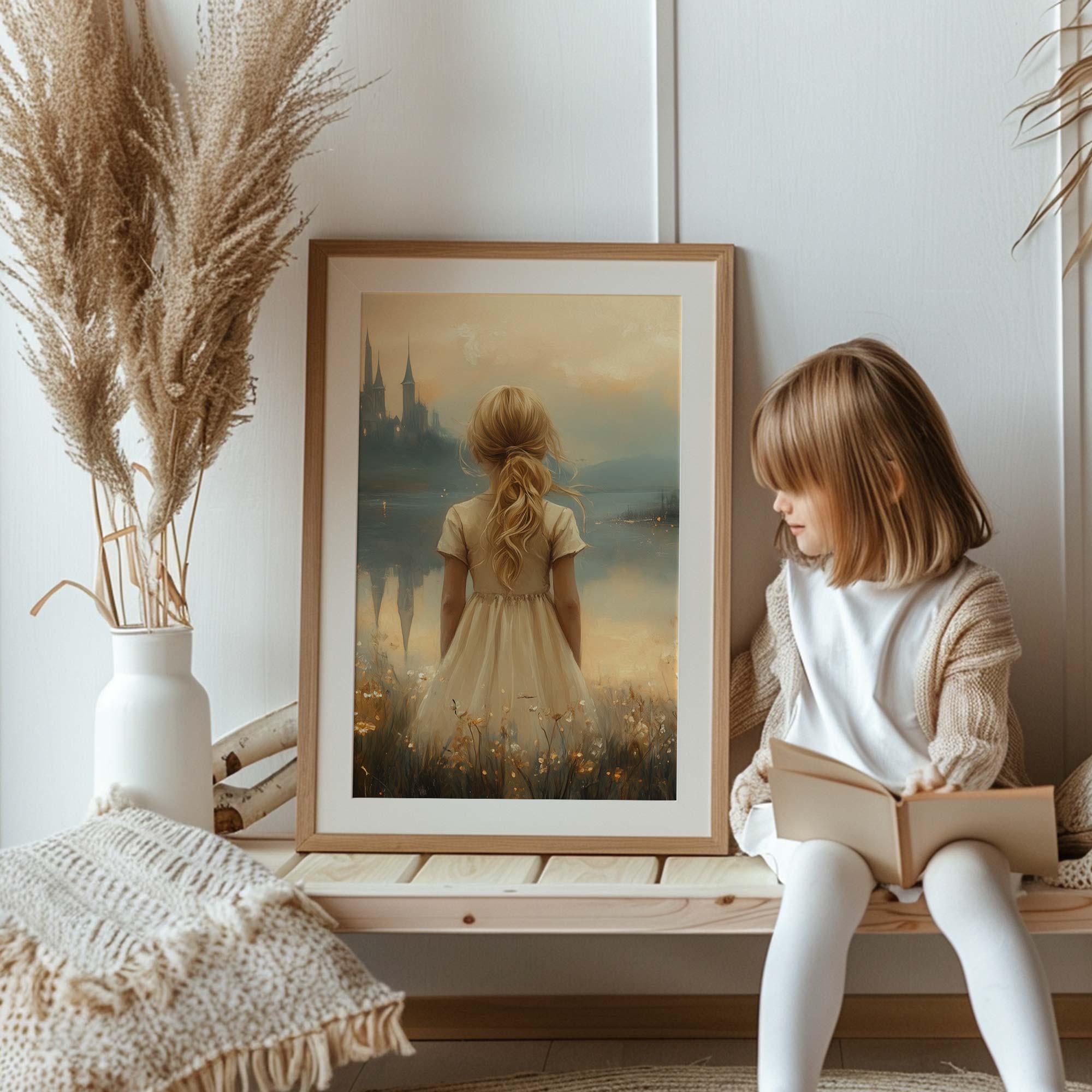Terug naar collectie Posters Sprookjesachtig Meisje in Bloemenveld bij Kasteel