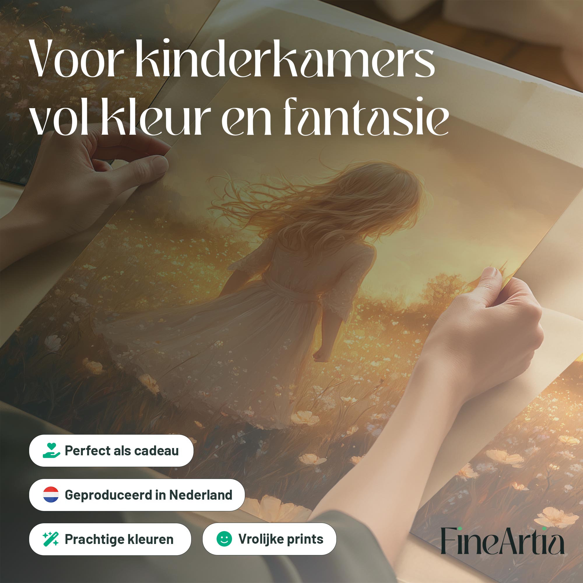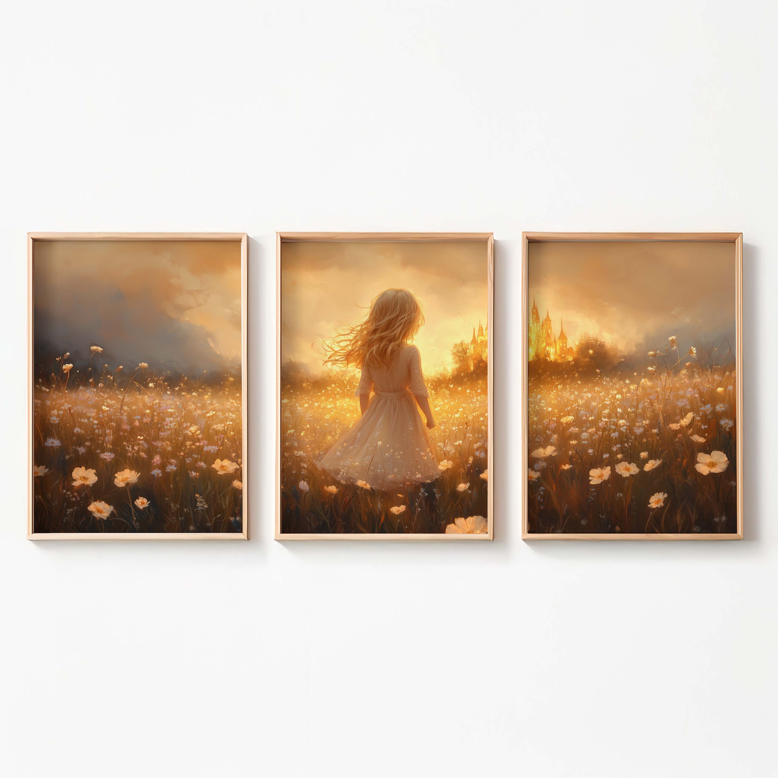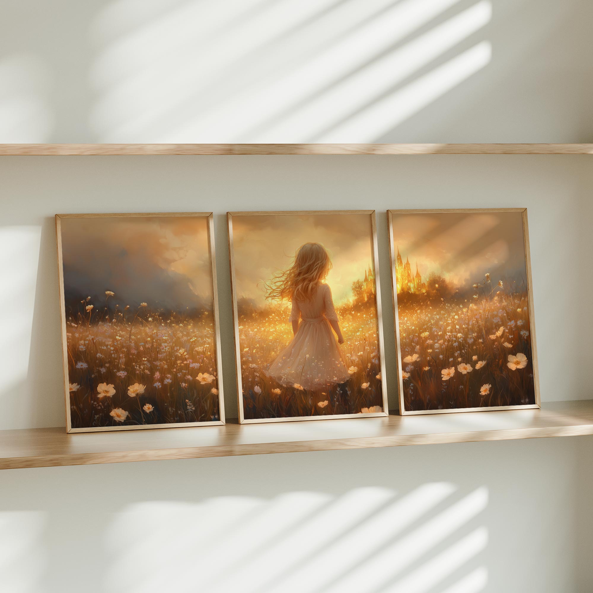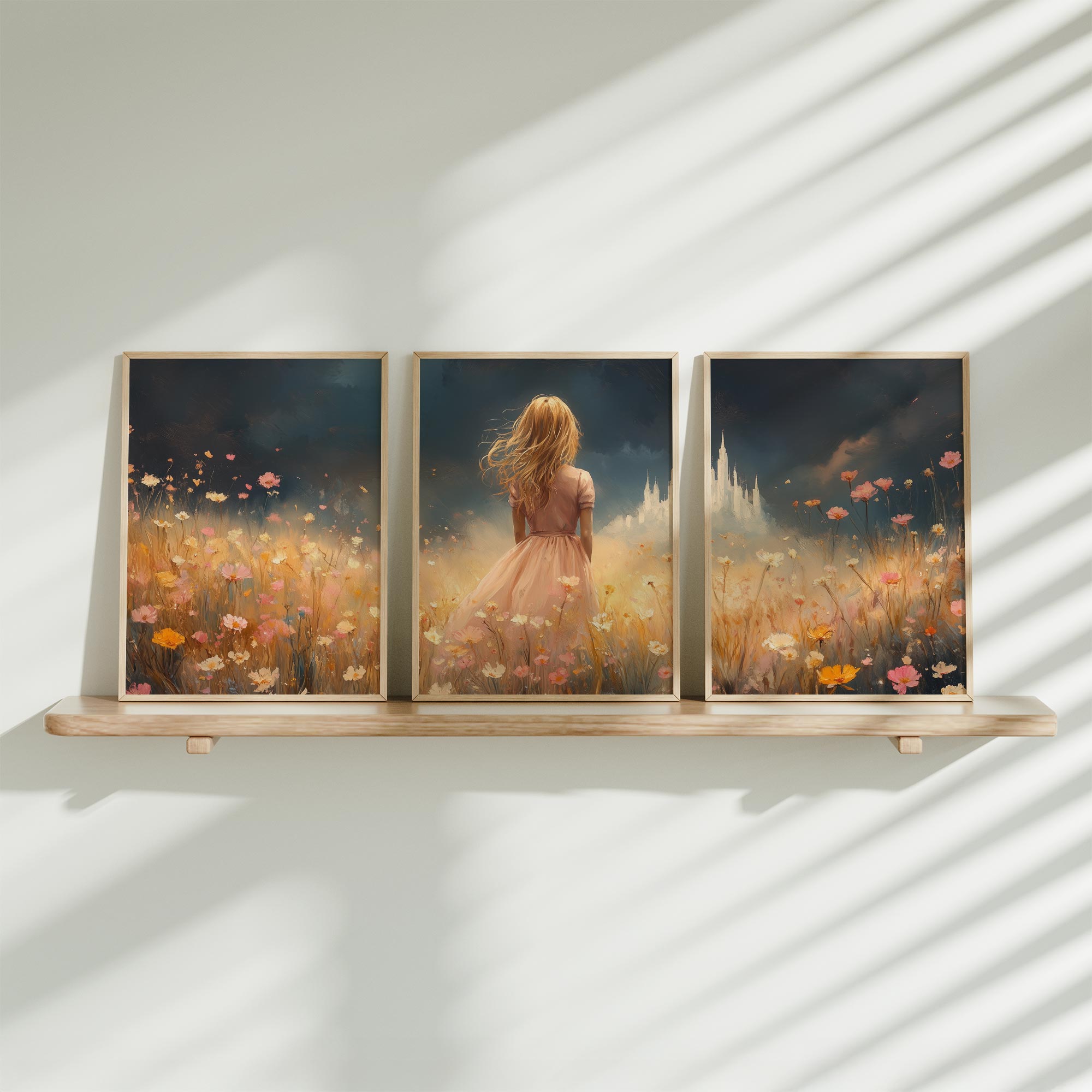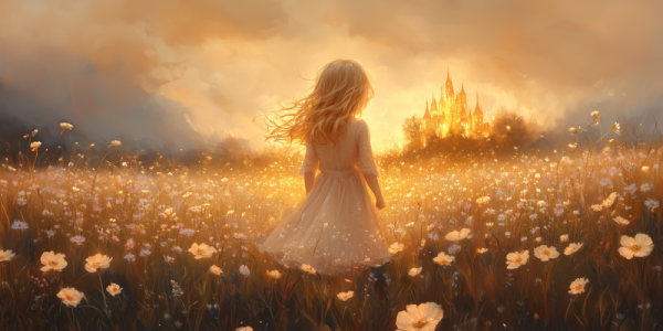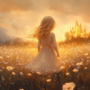 Sprookjesachtig Meisje in Bloemenveld met Kasteel