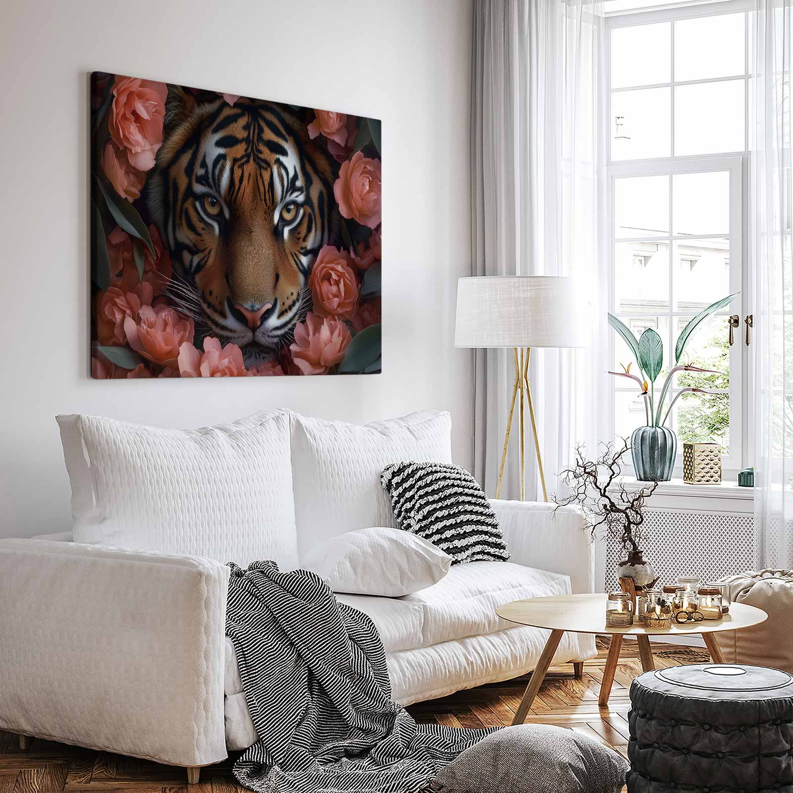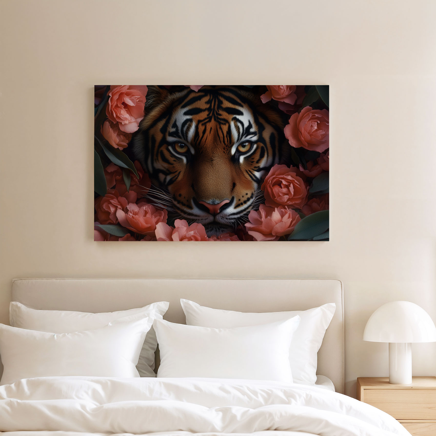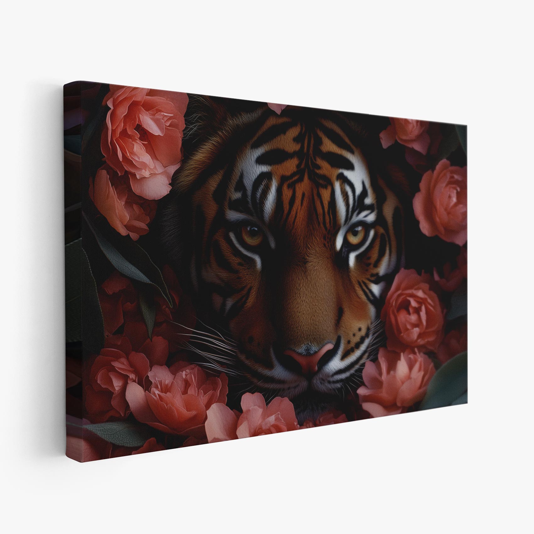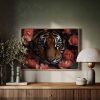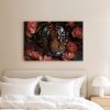 Terug naar collectie Canvas Tijger tussen roze bloemen