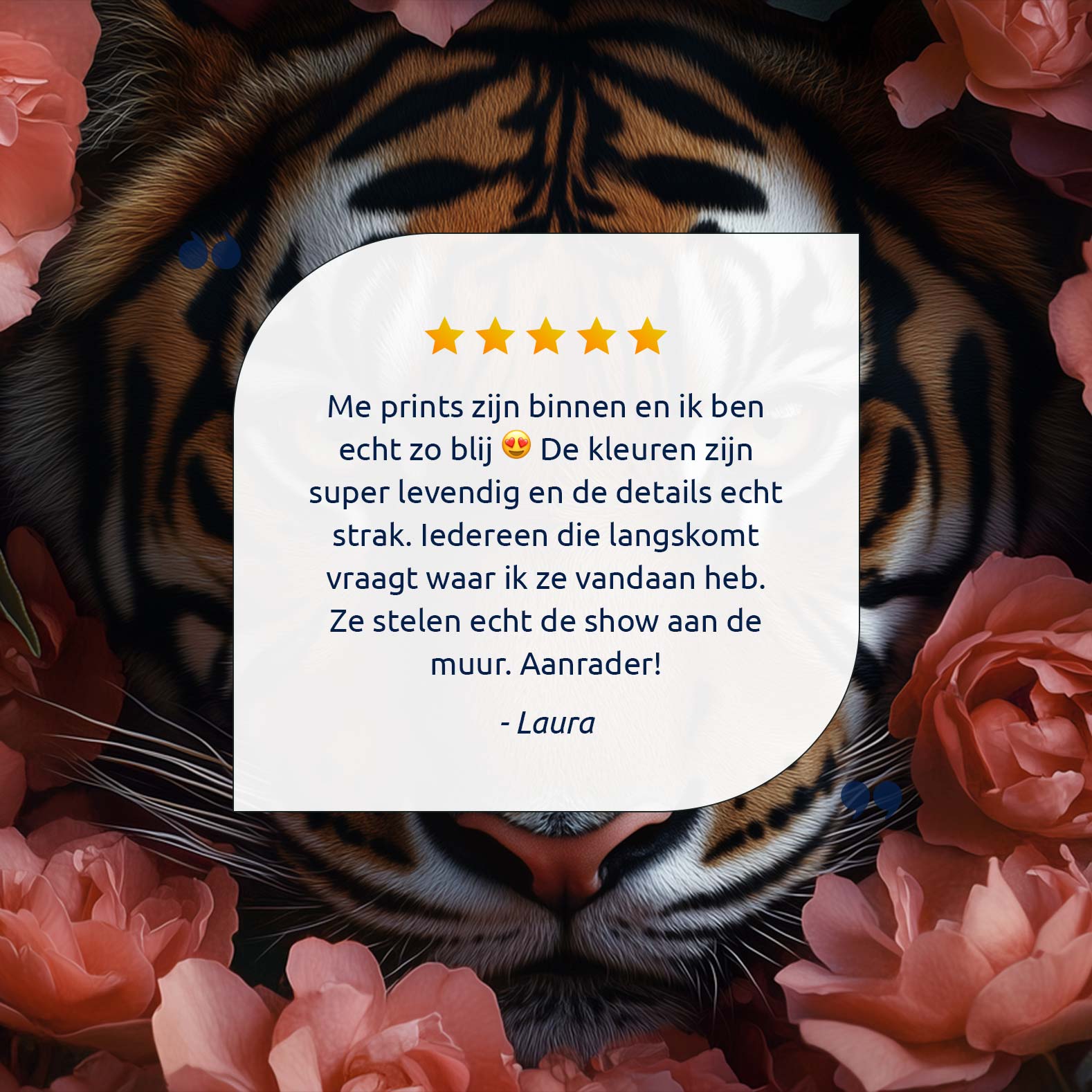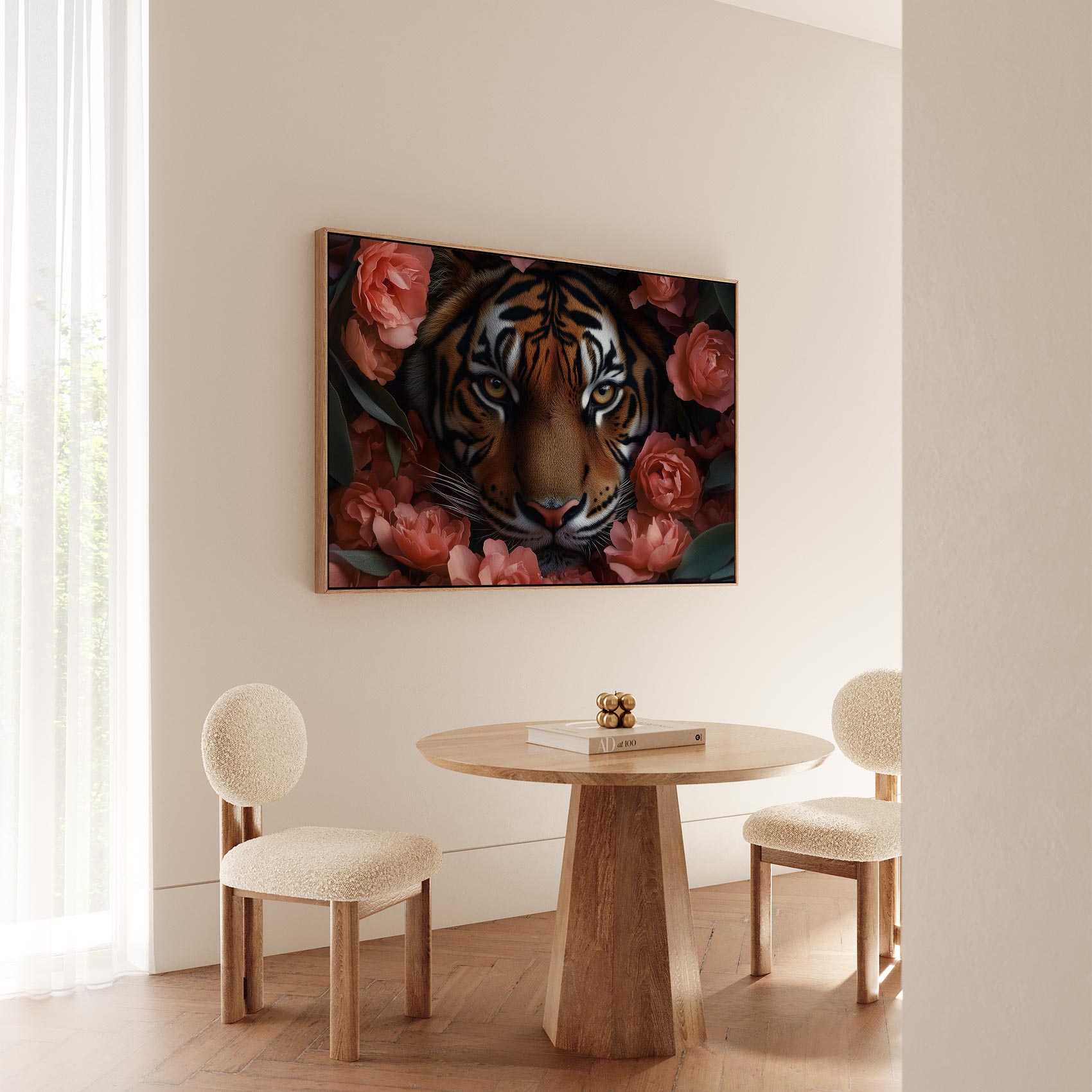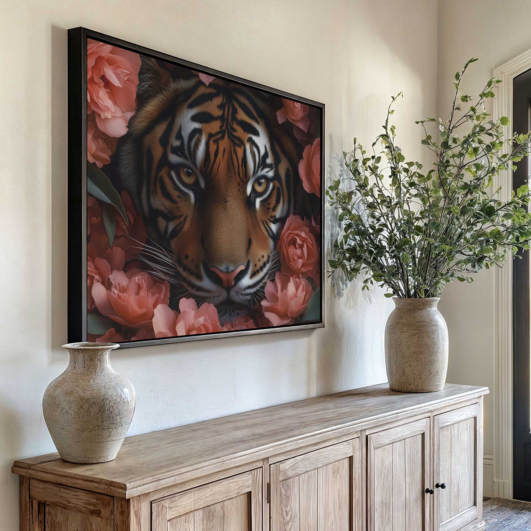 Terug naar collectie Canvas Tijger tussen roze bloemen