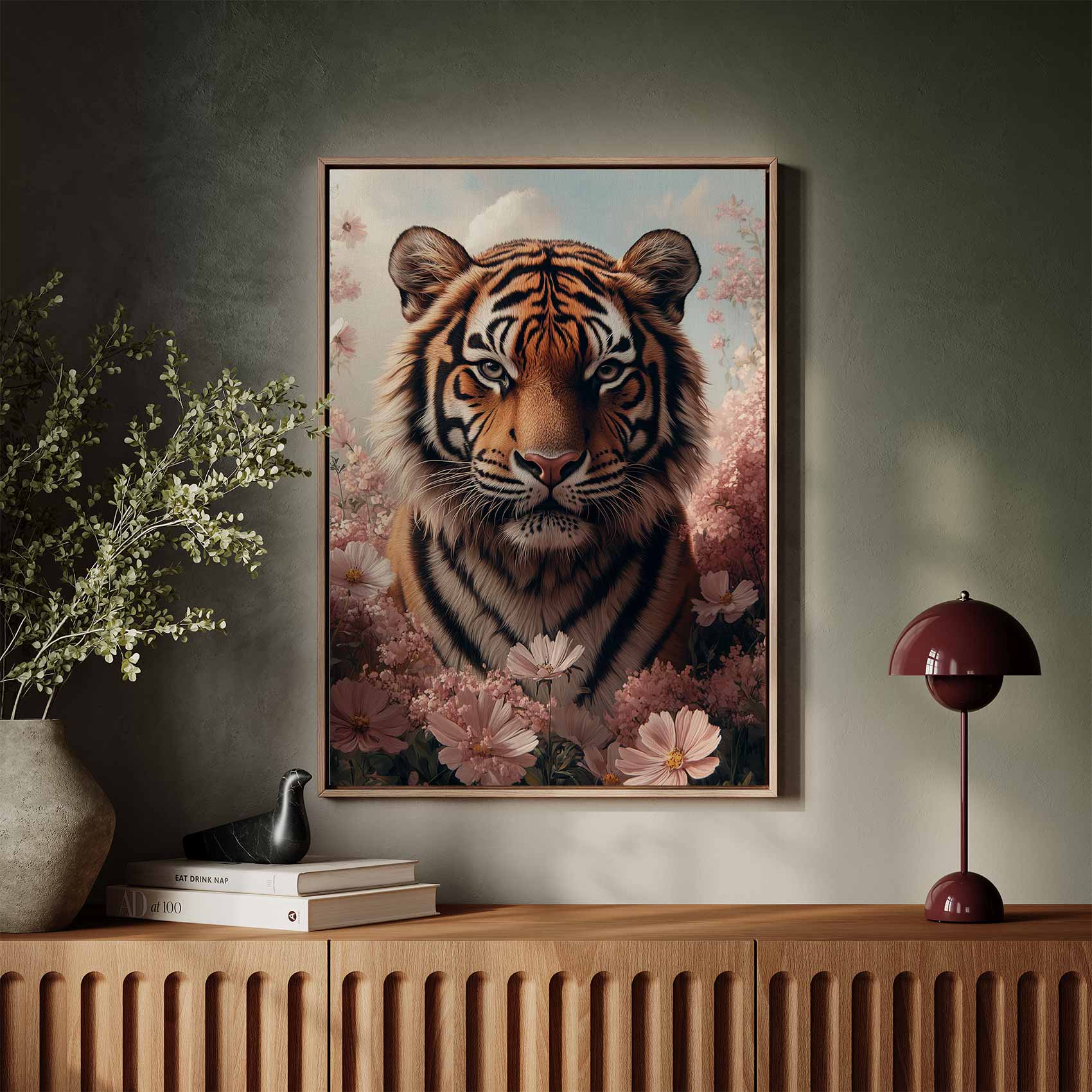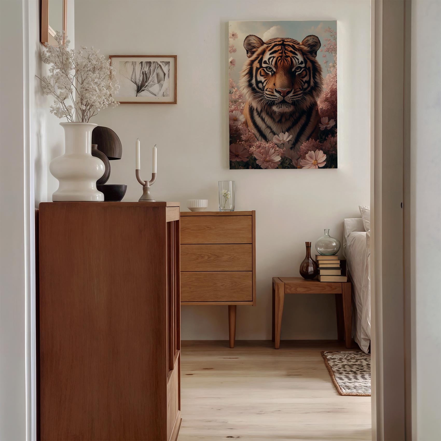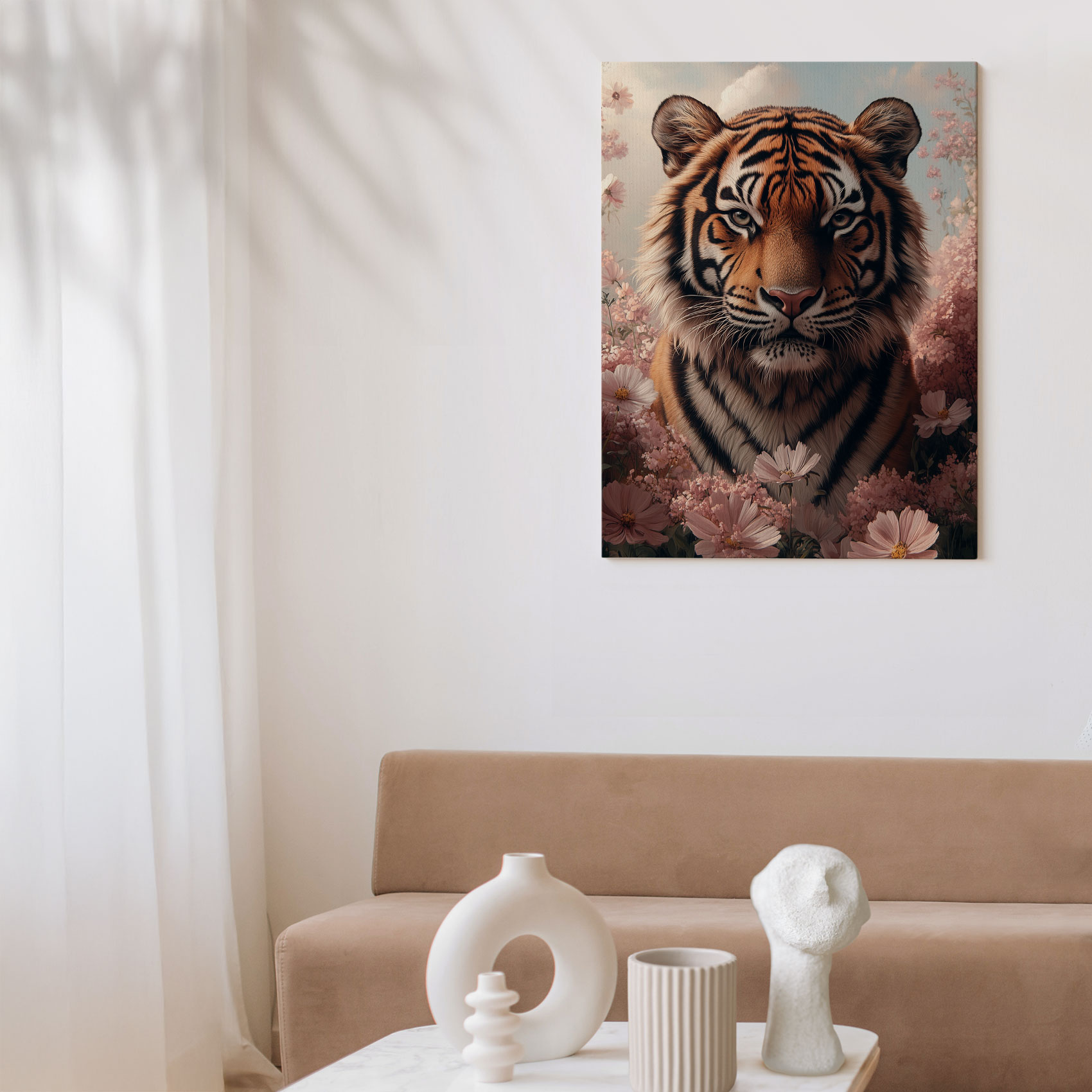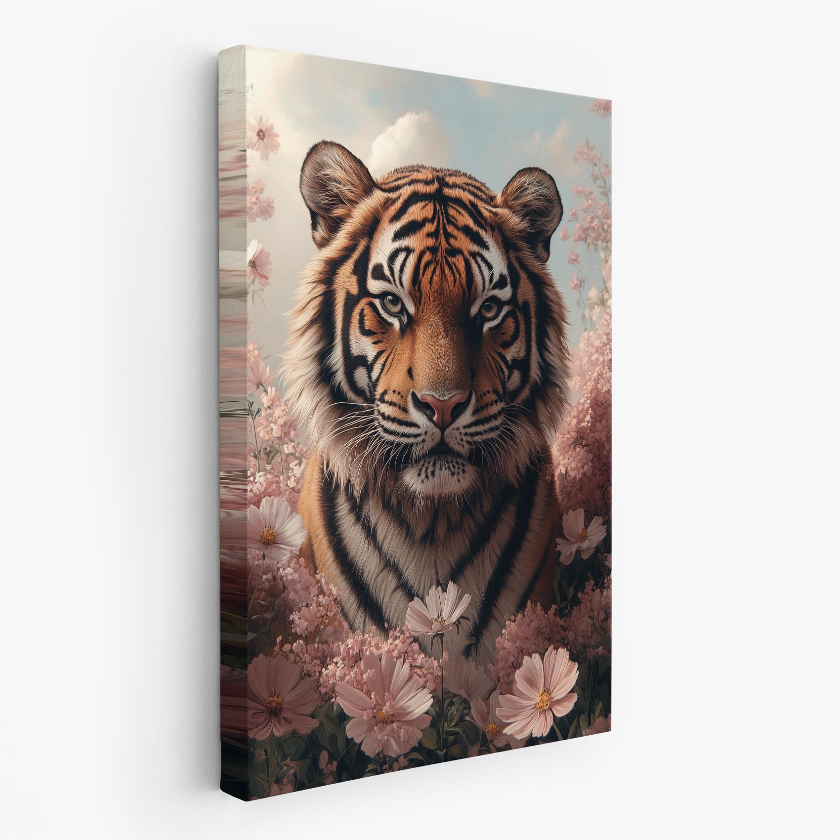 Terug naar collectie Canvas Tijger tussen roze bloemen