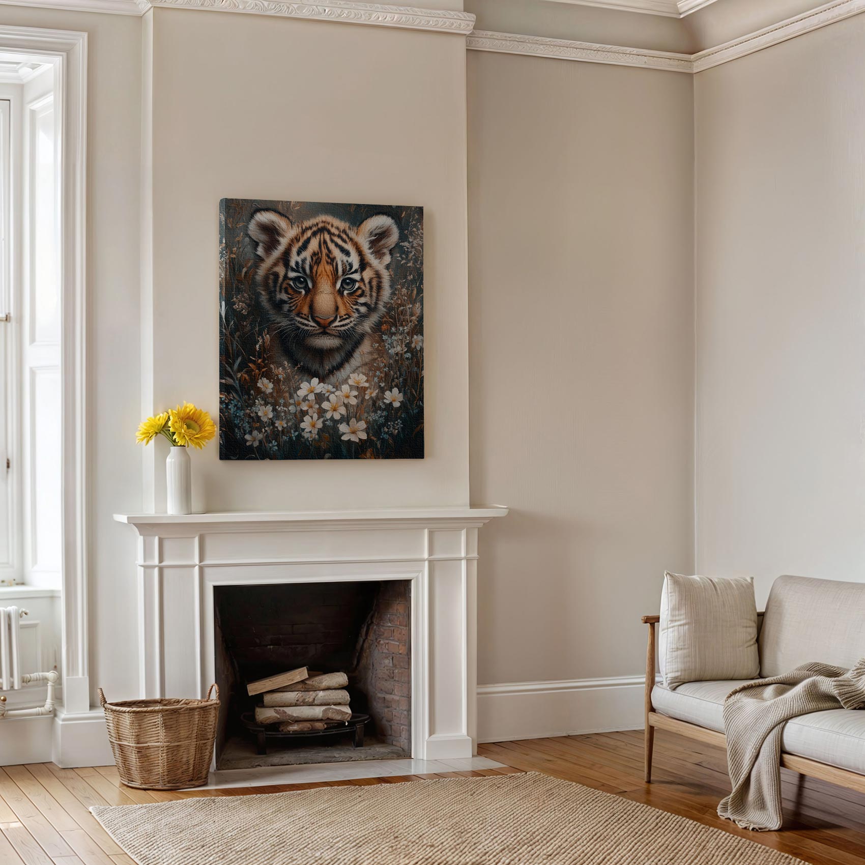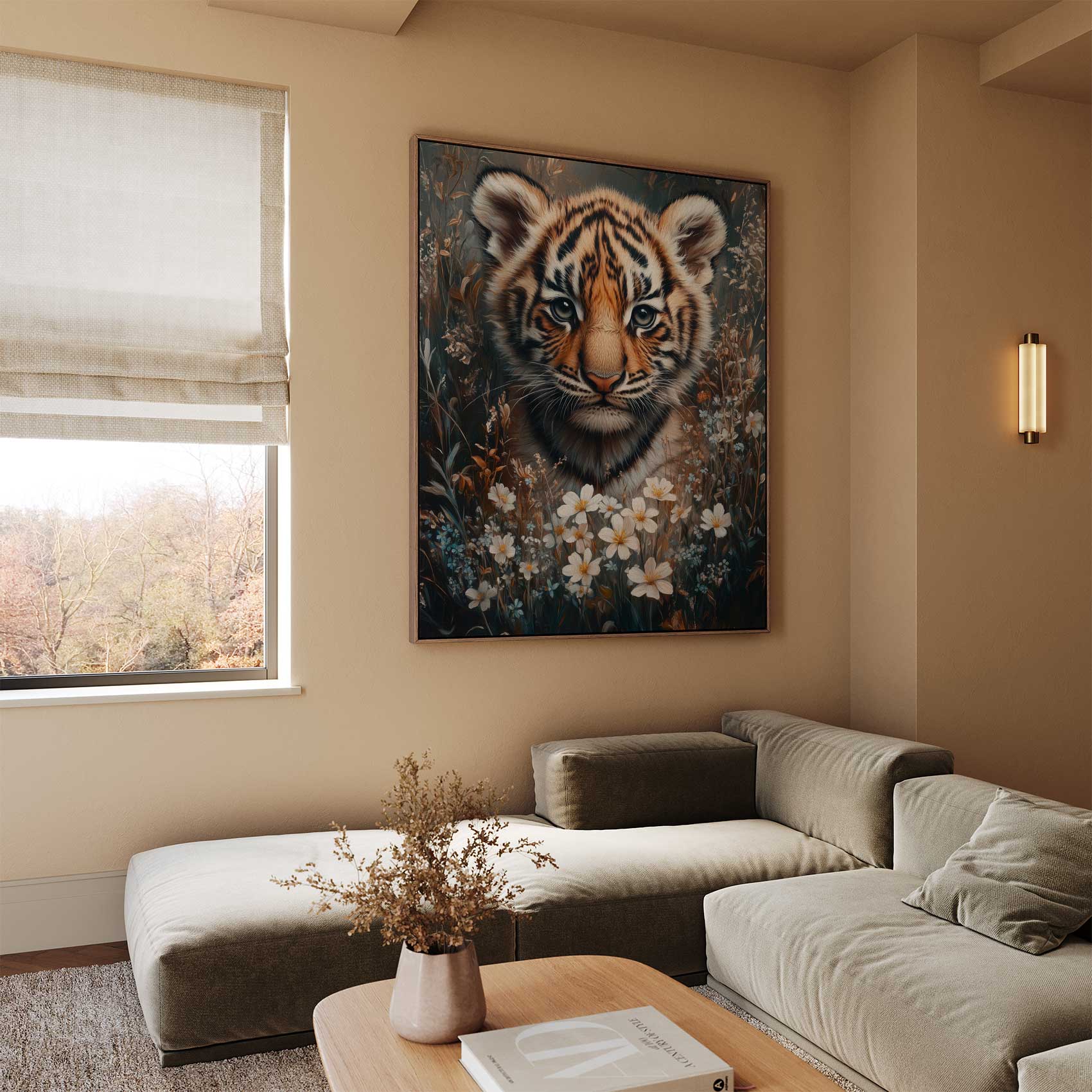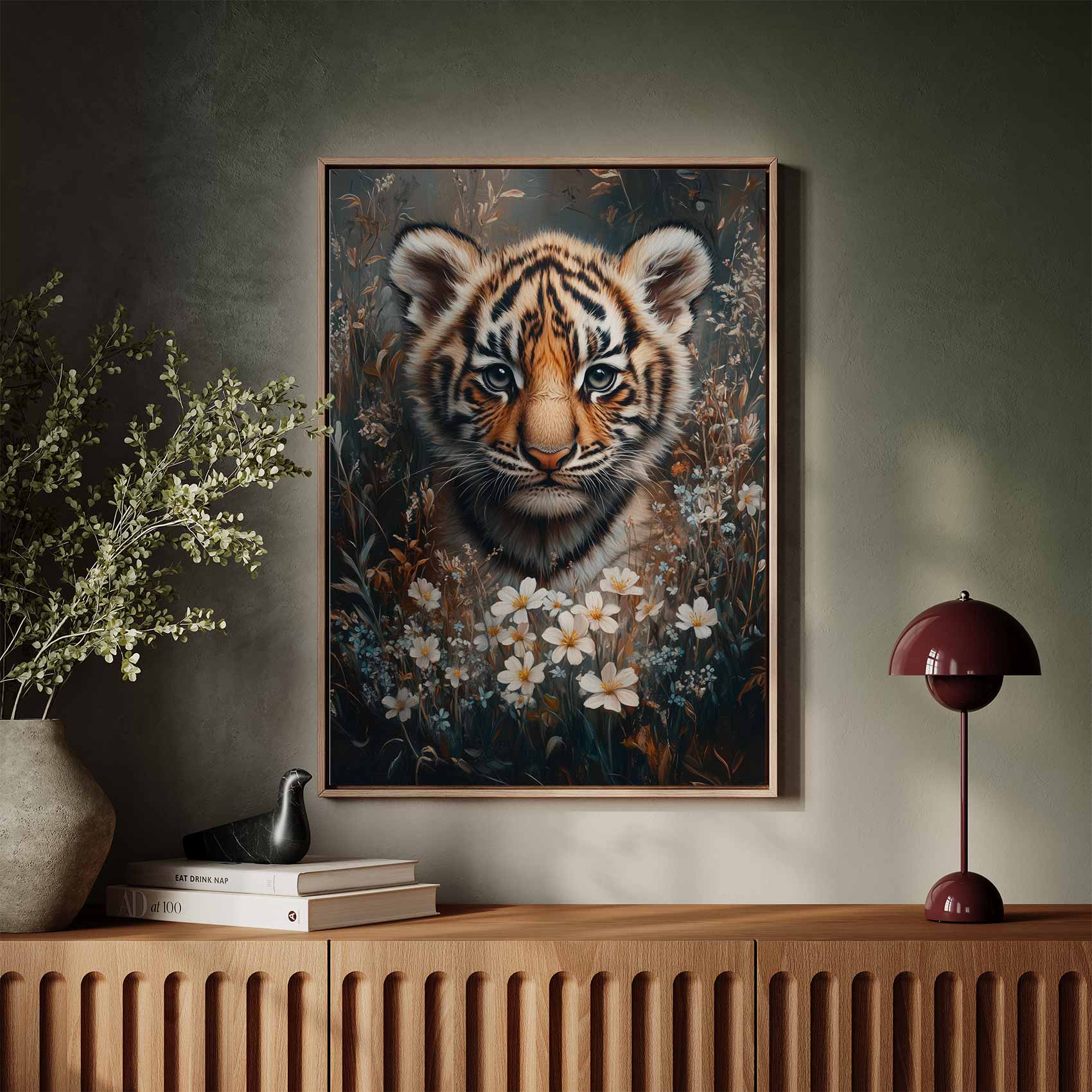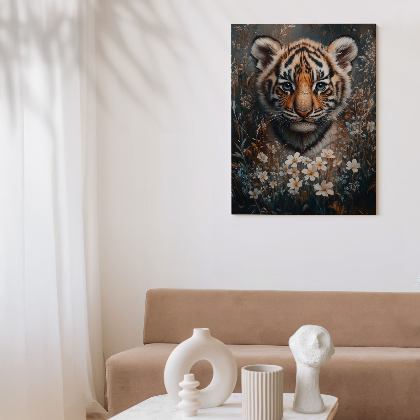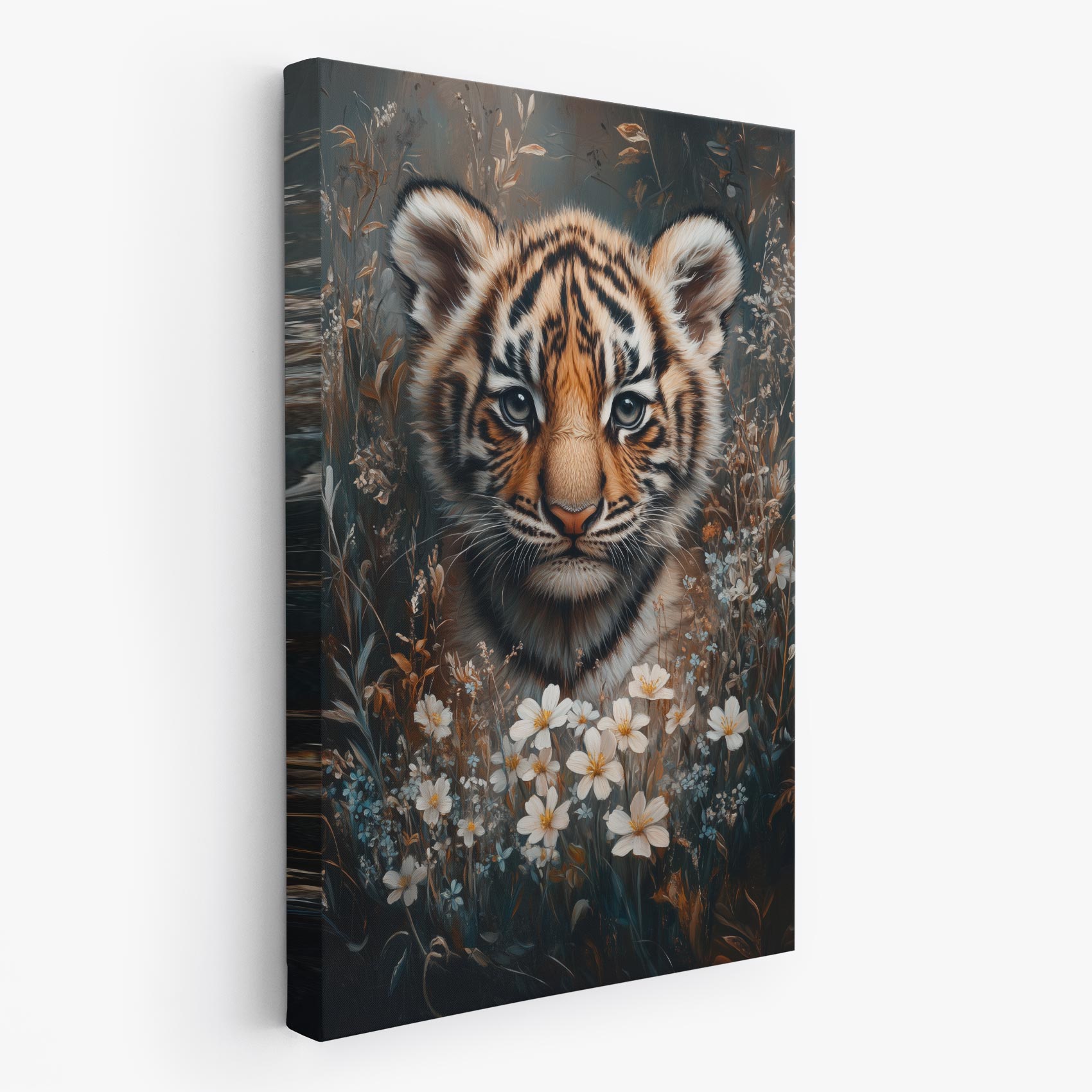 Tijgerwelp tussen bloemenpracht