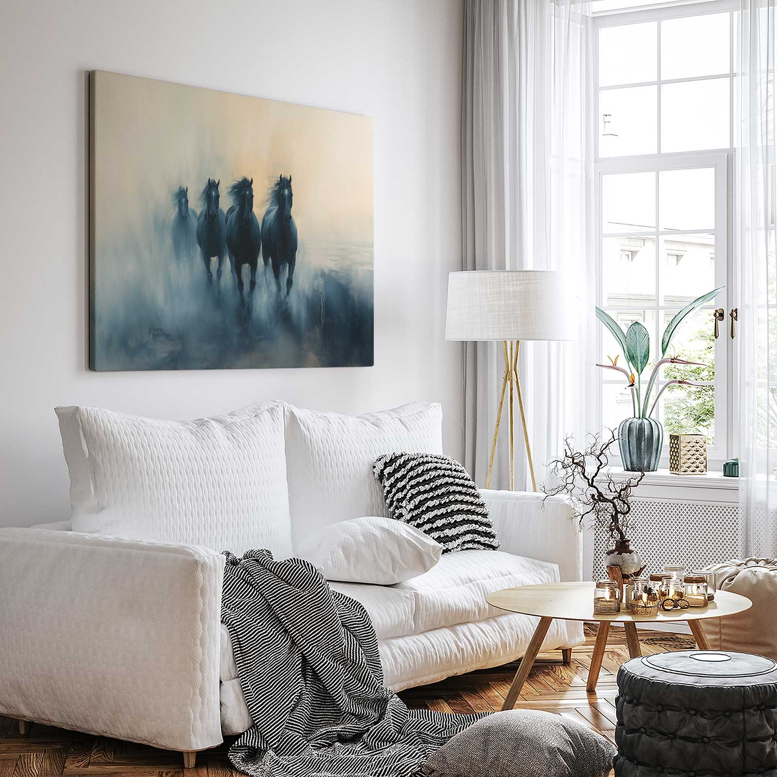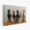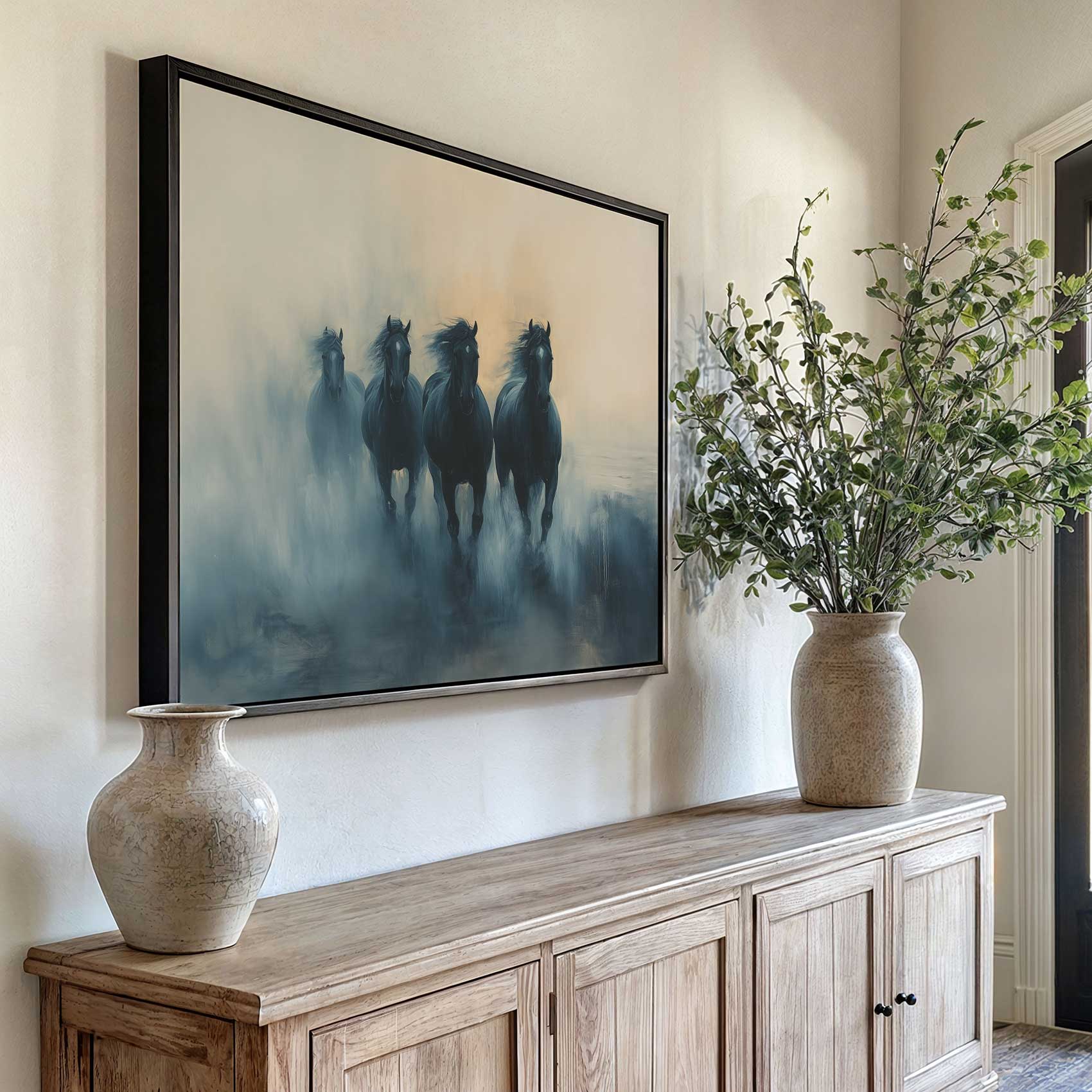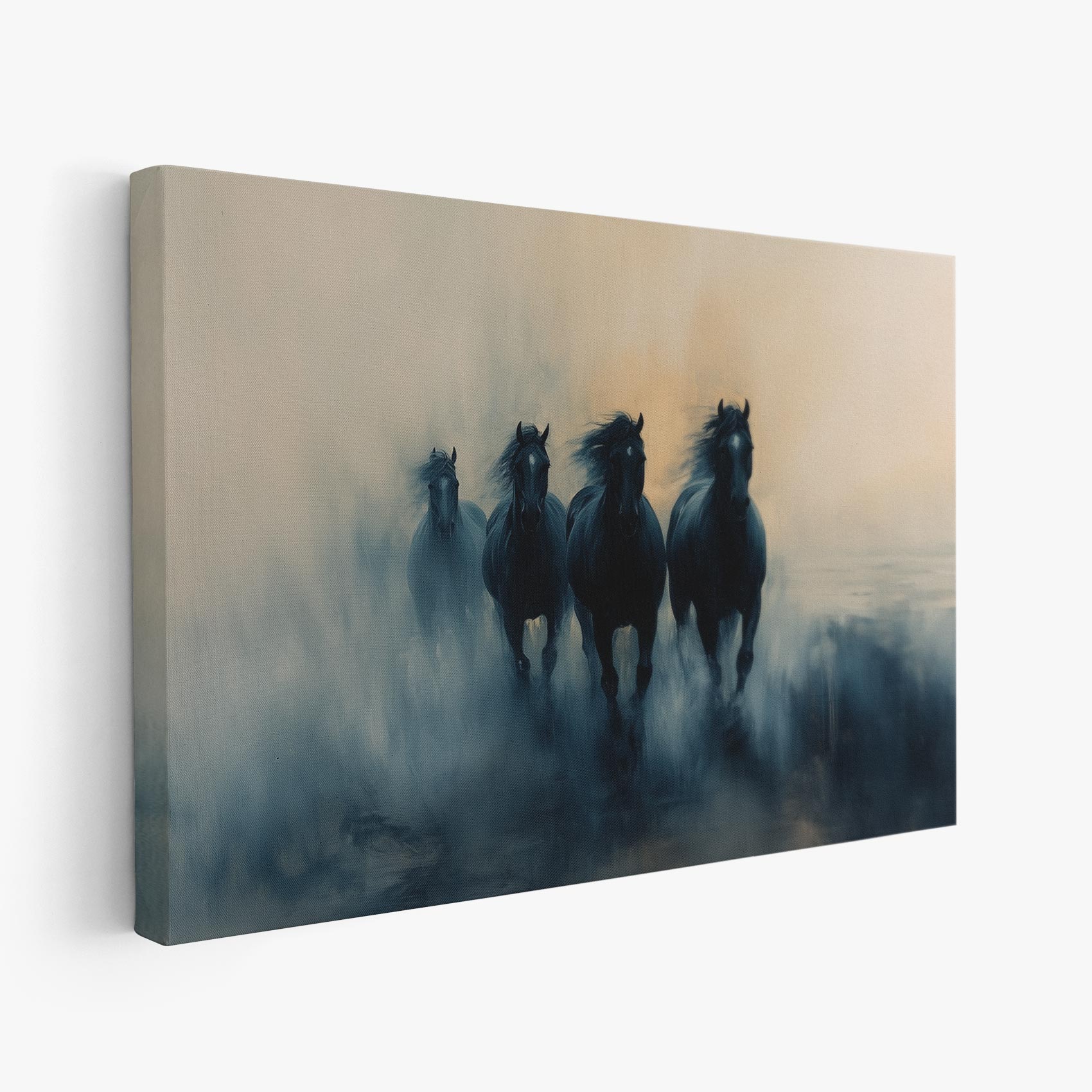 Terug naar collectie Canvas Vier zwarte paarden in mist