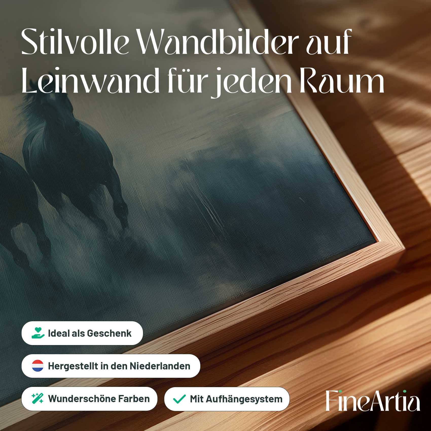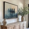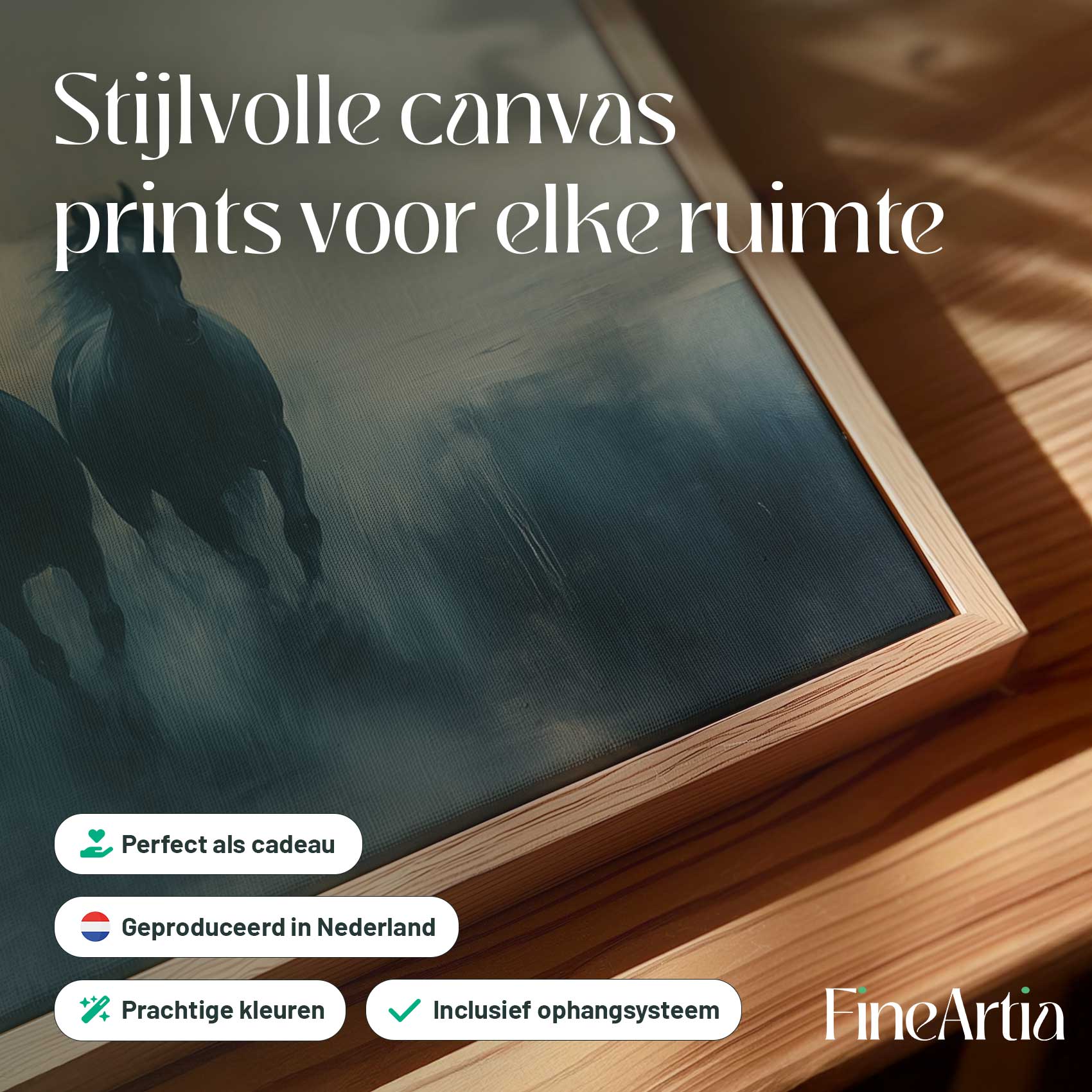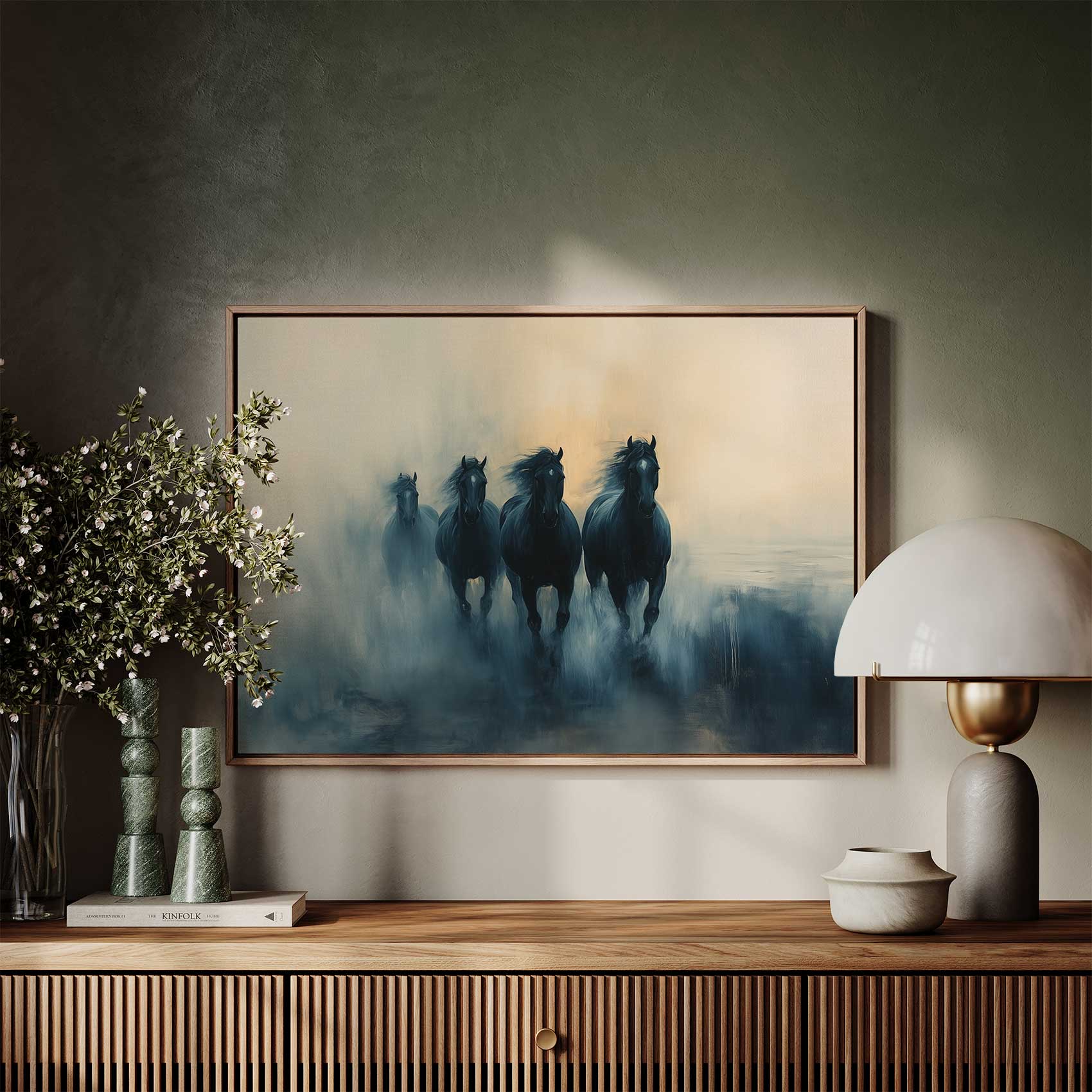 Terug naar collectie Canvas Vier zwarte paarden in mist