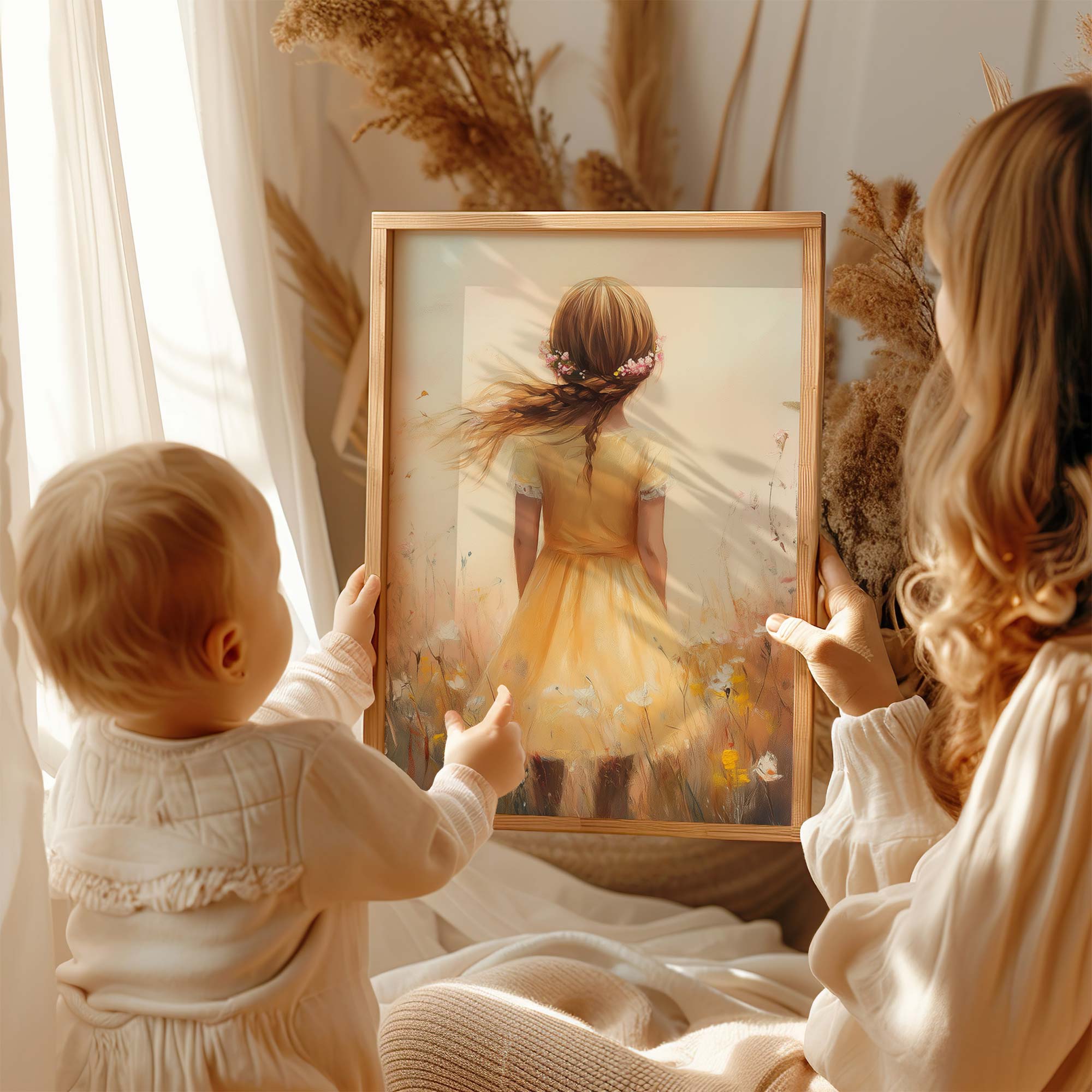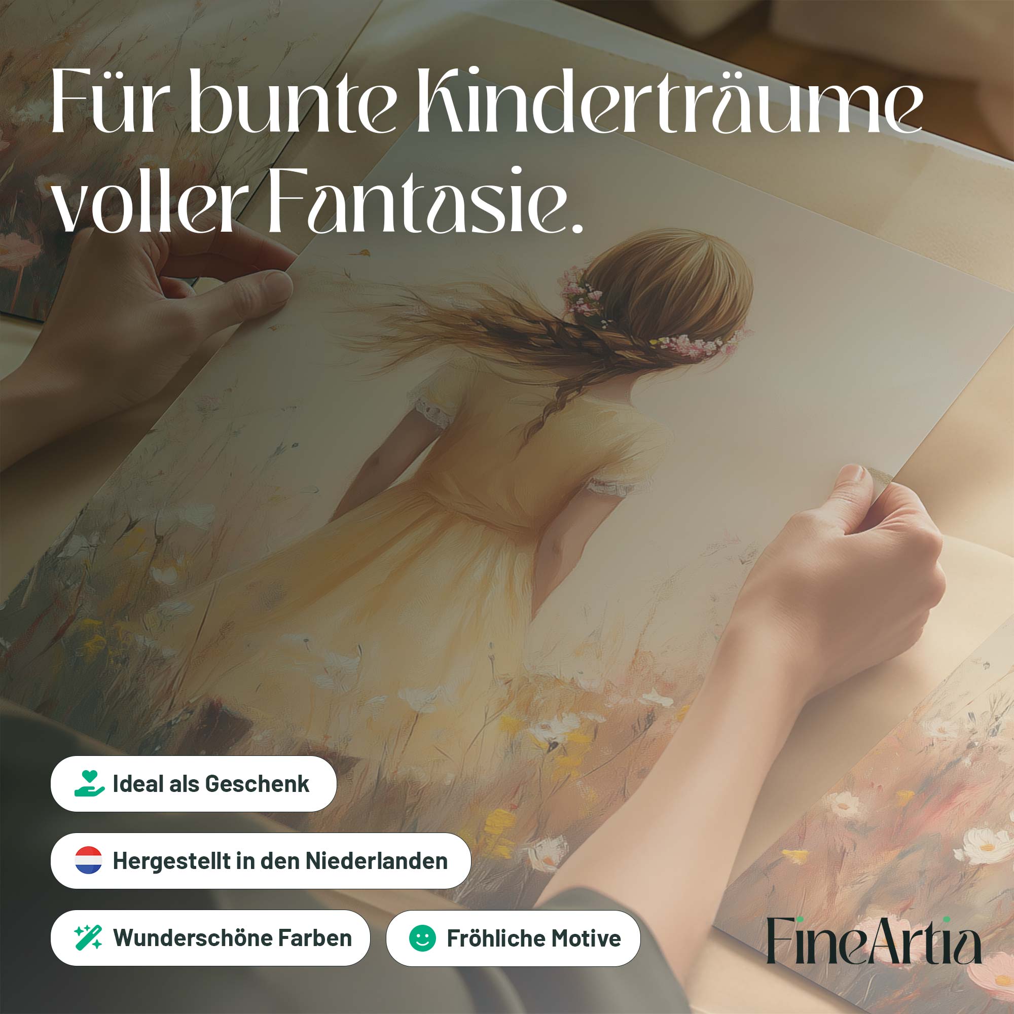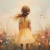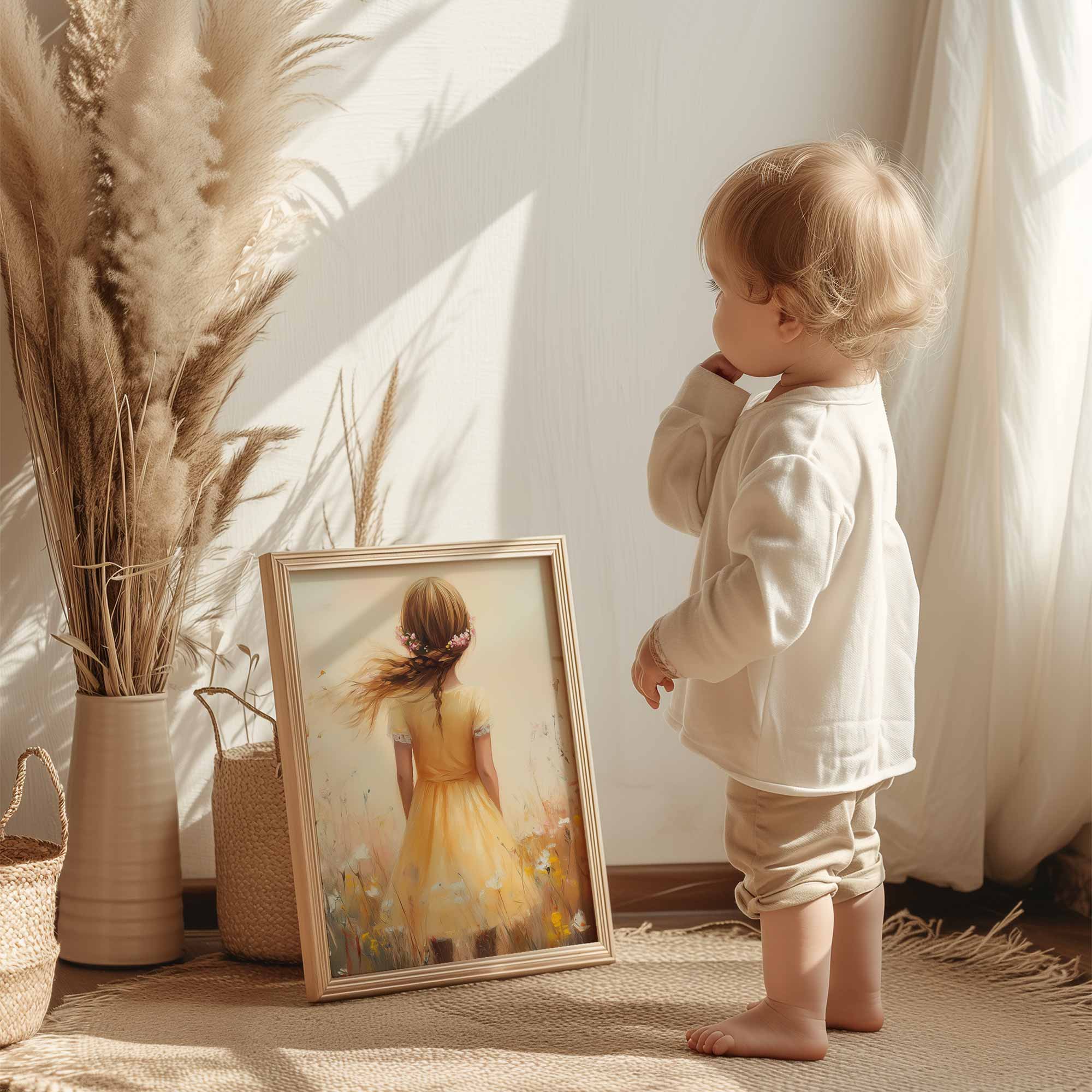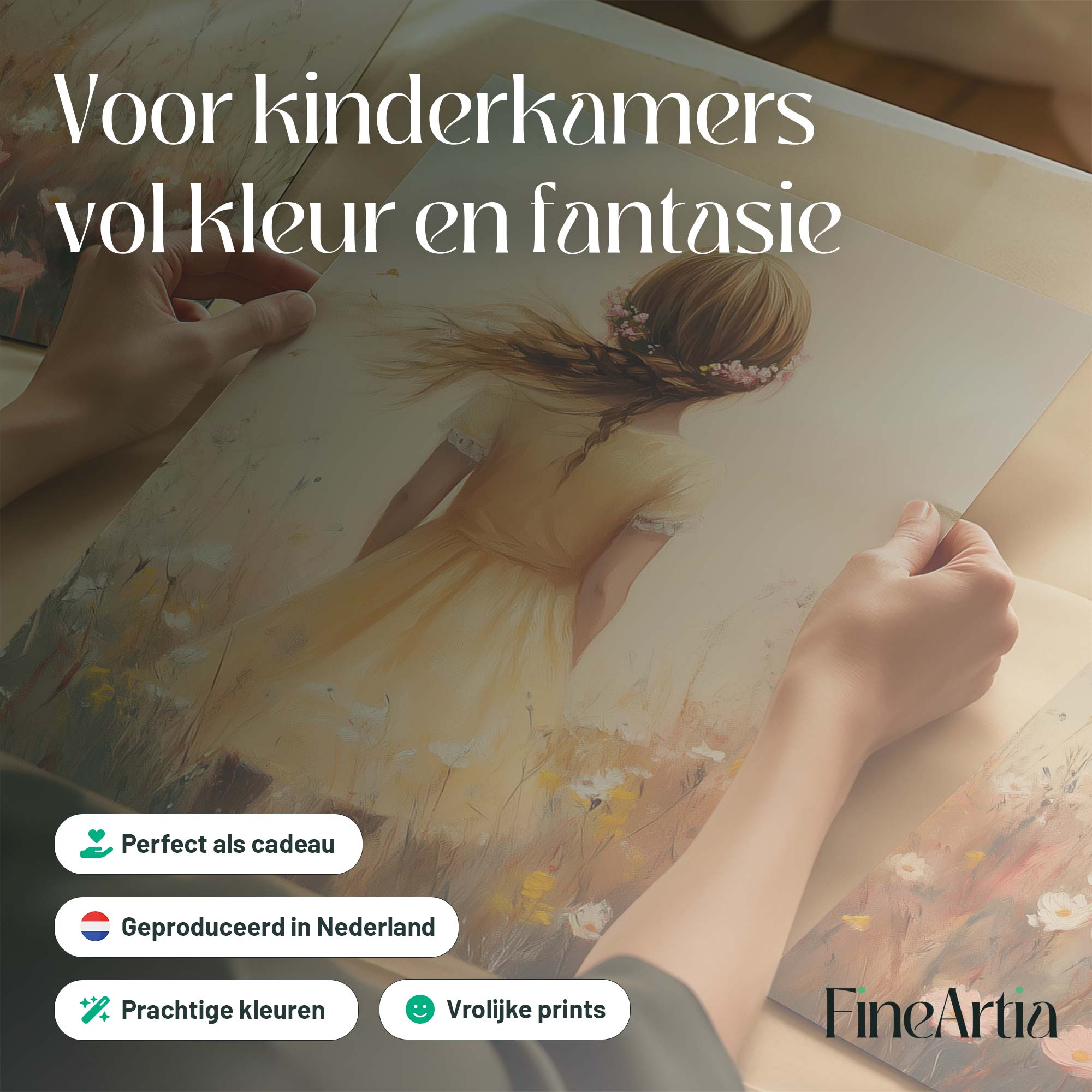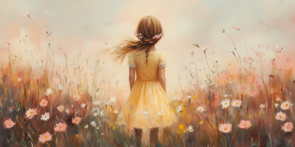 Vrolijk Meisje in Gele Jurk tussen Bloeiende Bloemen
