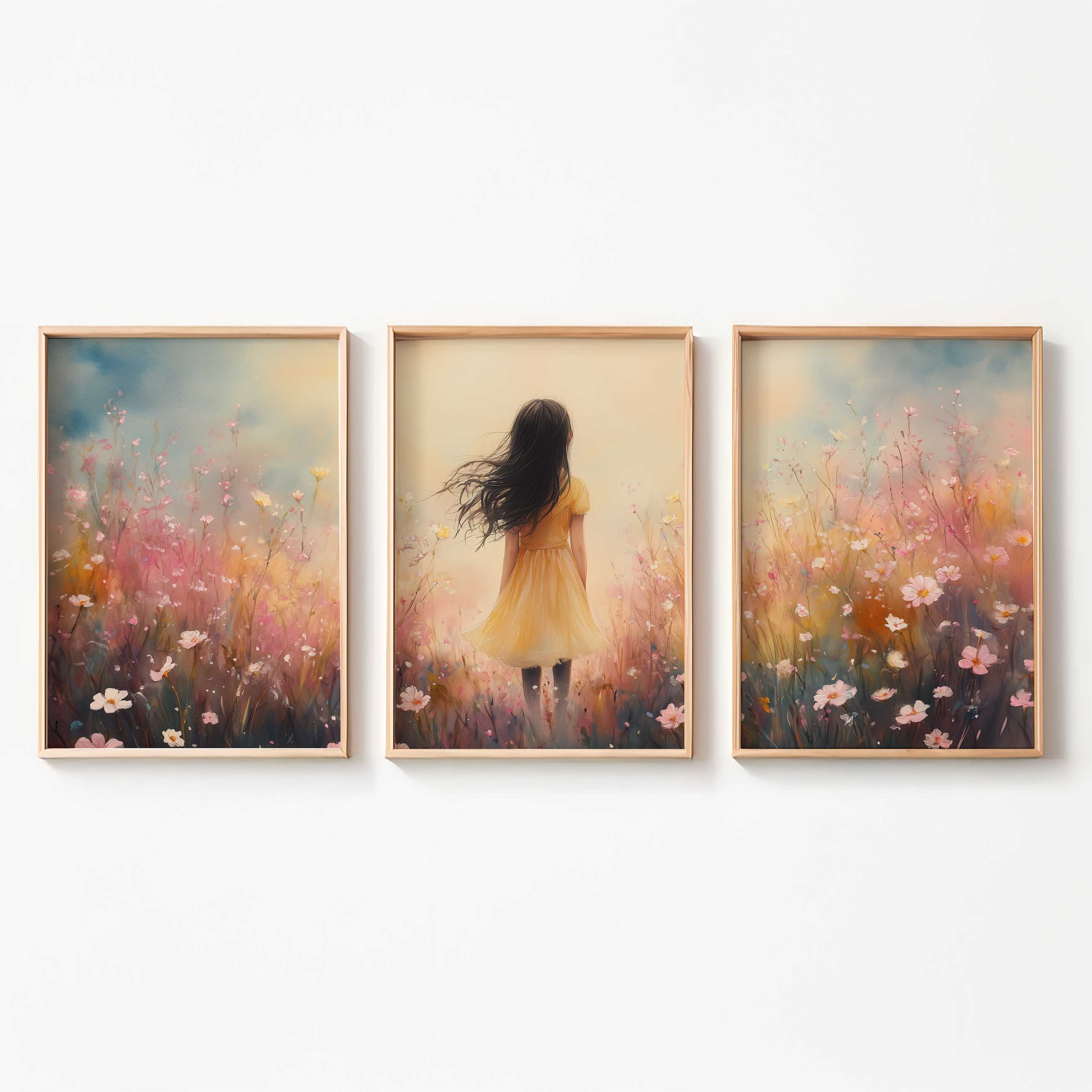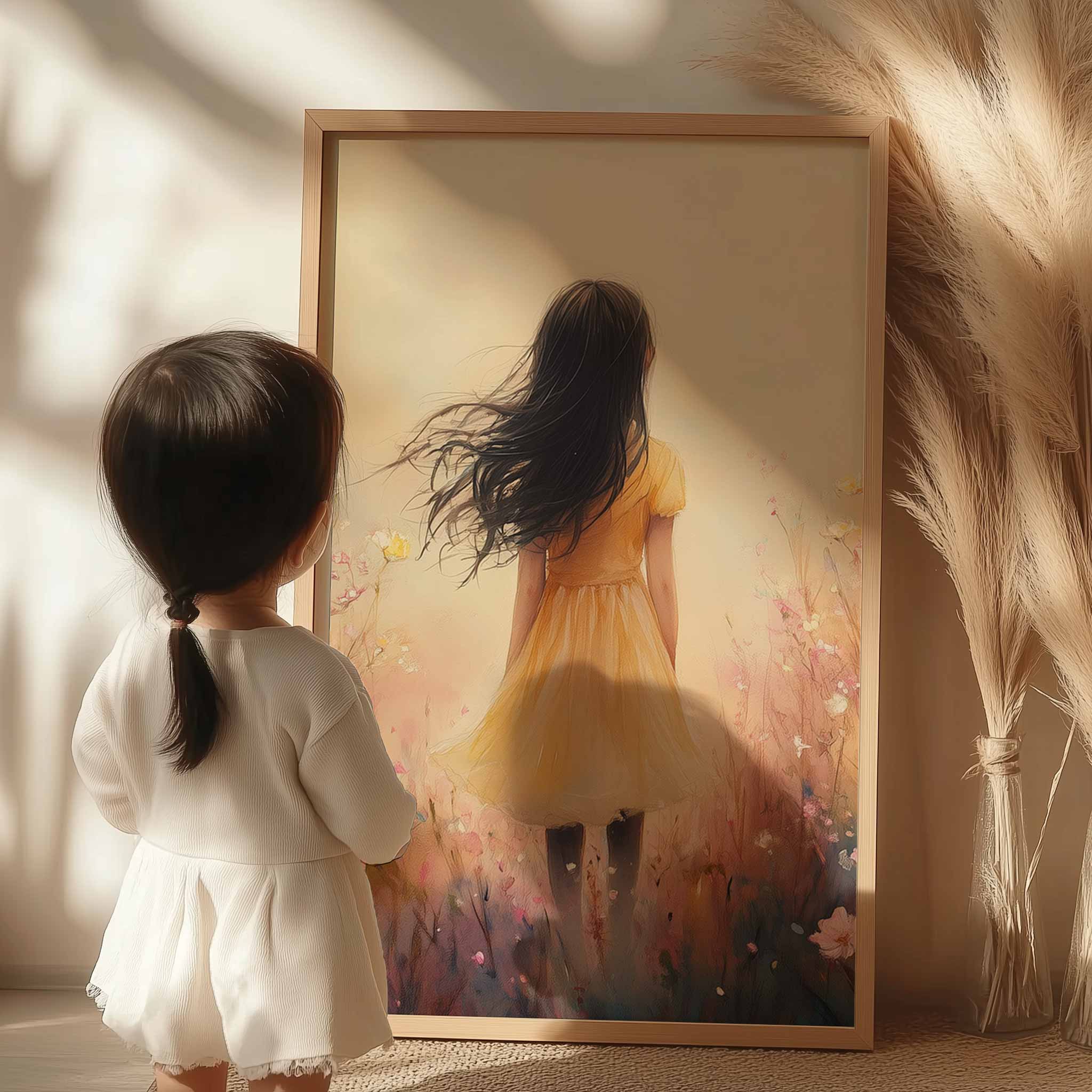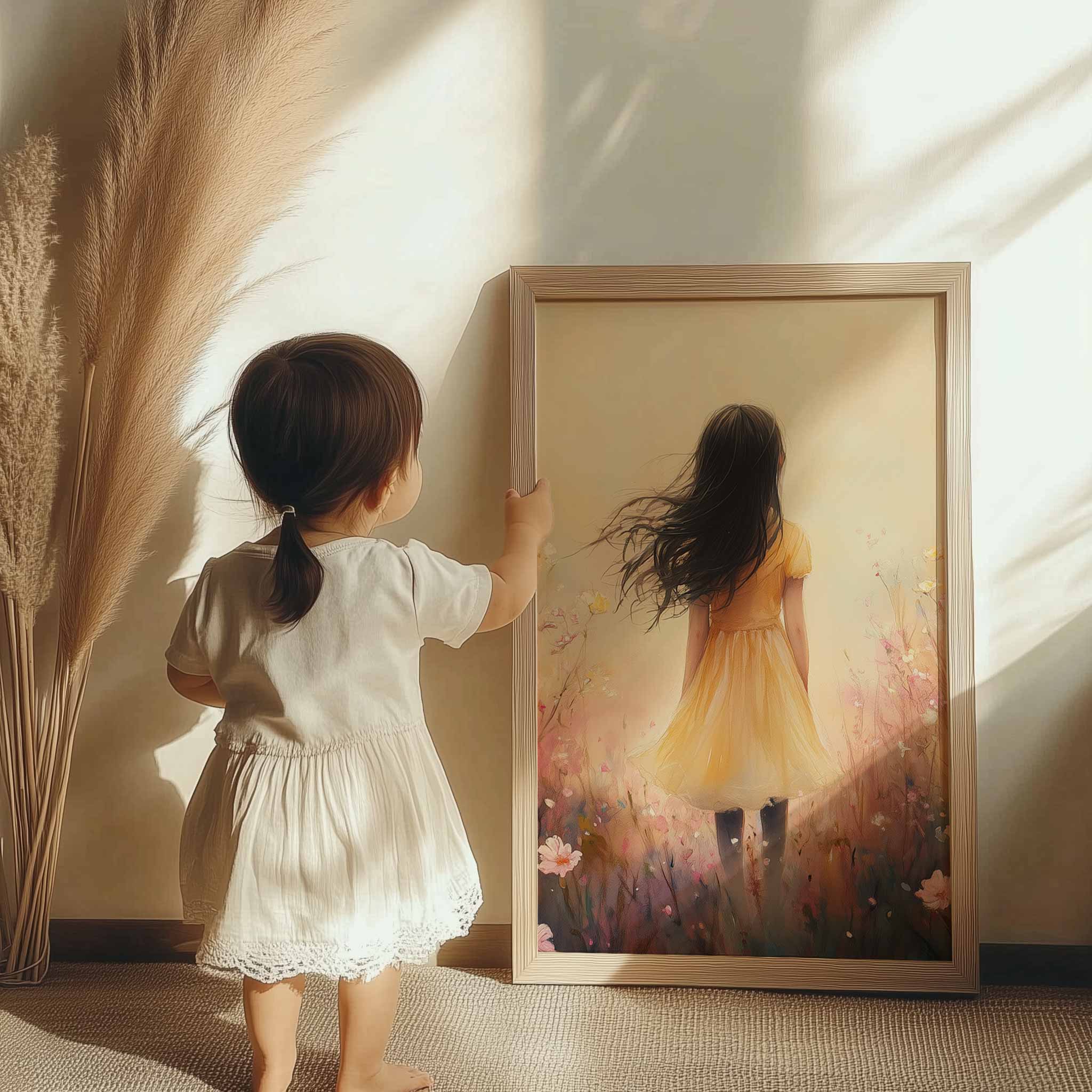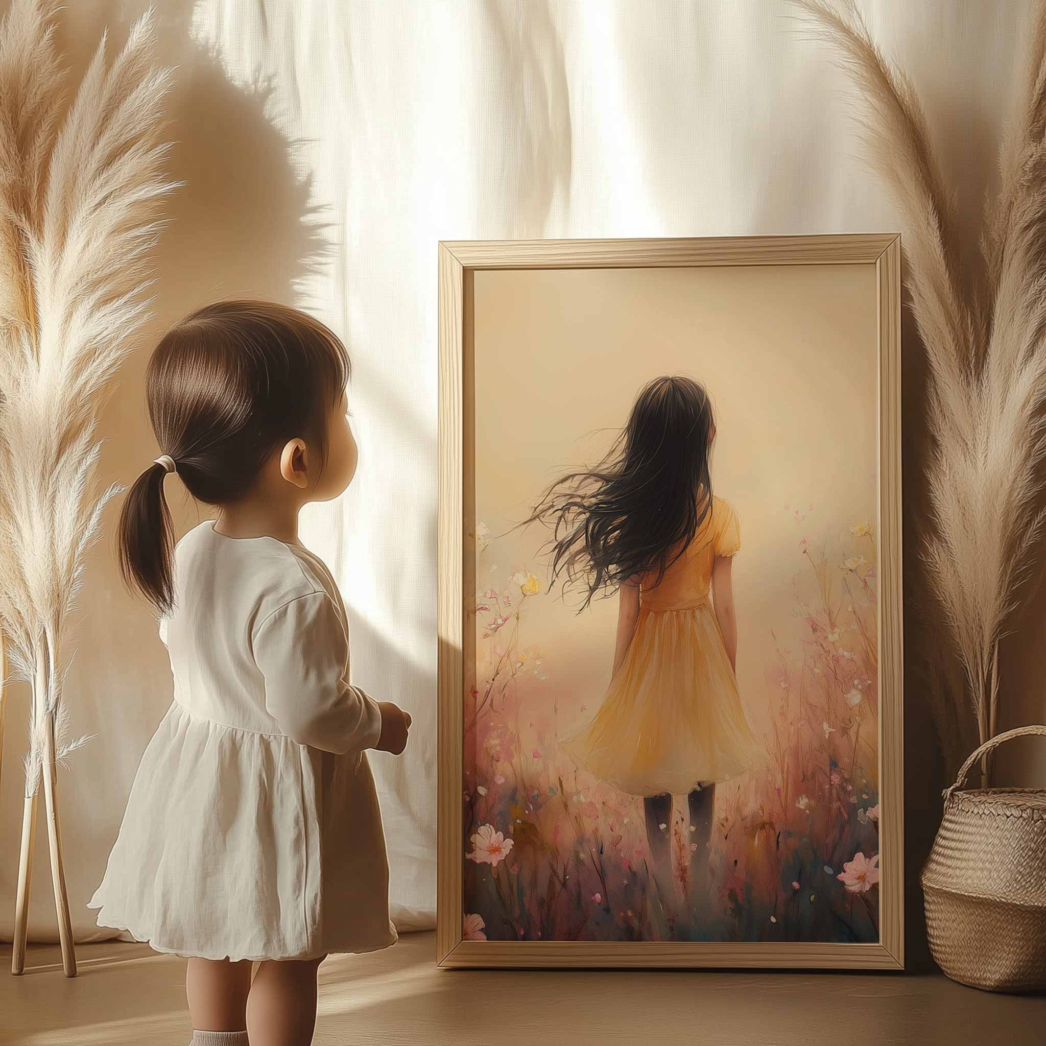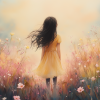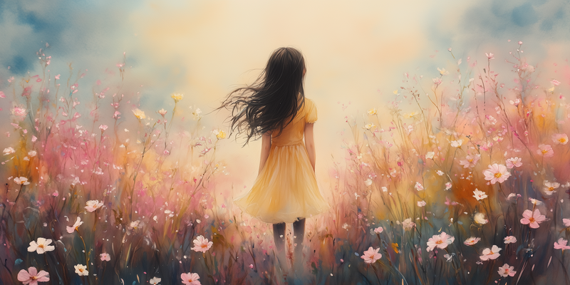 Vrolijk Meisje in Gele Jurk tussen Bloeiende Bloemen