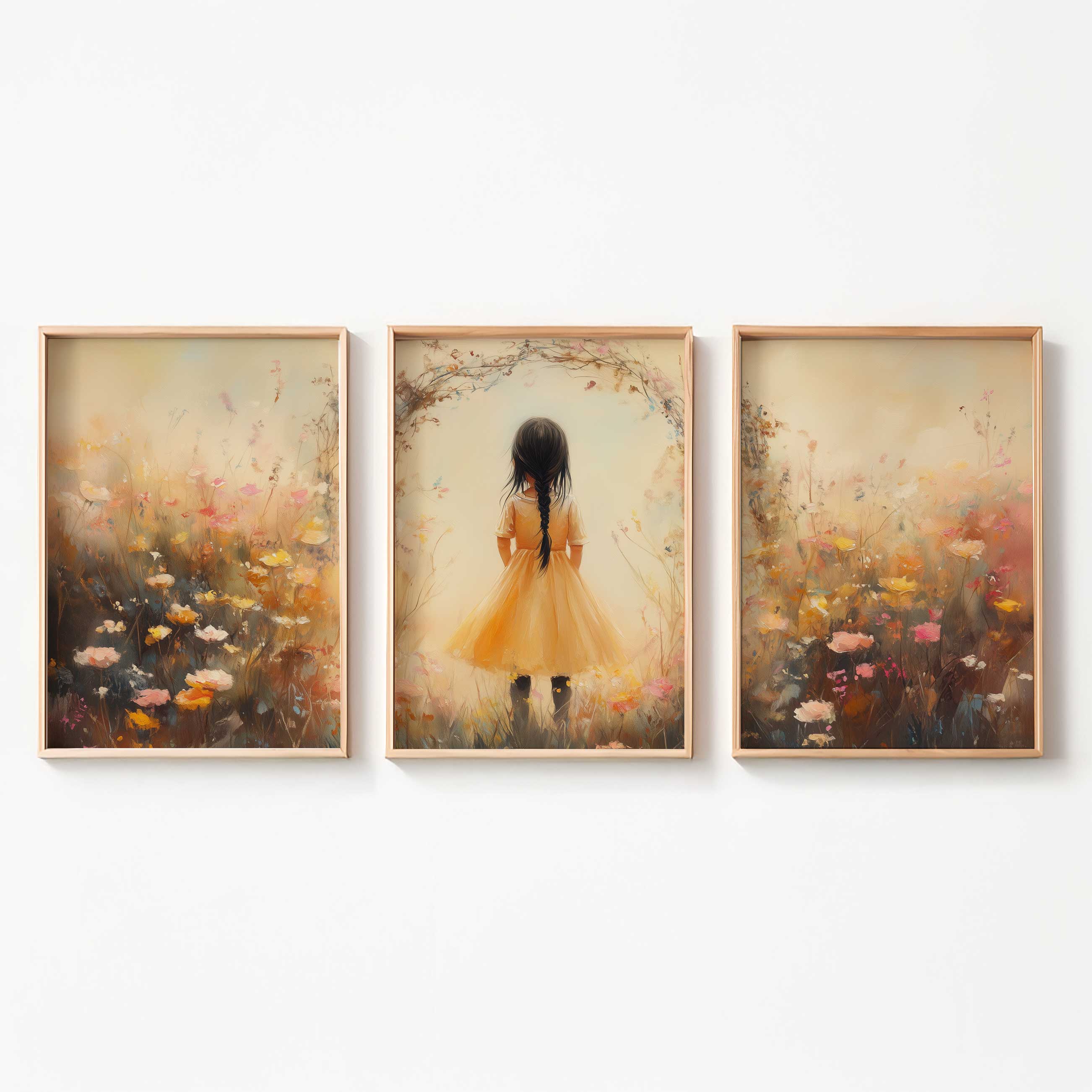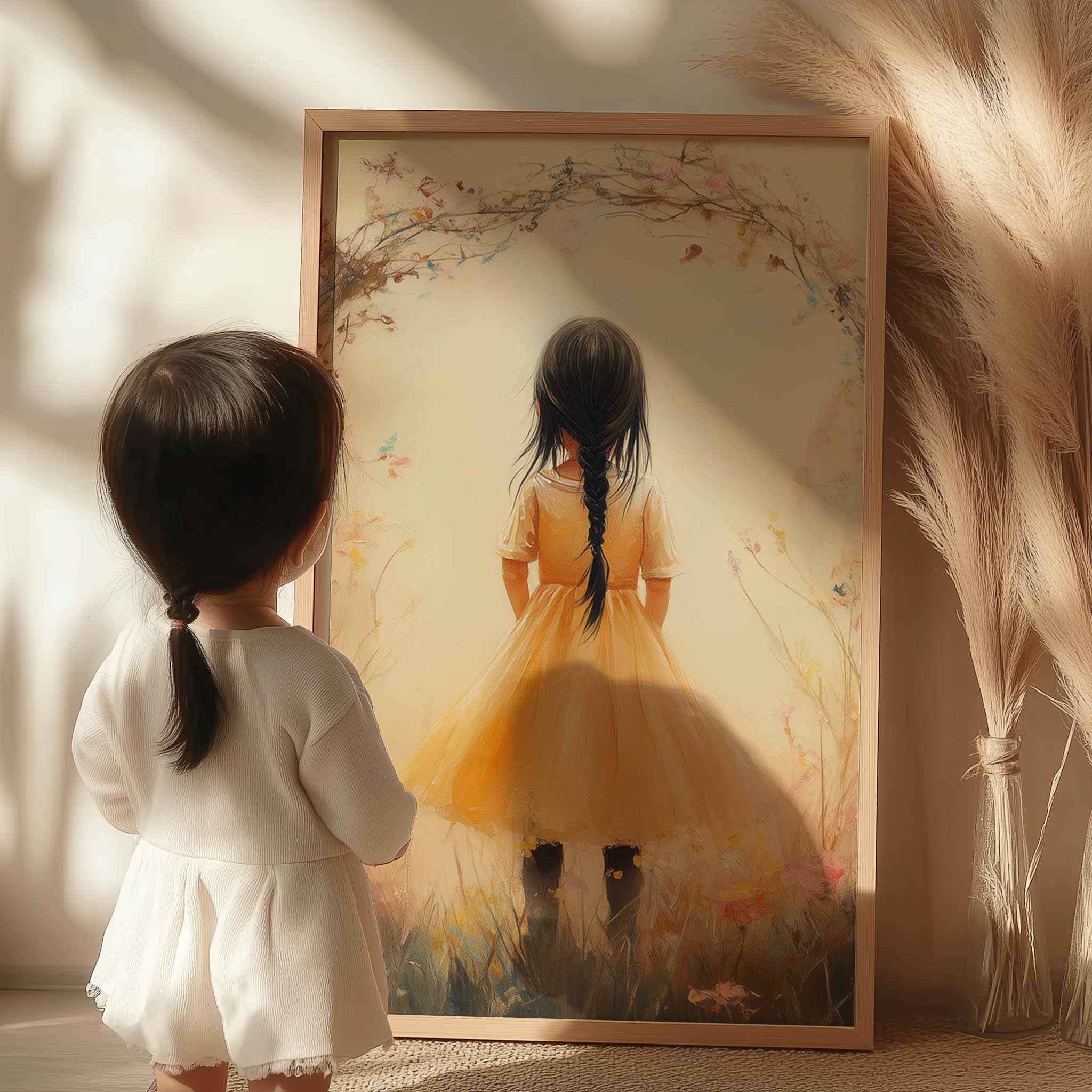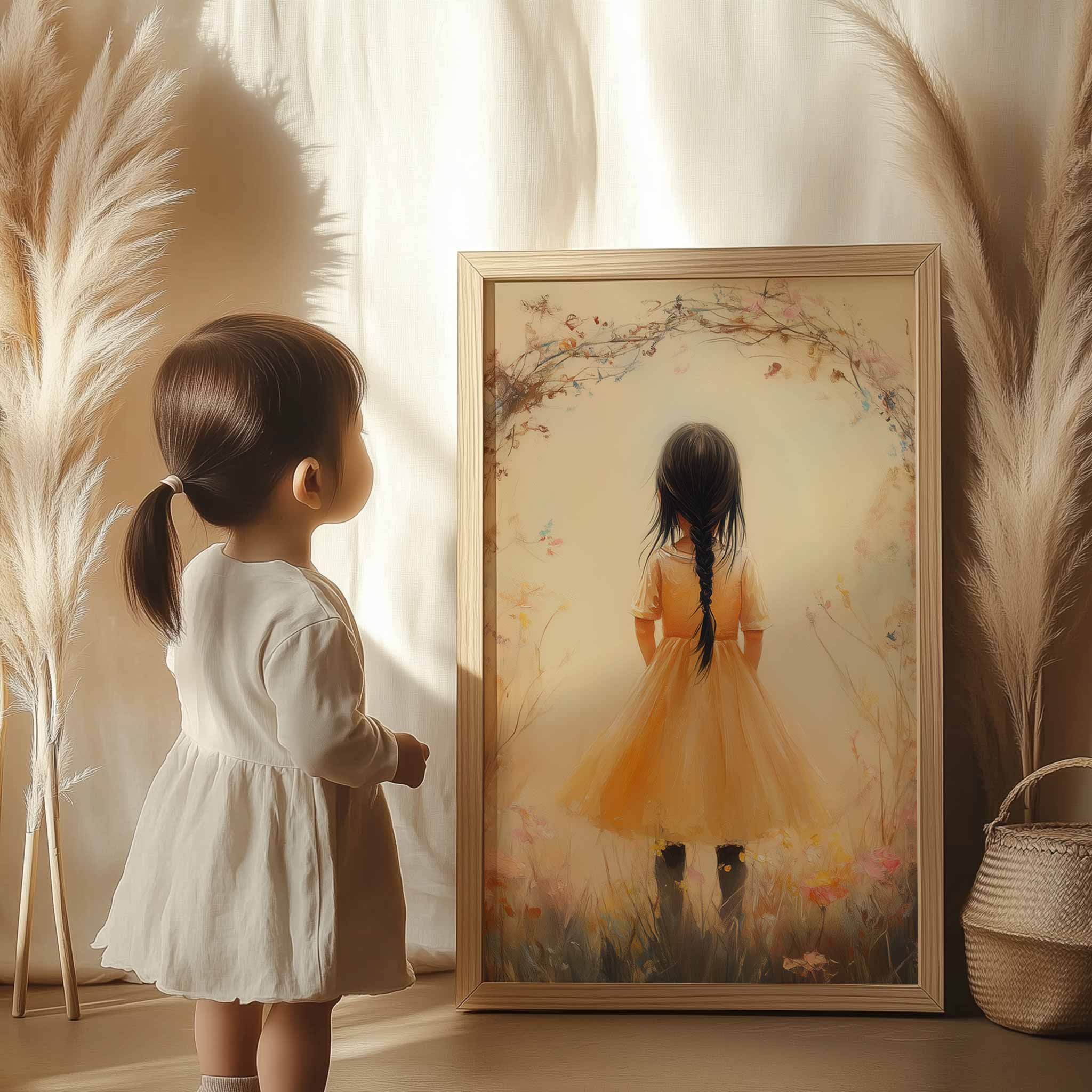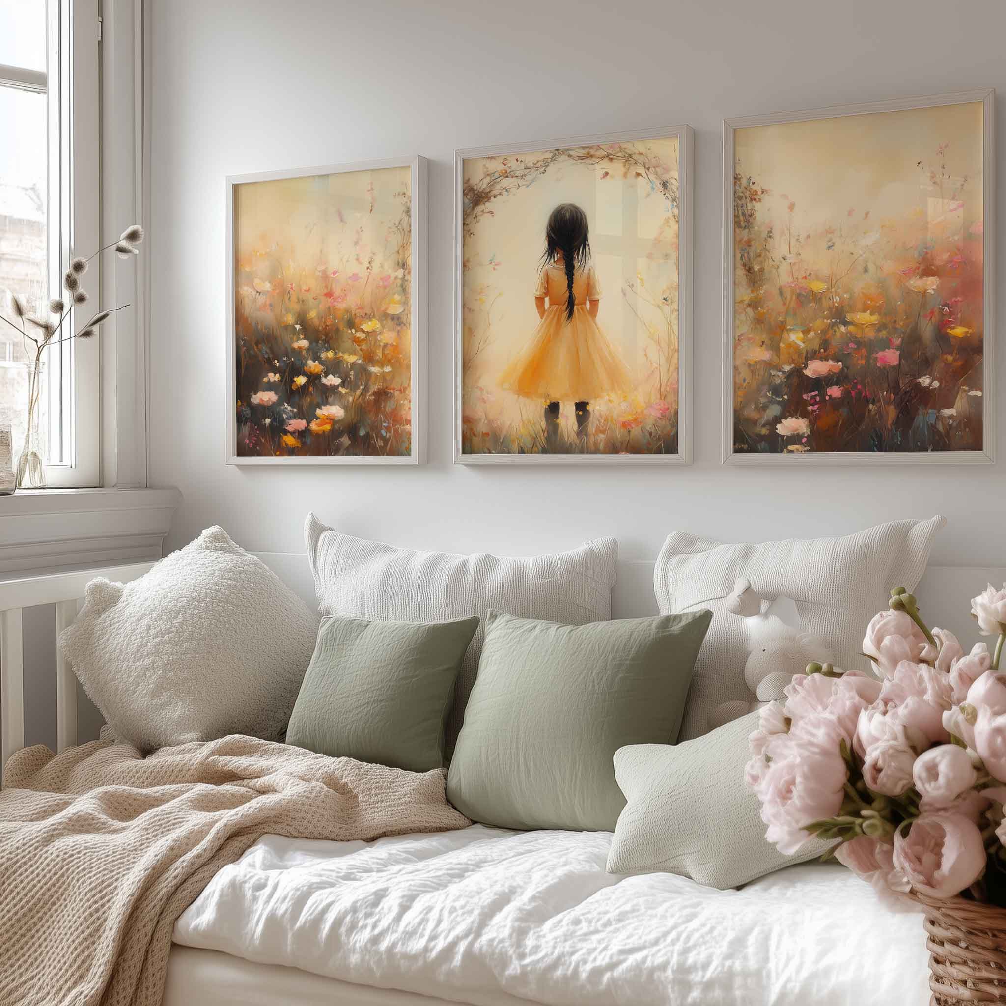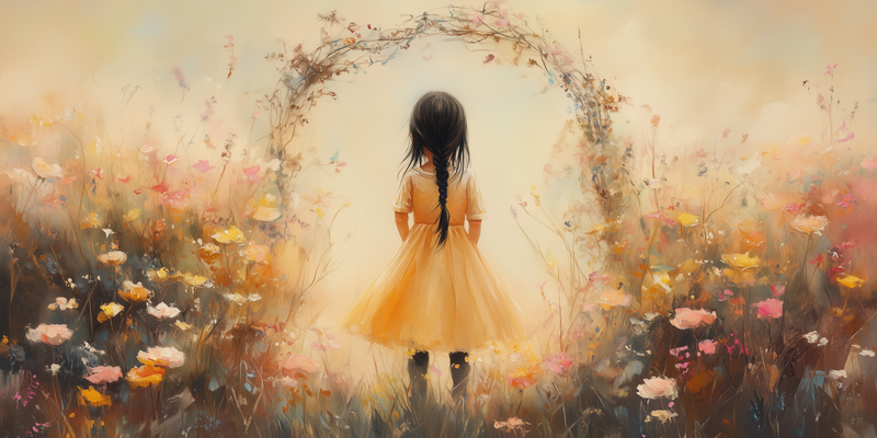 Terug naar collectie Posters Vrolijk Meisje in Gele Jurk tussen Kleurrijke Bloemen