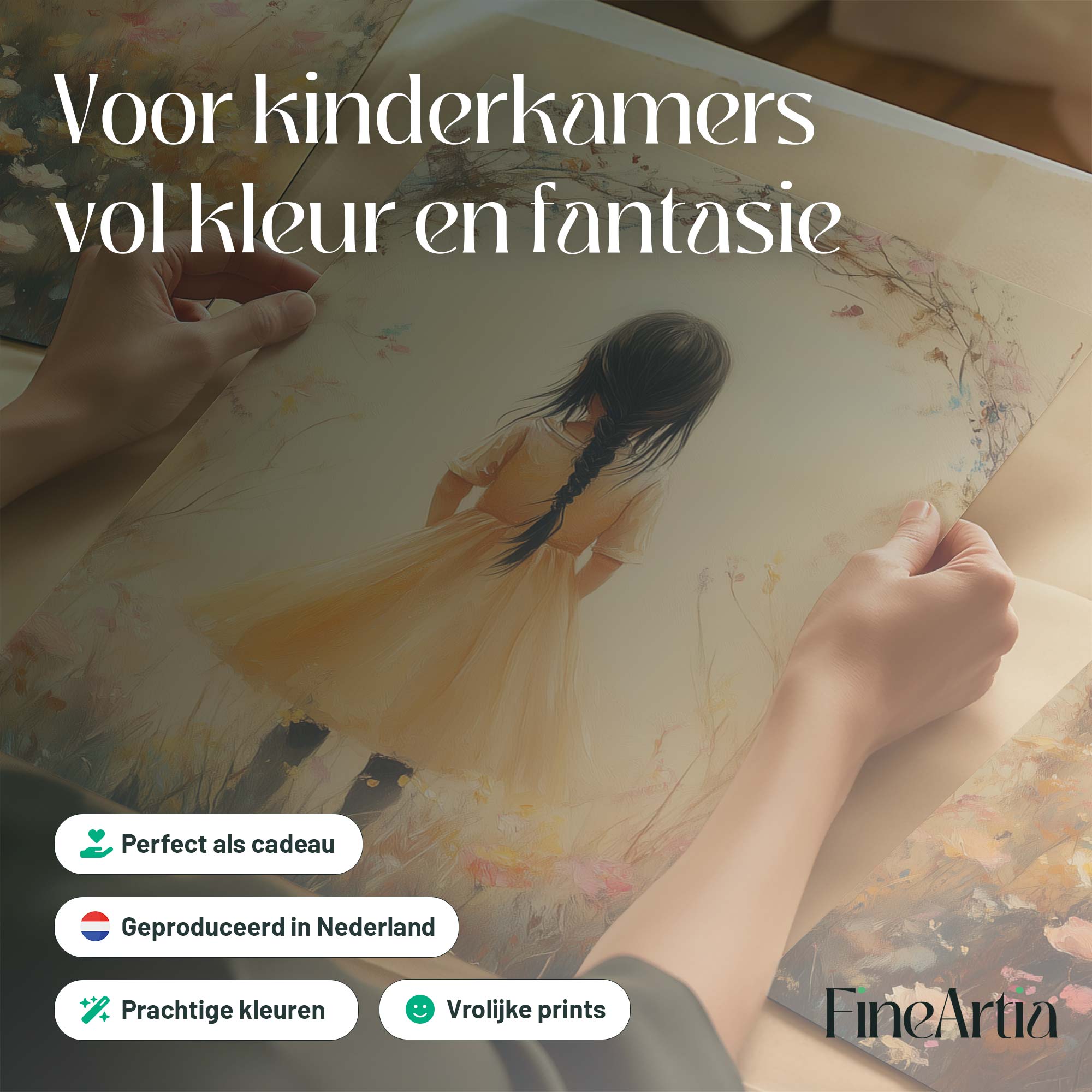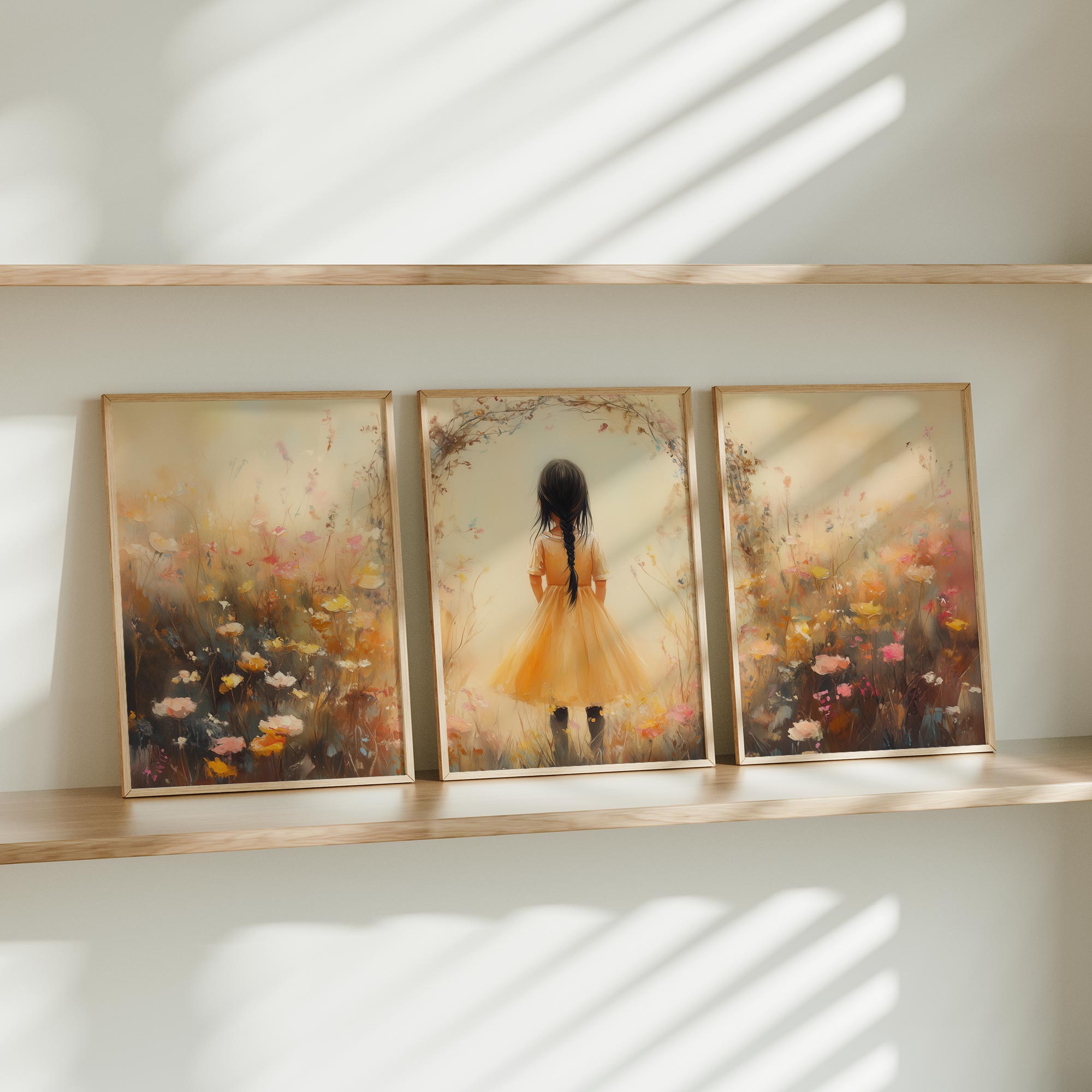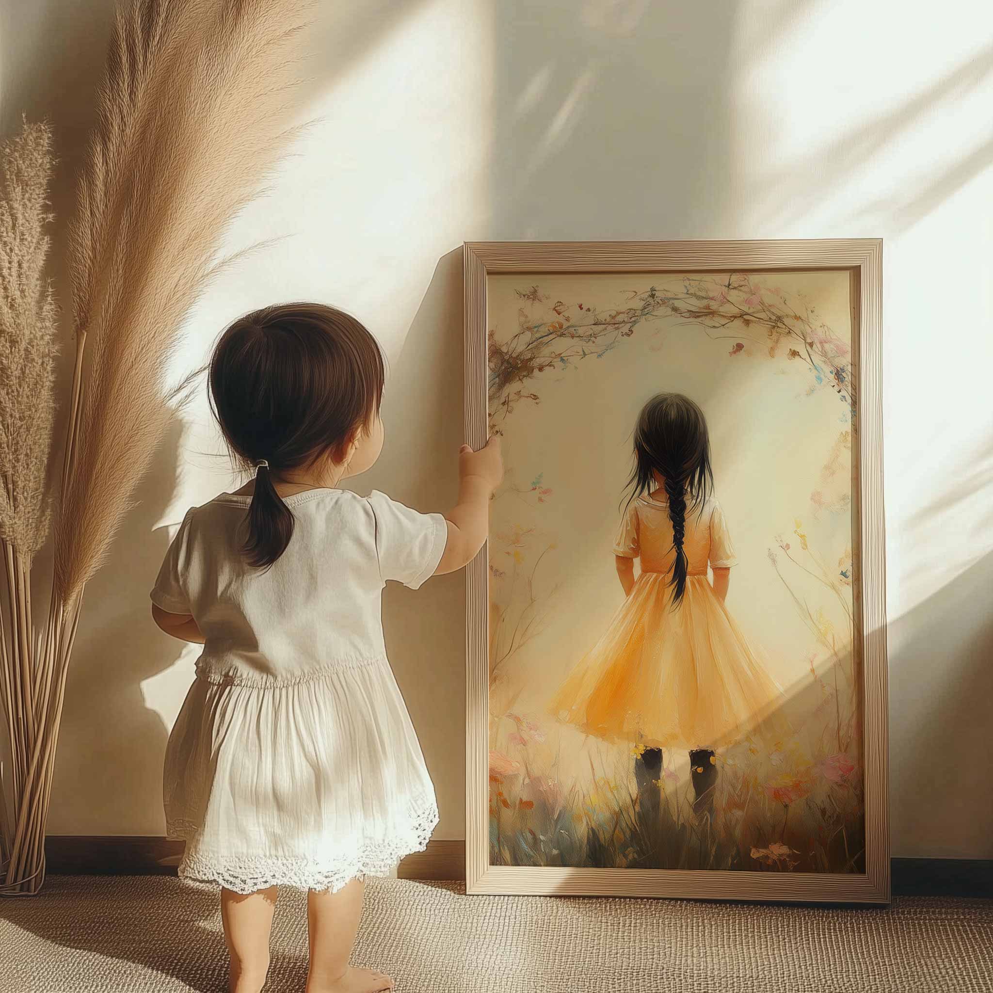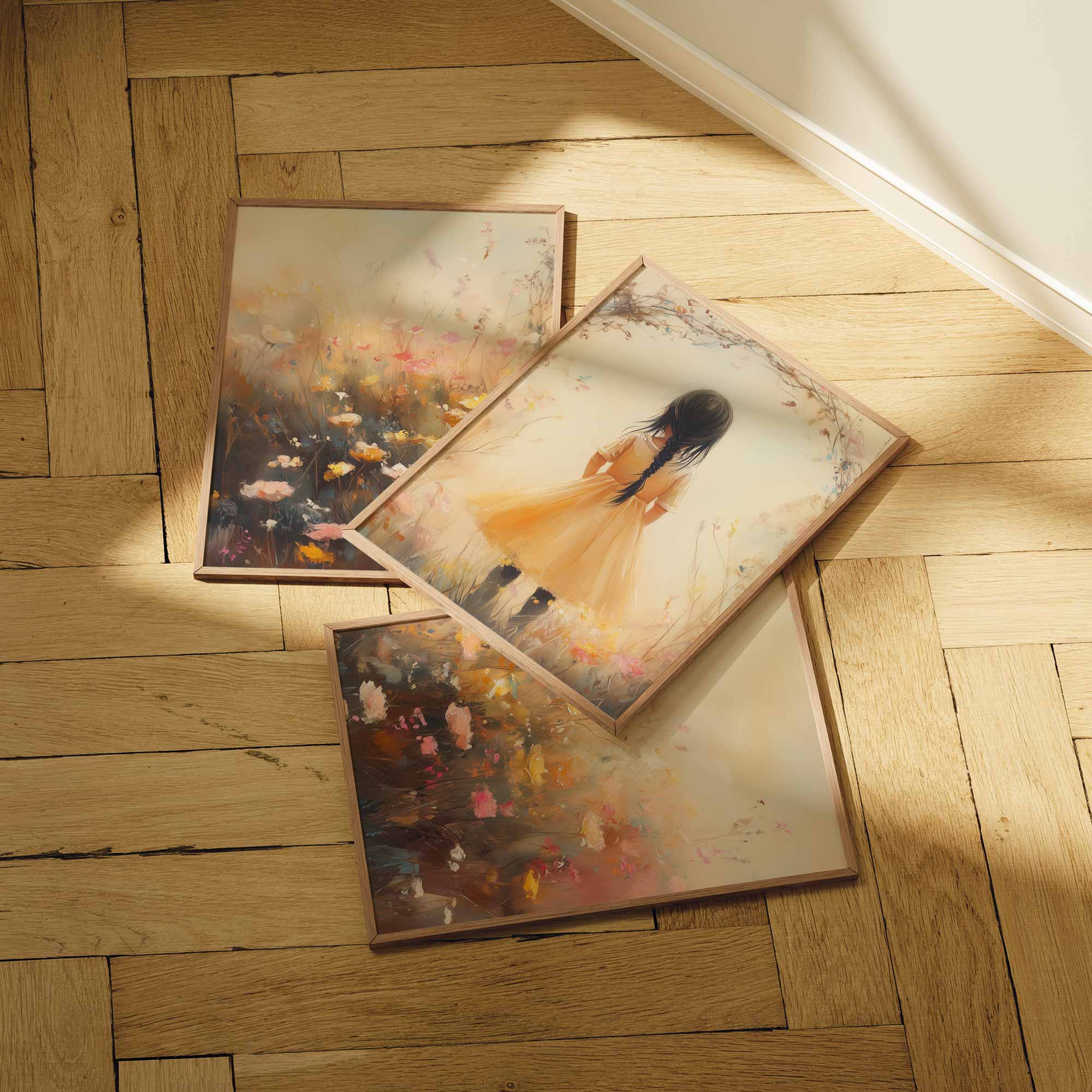 Terug naar collectie Posters Vrolijk Meisje in Gele Jurk tussen Kleurrijke Bloemen