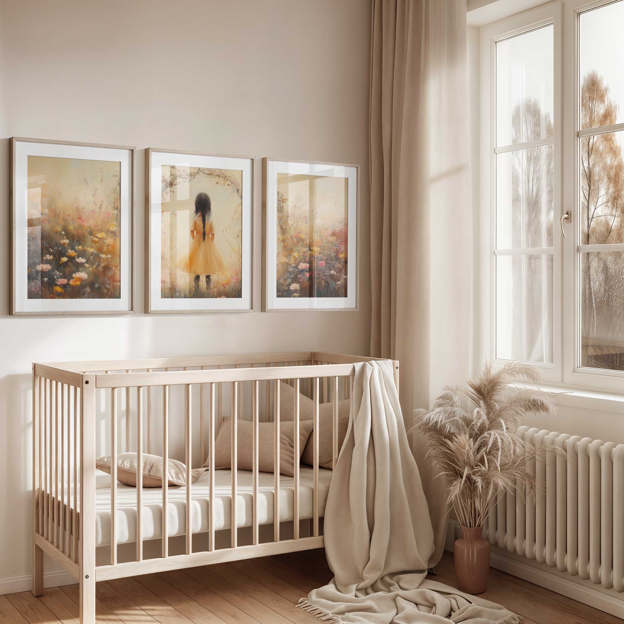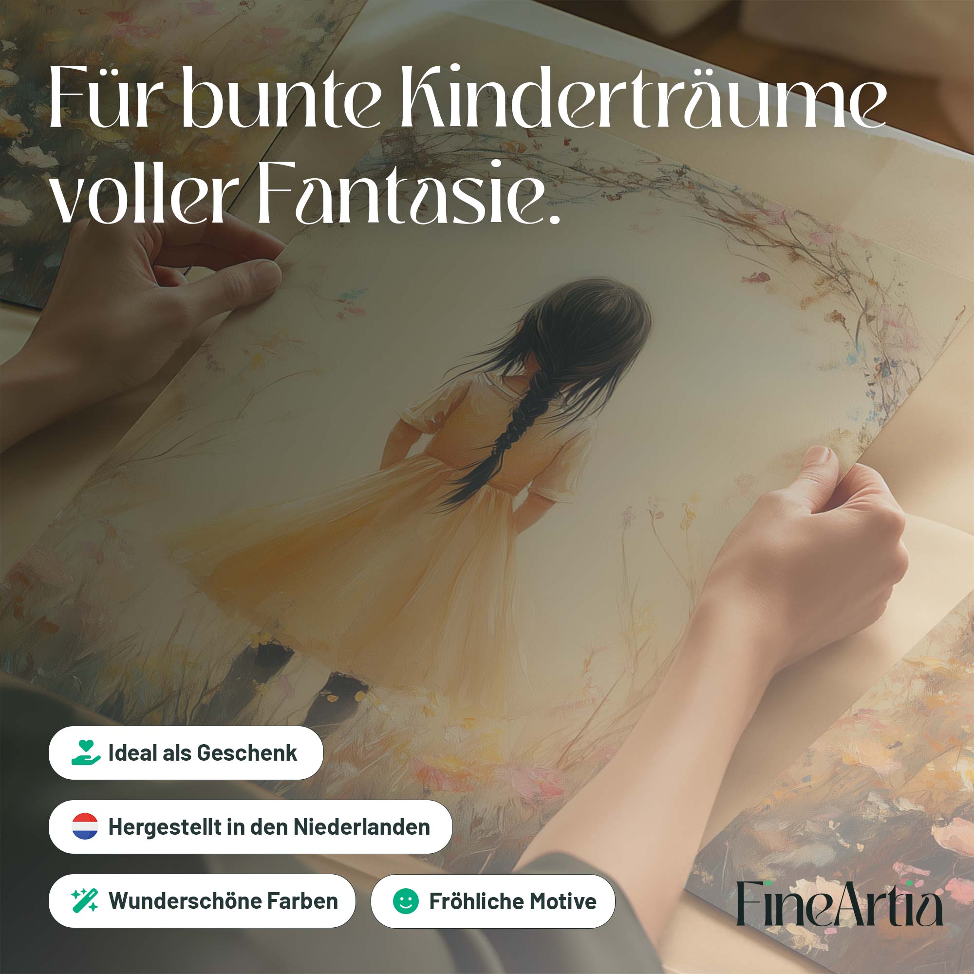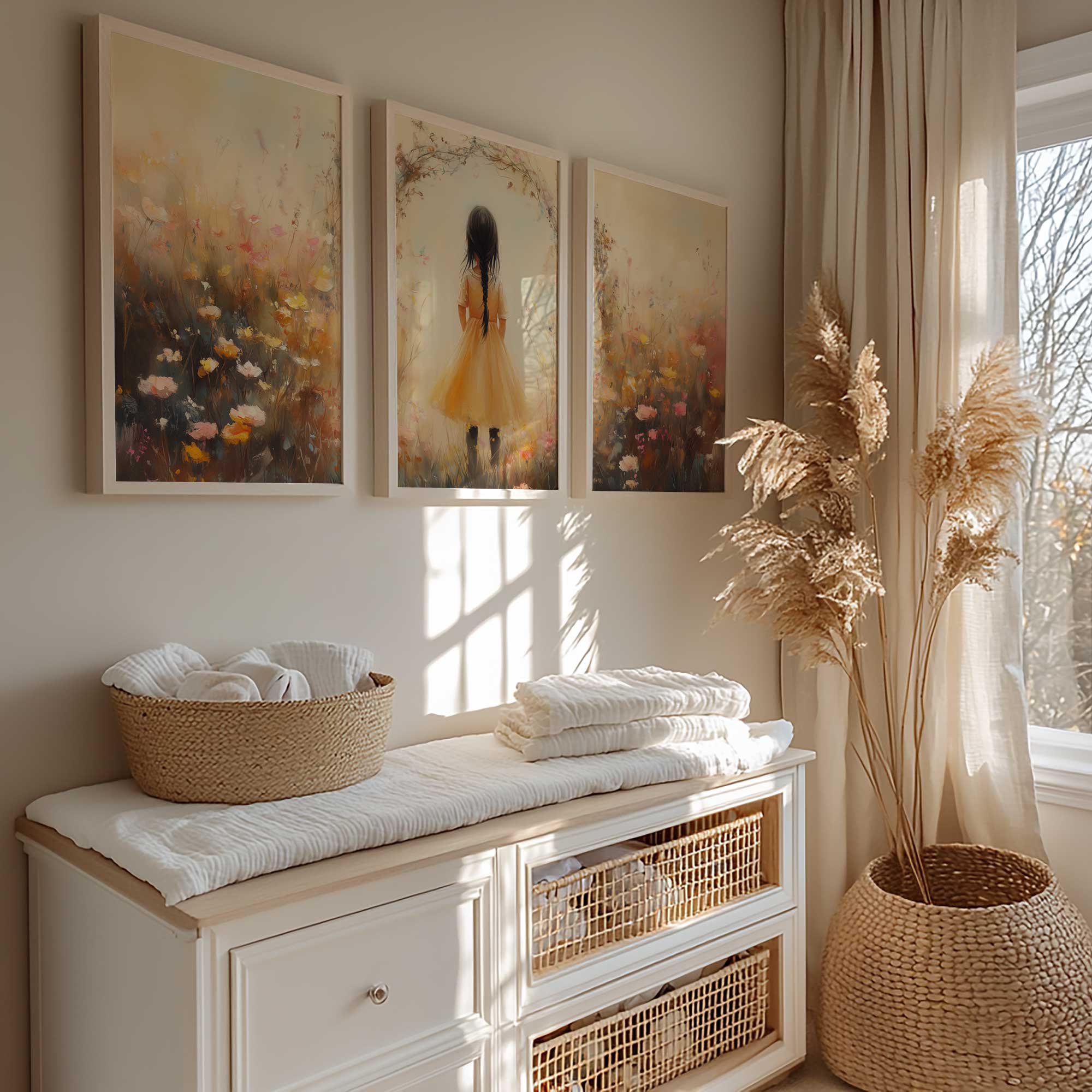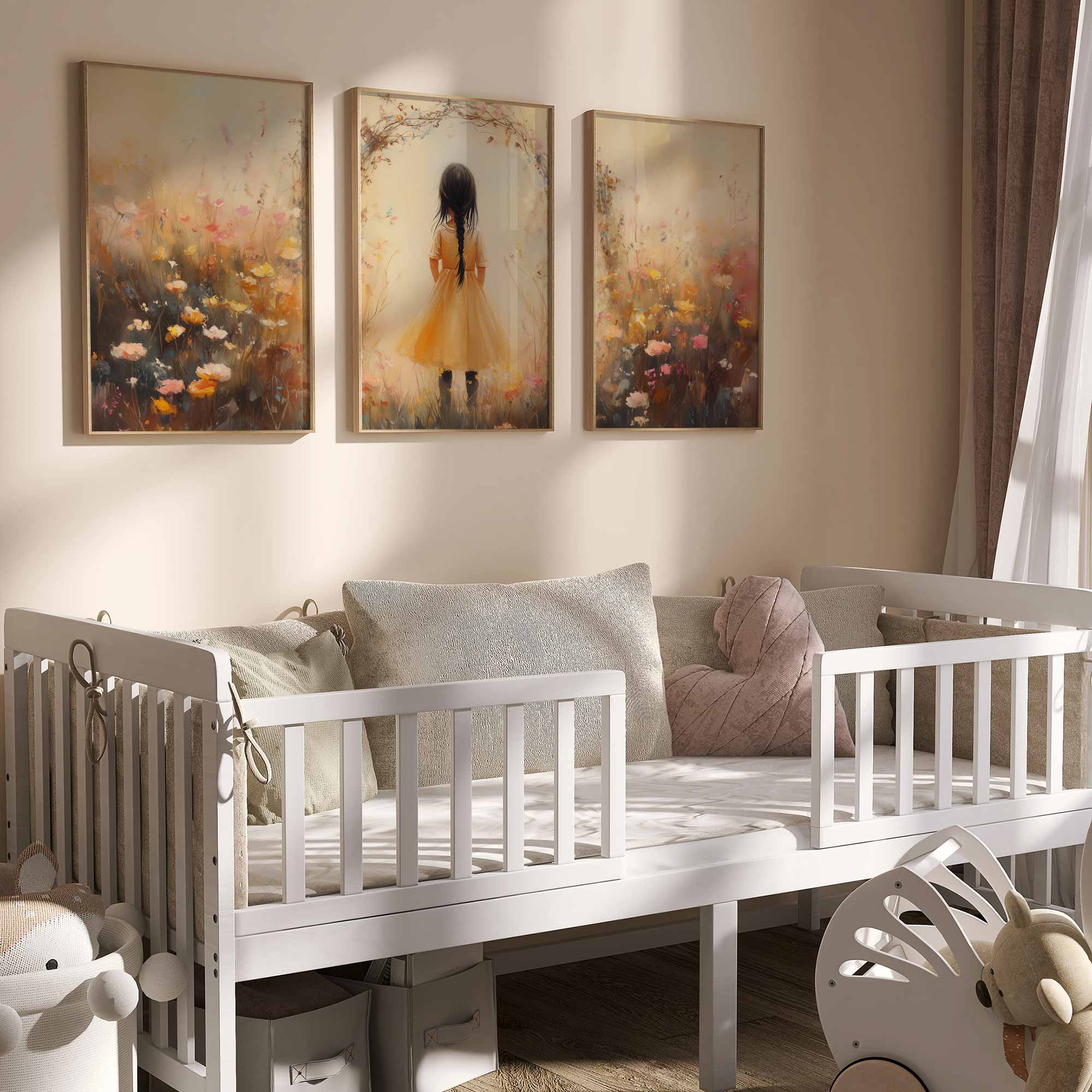Terug naar collectie Posters Vrolijk Meisje in Gele Jurk tussen Kleurrijke Bloemen