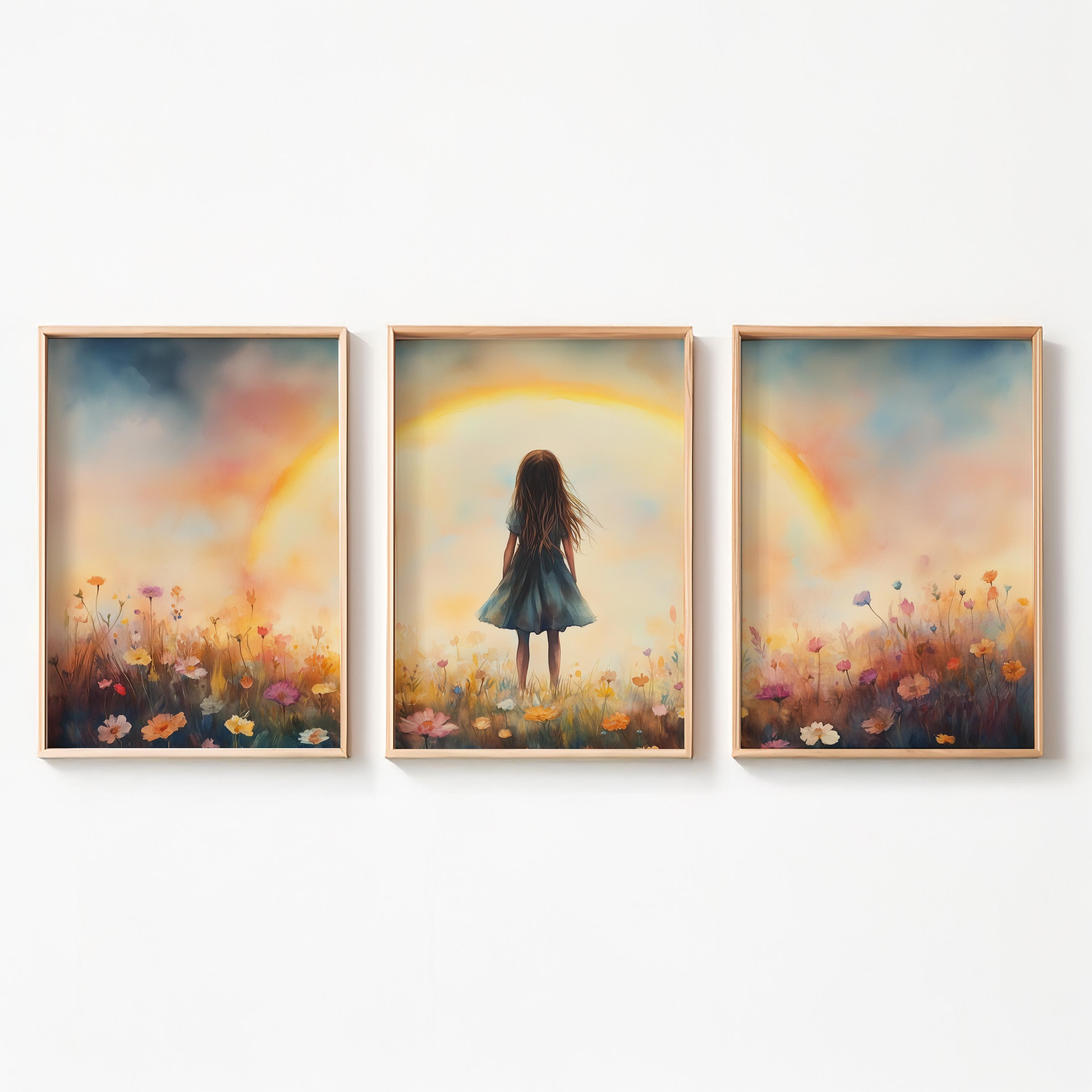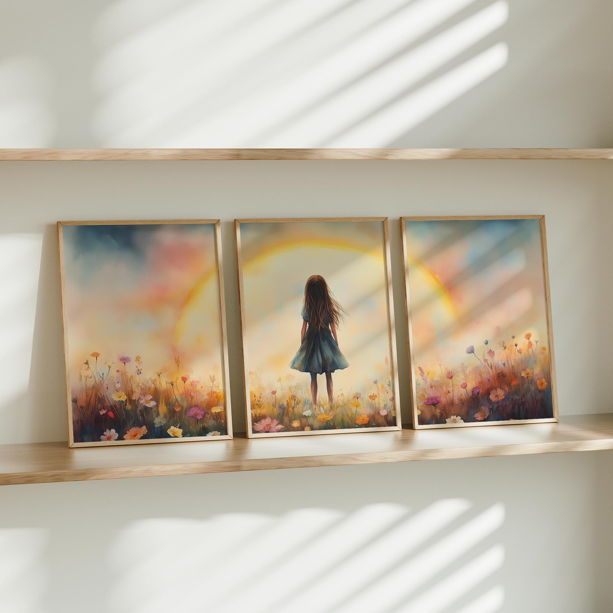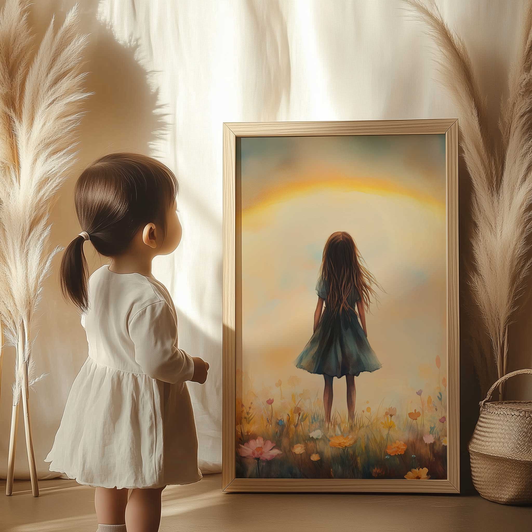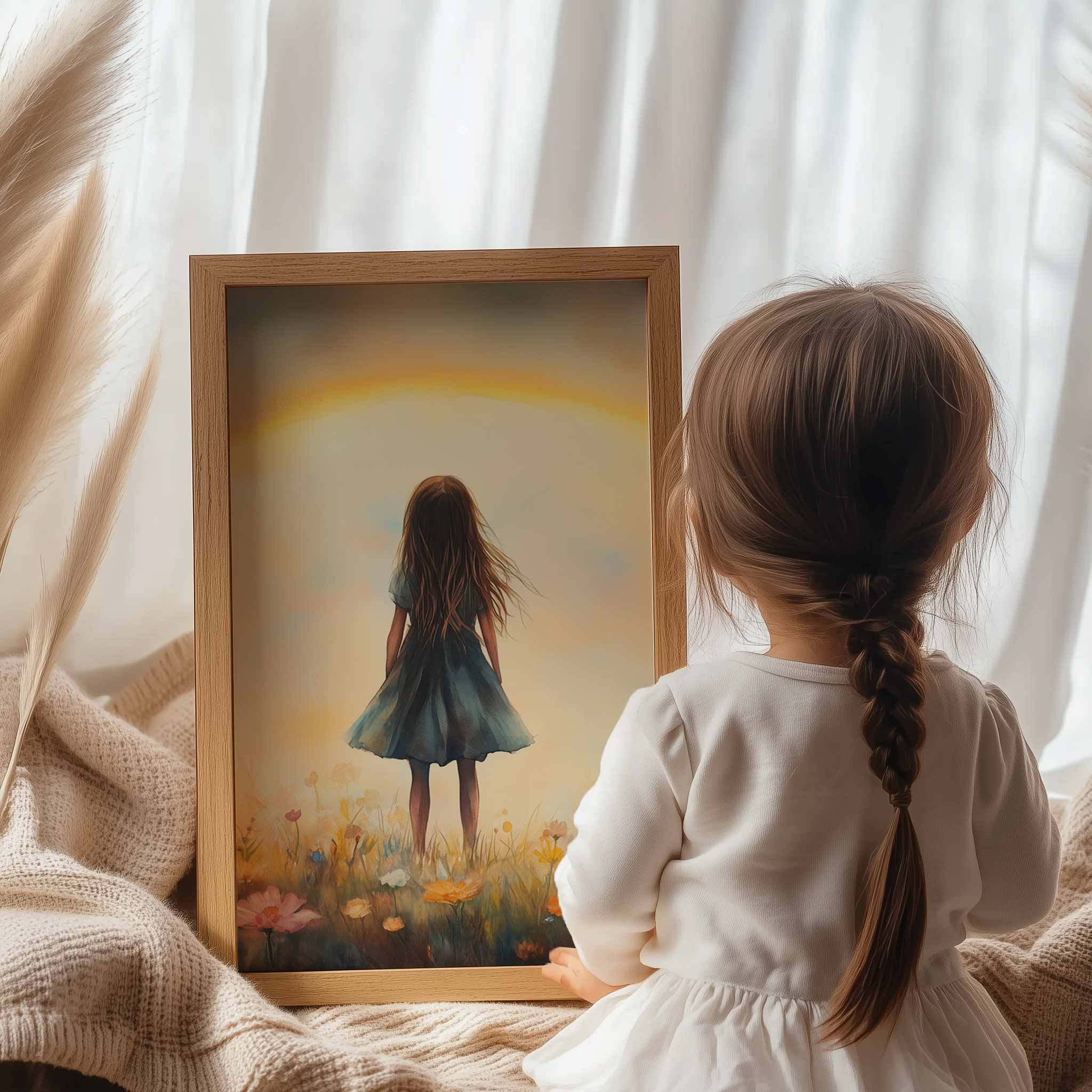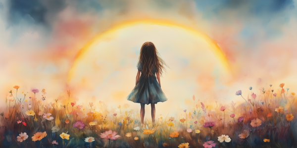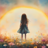 Vrolijk Meisje Onder Regenboog in Bloemenveld