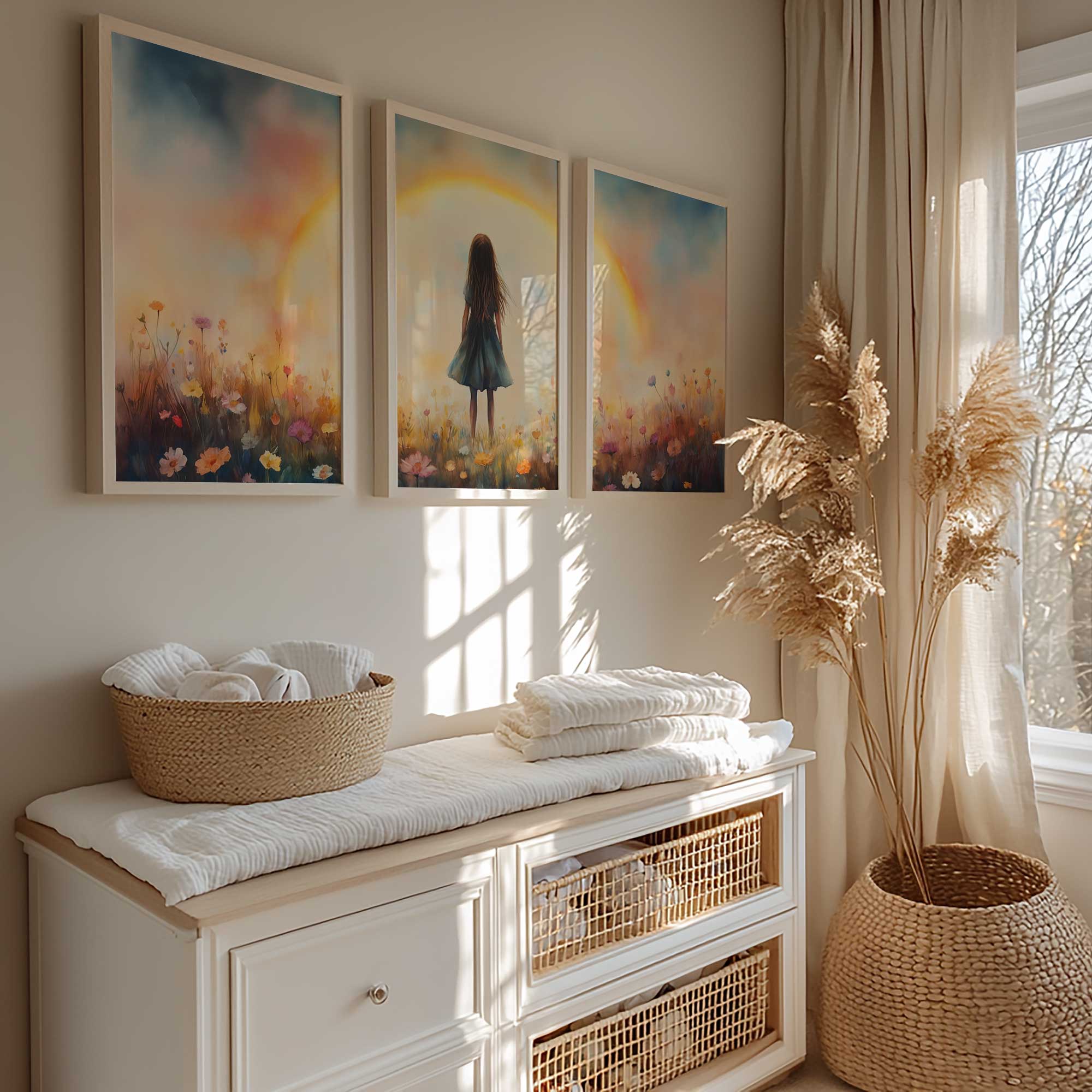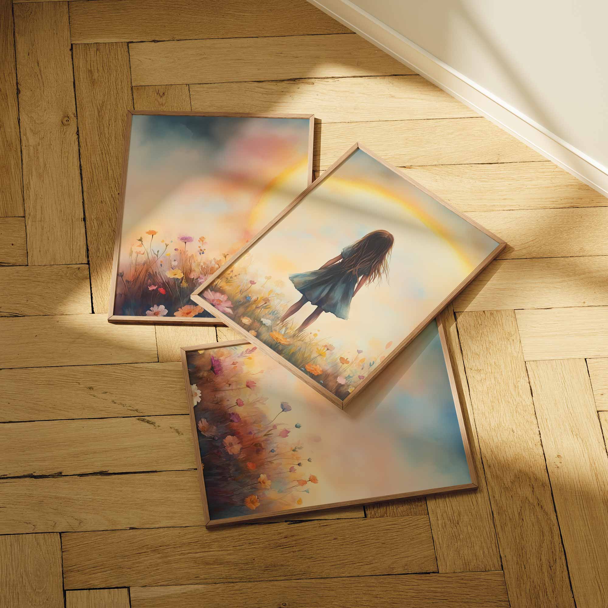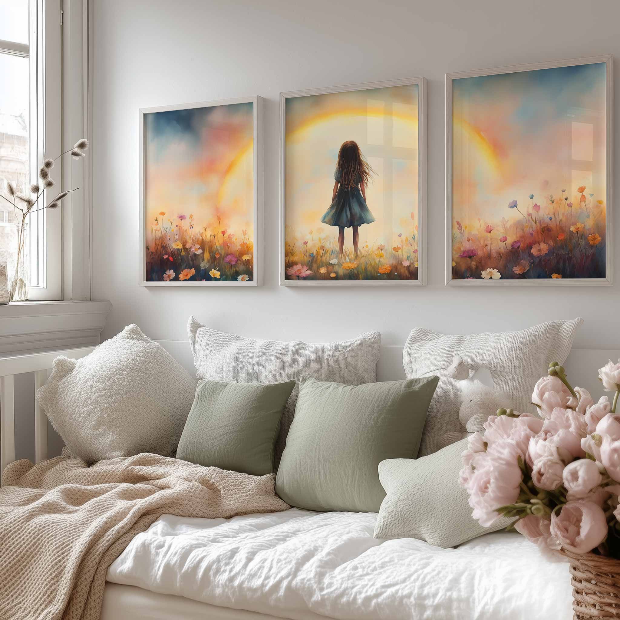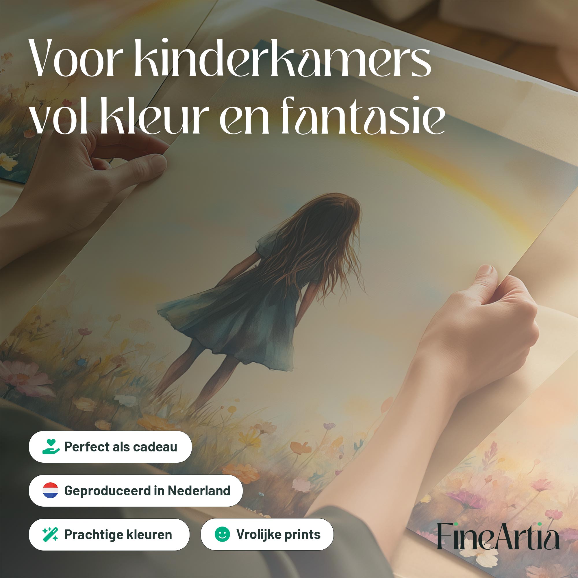 Vrolijk Meisje Onder Regenboog in Bloemenveld