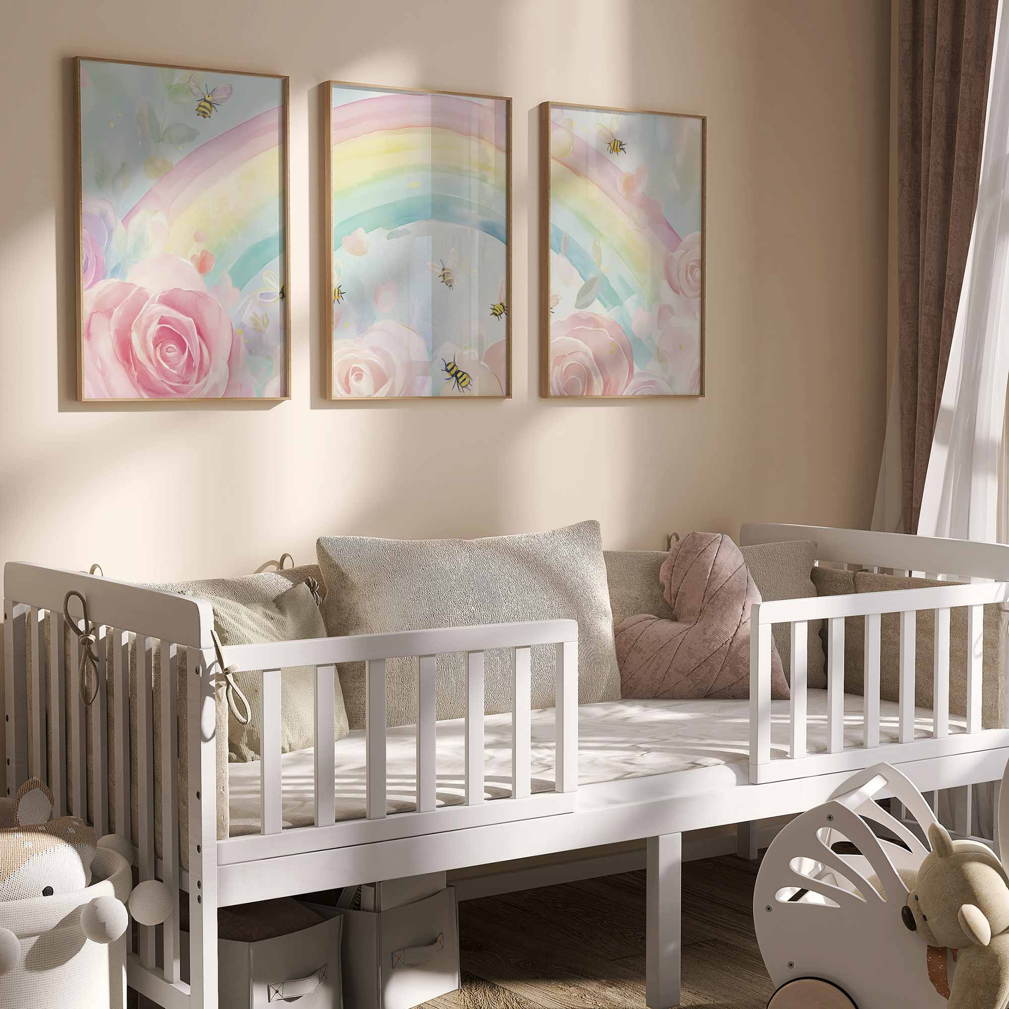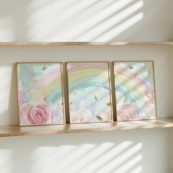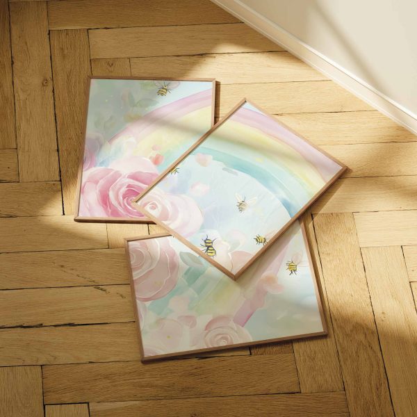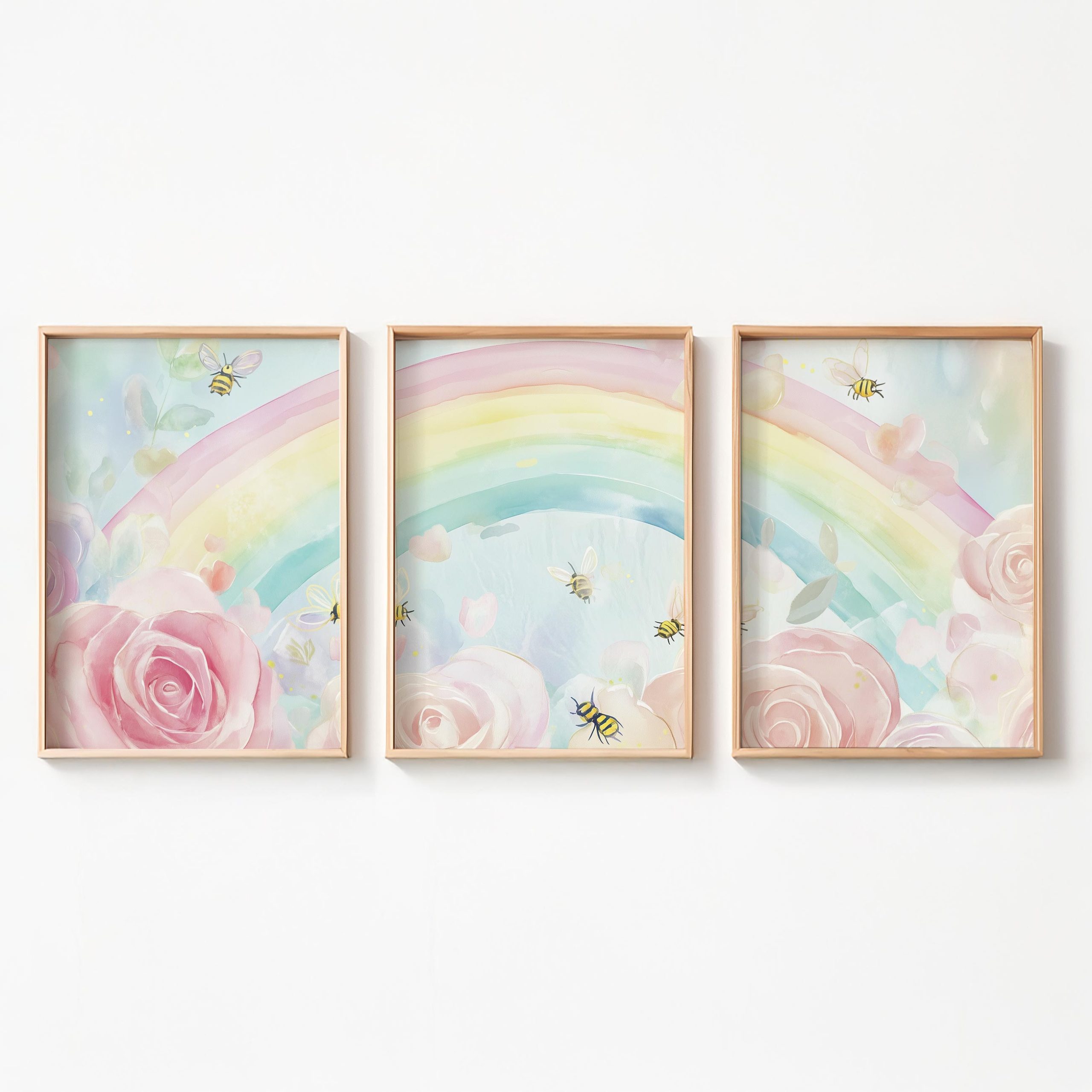 Vrolijke regenboog met rozen en bijtjes