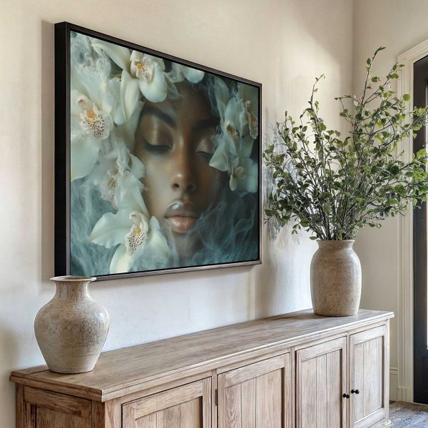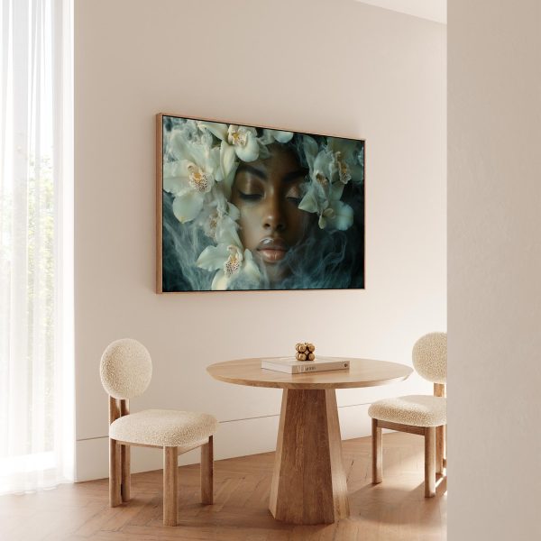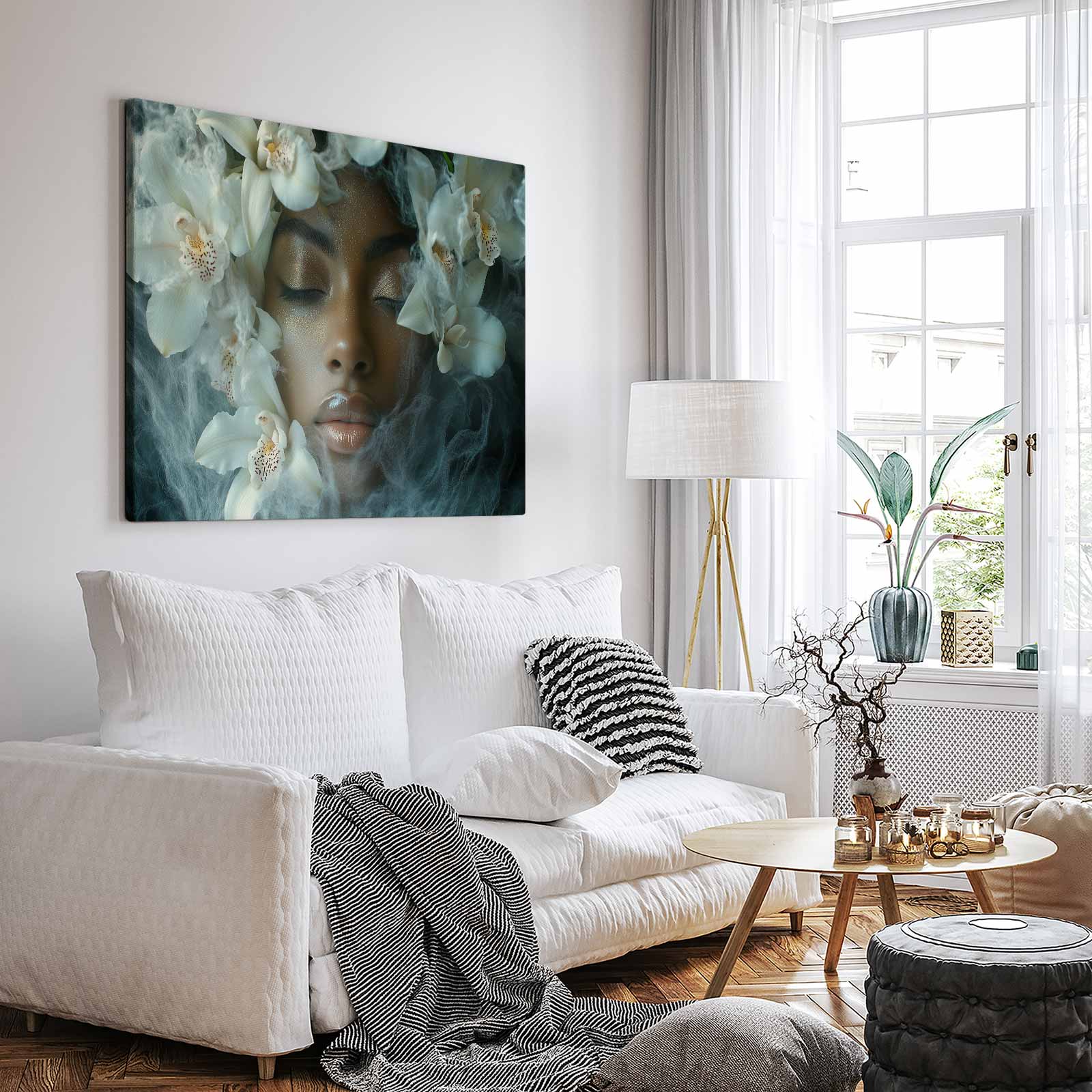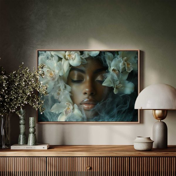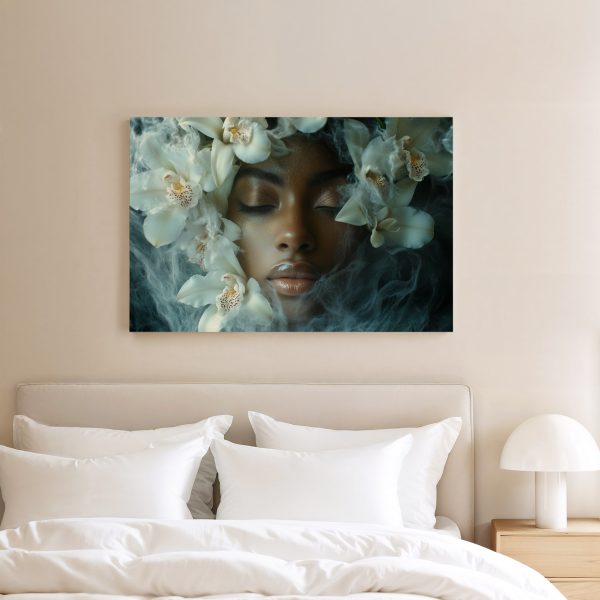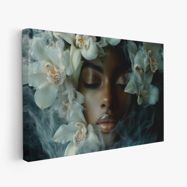 Vrouw omringd door witte bloemen
