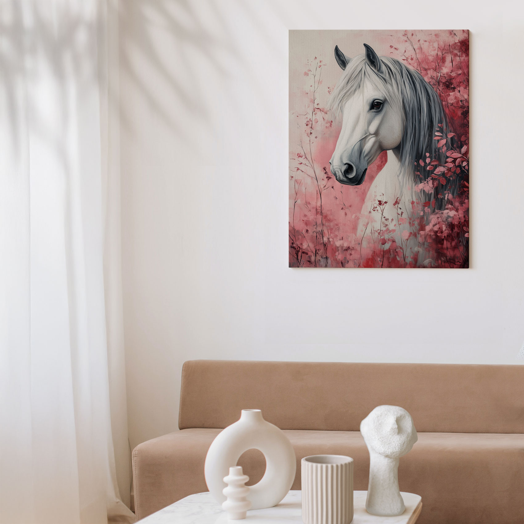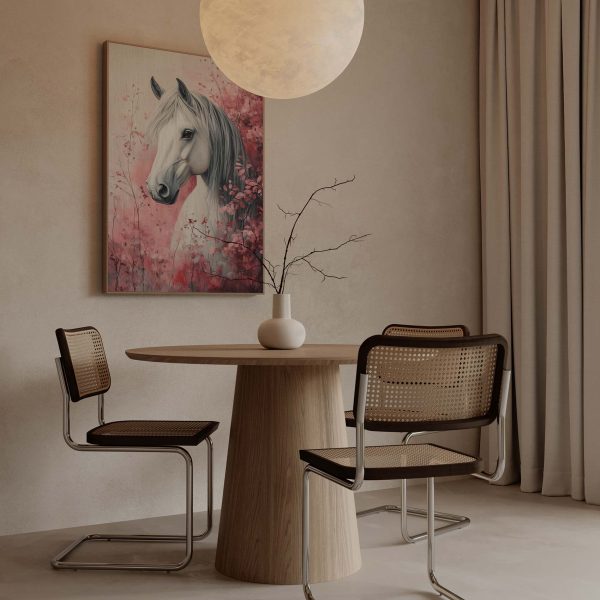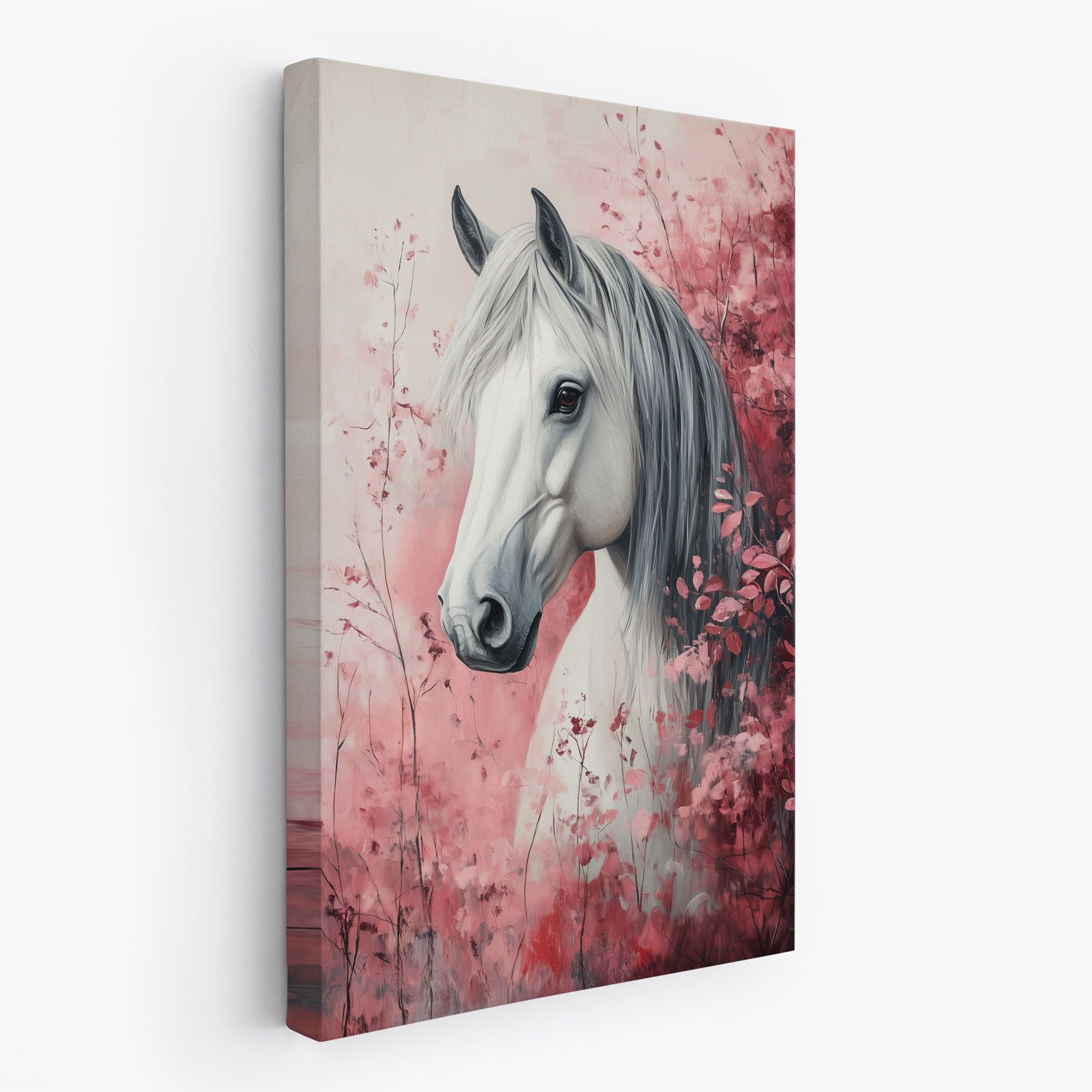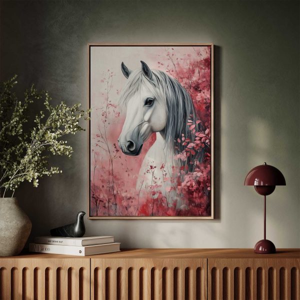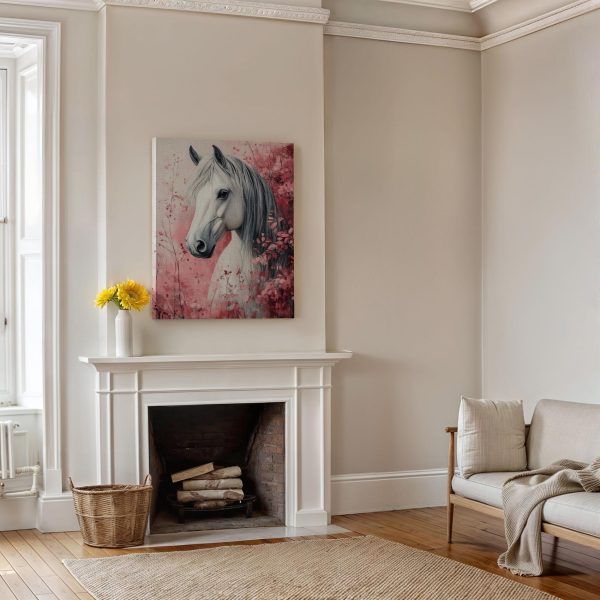 Terug naar collectie Canvas Wit paard tussen roze bloemen