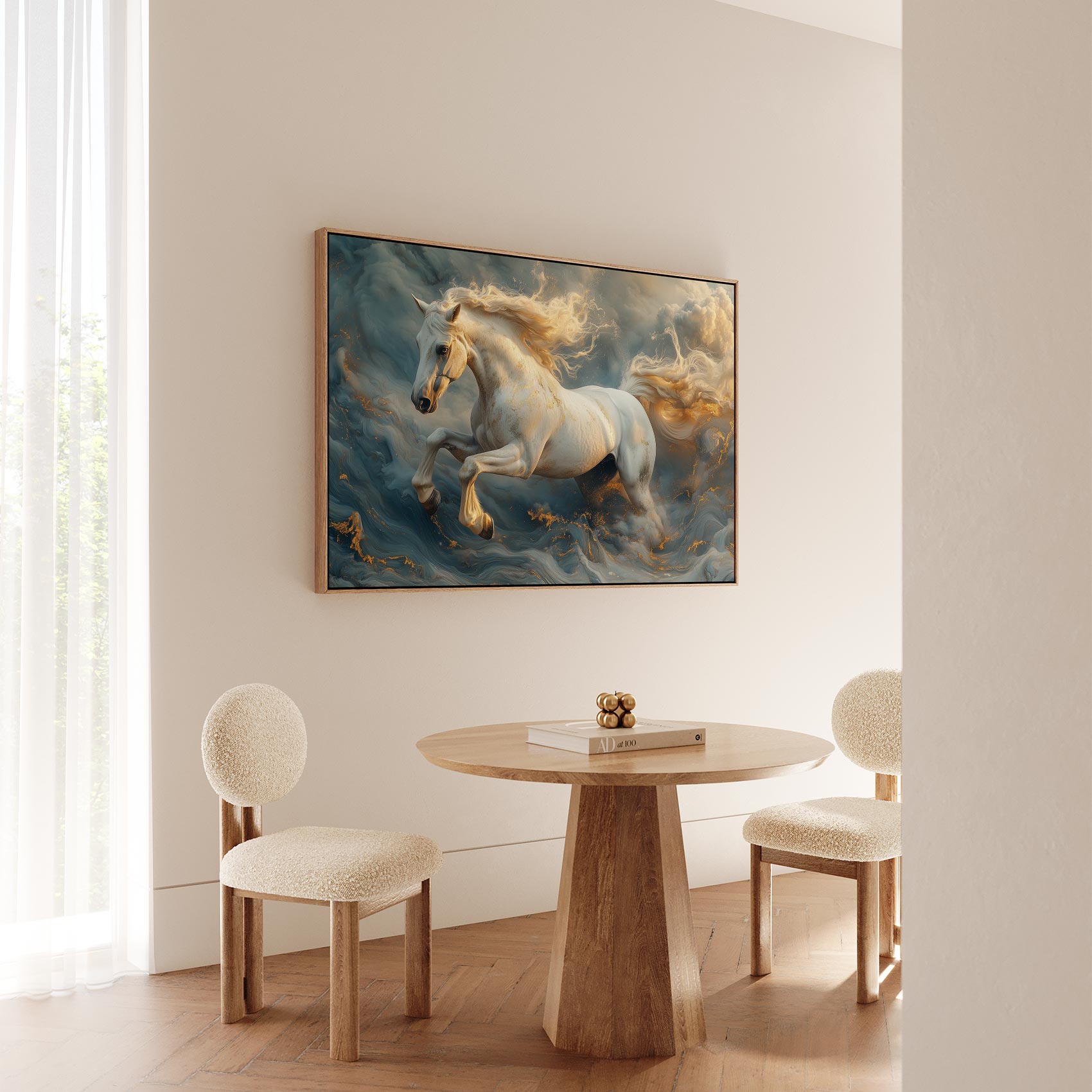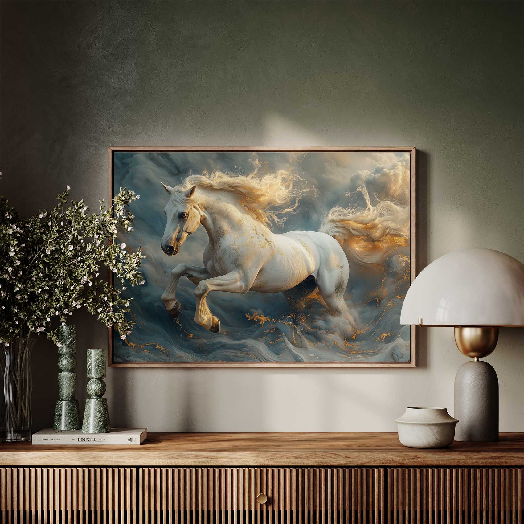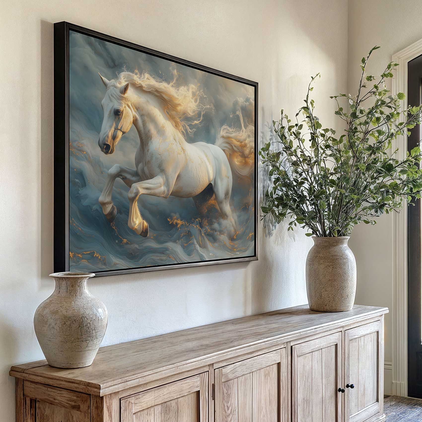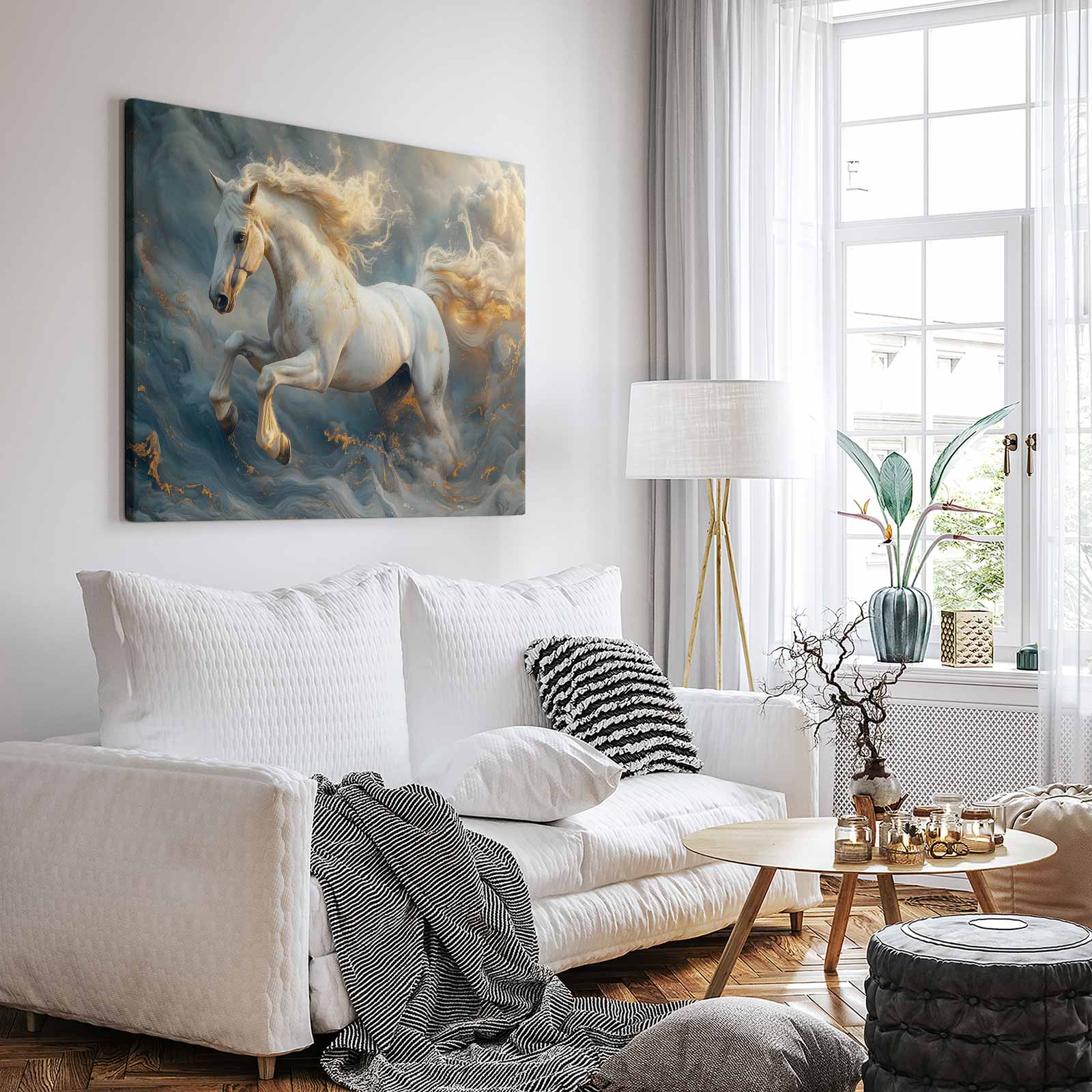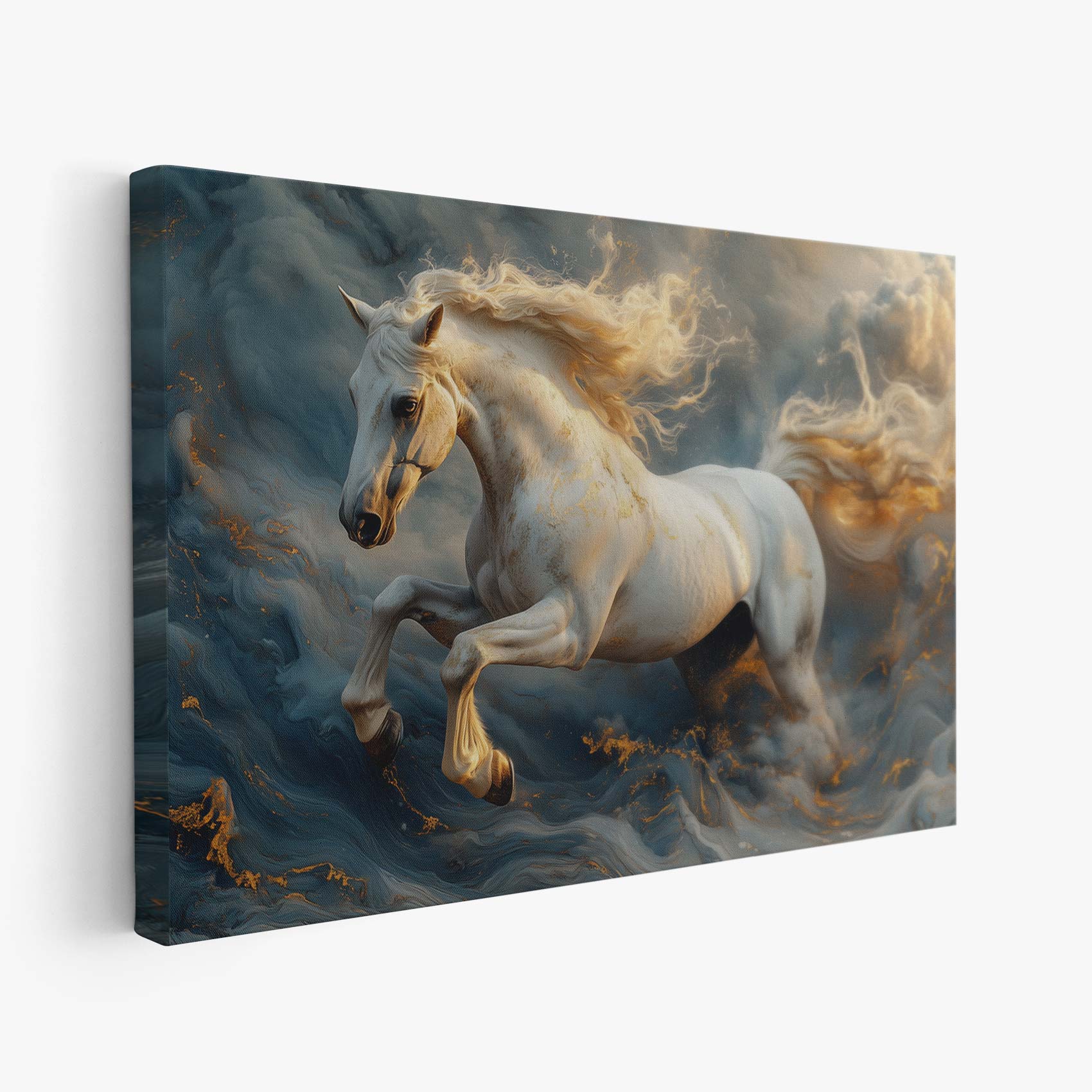Terug naar collectie Canvas Witte galopperende mistpaard