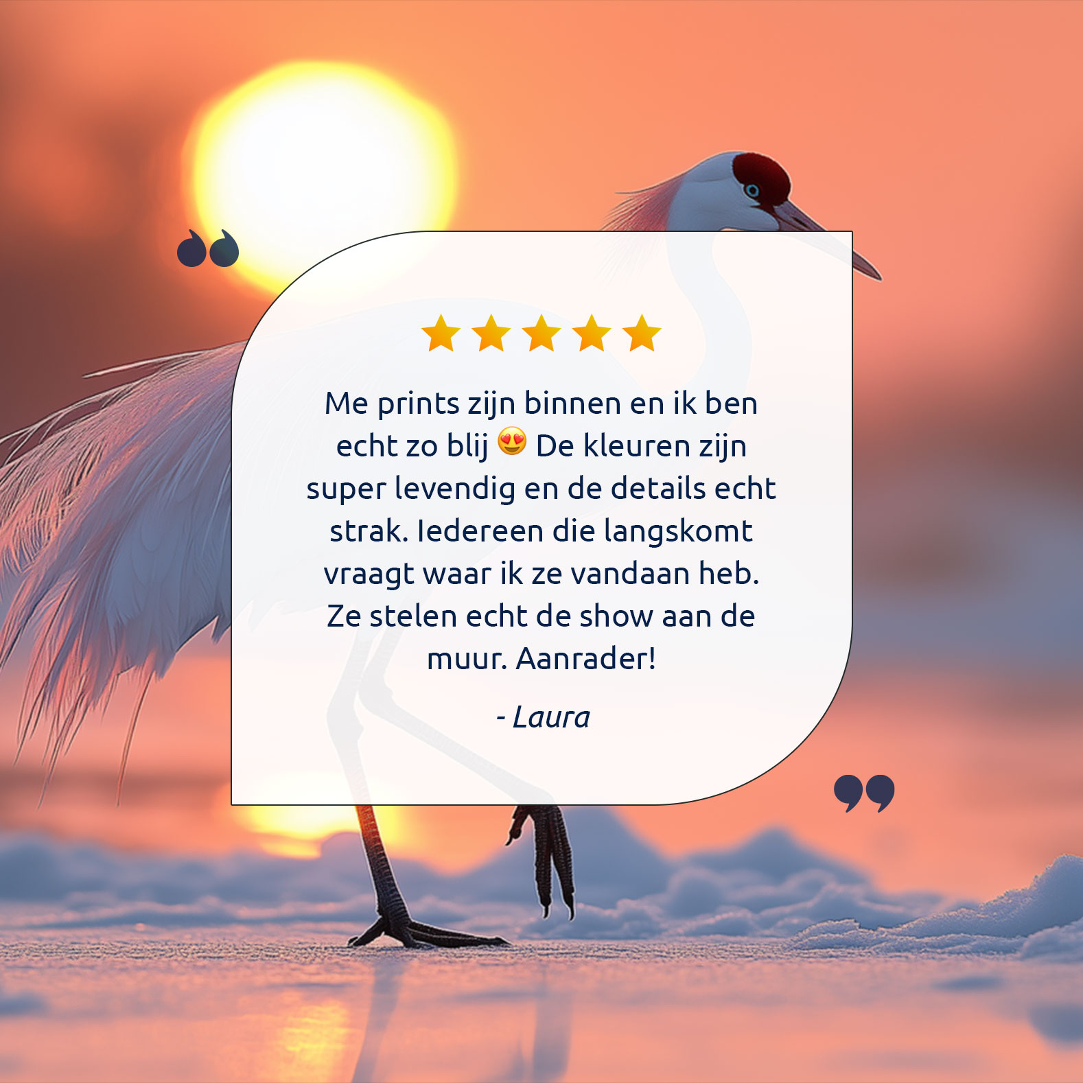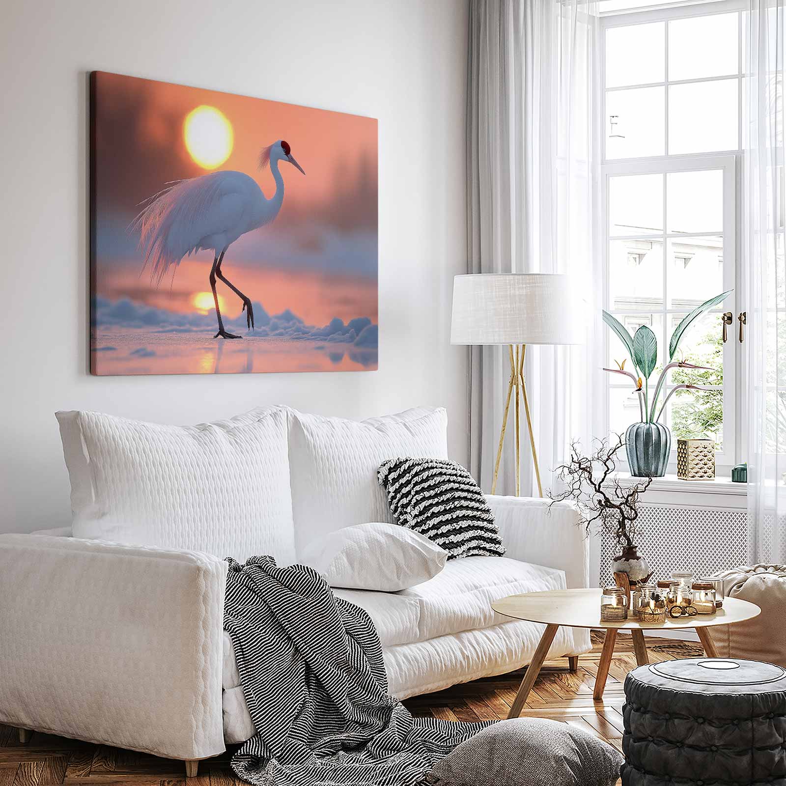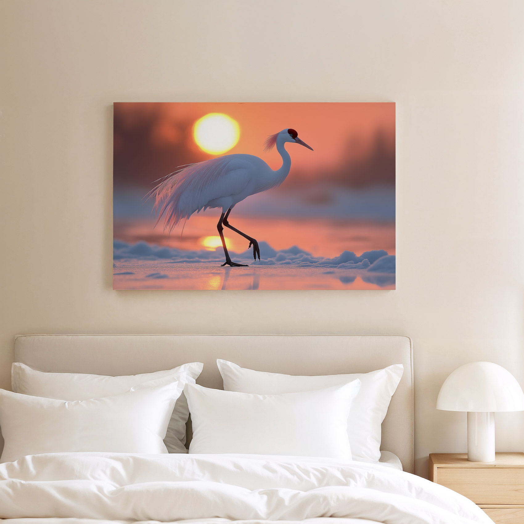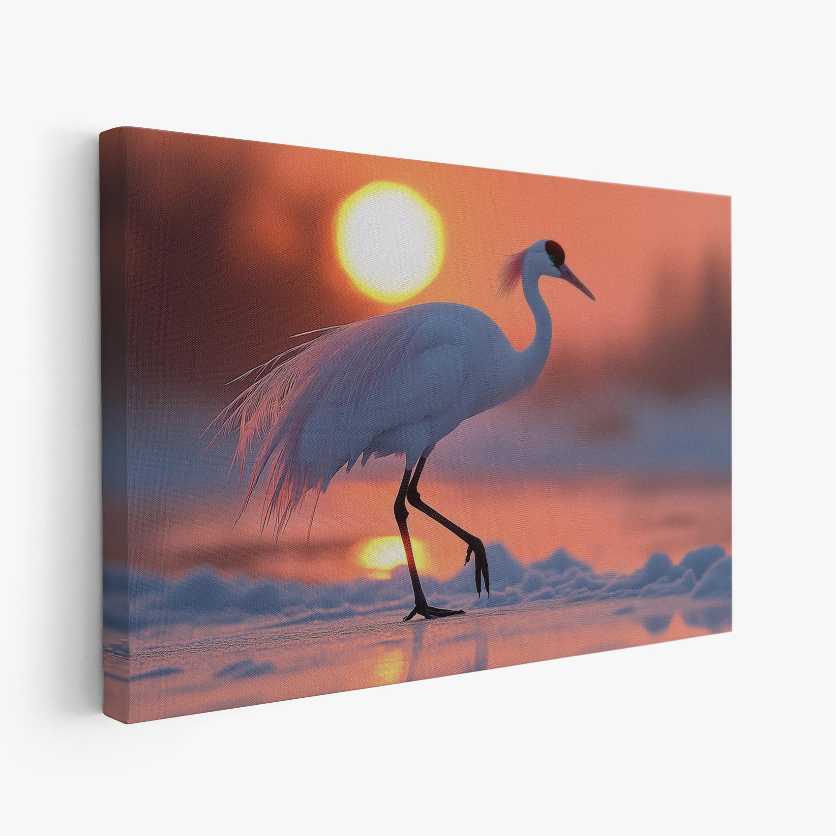 Witte kraanvogel bij zonsondergang