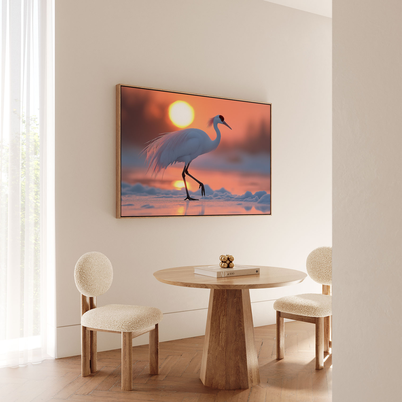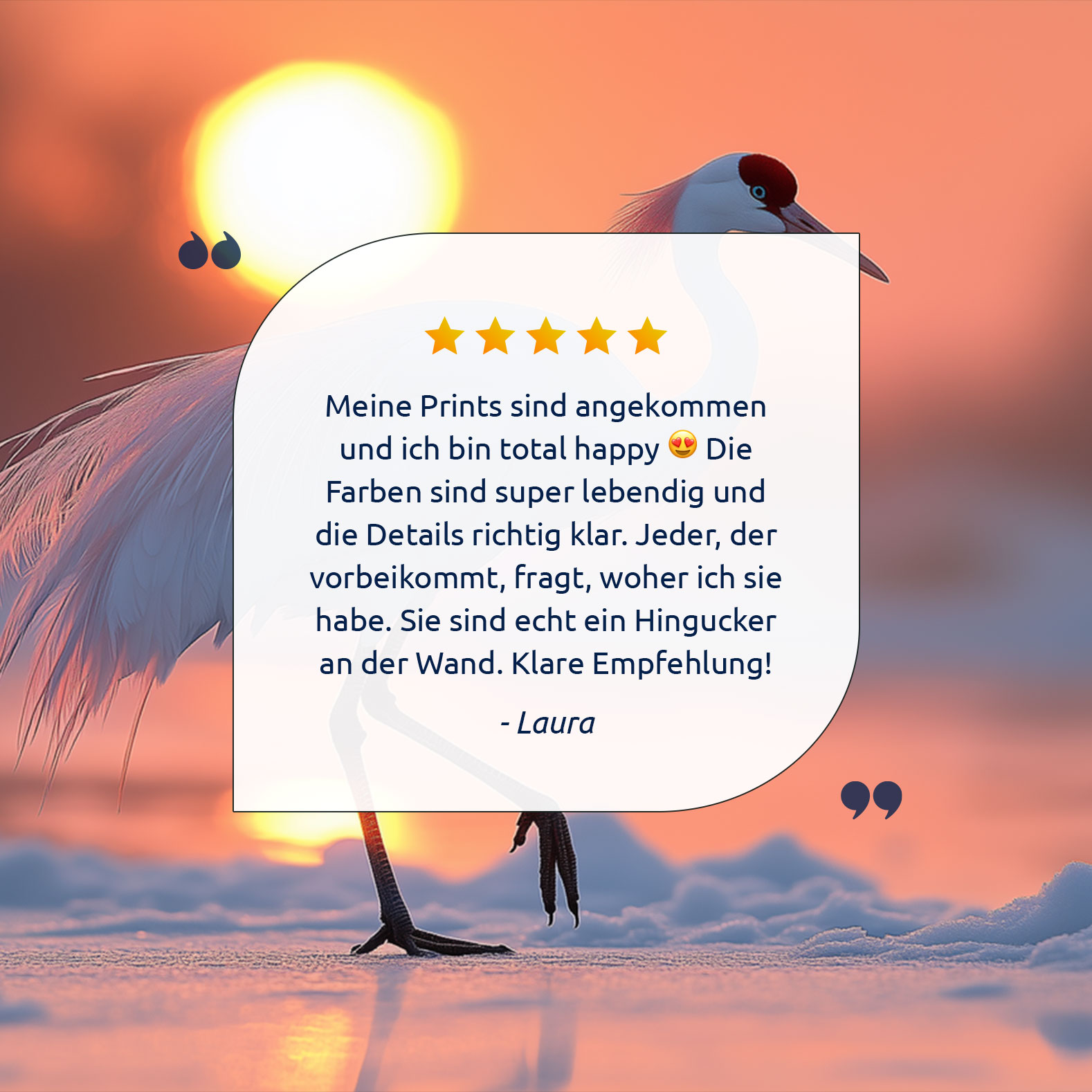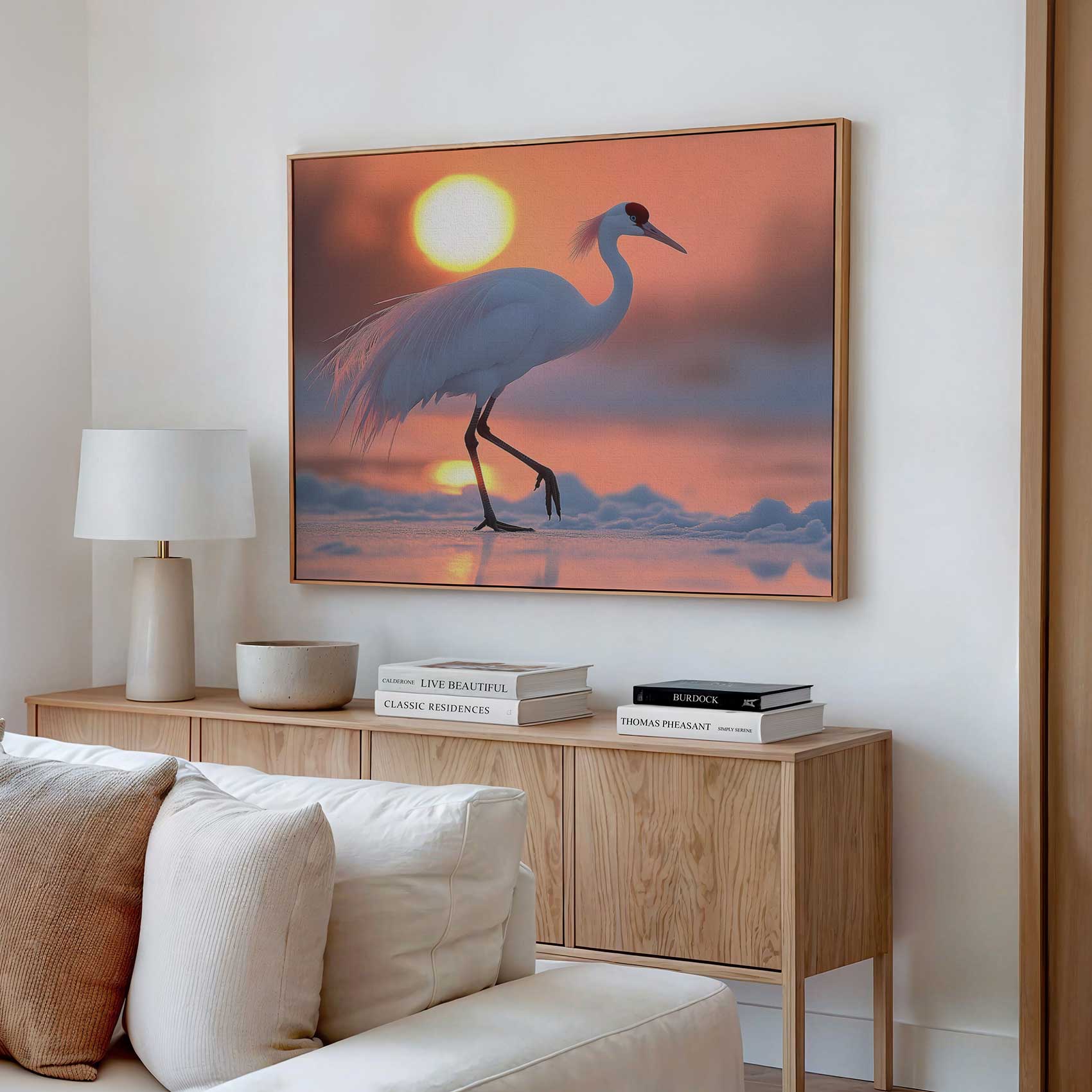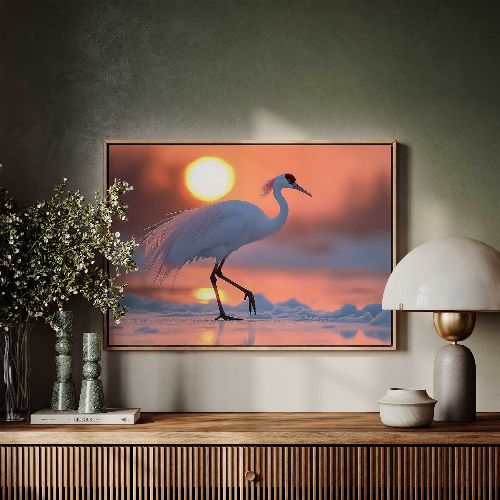 Witte kraanvogel bij zonsondergang