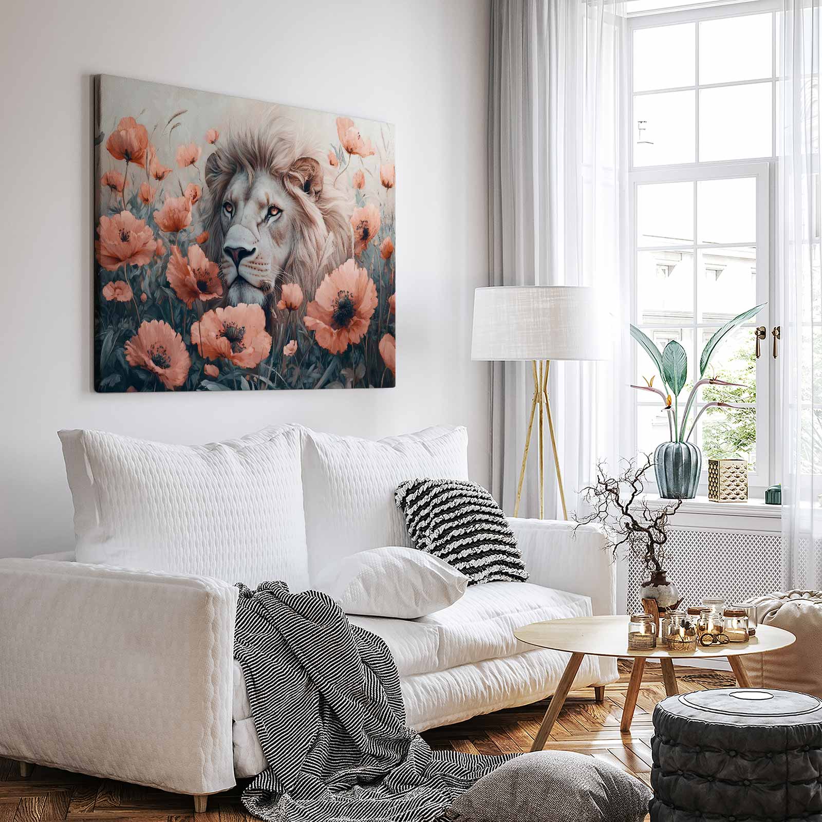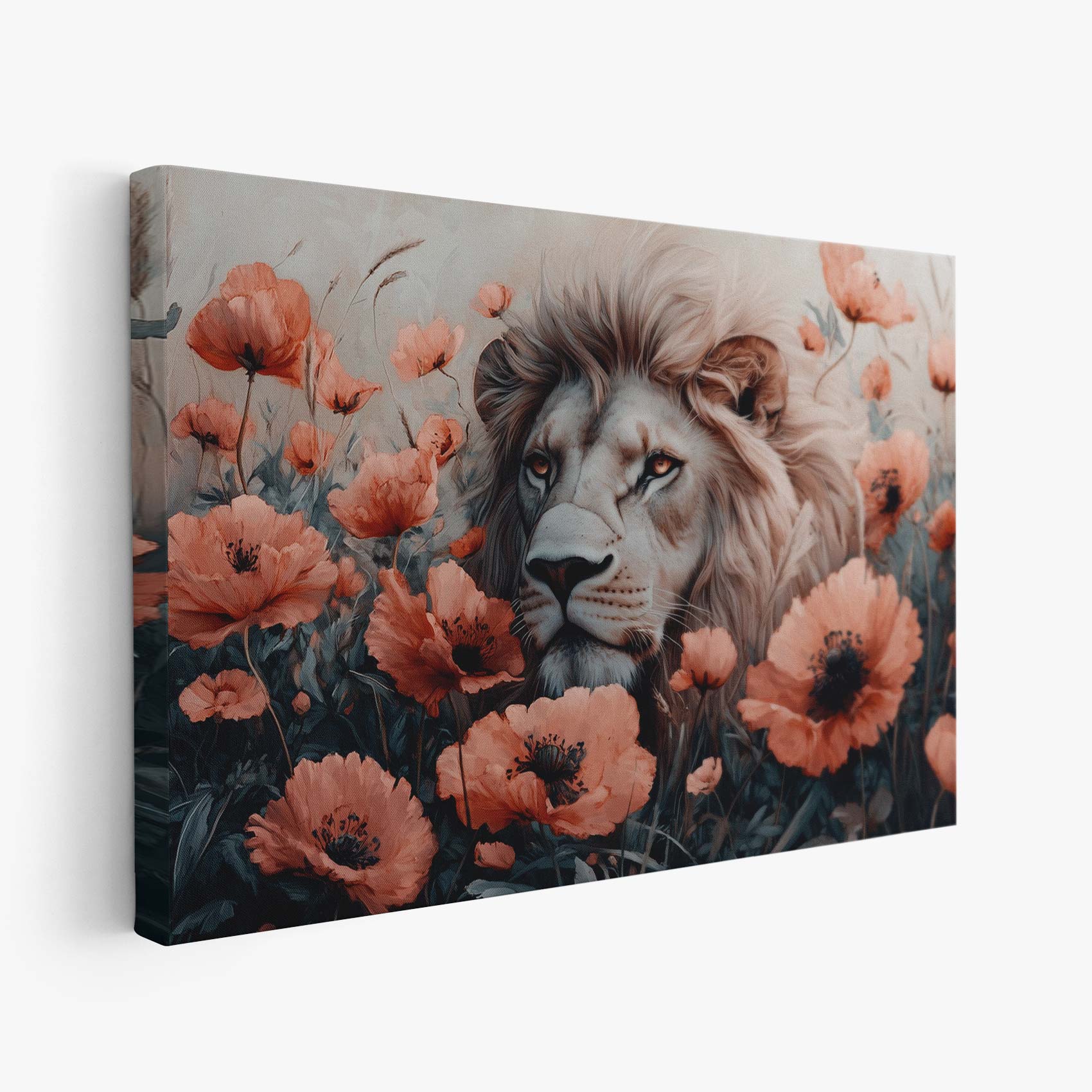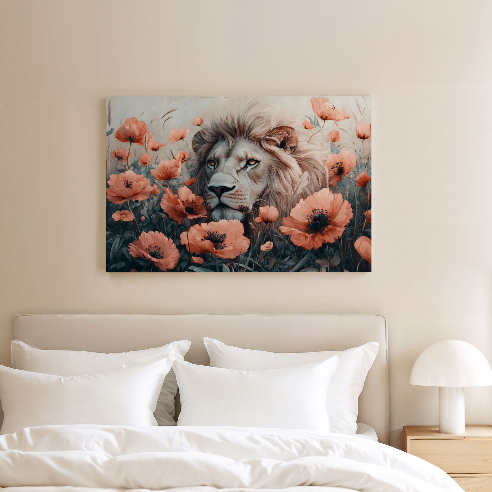 Witte leeuw tussen oranje bloemen