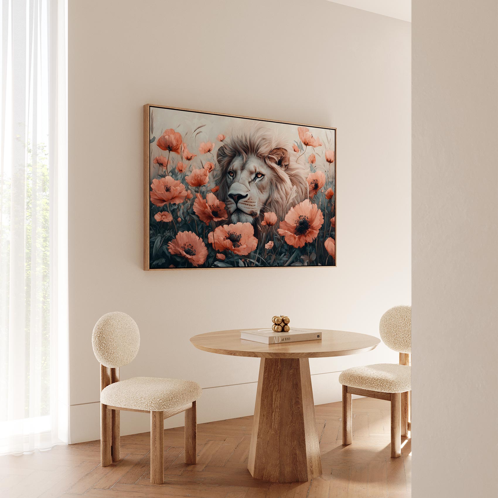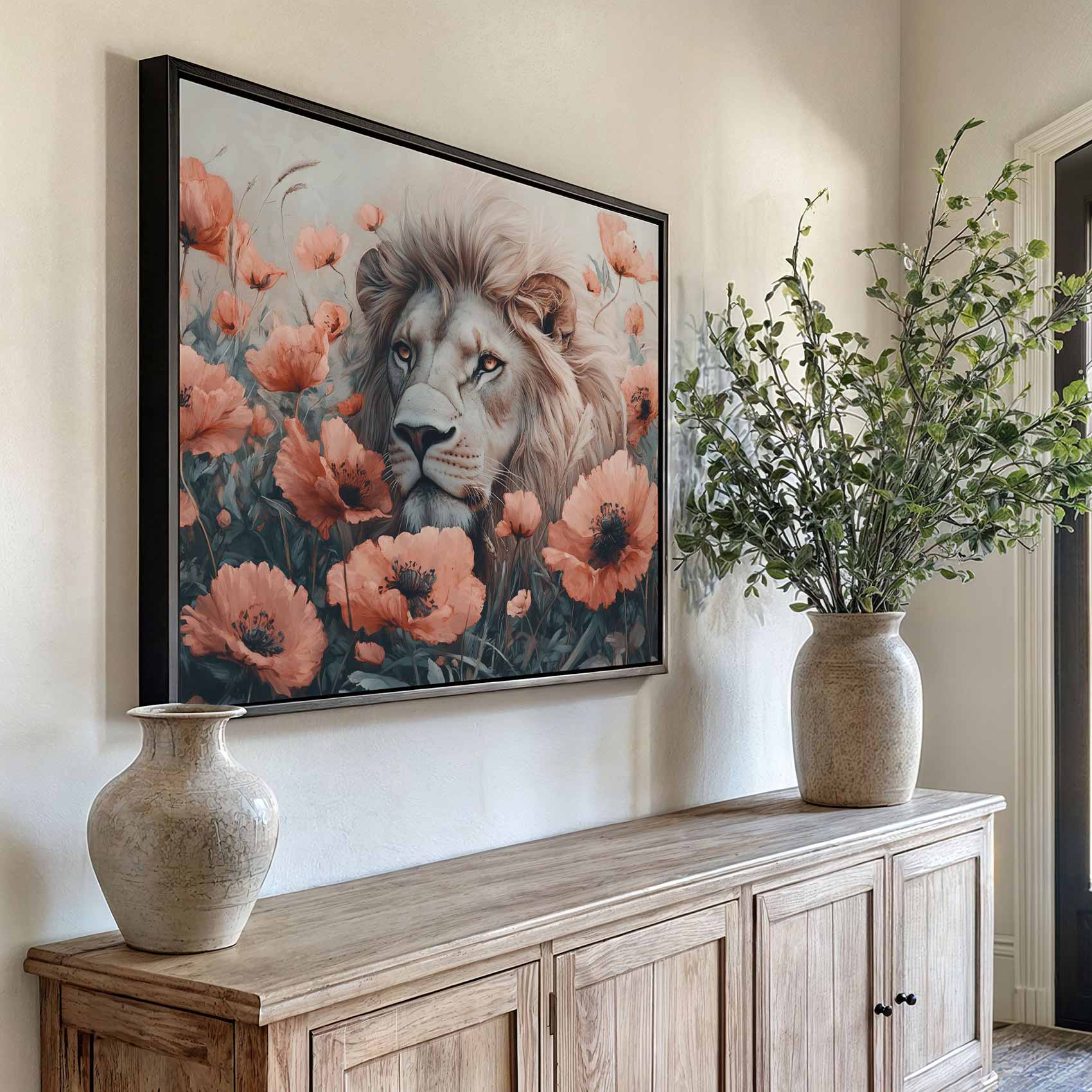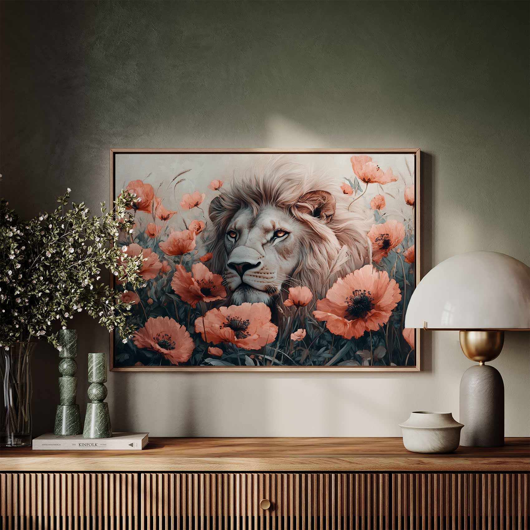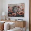 Witte leeuw tussen oranje bloemen