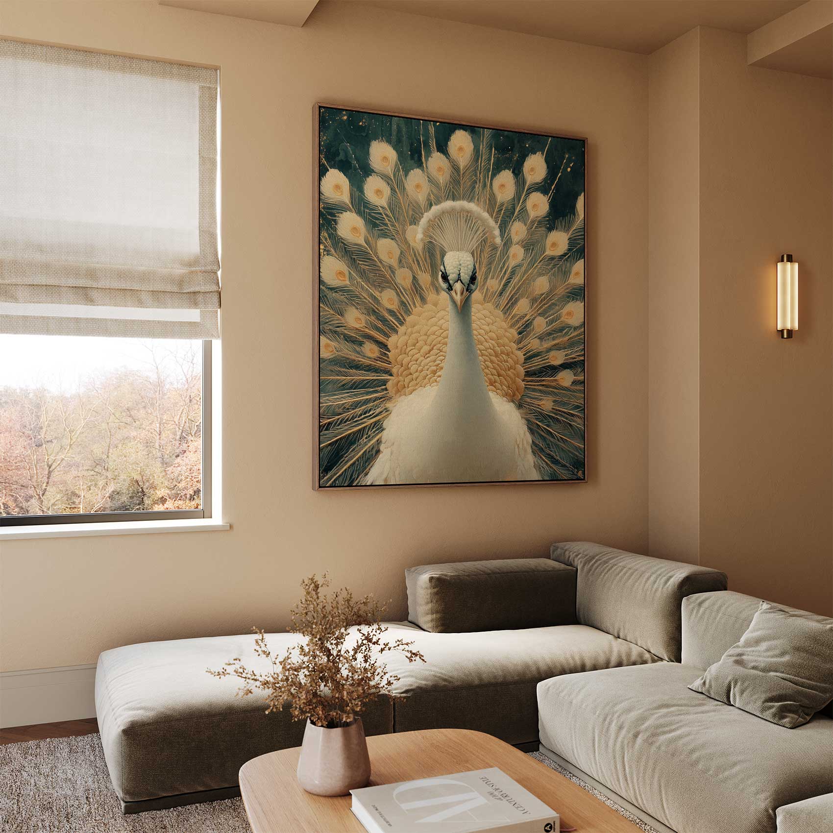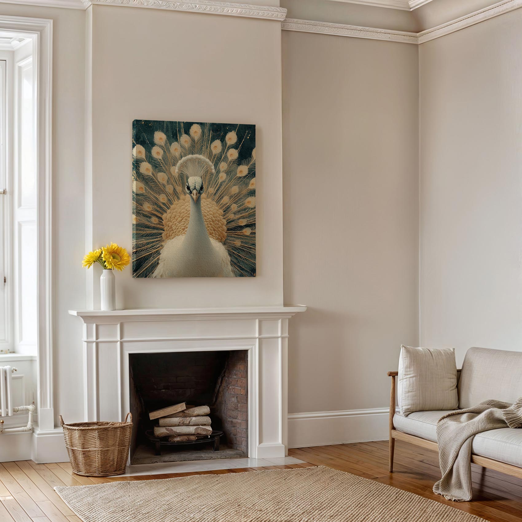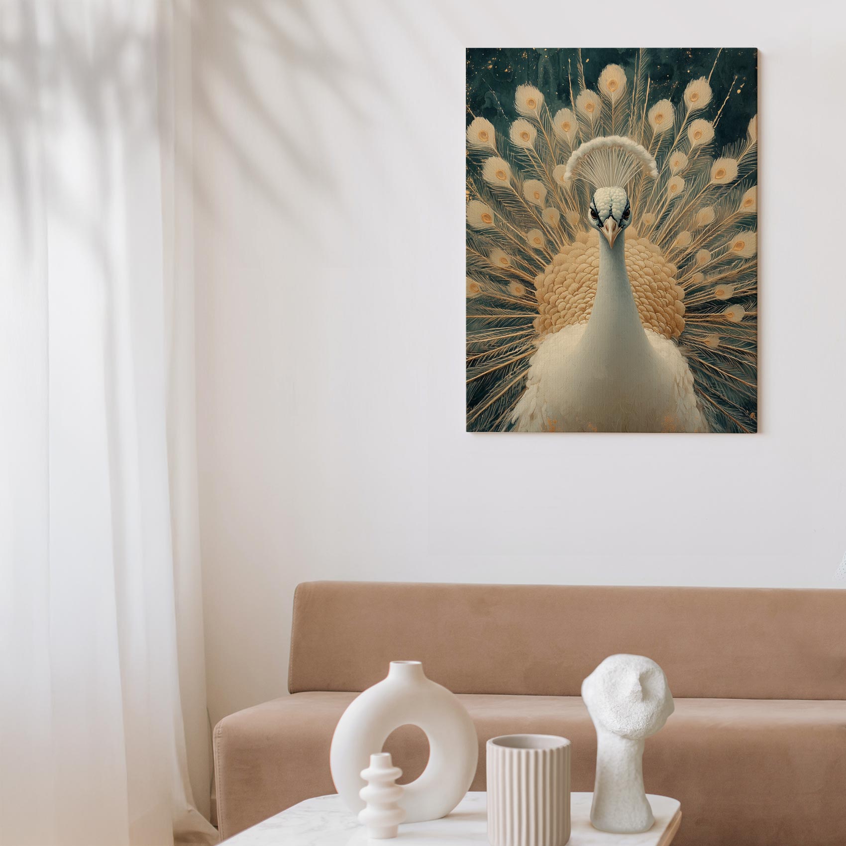 Terug naar collectie Canvas Witte pauw met prachtveren