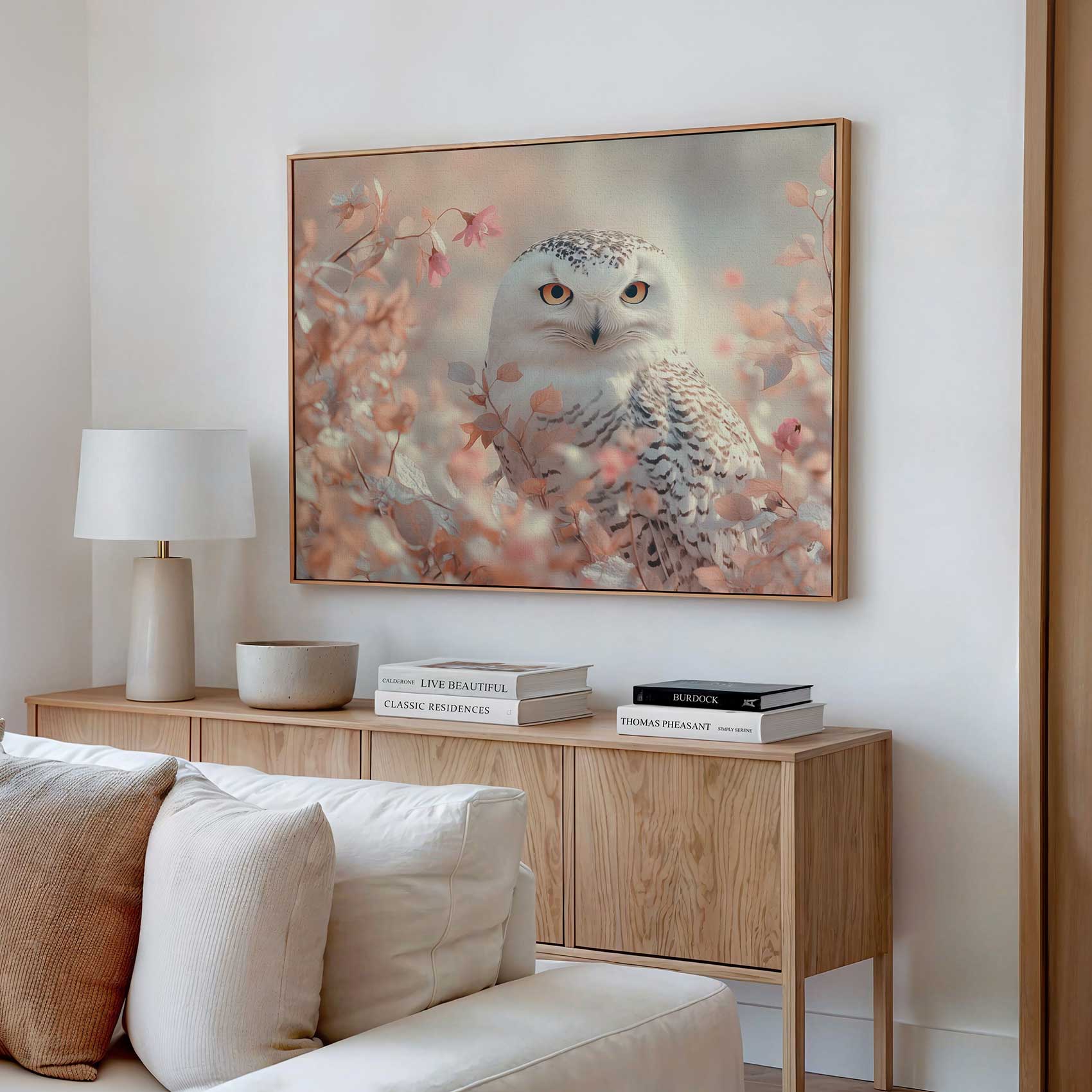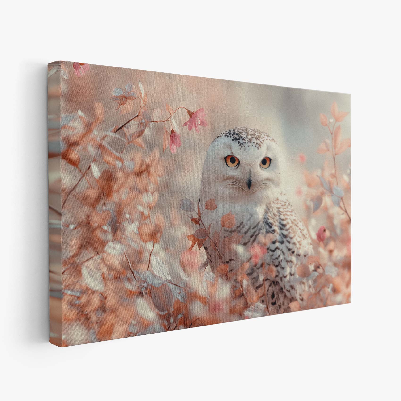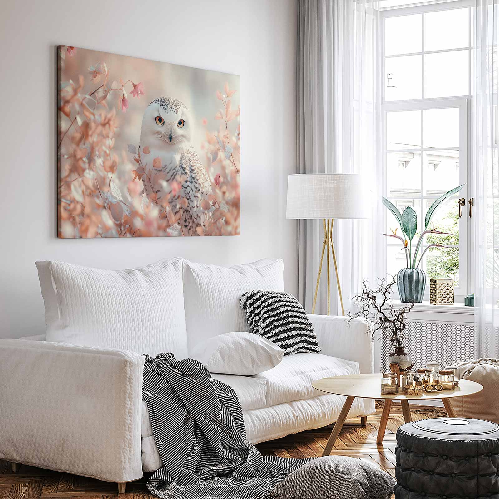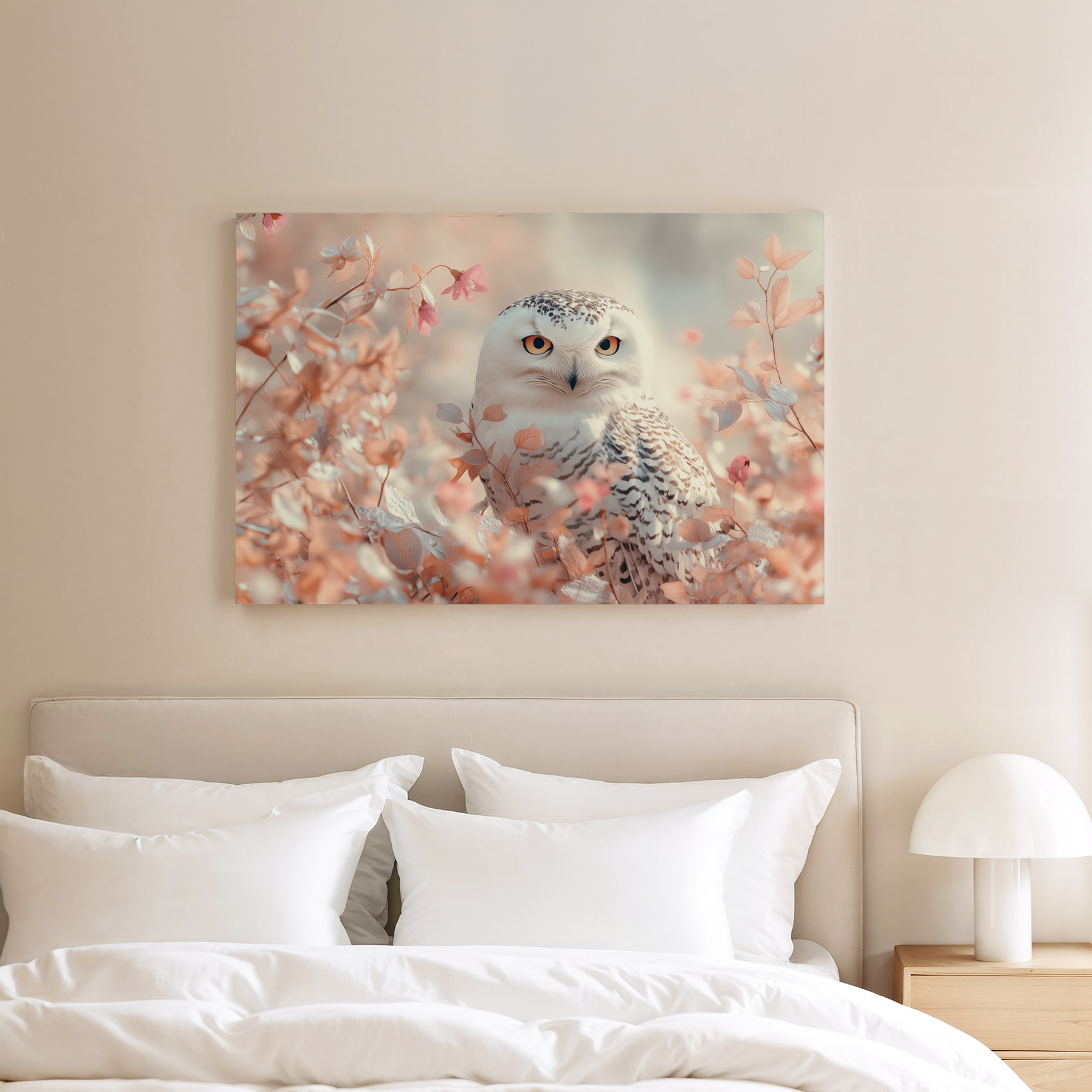 Terug naar collectie Canvas Witte uil tussen roze bloemen