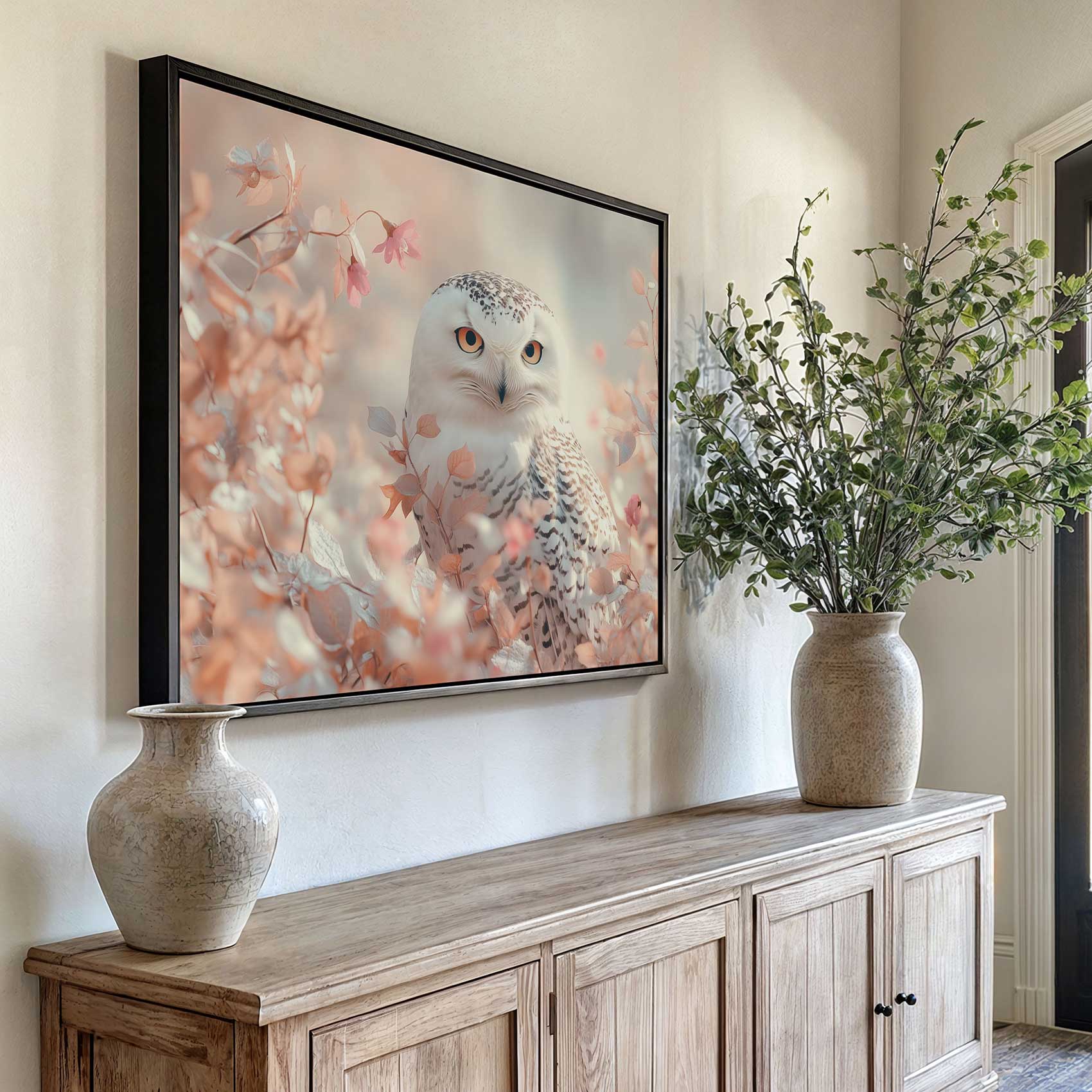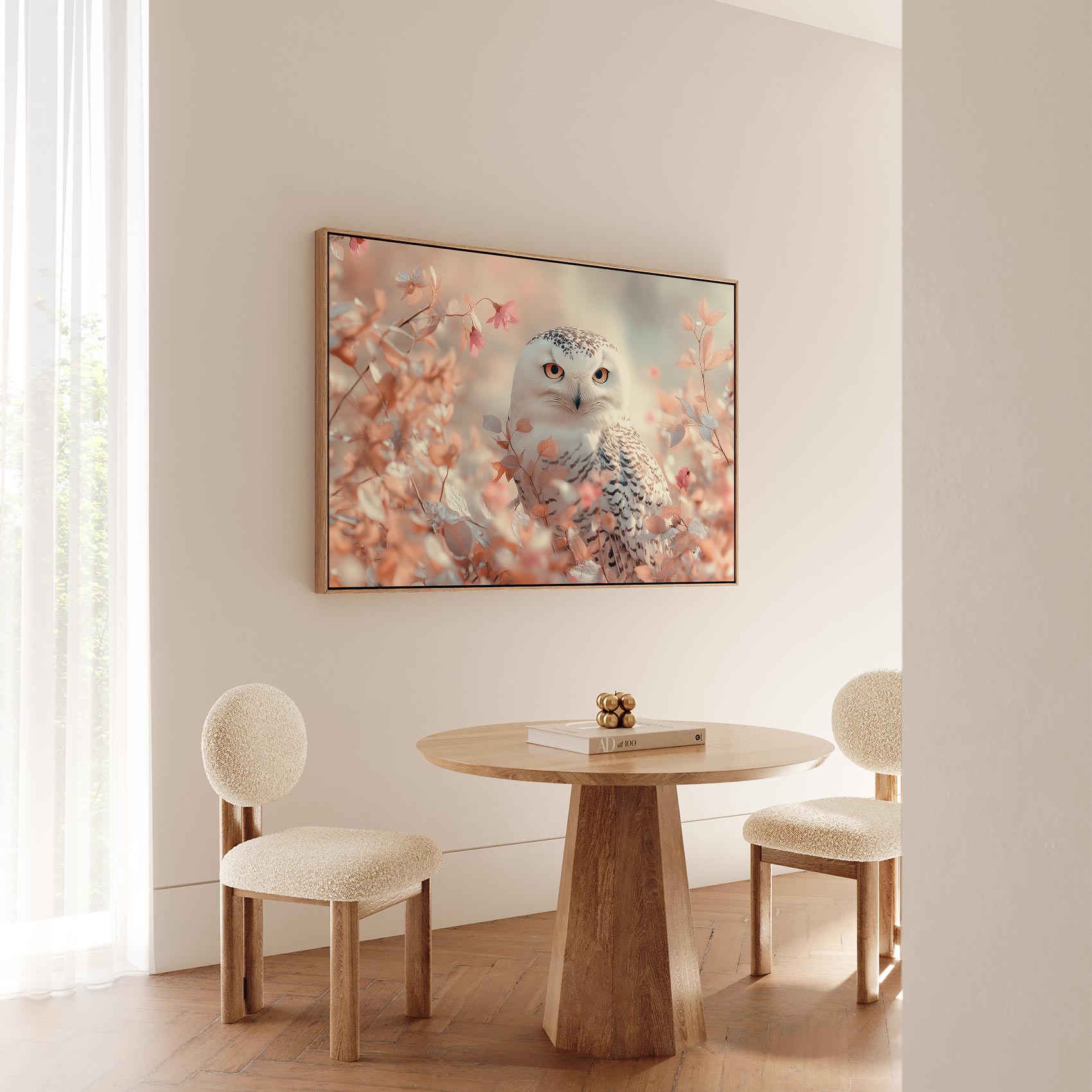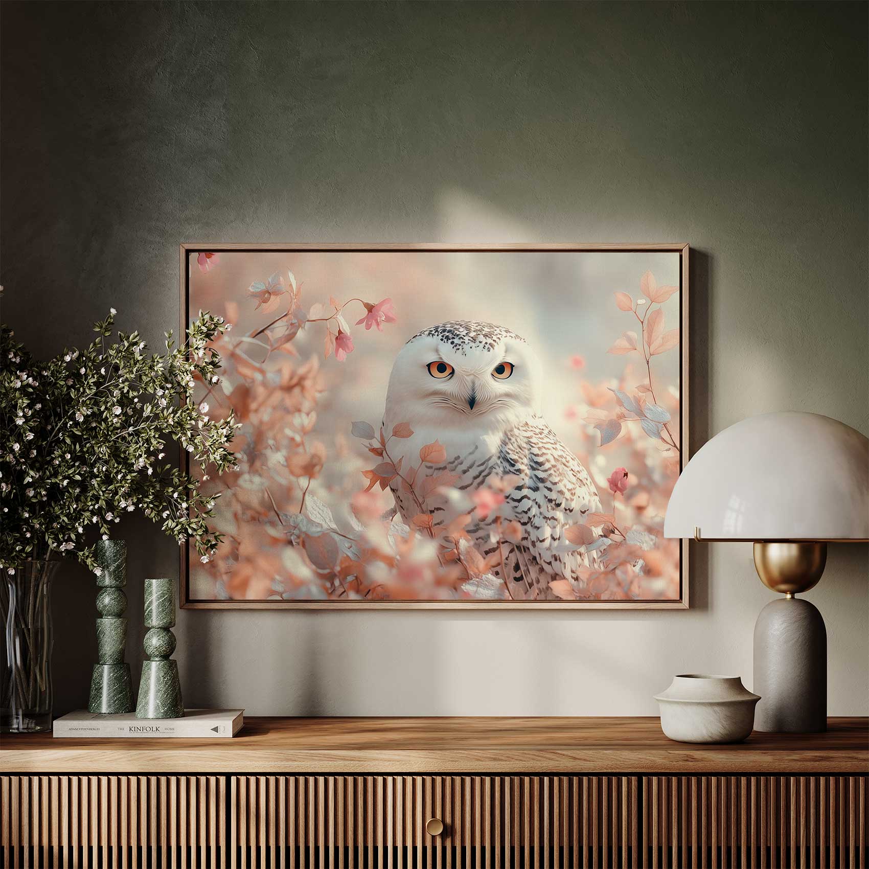Terug naar collectie Canvas Witte uil tussen roze bloemen