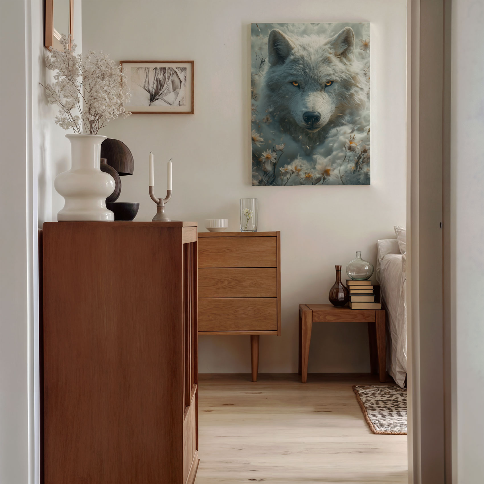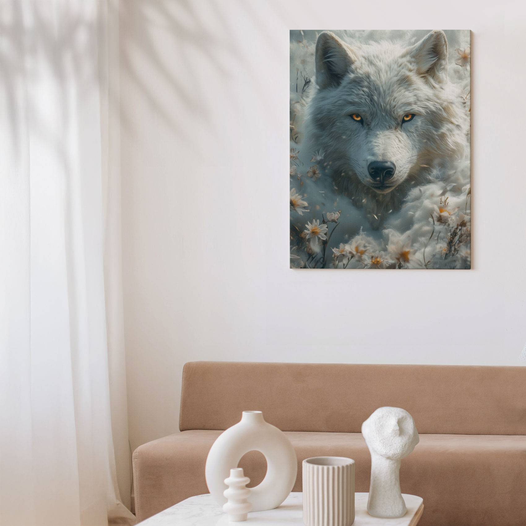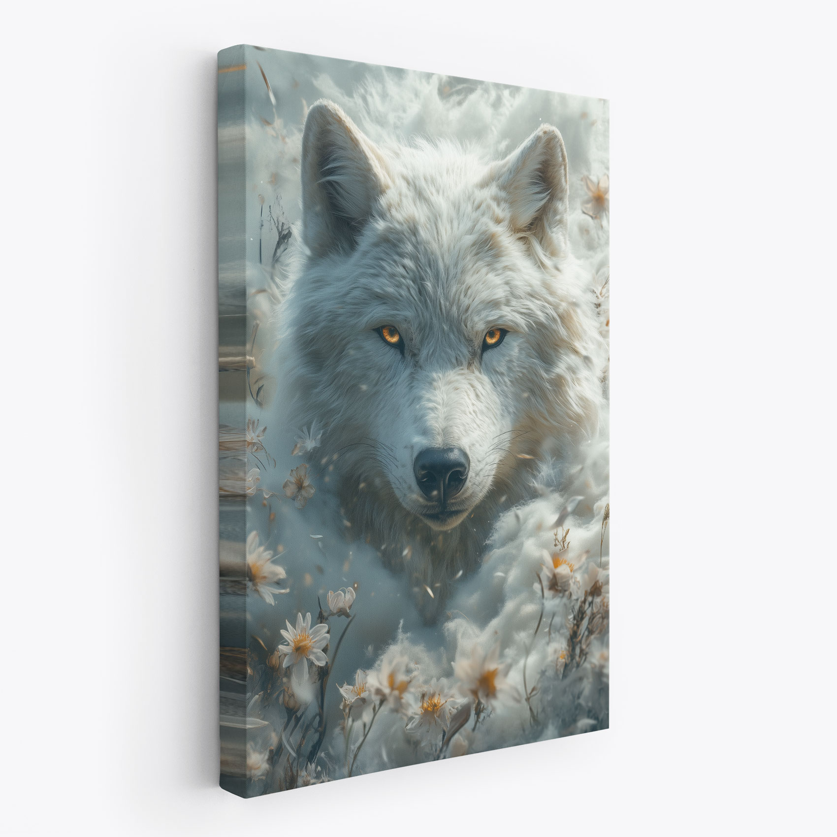 Witte wolf tussen bloemen