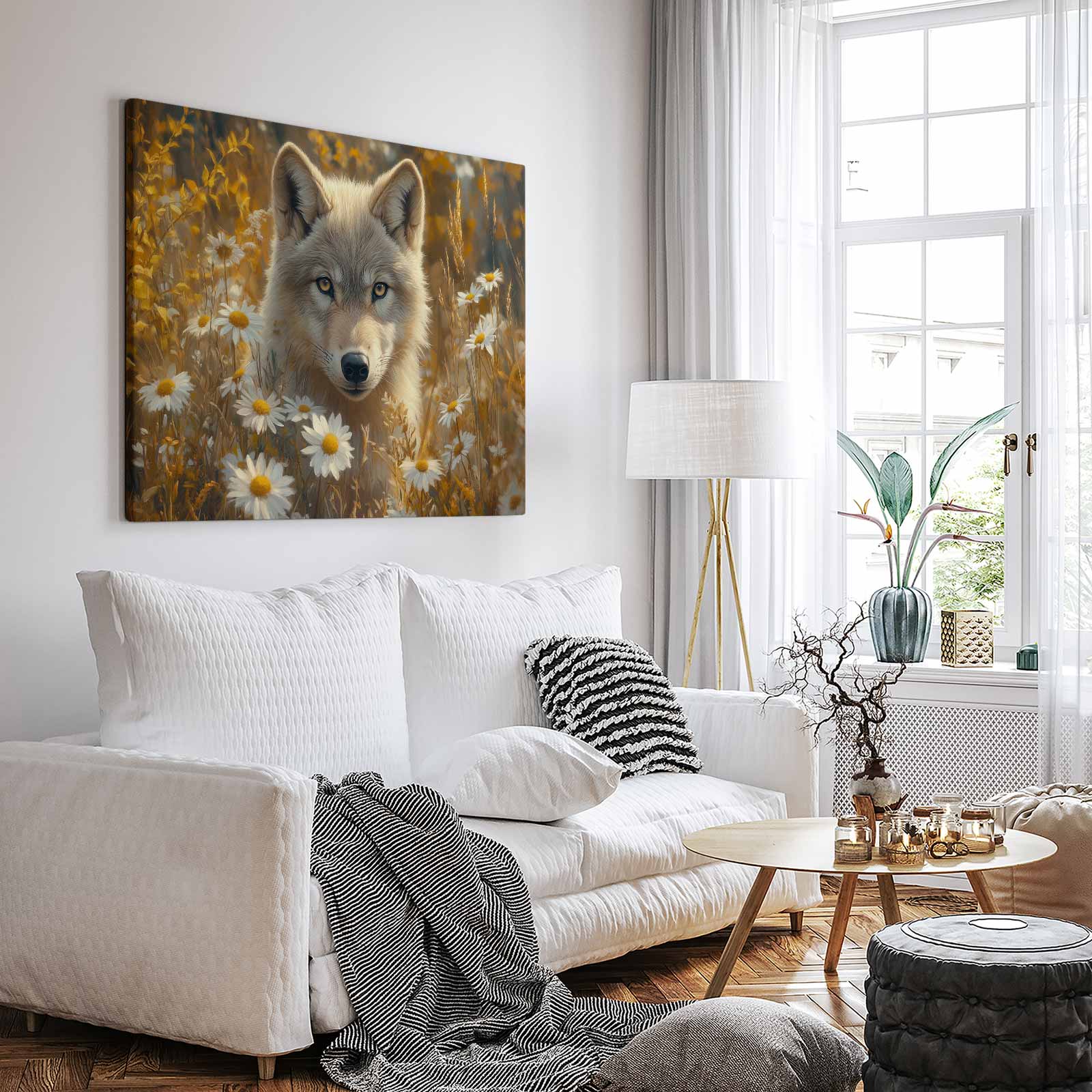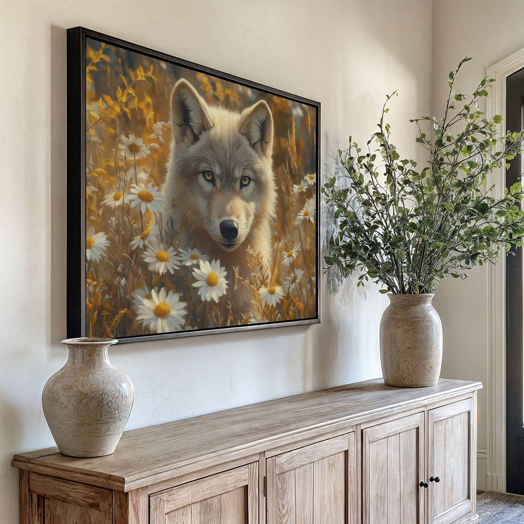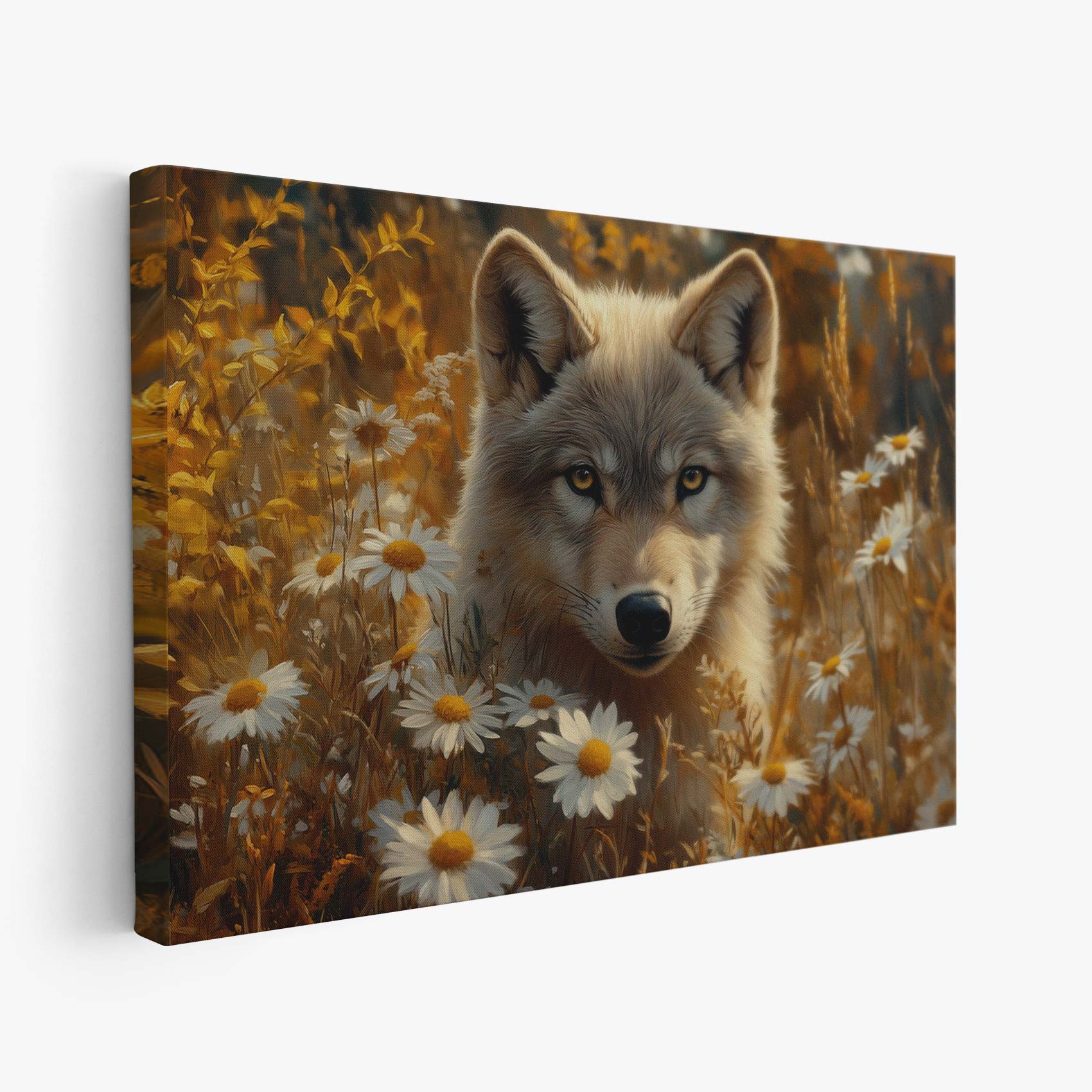 Wolf tussen gele bloemen