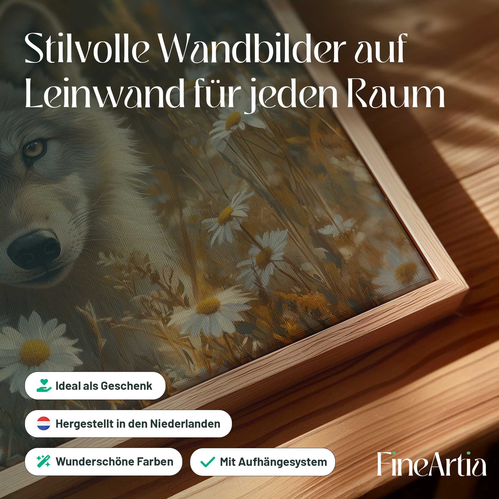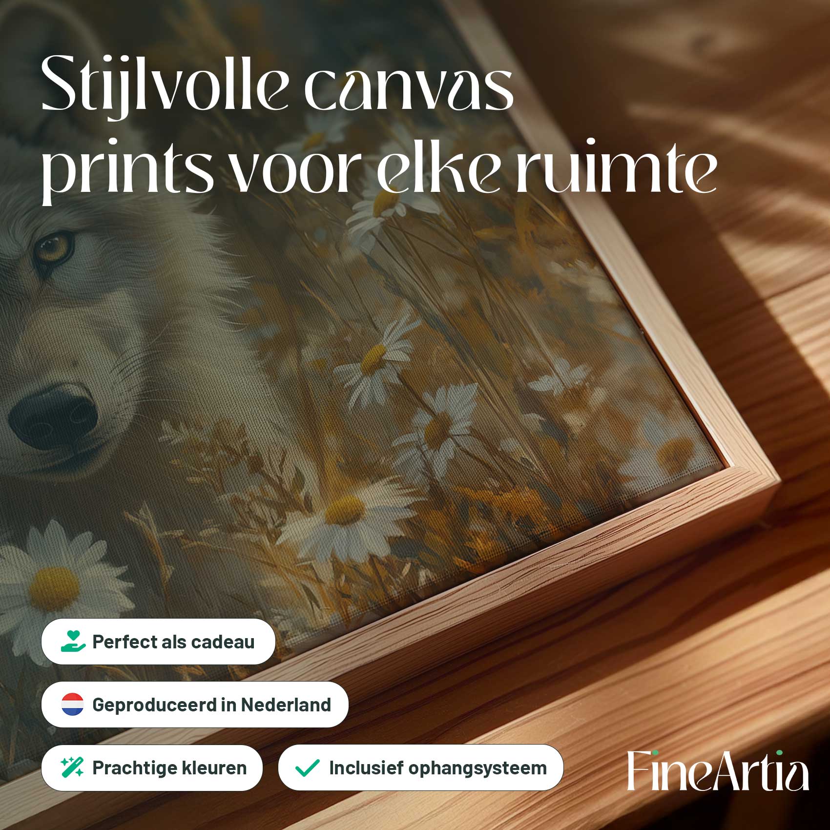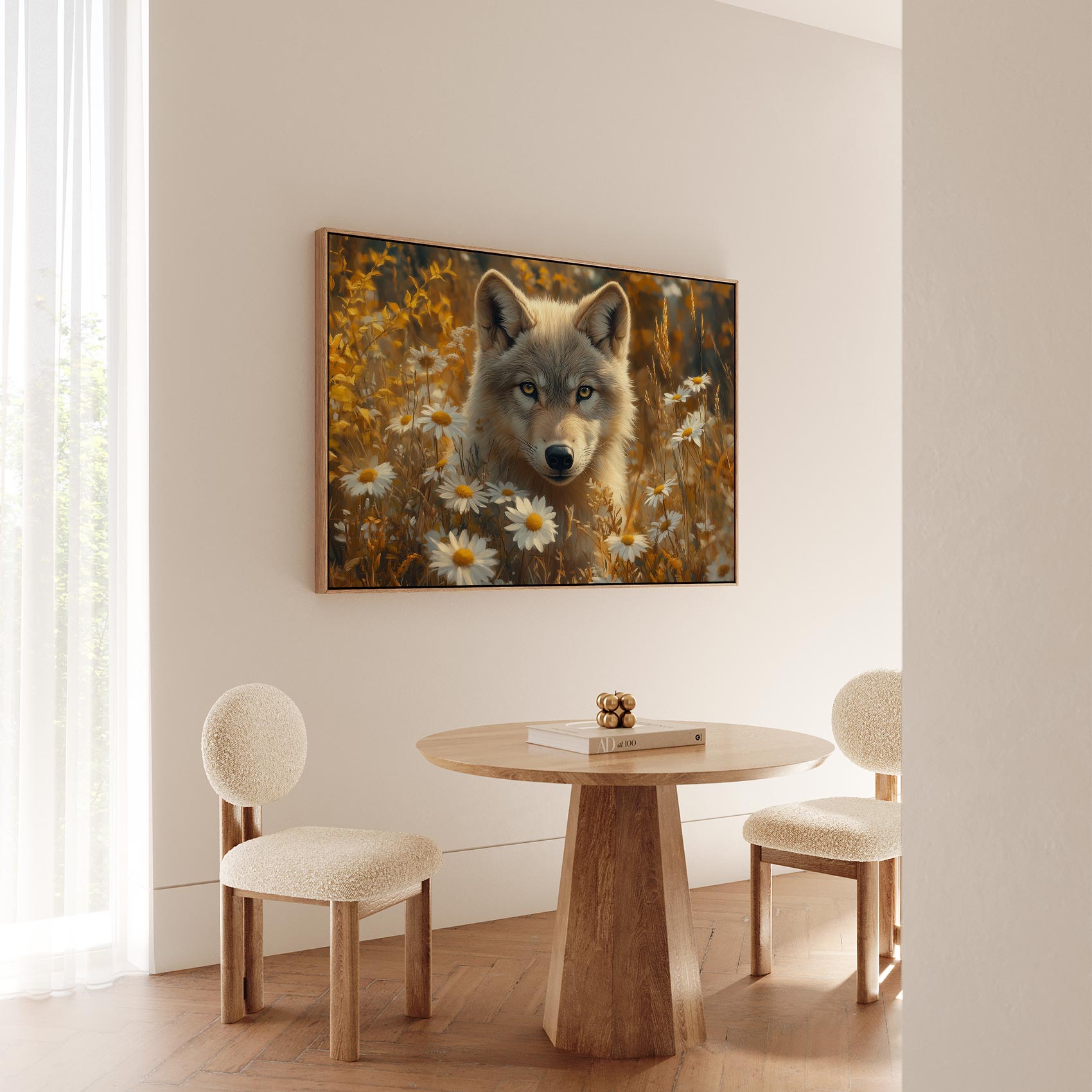 Wolf tussen gele bloemen