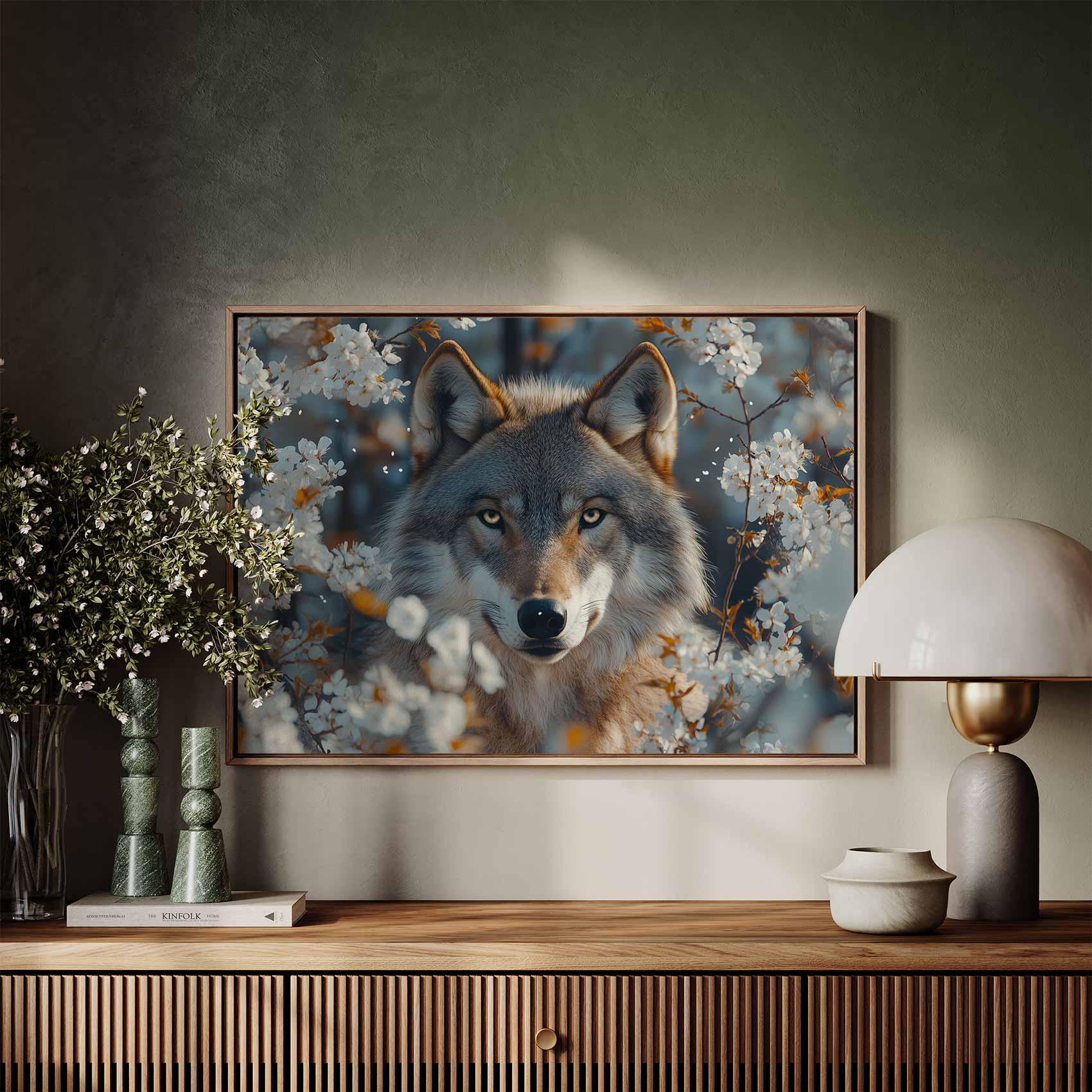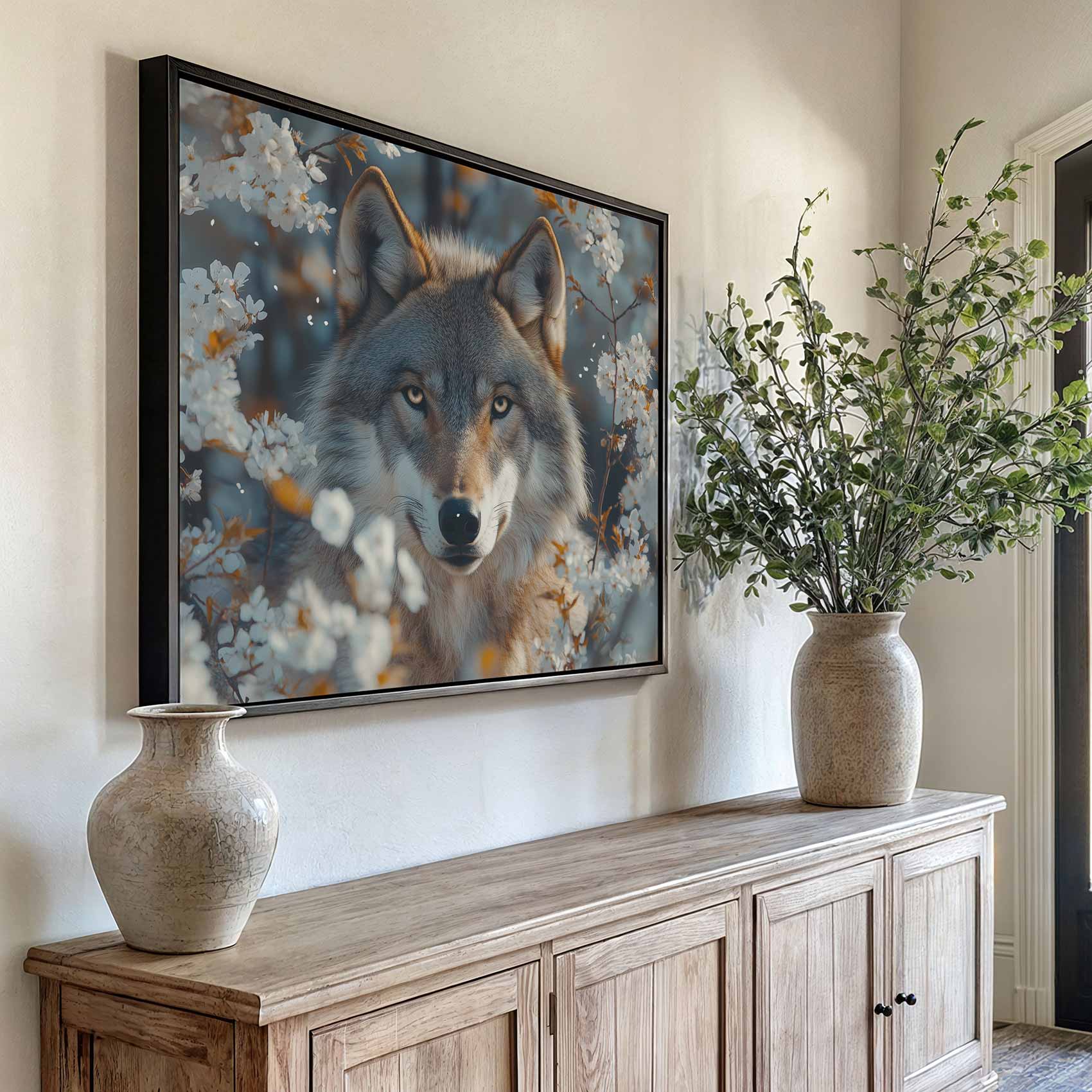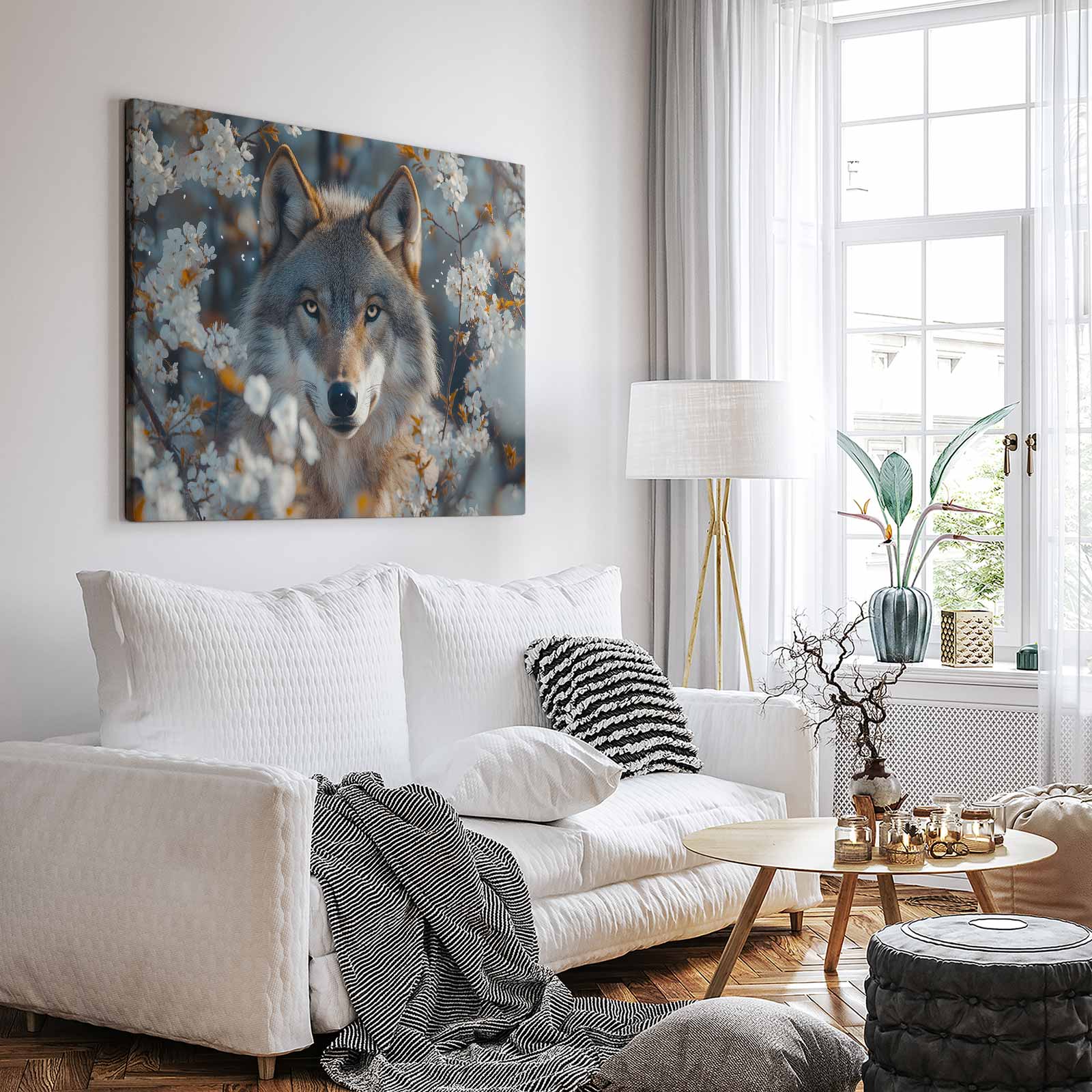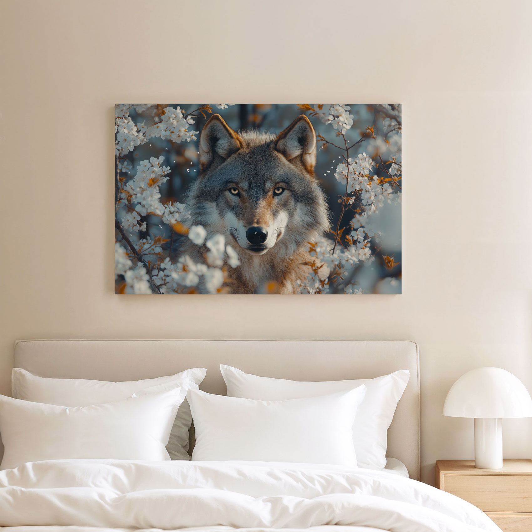 Wolf tussen witte bloesem