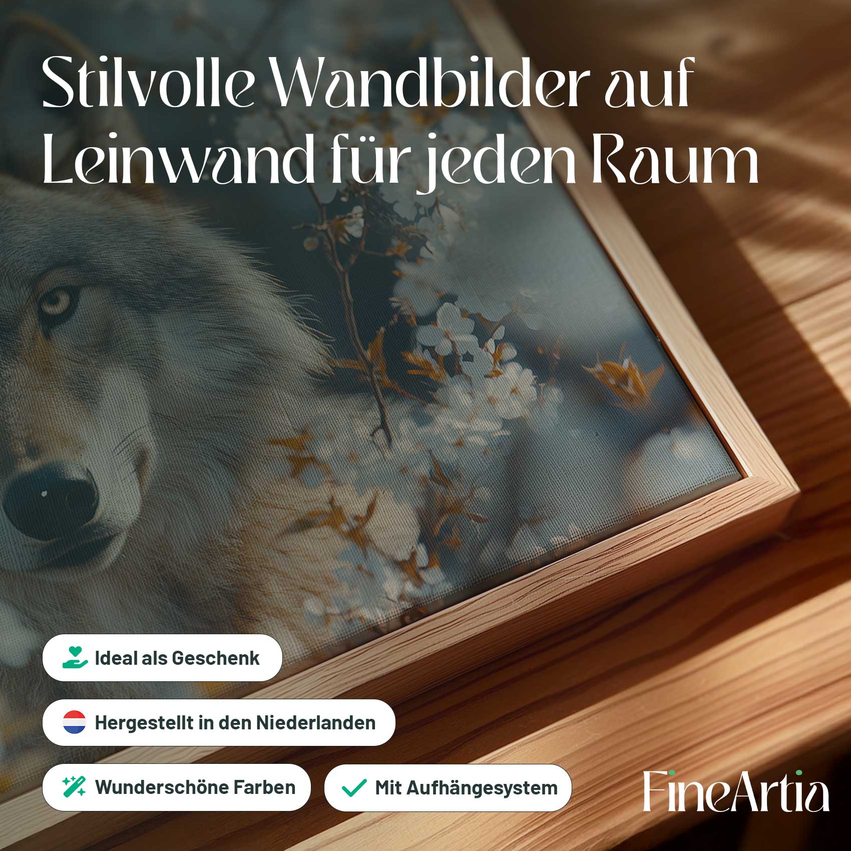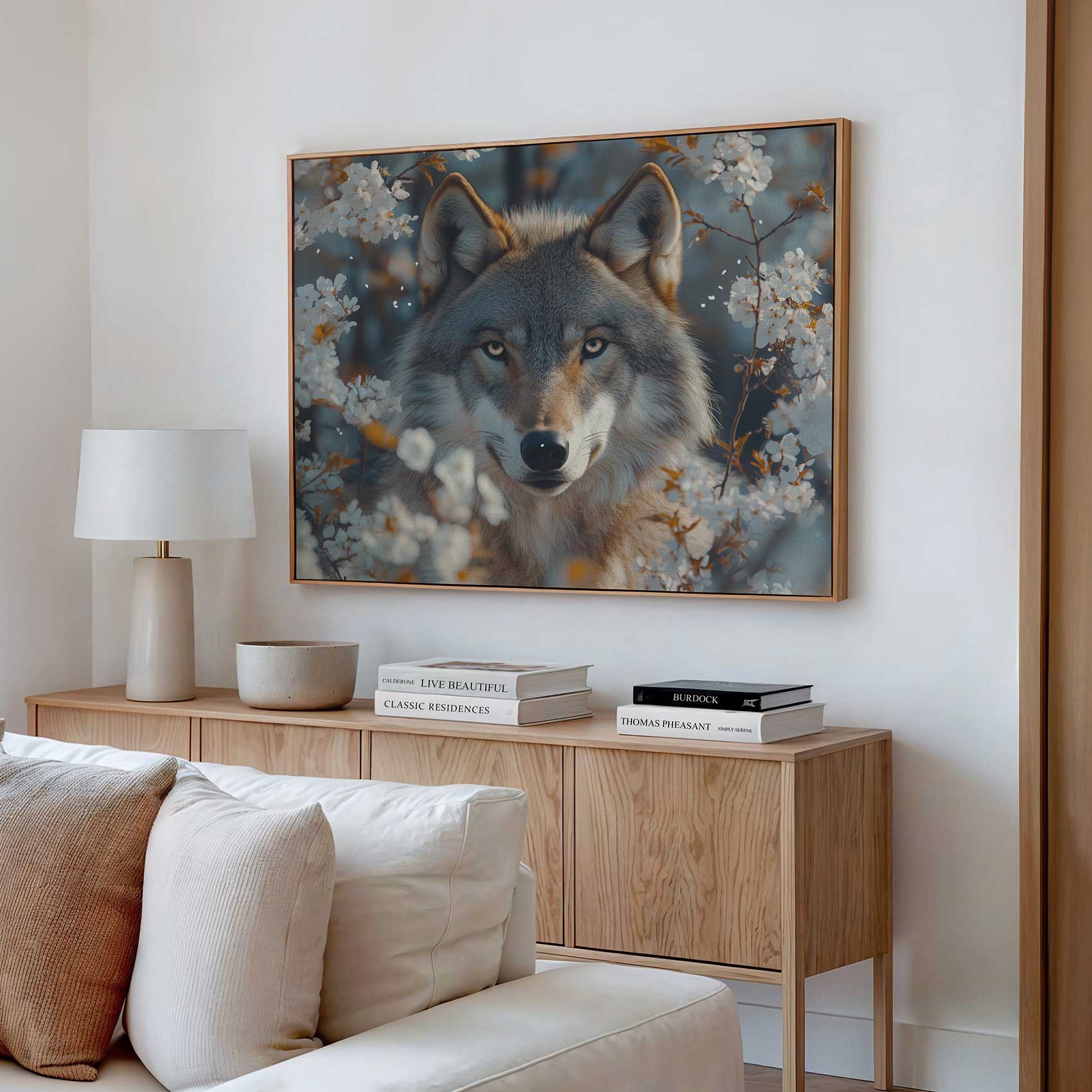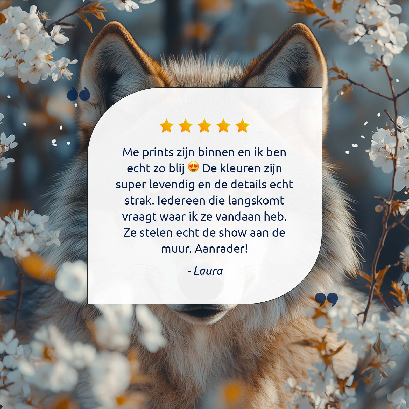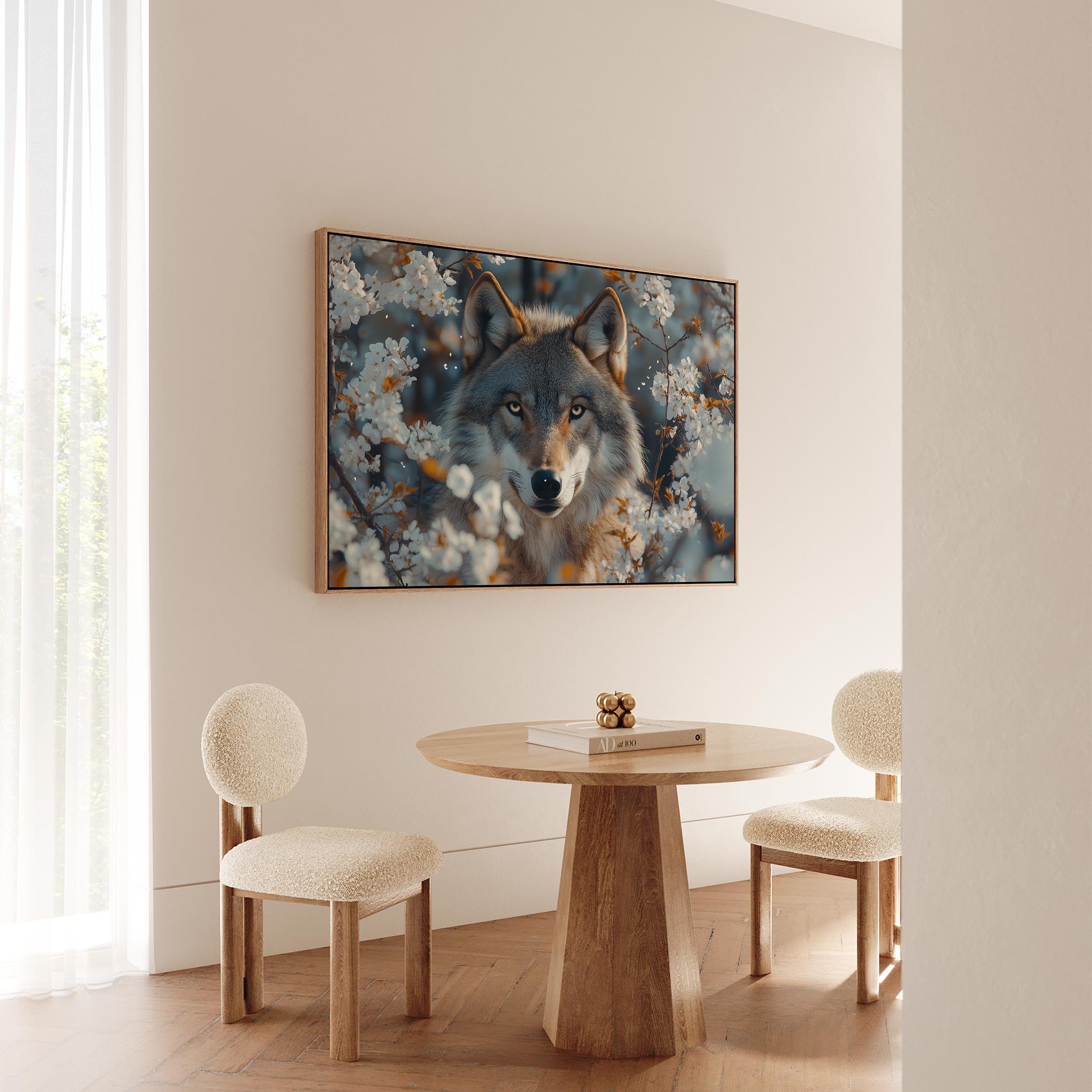 Wolf tussen witte bloesem