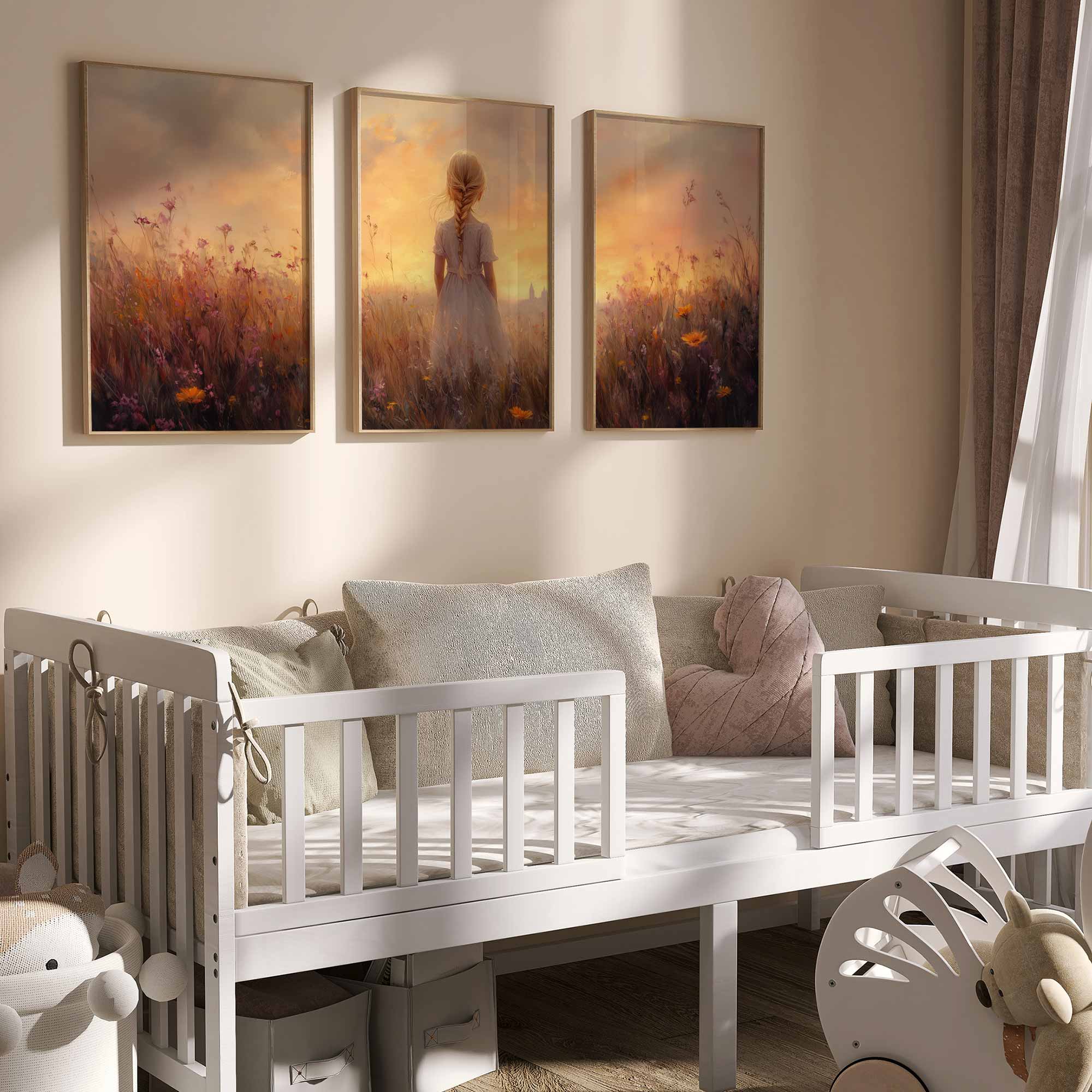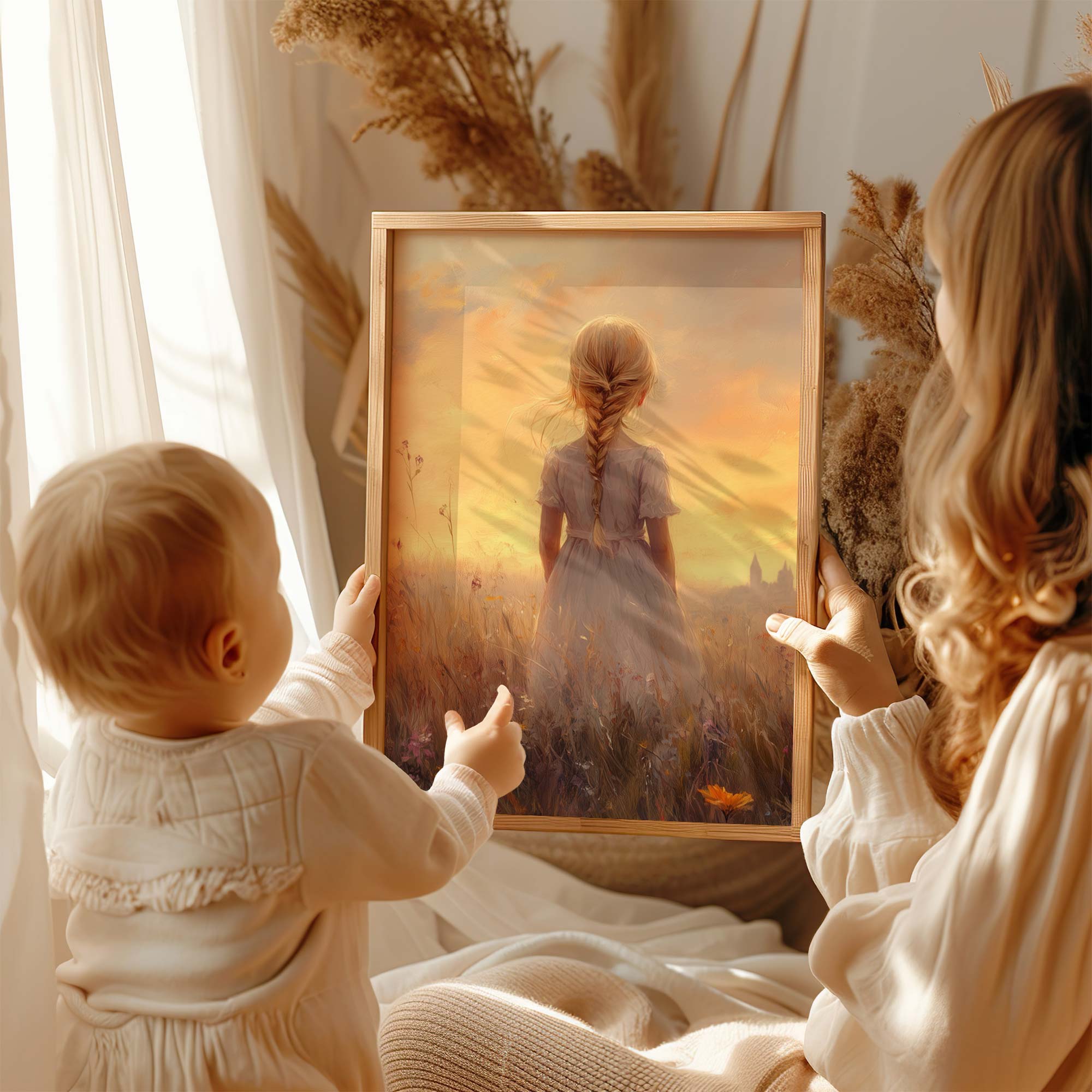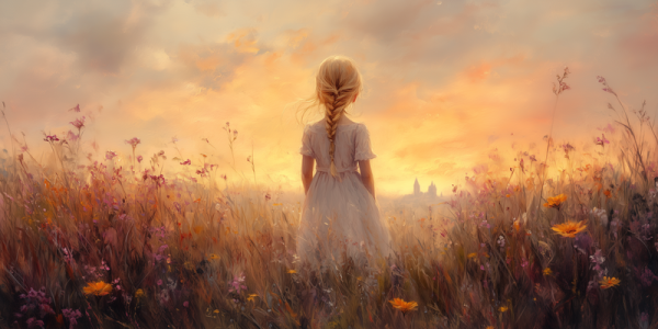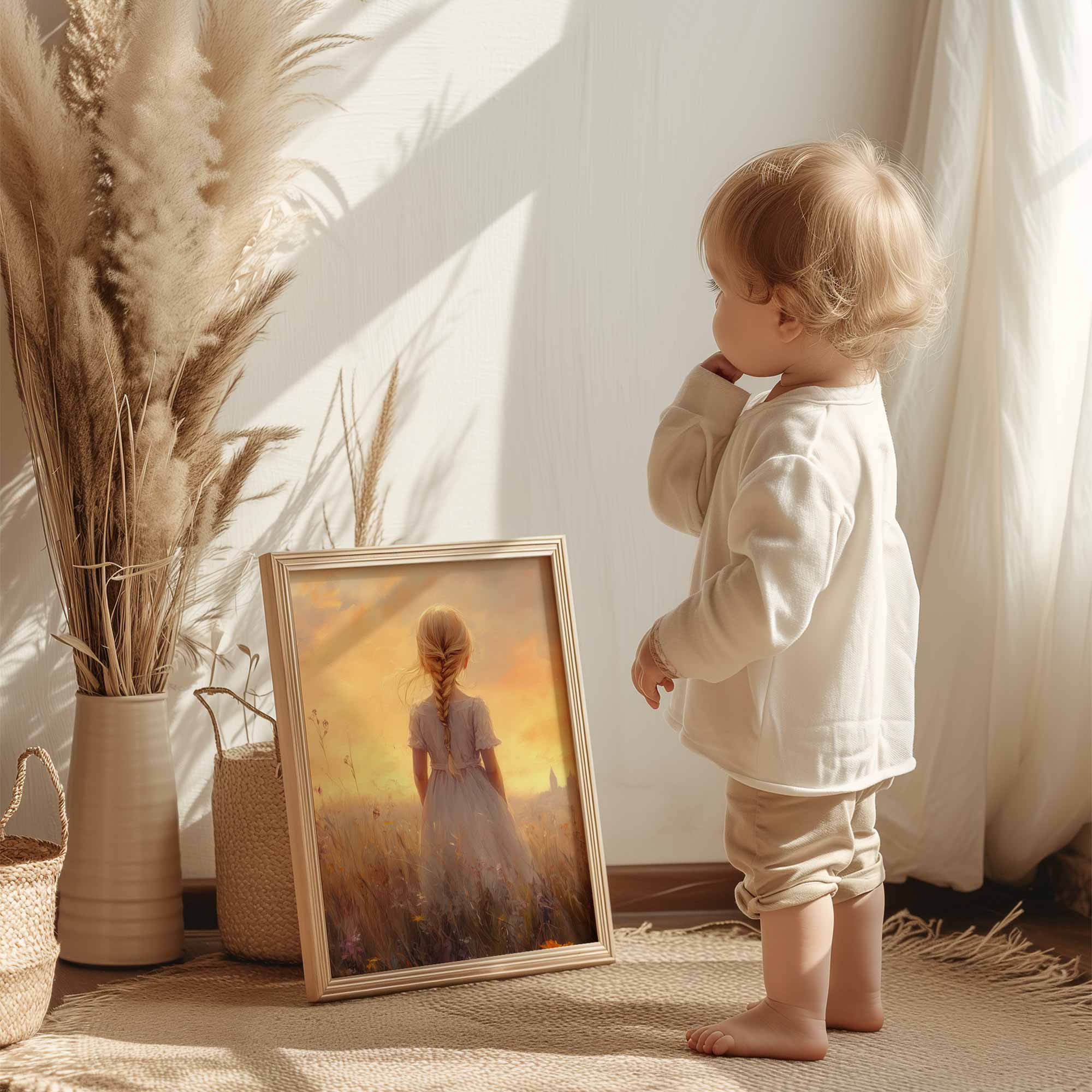 Terug naar collectie Posters Zacht bloemenveld met dromend meisje in wit