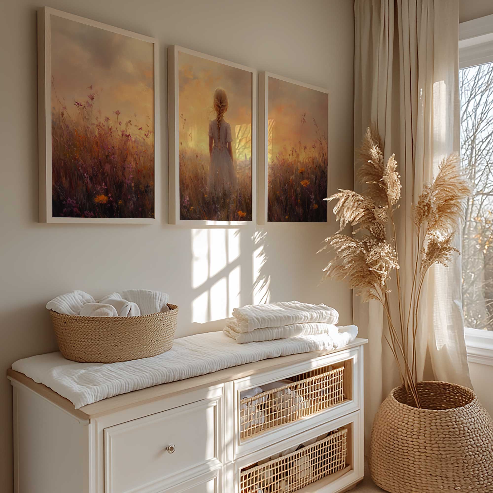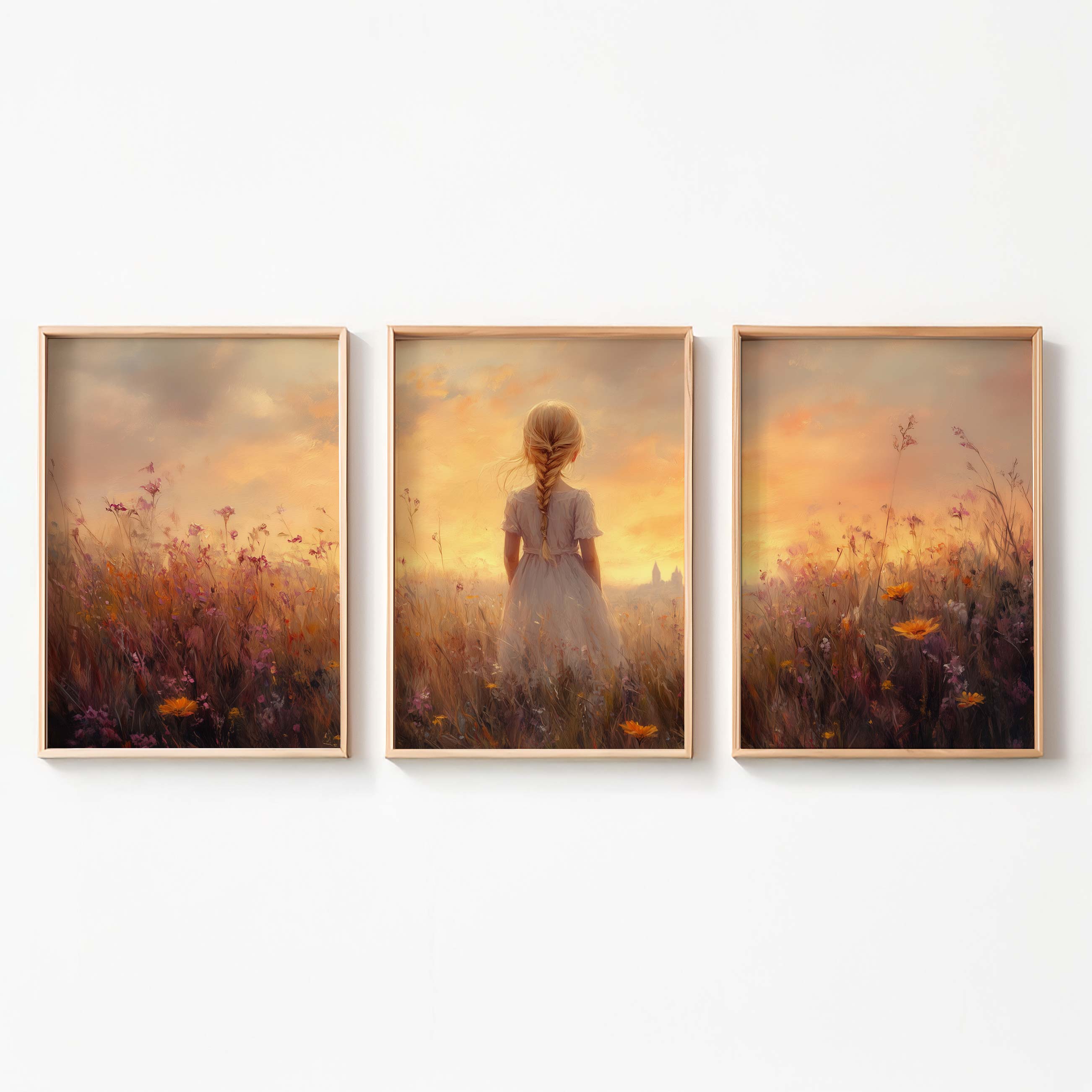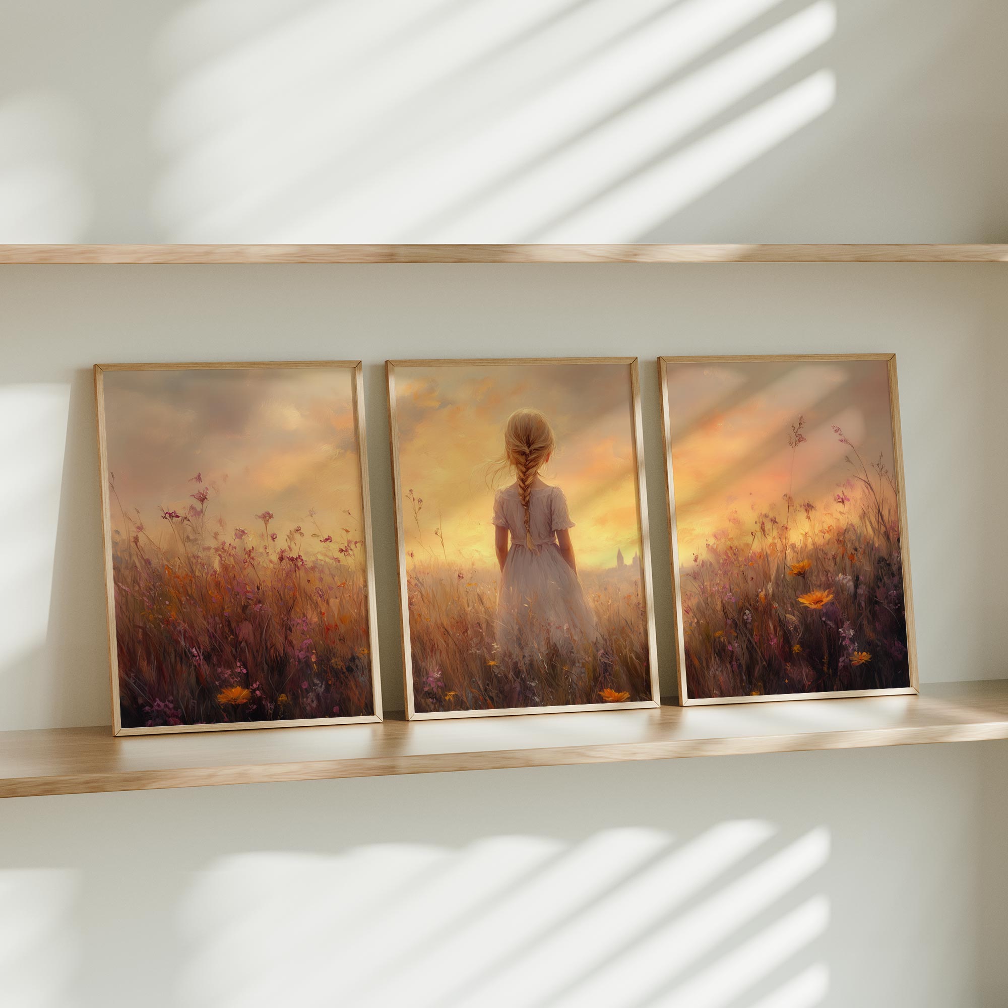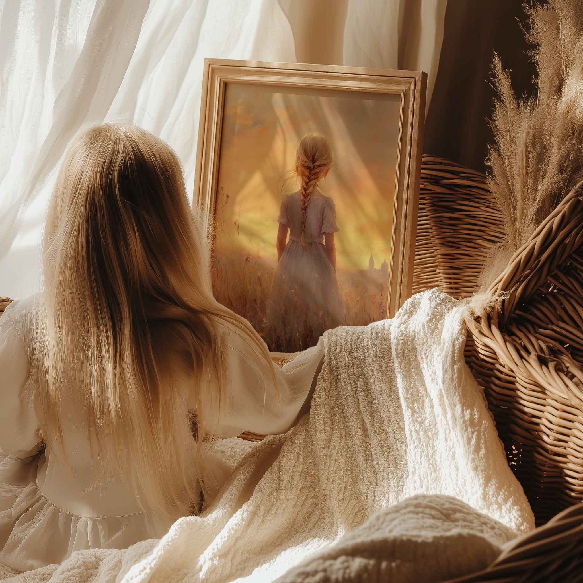 Terug naar collectie Posters Zacht bloemenveld met dromend meisje in wit