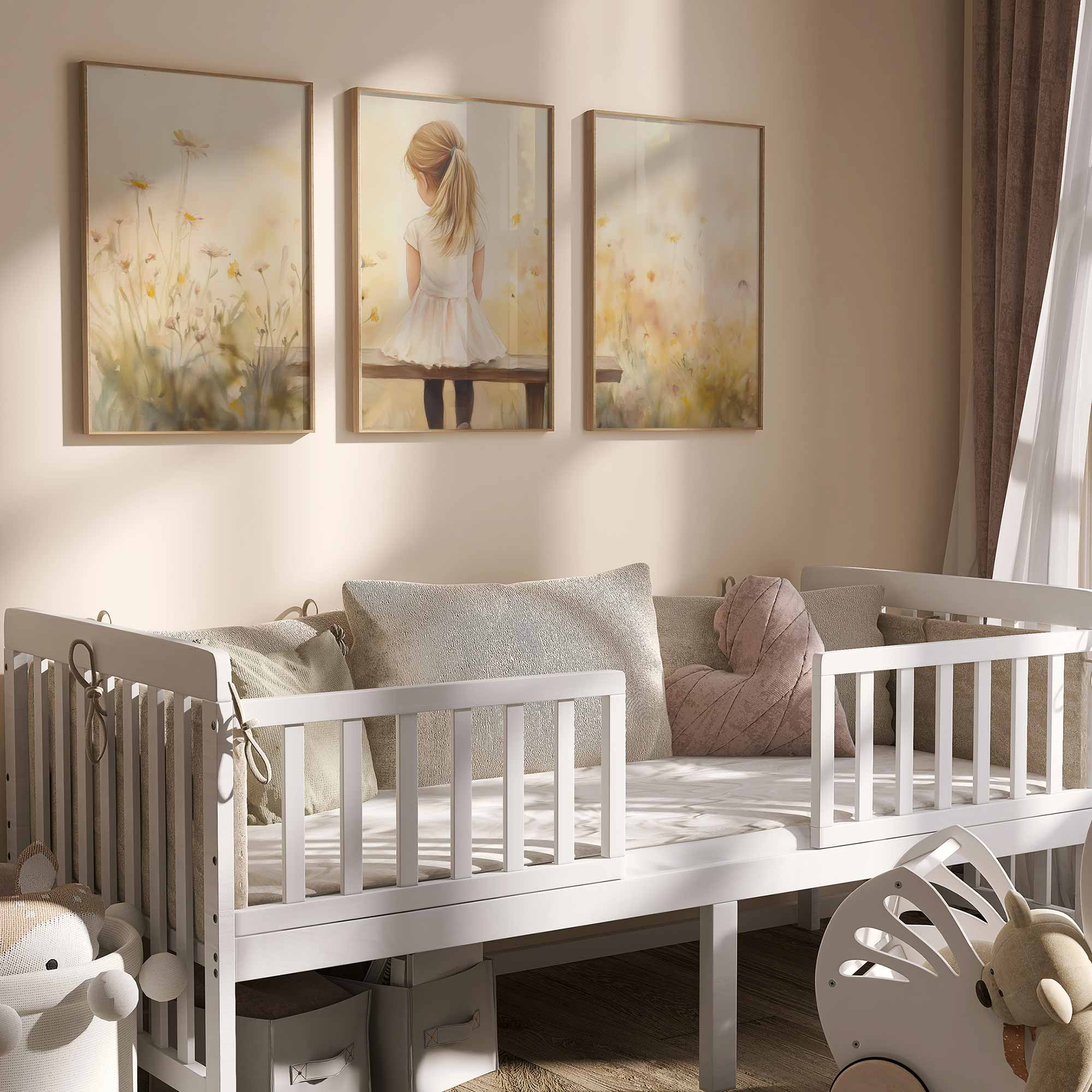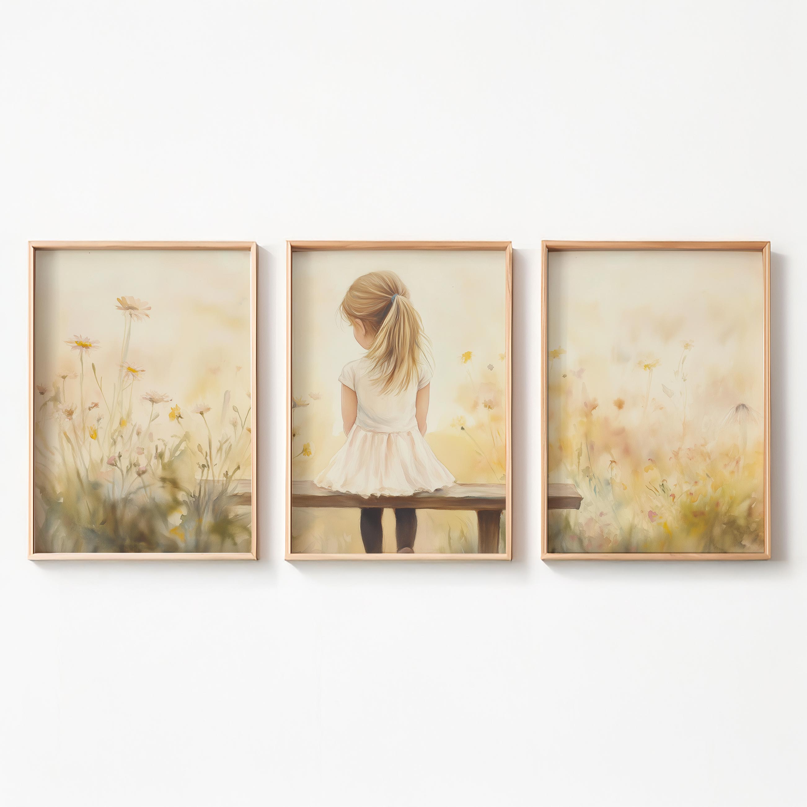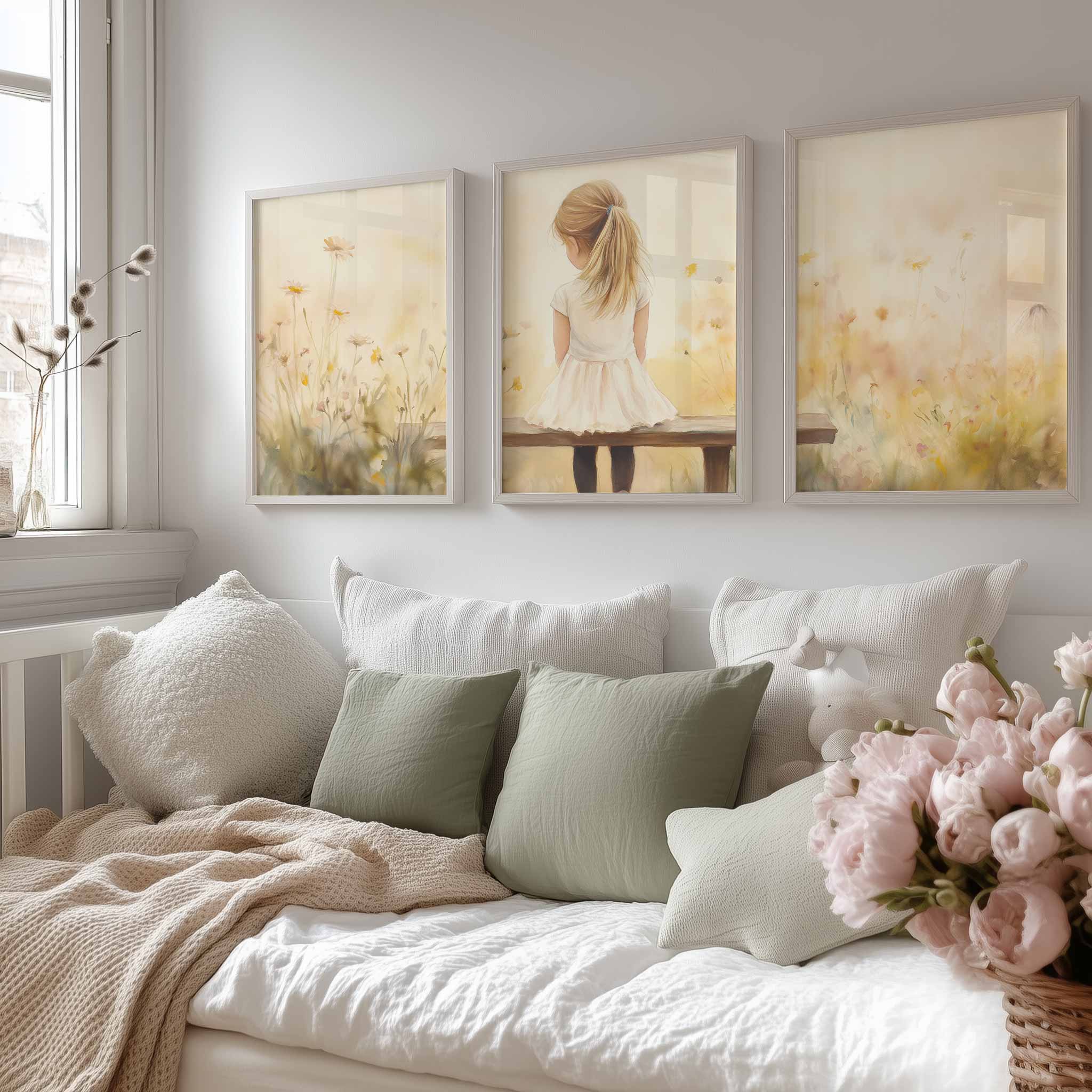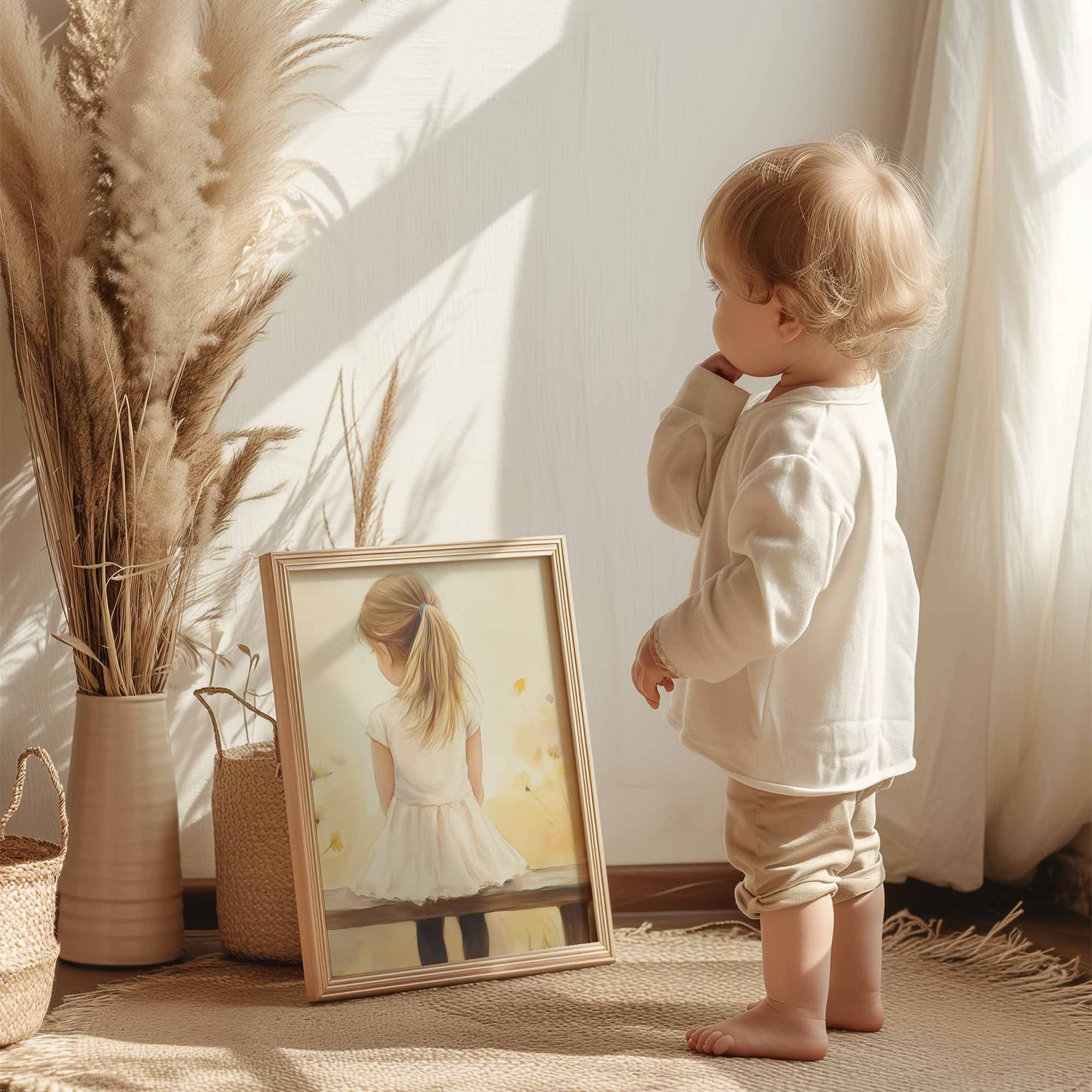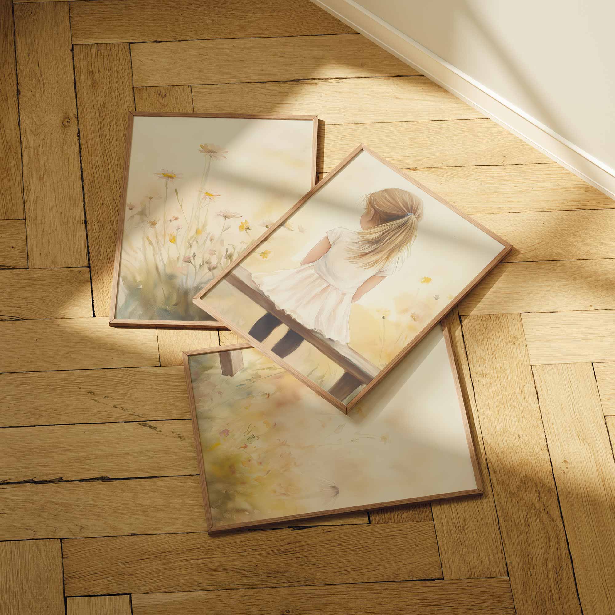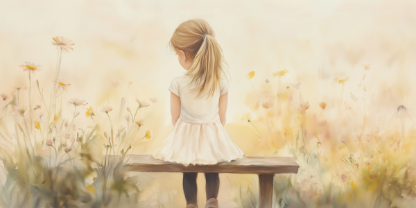 Zacht bloemenveld met meisje in witte jurk