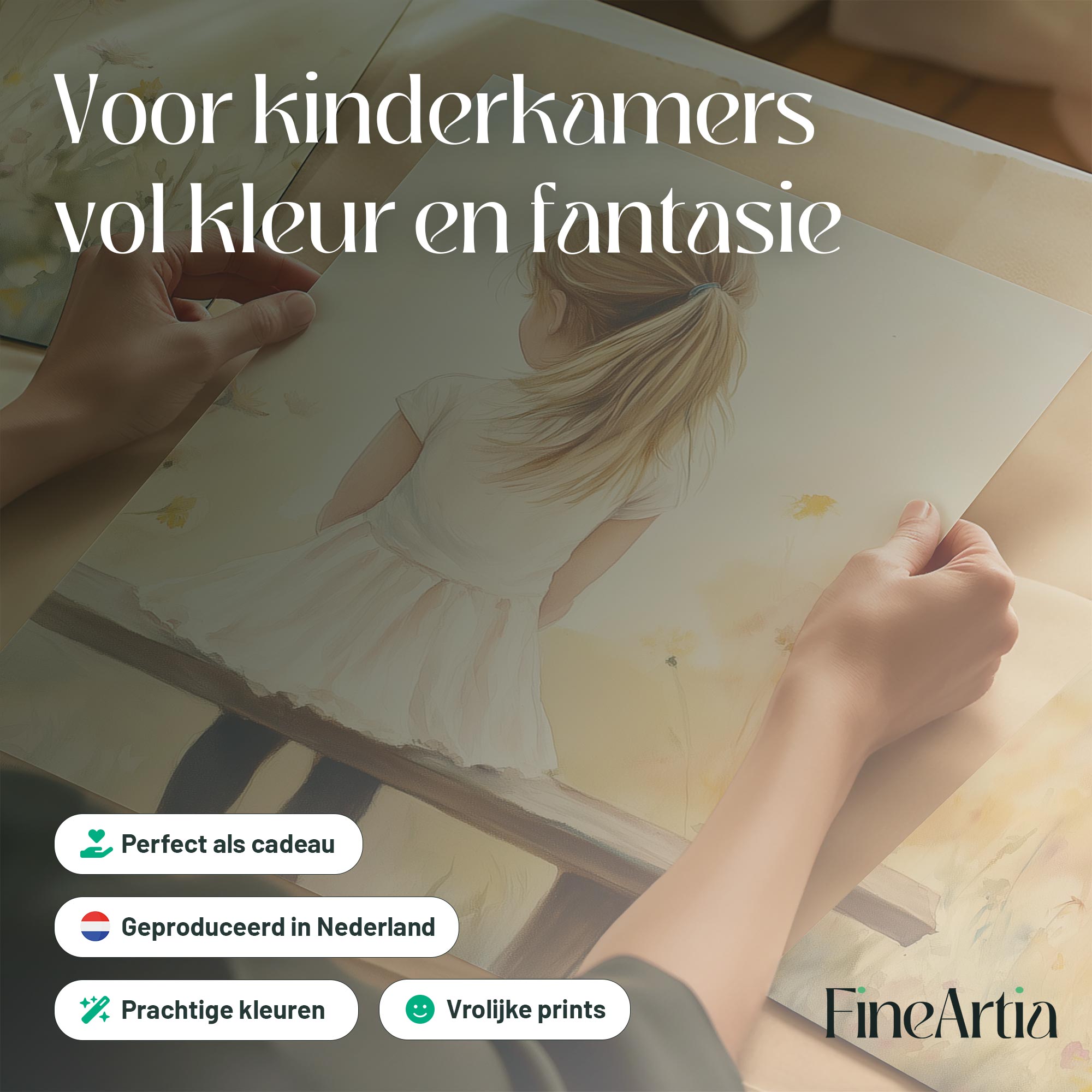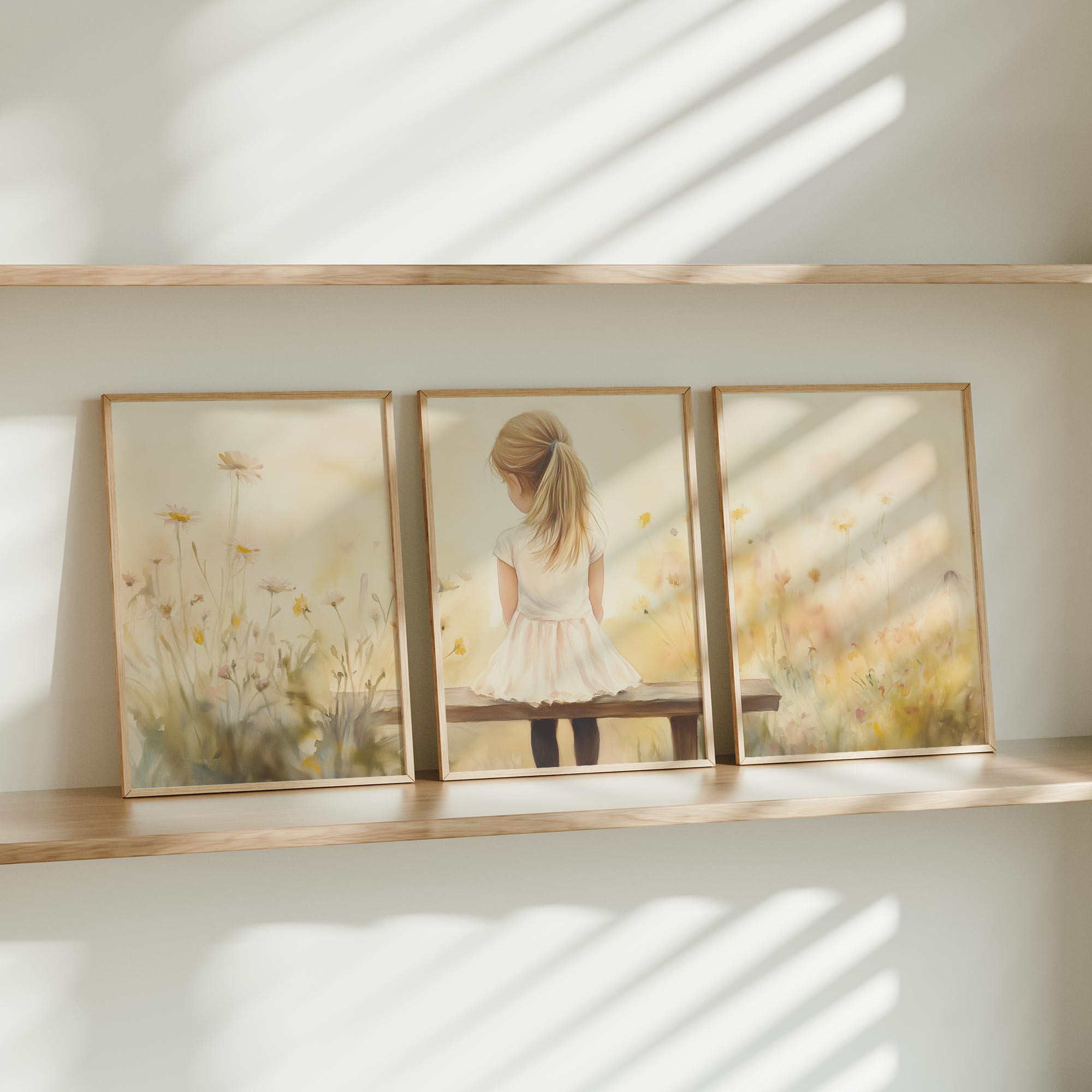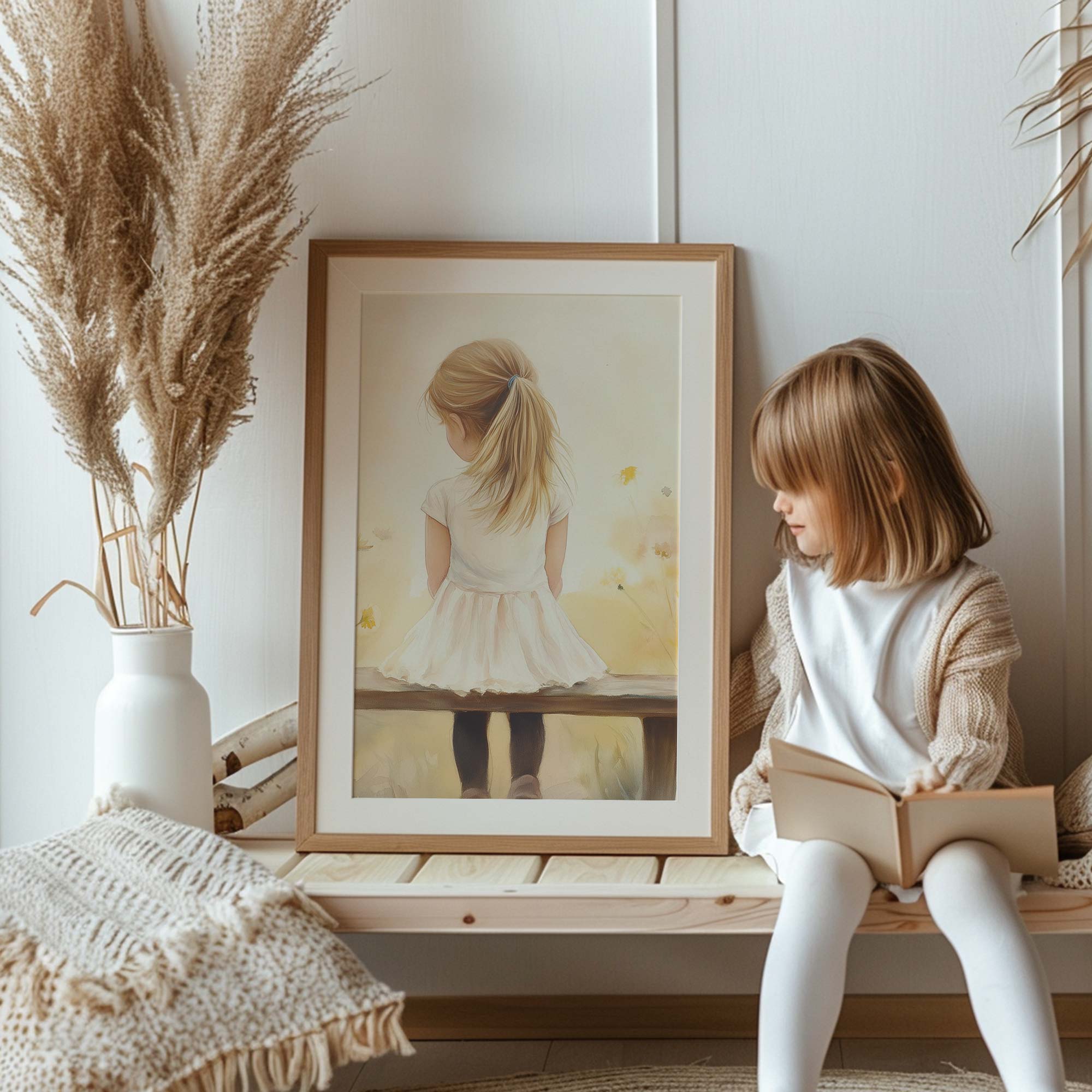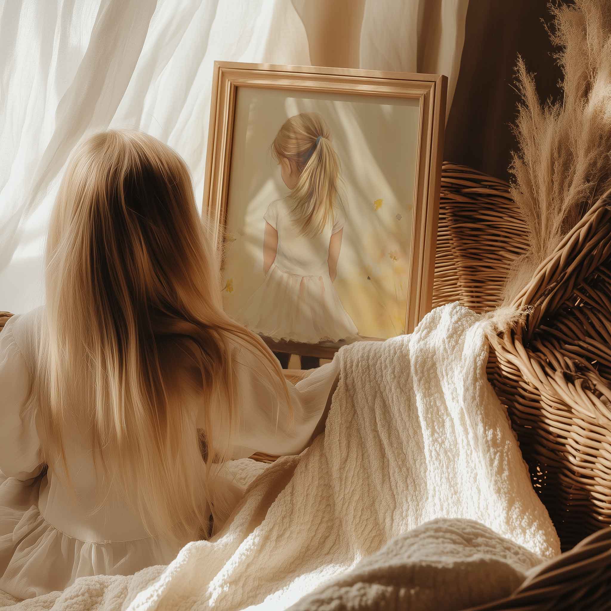 Zacht bloemenveld met meisje in witte jurk
