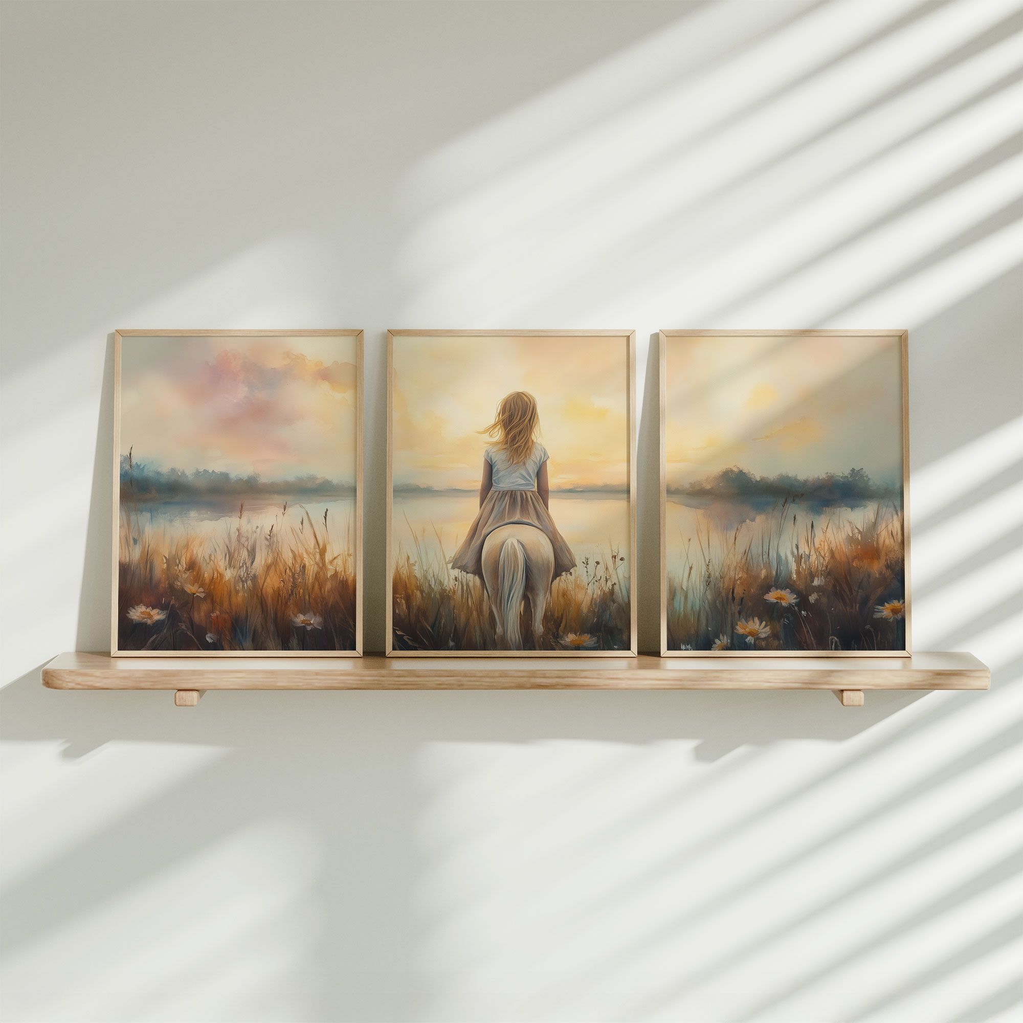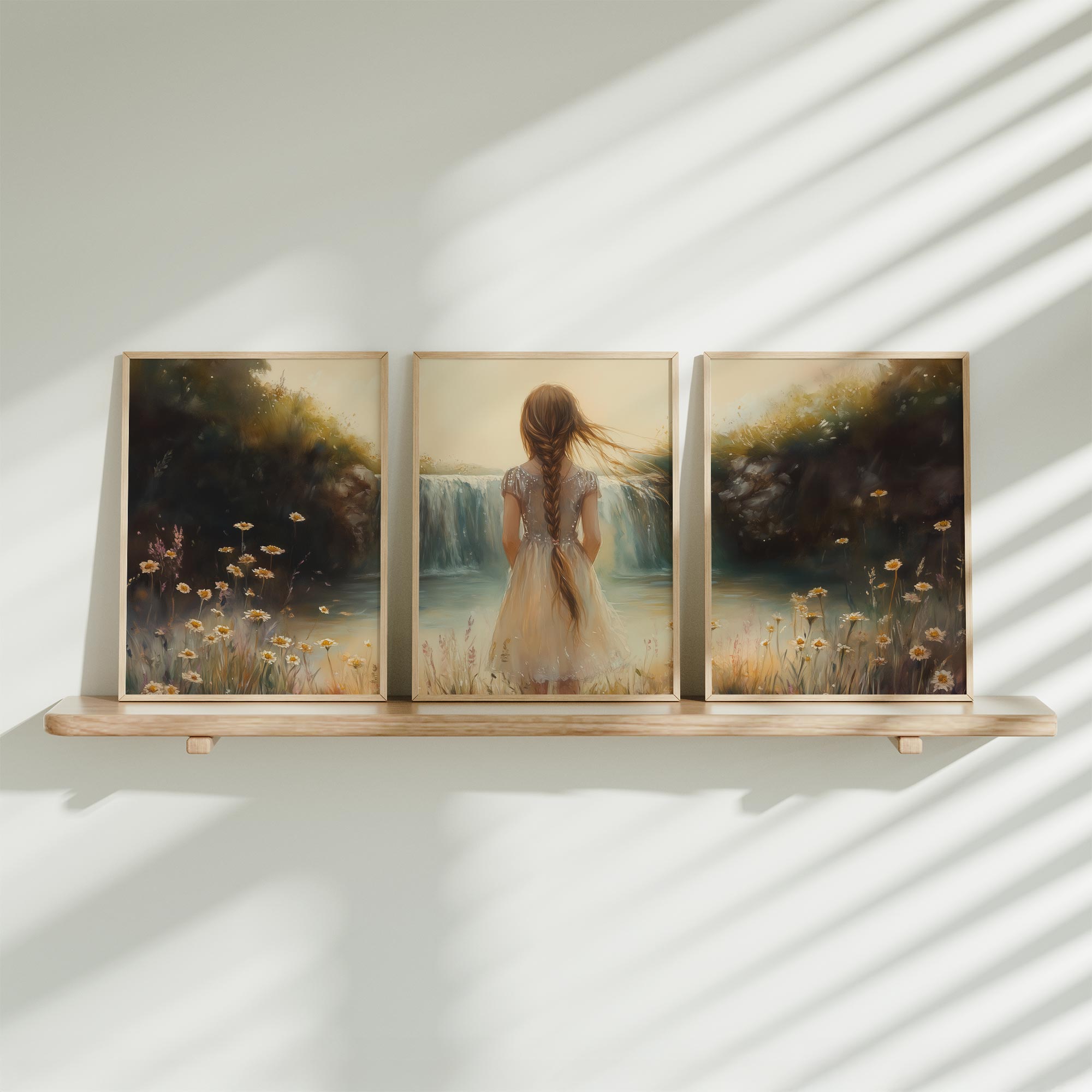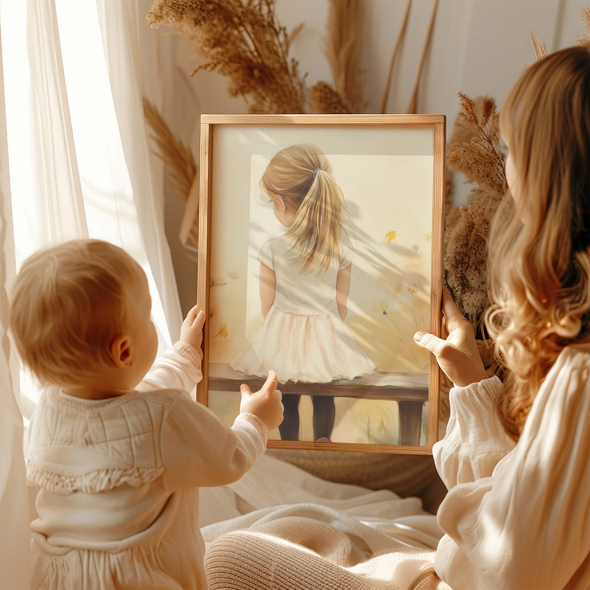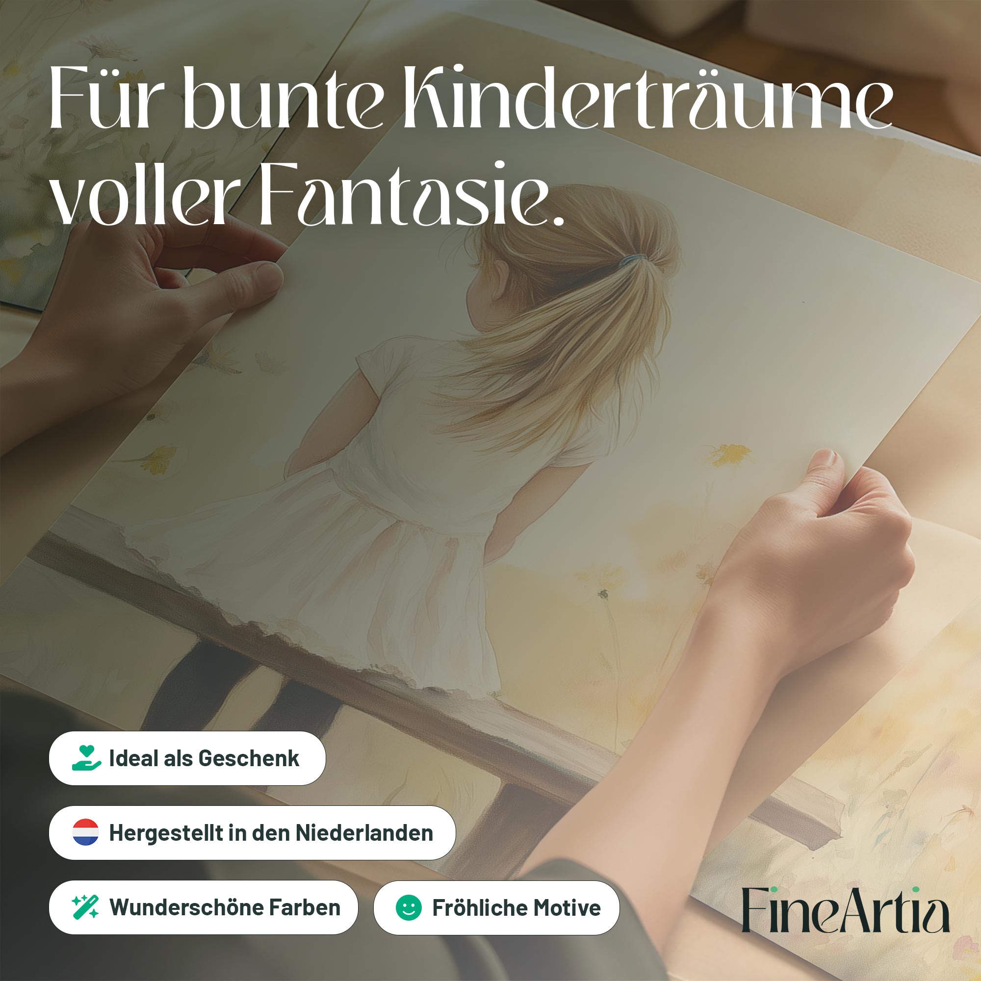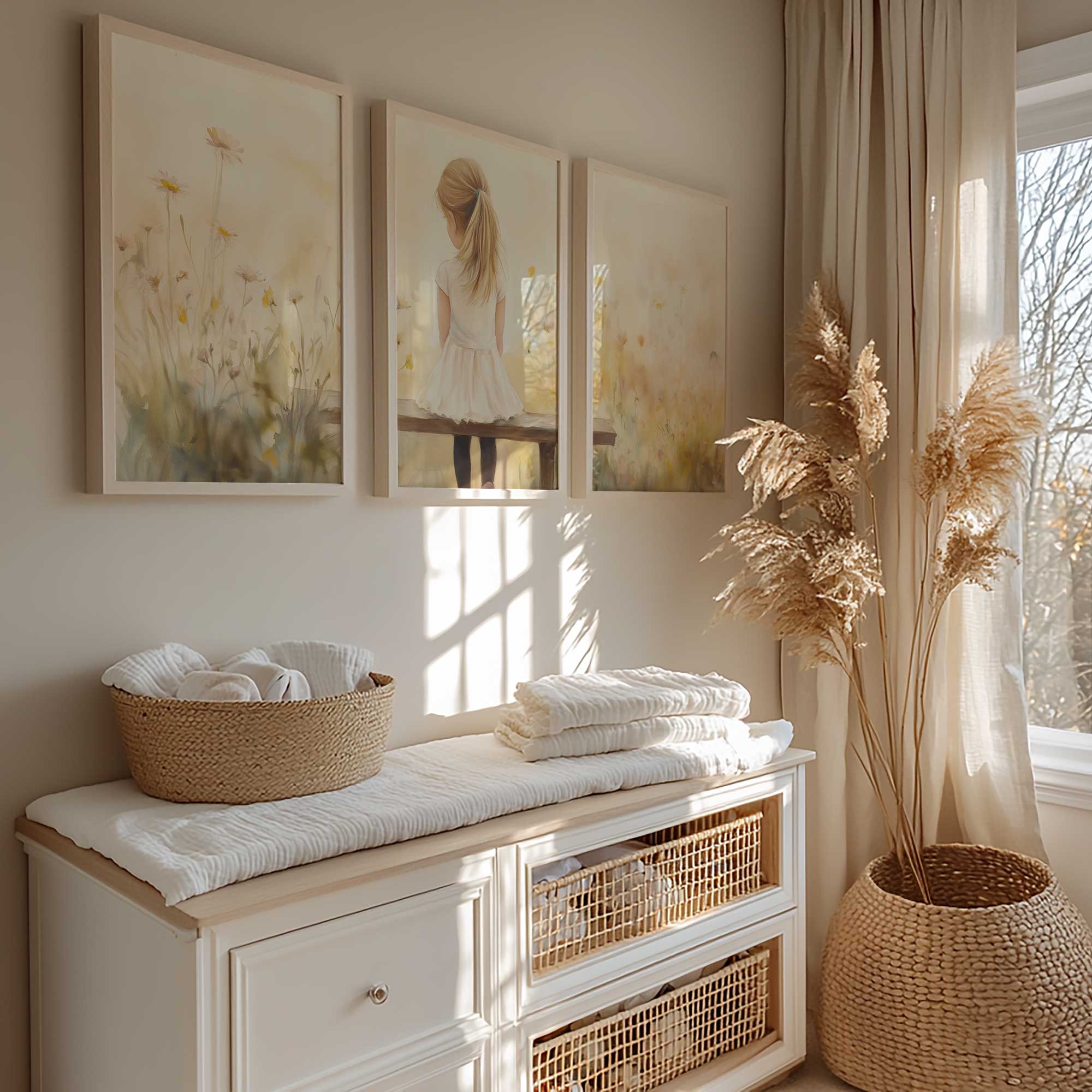 Zacht bloemenveld met meisje in witte jurk