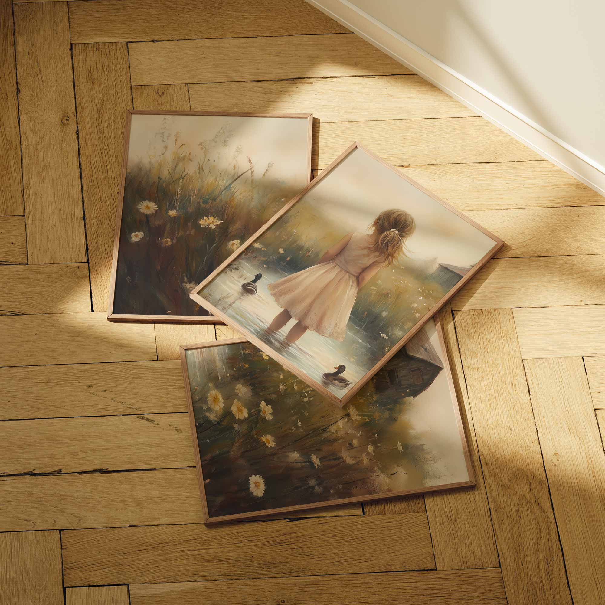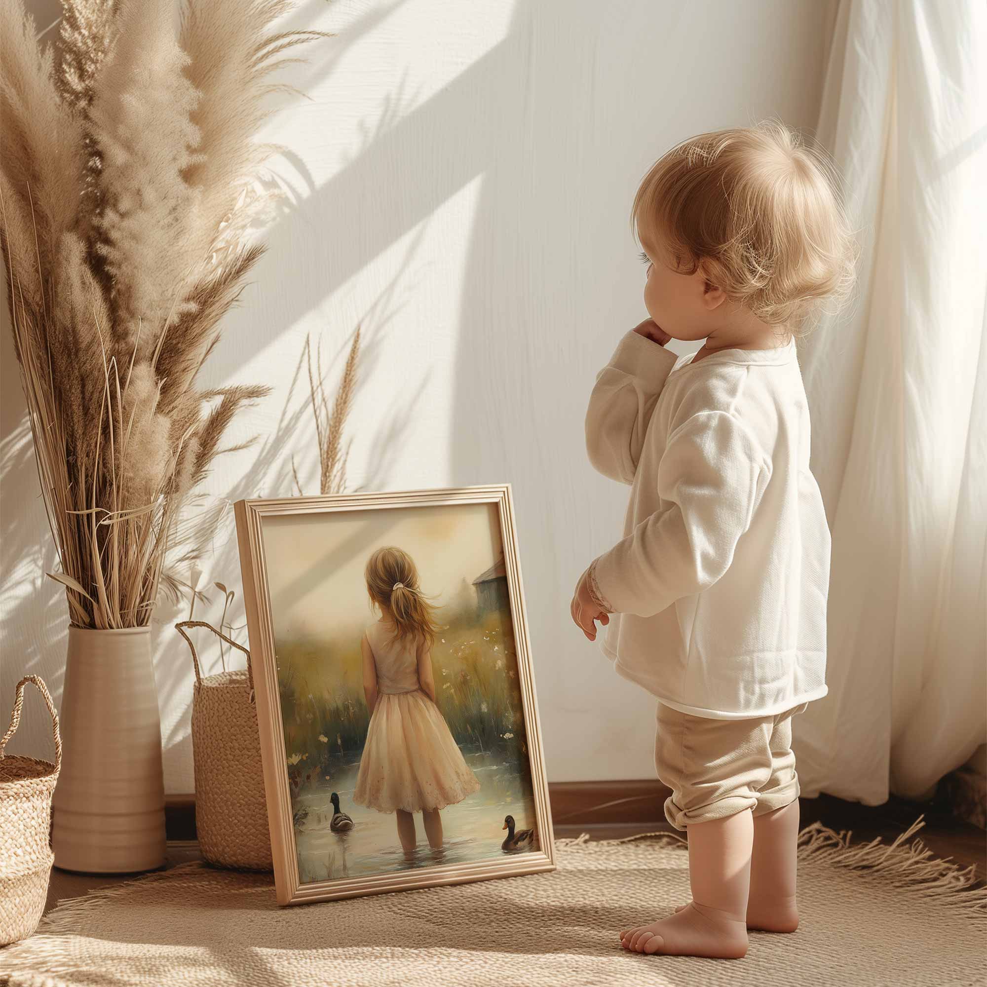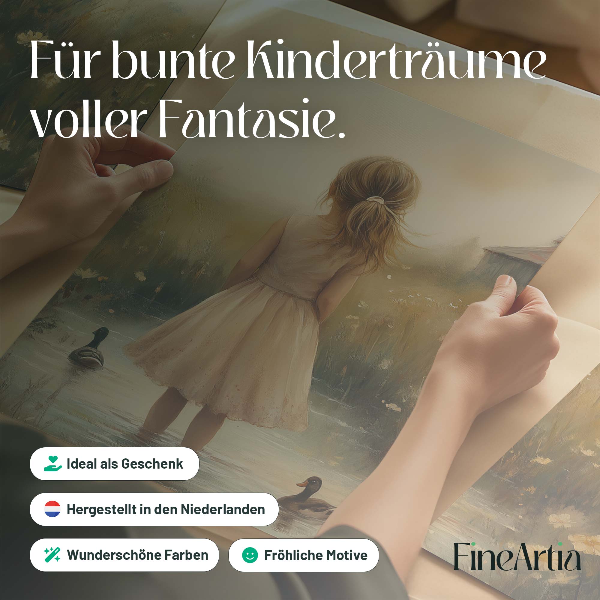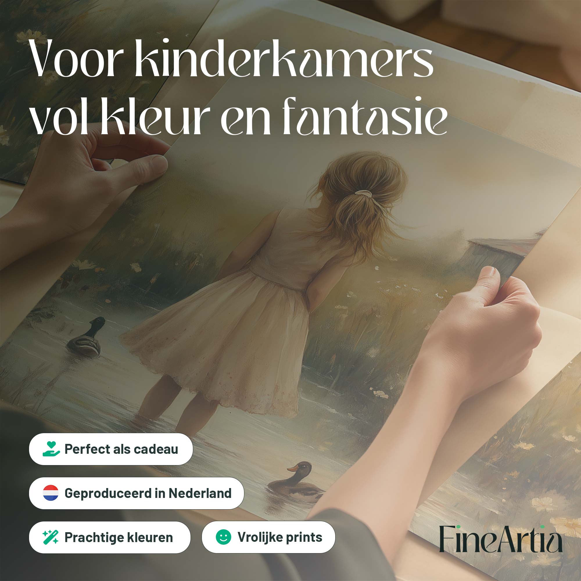 Terug naar collectie Posters Zacht Dromen: Meisje bij Vrolijke Eenden en Bloemen