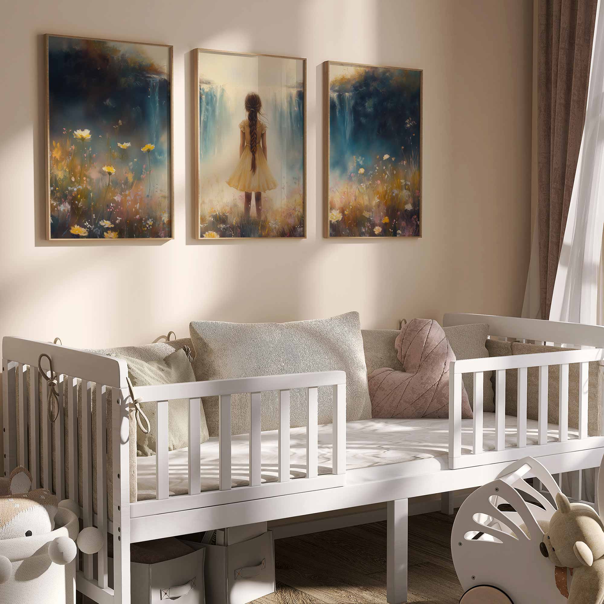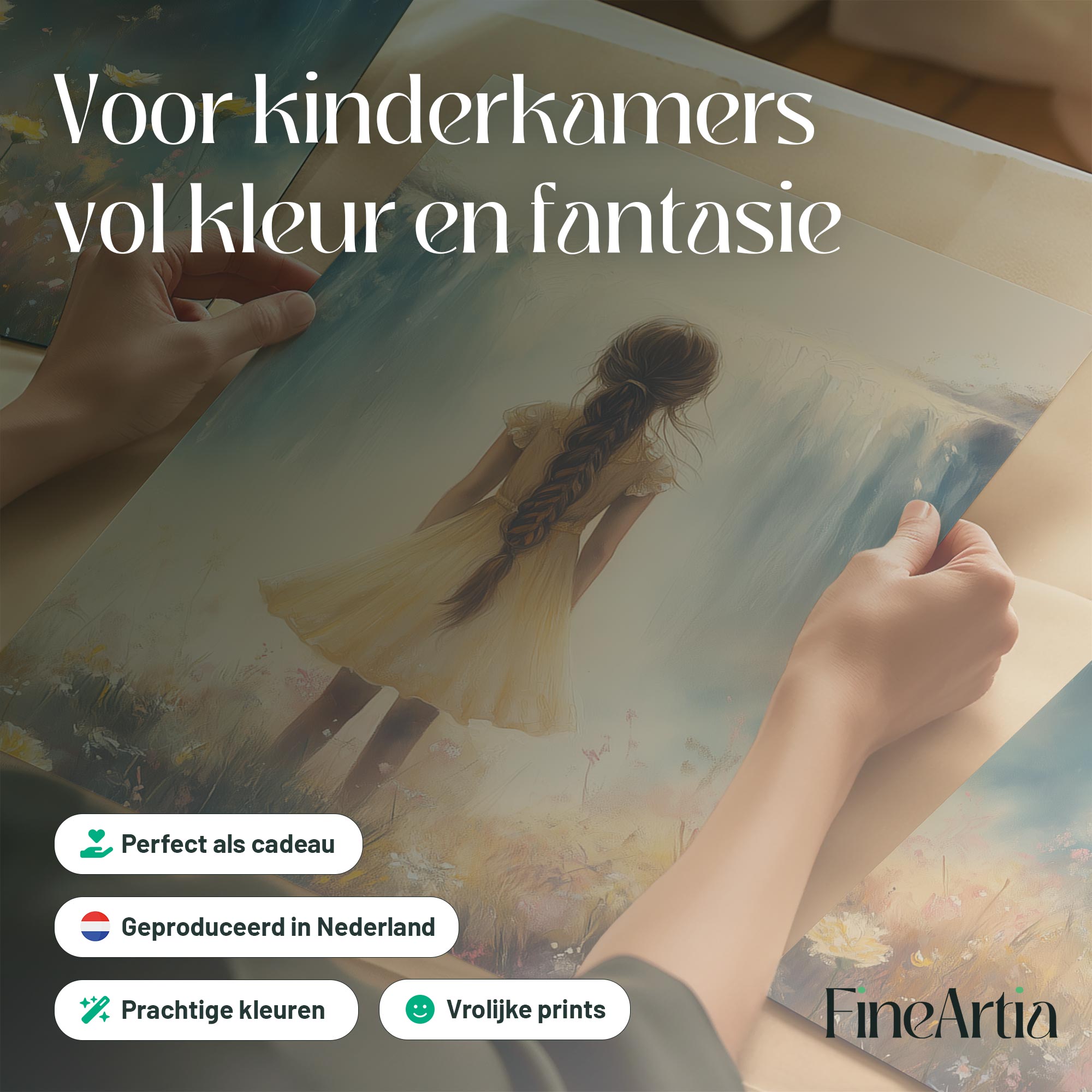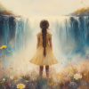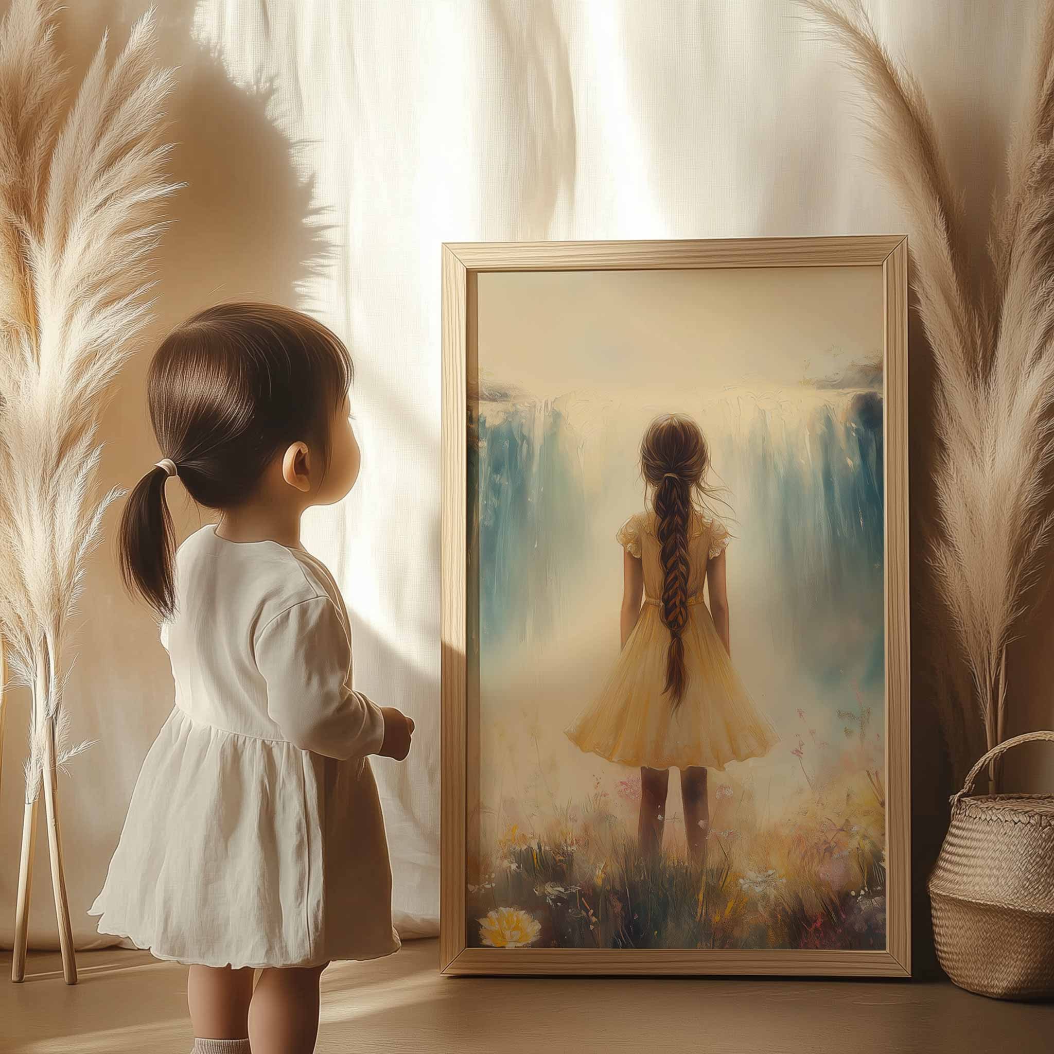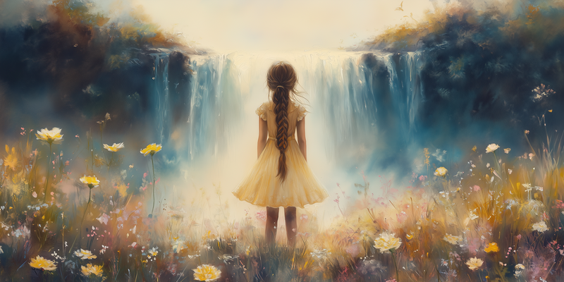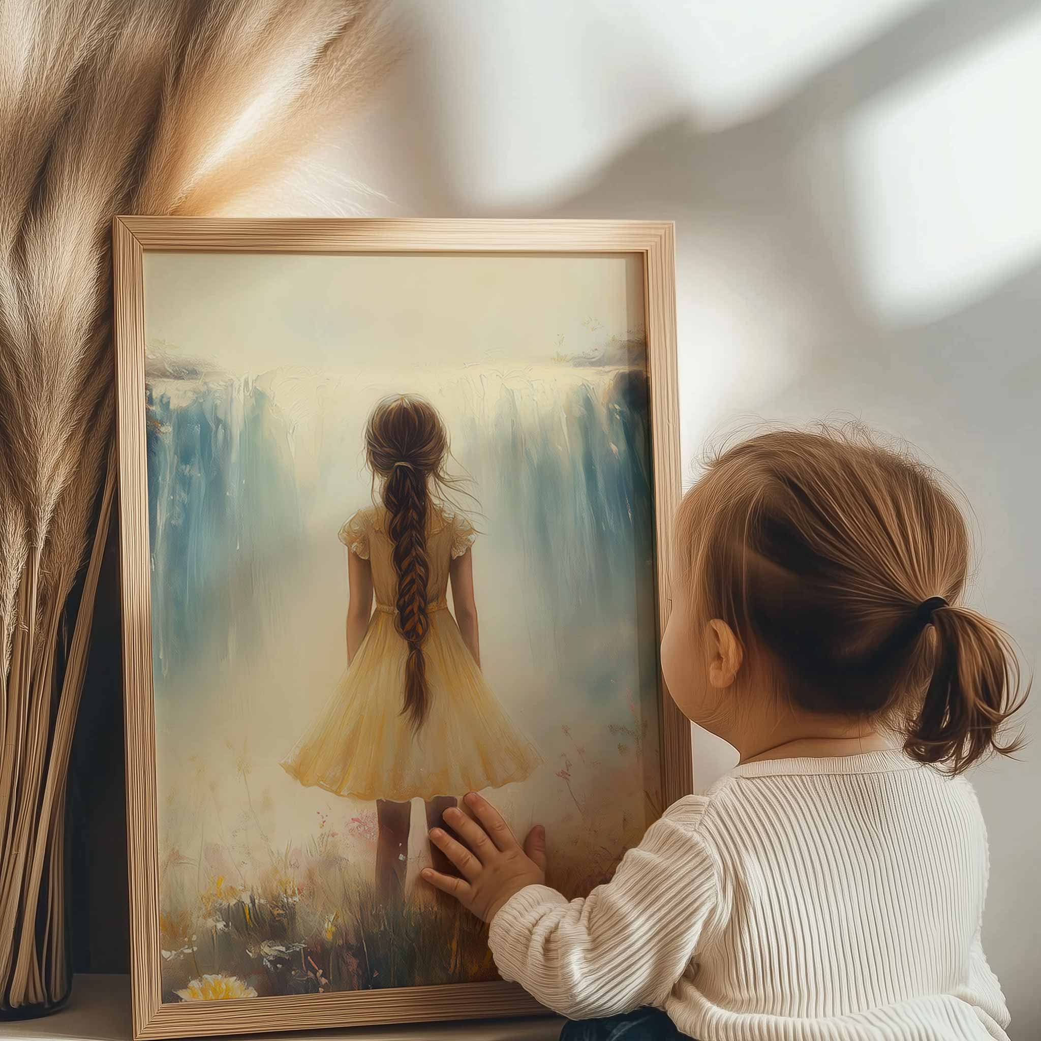 Terug naar collectie Posters Zacht Dromerig Meisje bij Waterval en Bloemenveld