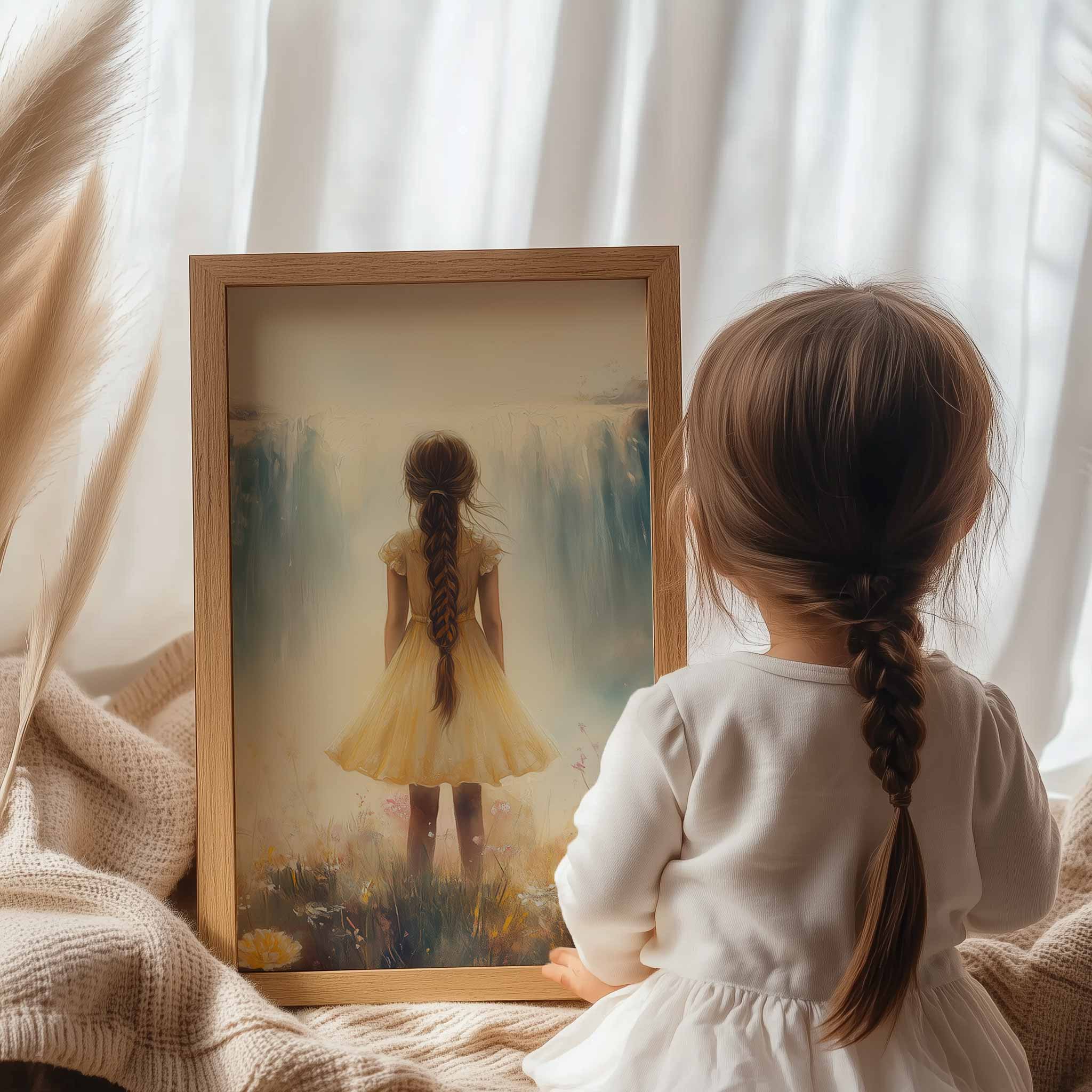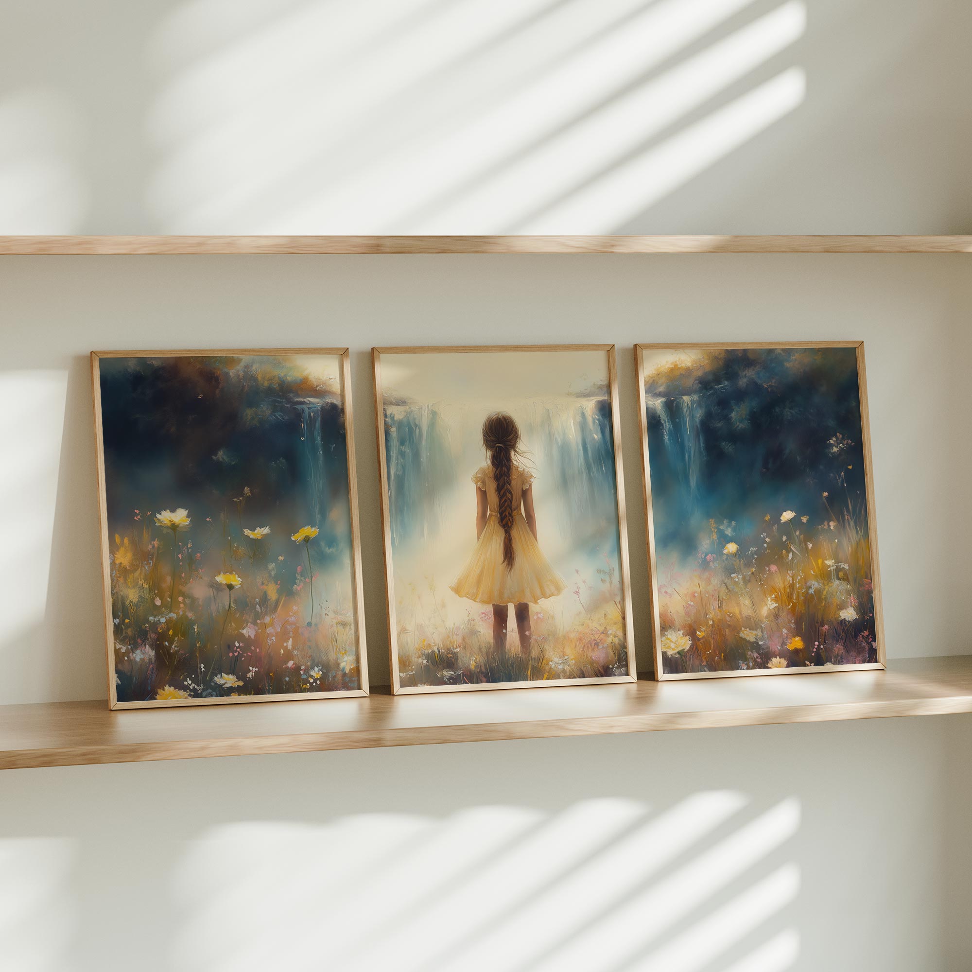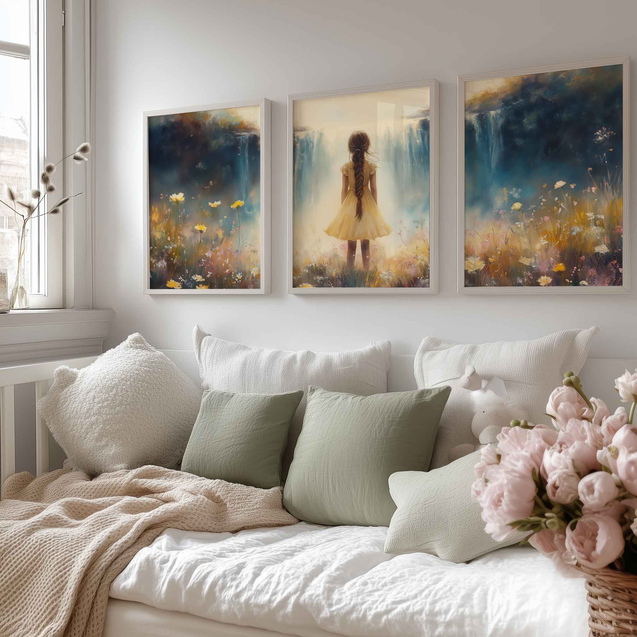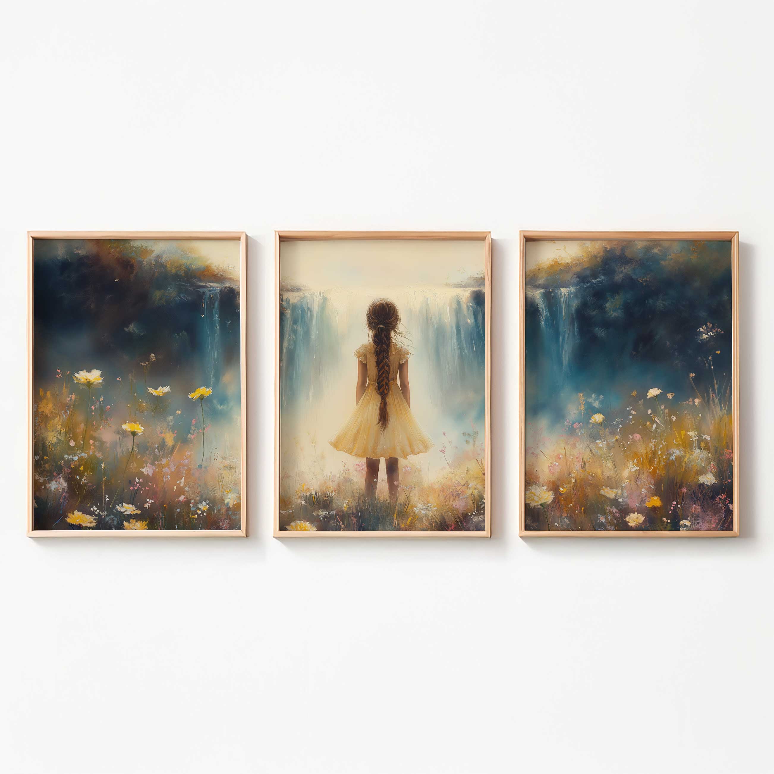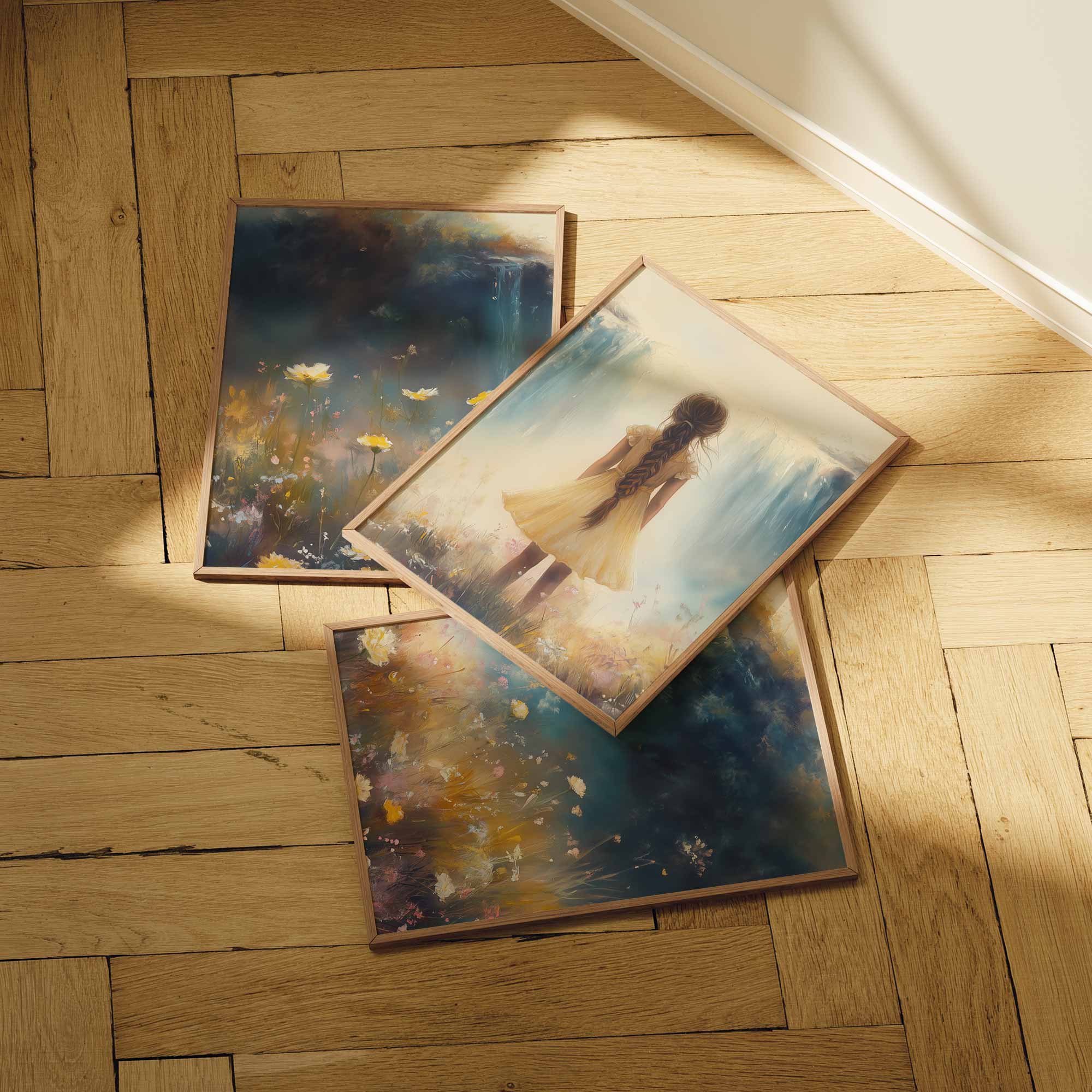 Terug naar collectie Posters Zacht Dromerig Meisje bij Waterval en Bloemenveld