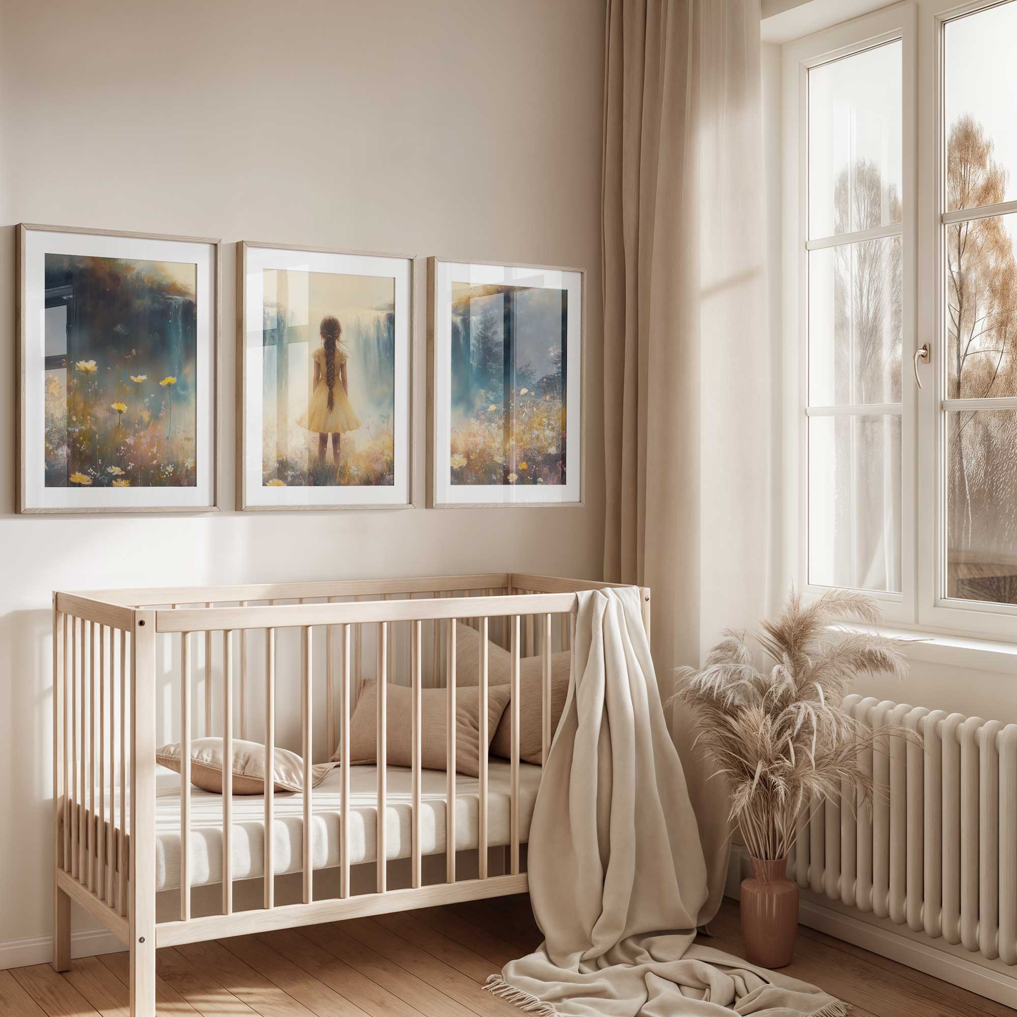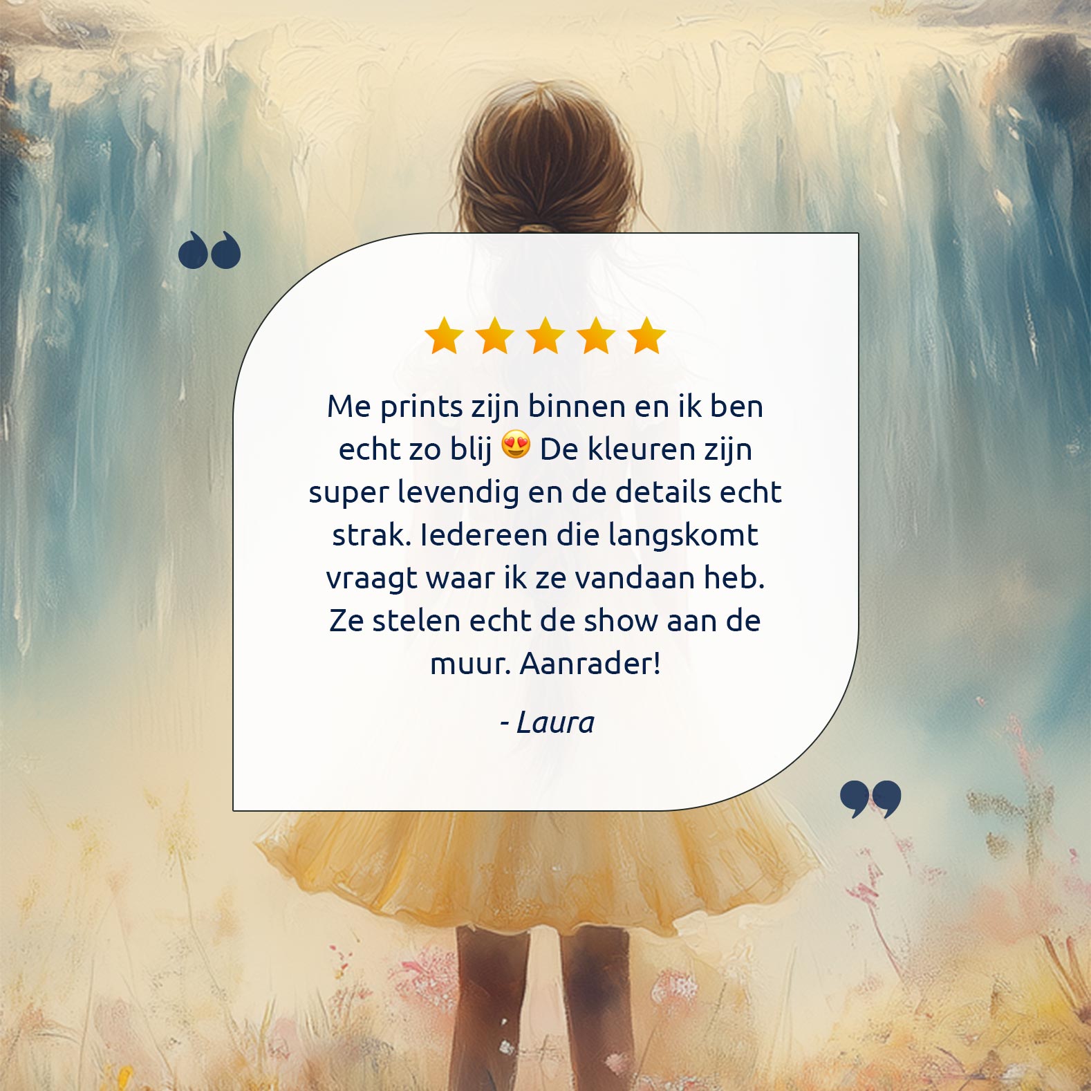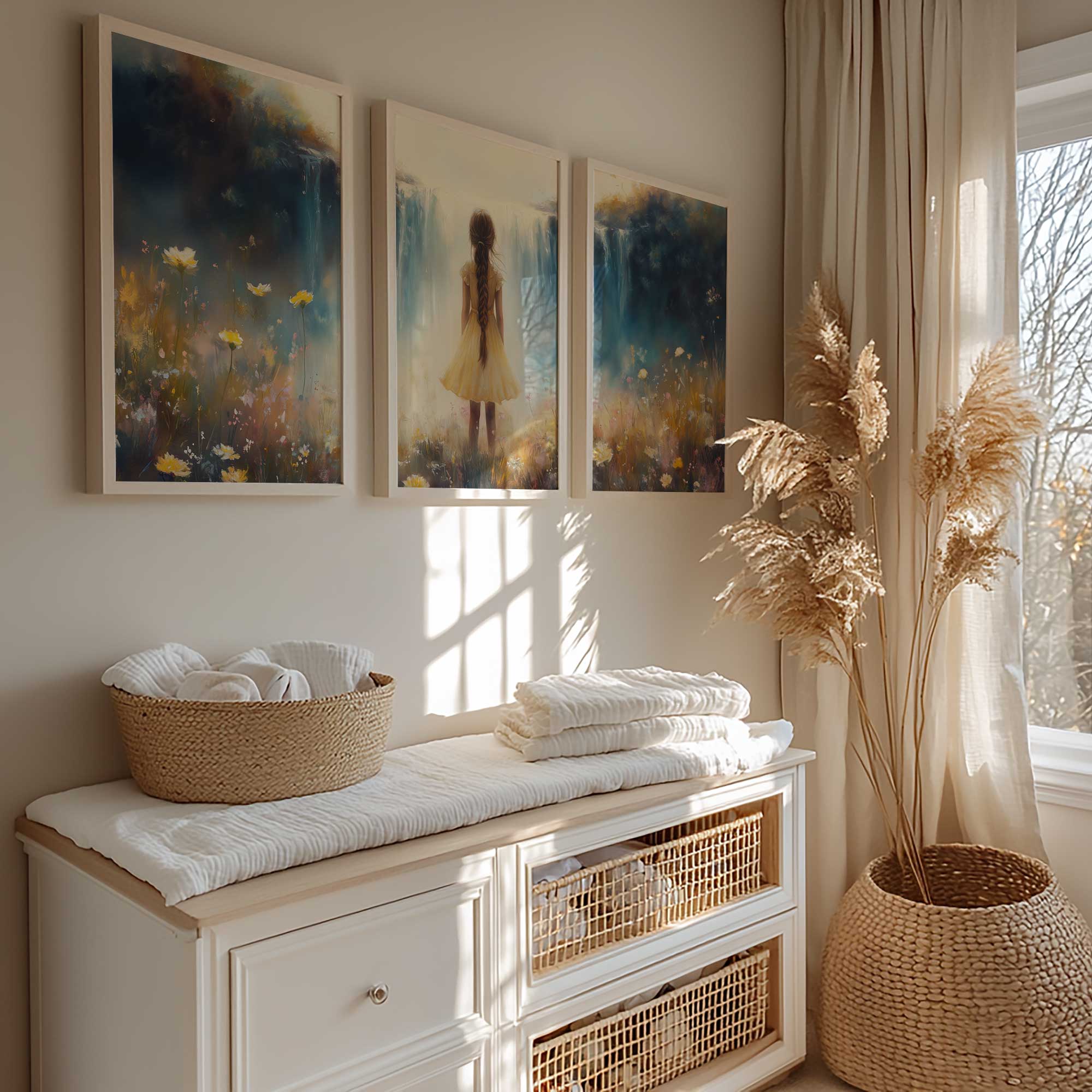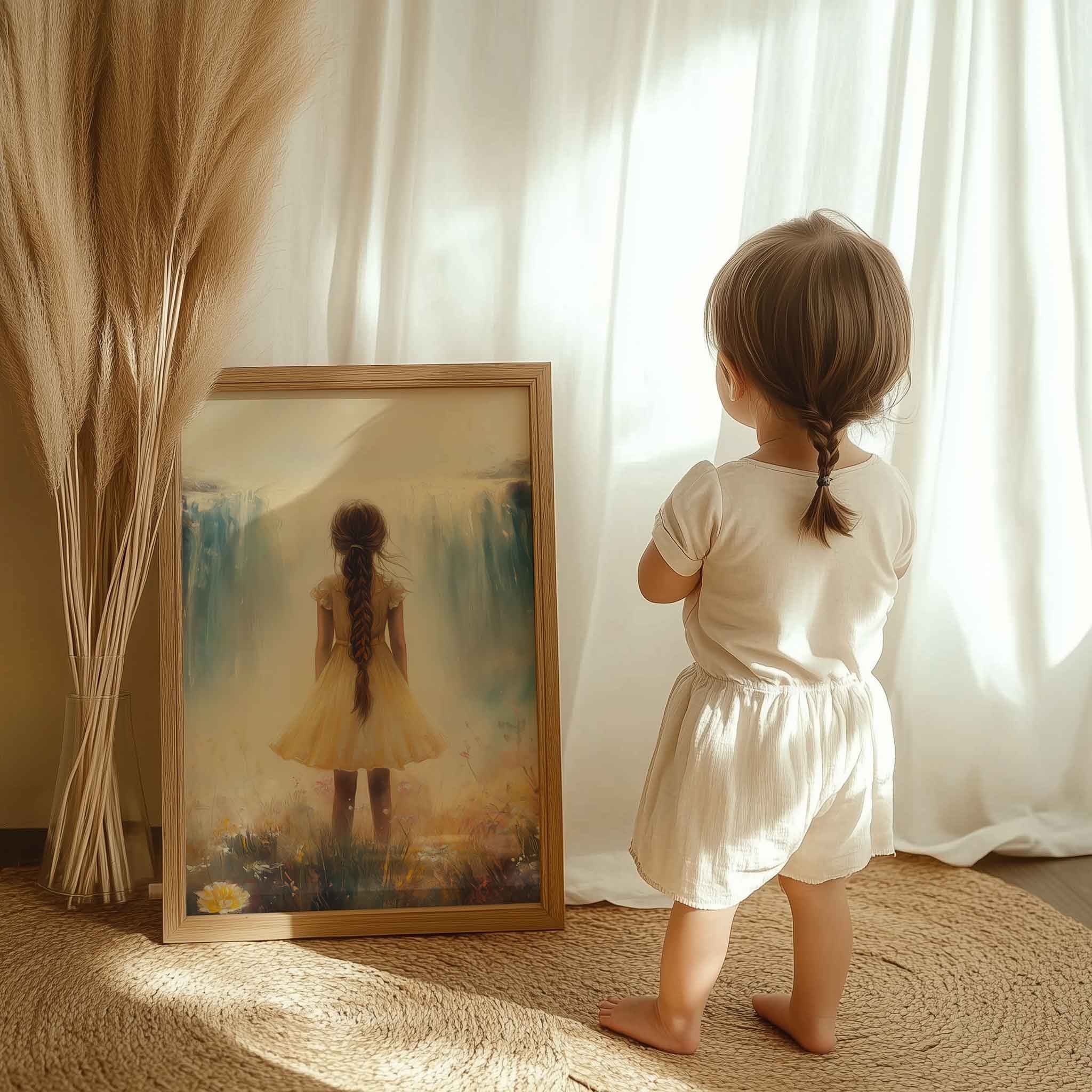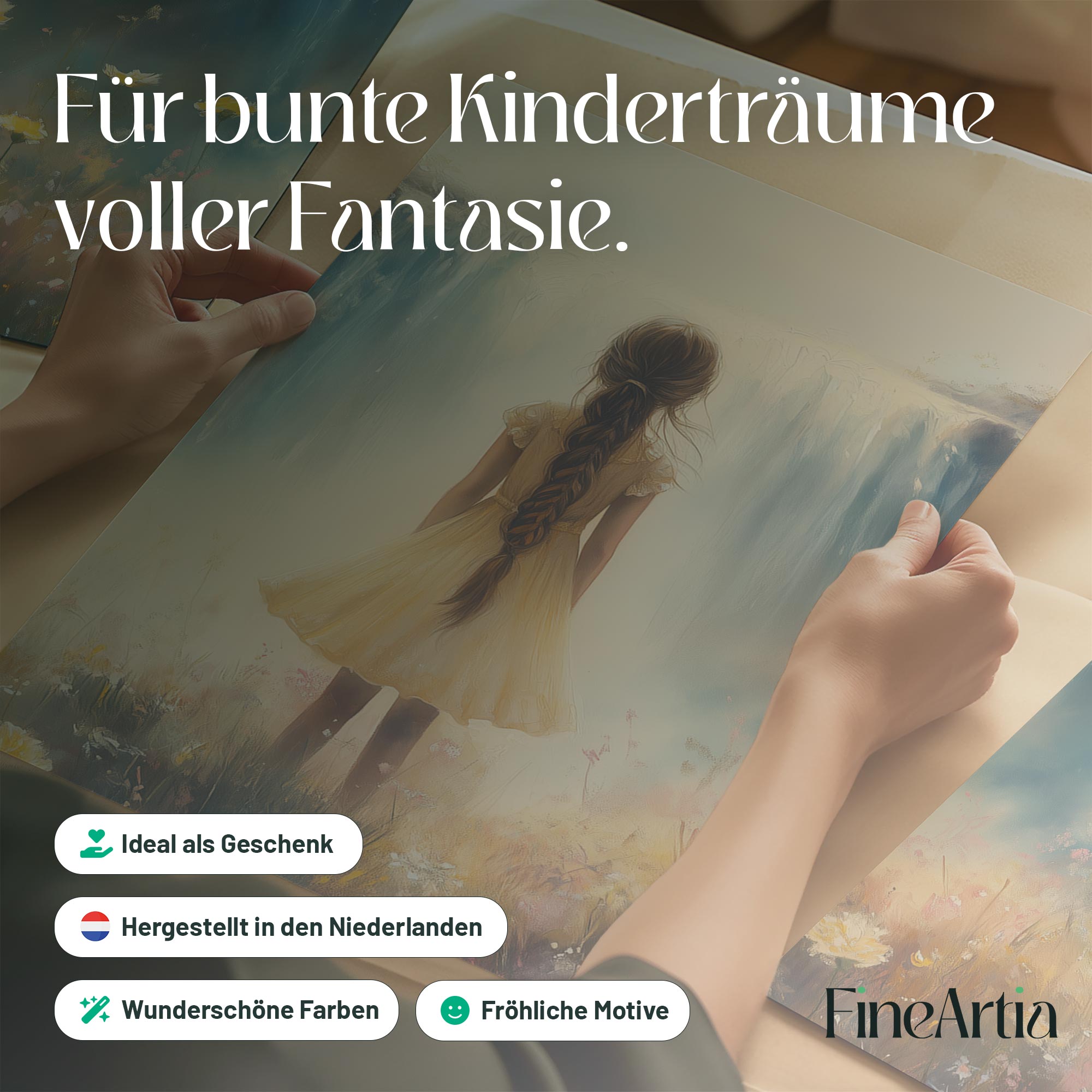 Terug naar collectie Posters Zacht Dromerig Meisje bij Waterval en Bloemenveld
