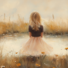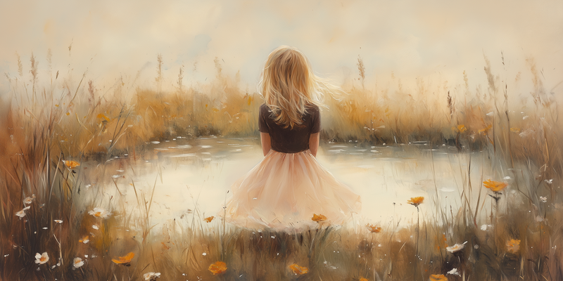 Zacht Dromerig Meisje in Bloemenveld bij Vijver