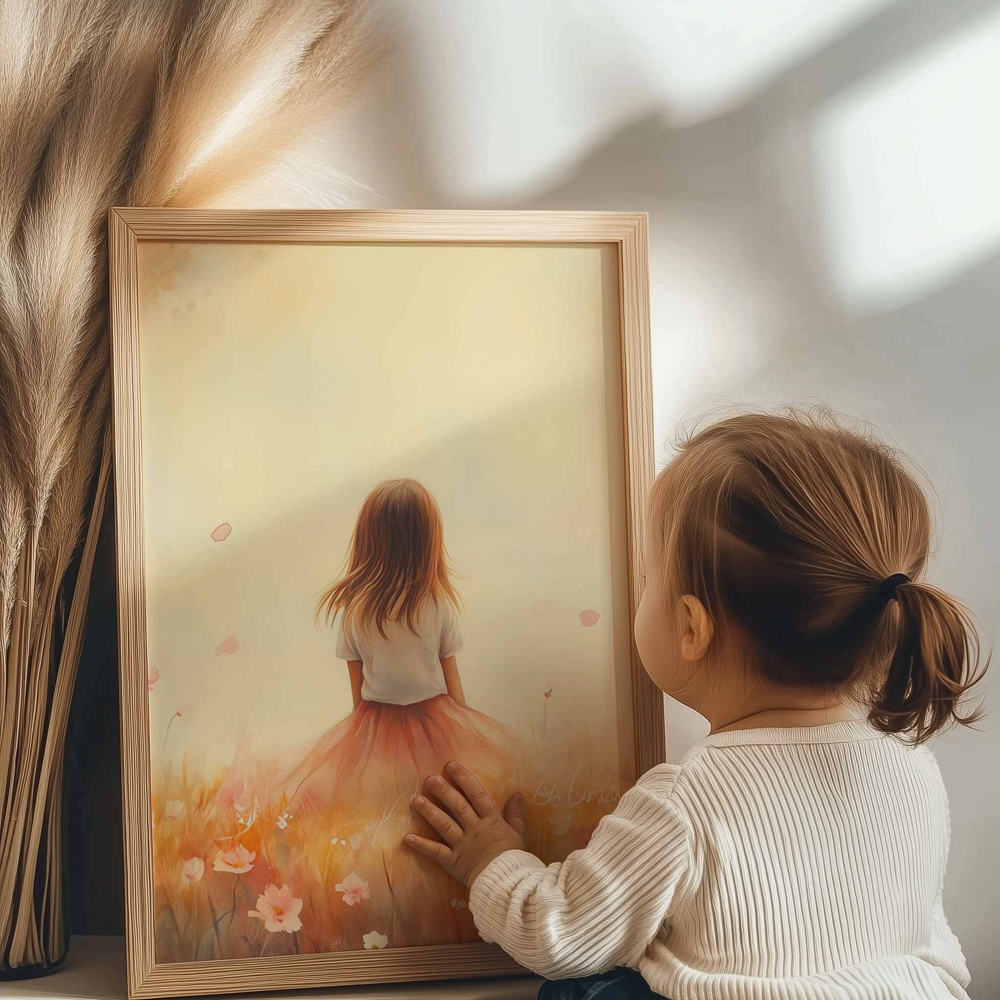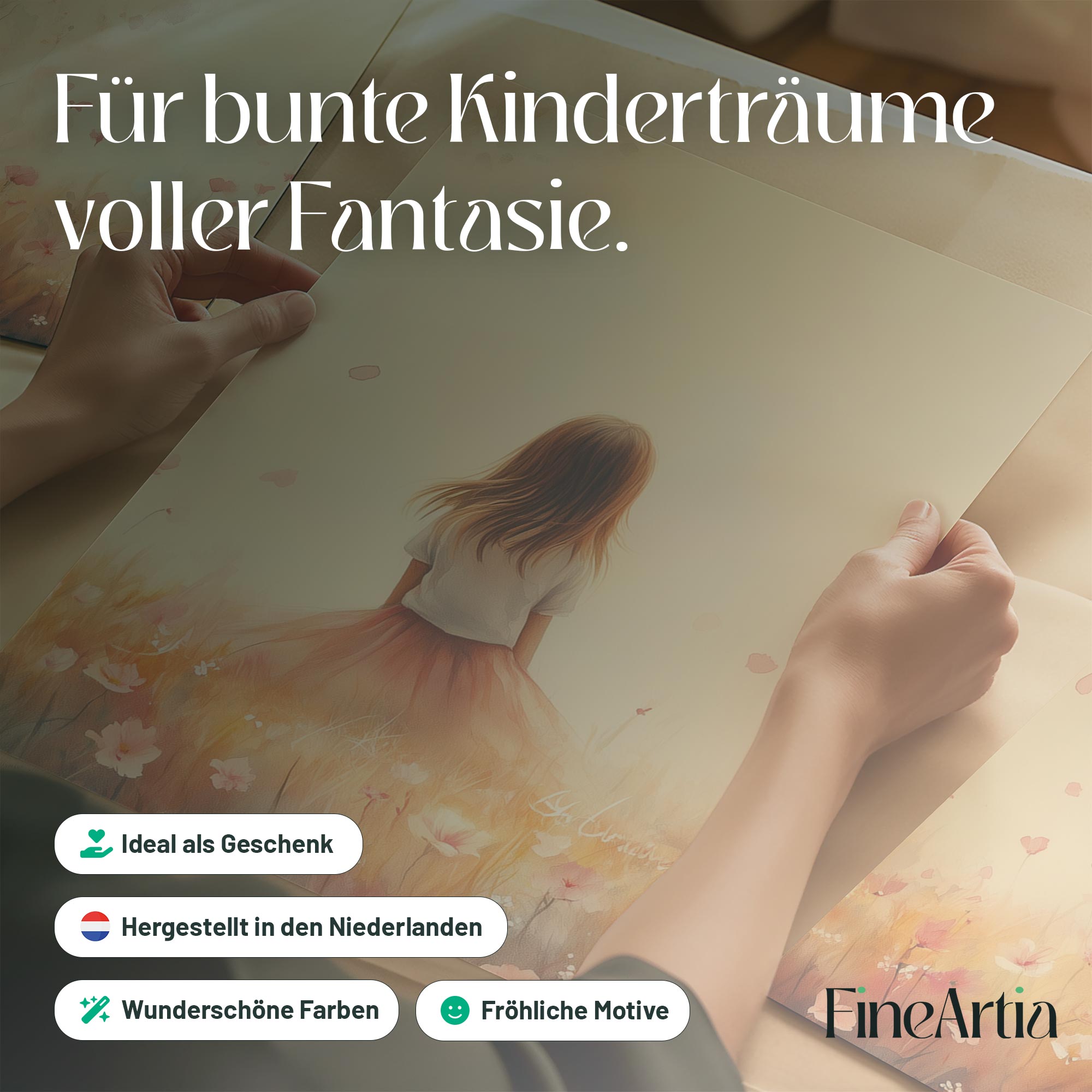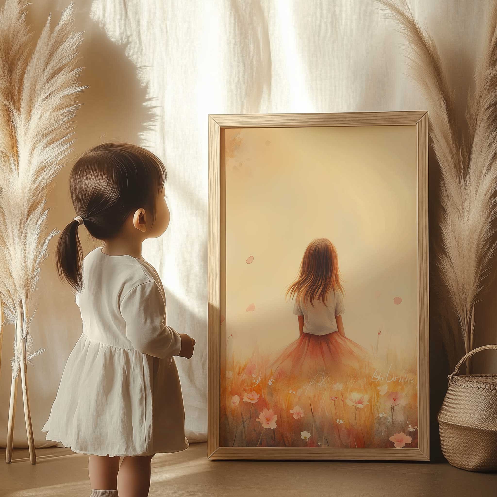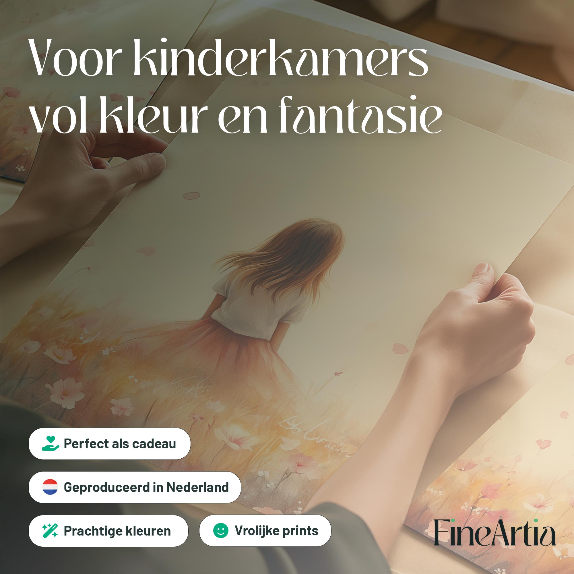 Terug naar collectie Posters Zacht Dromerig Meisje in Bloemenveld – Pastel Sfeer