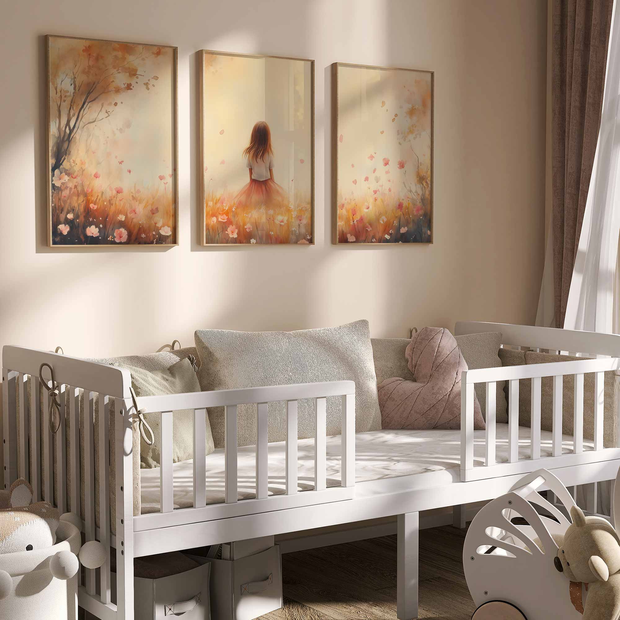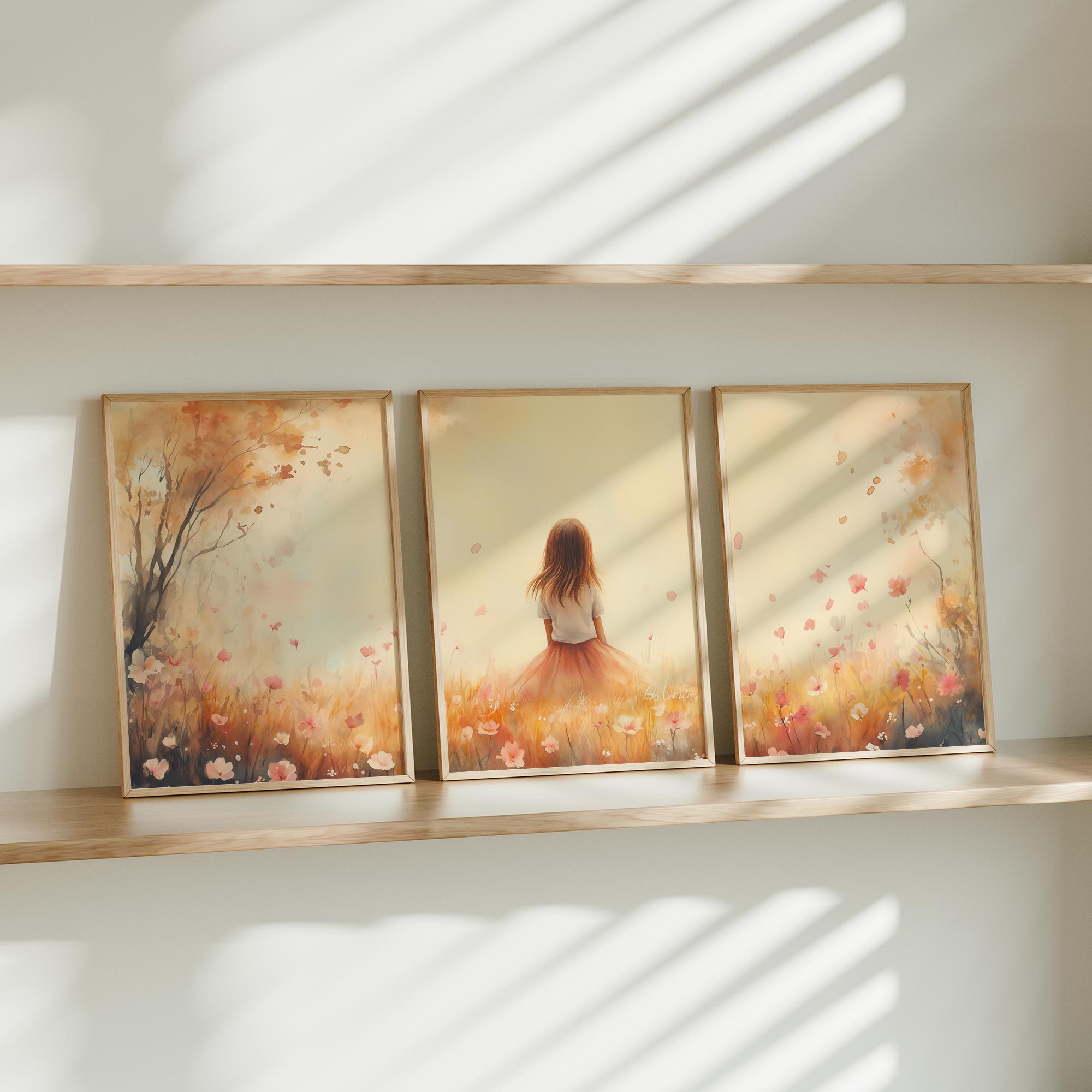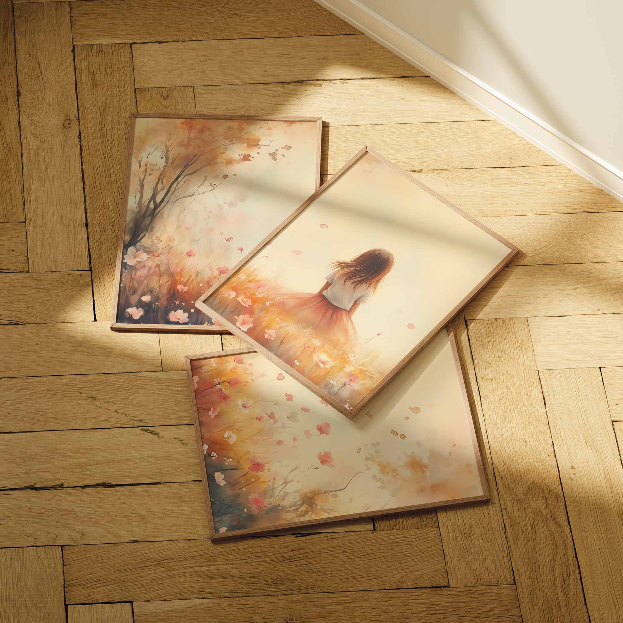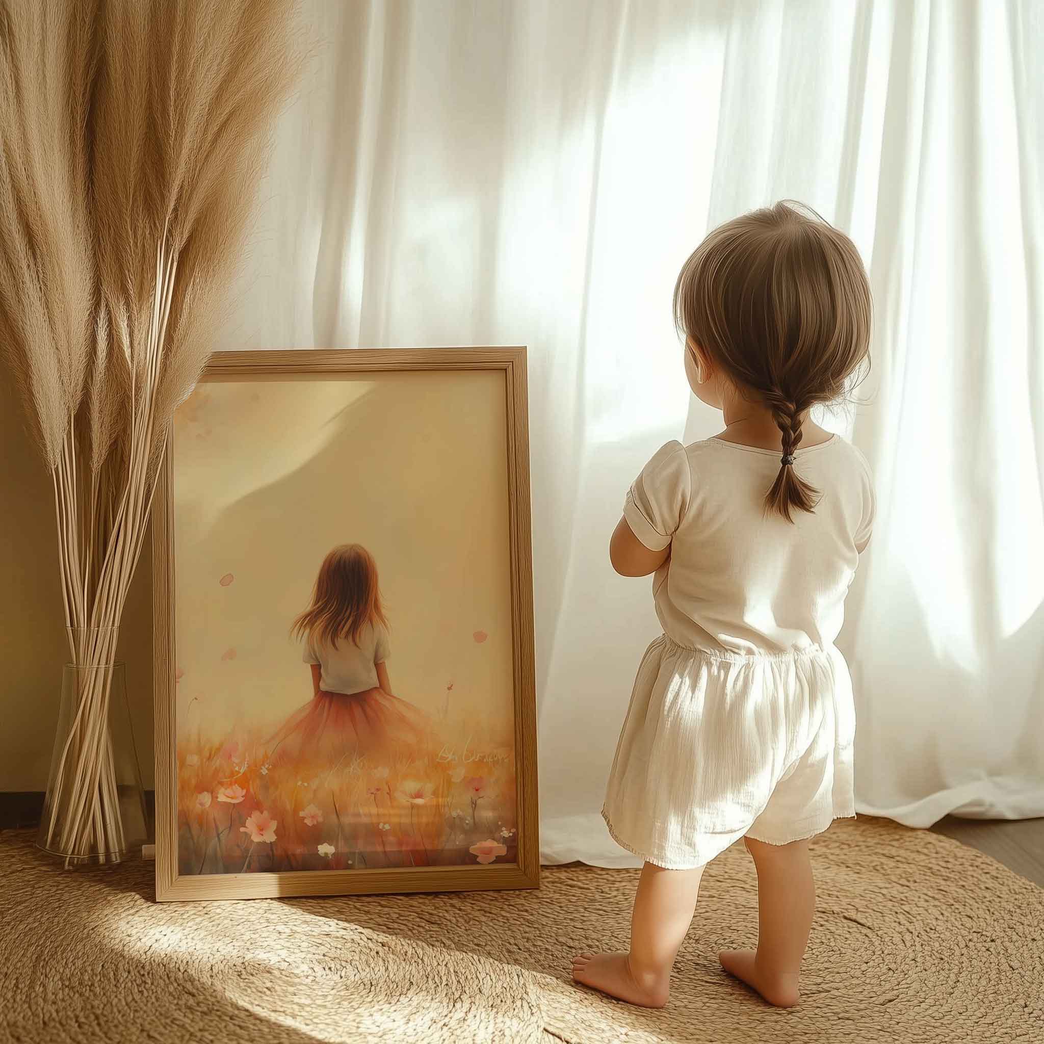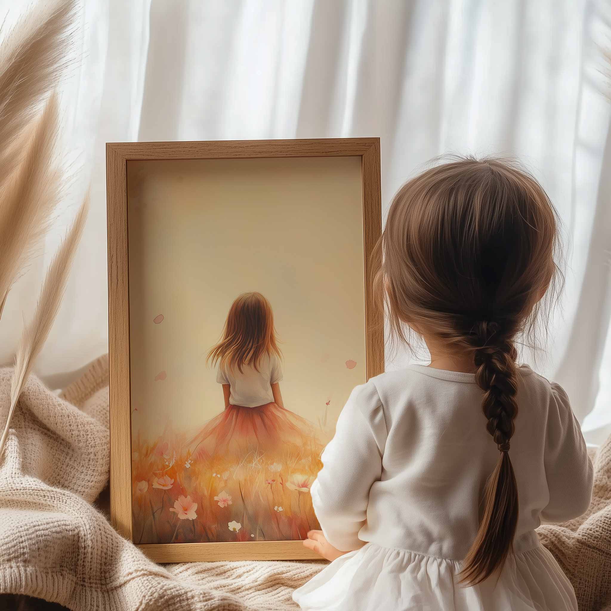 Terug naar collectie Posters Zacht Dromerig Meisje in Bloemenveld – Pastel Sfeer
