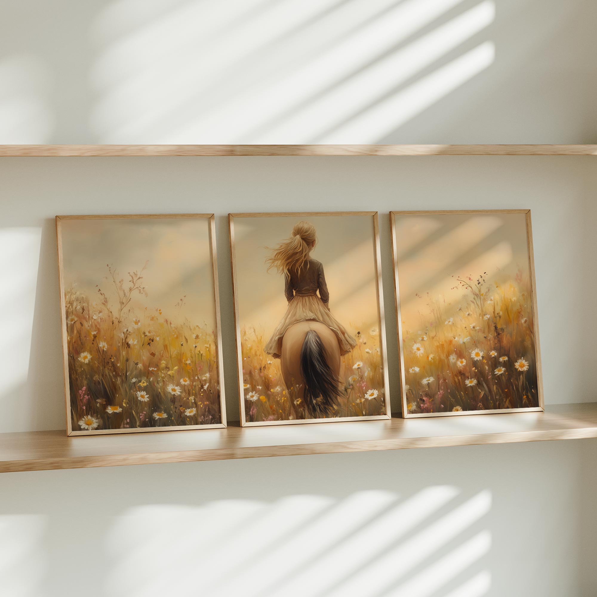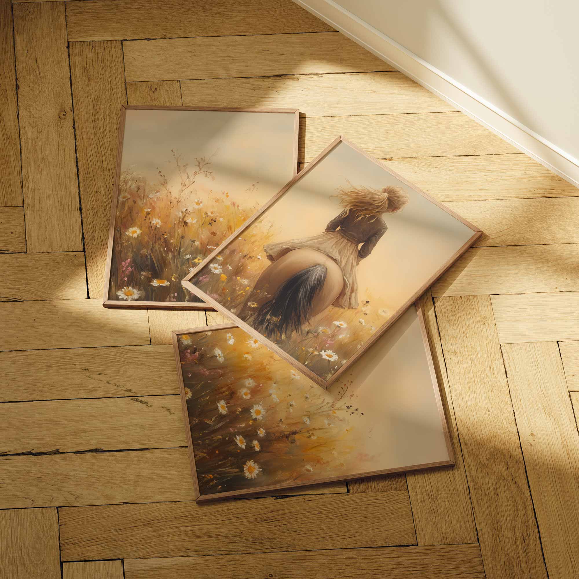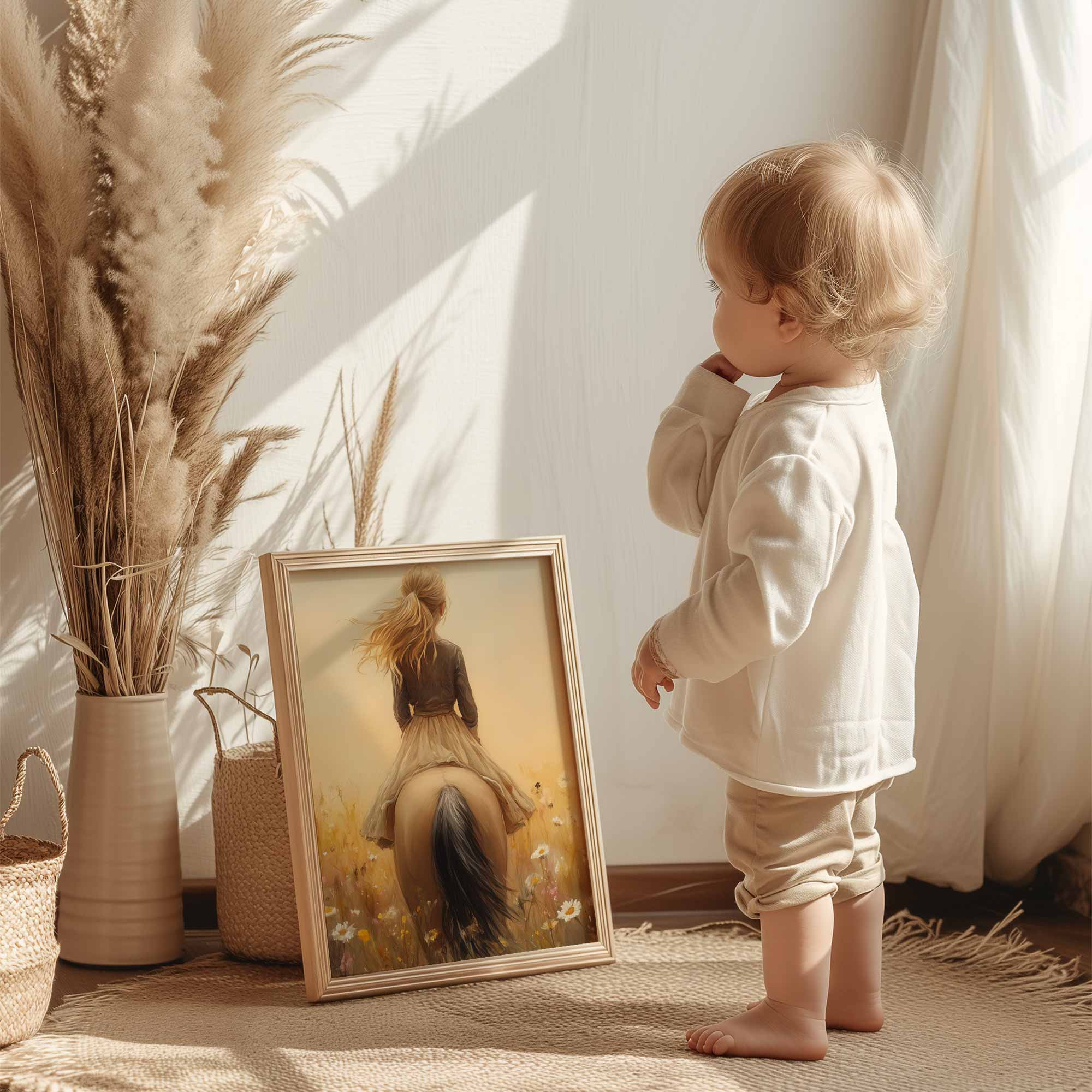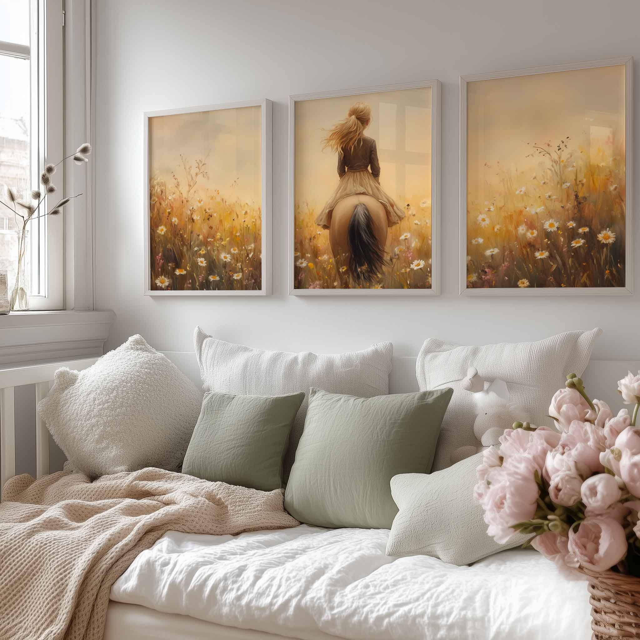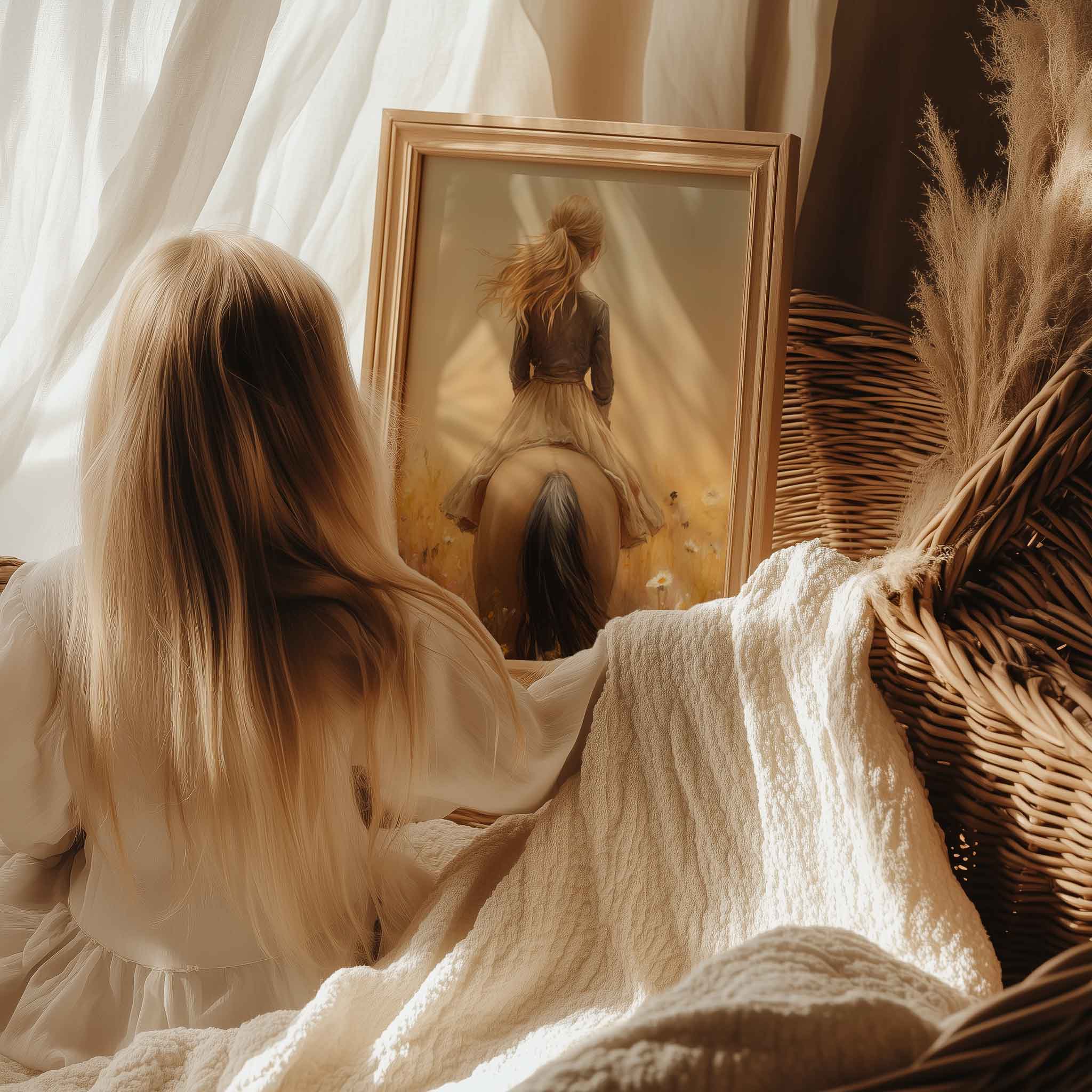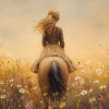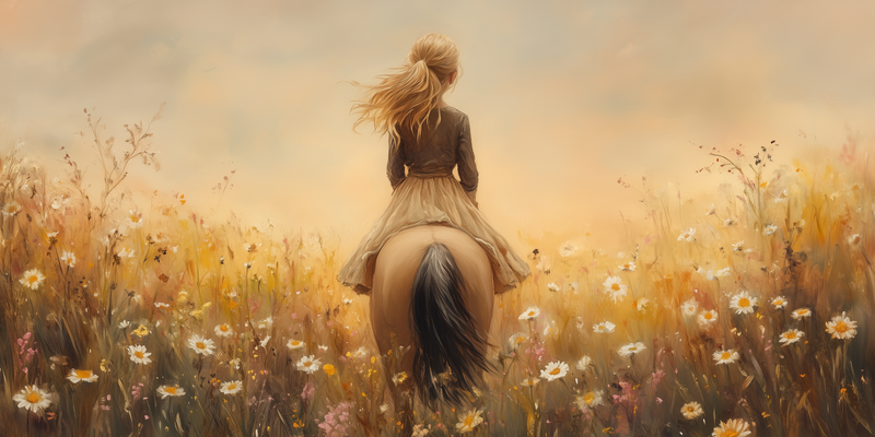 Zacht Dromerig Tafereel: Vrouw te Paard in Bloemenveld