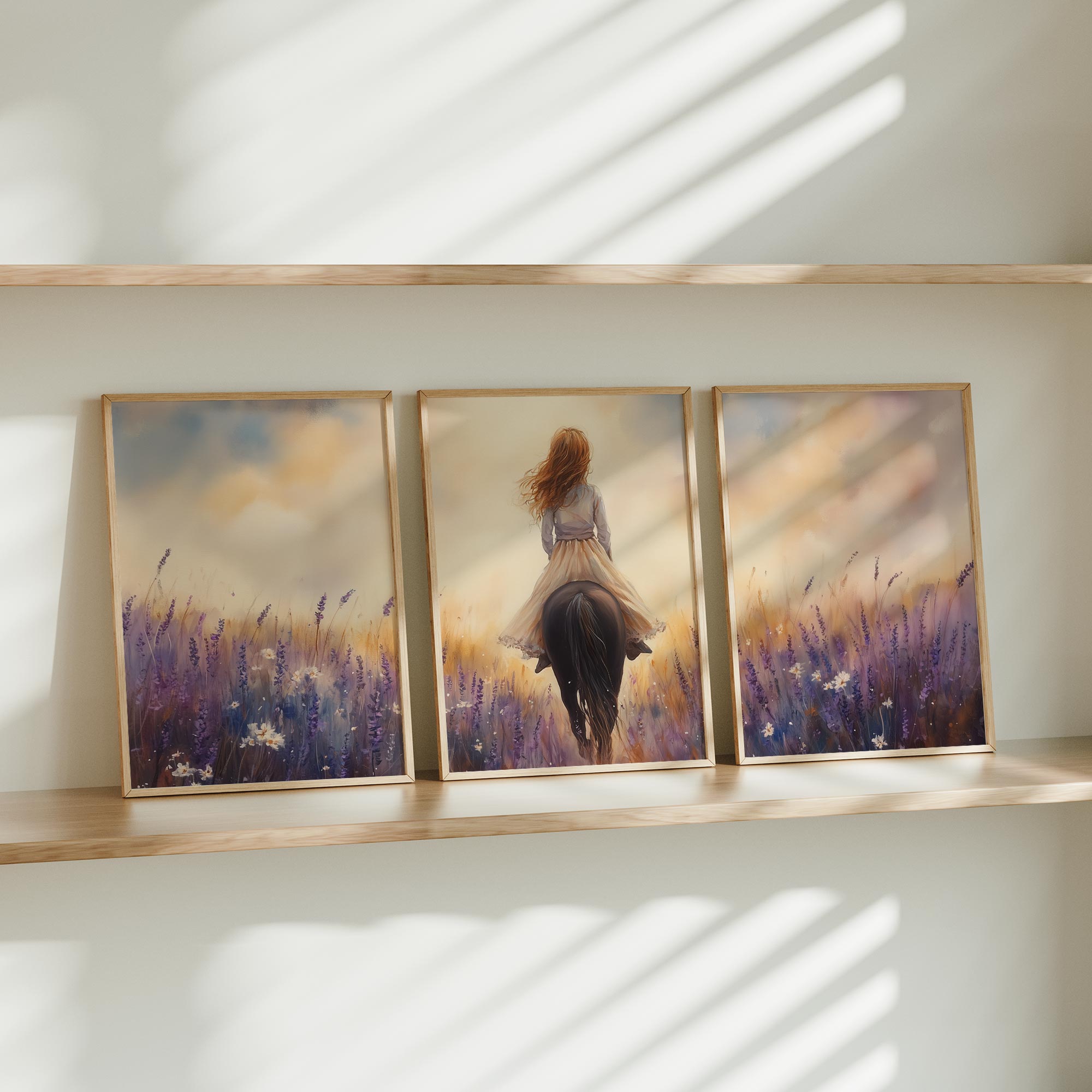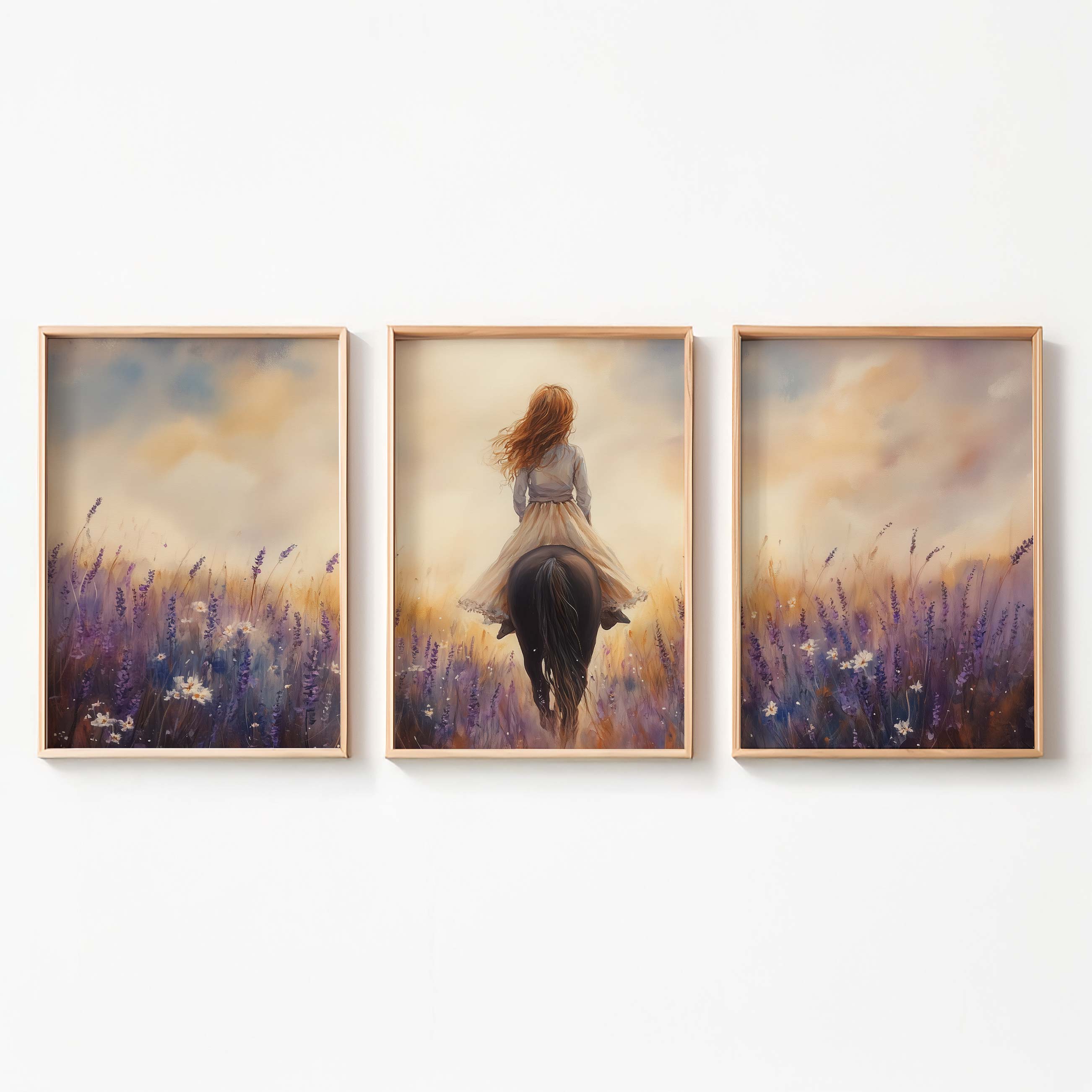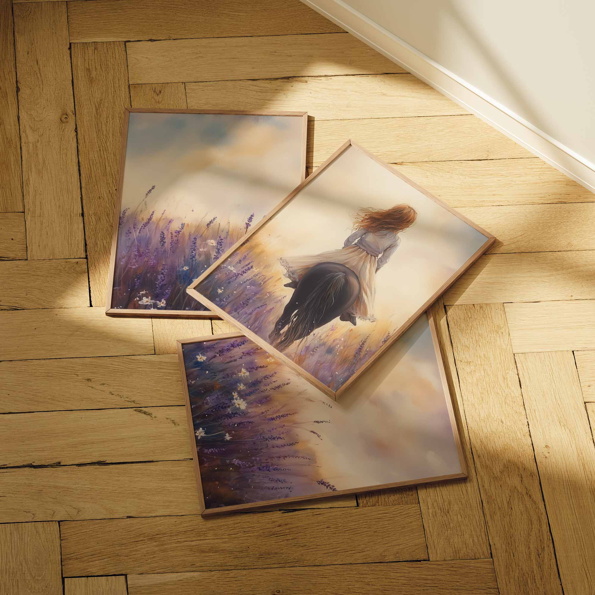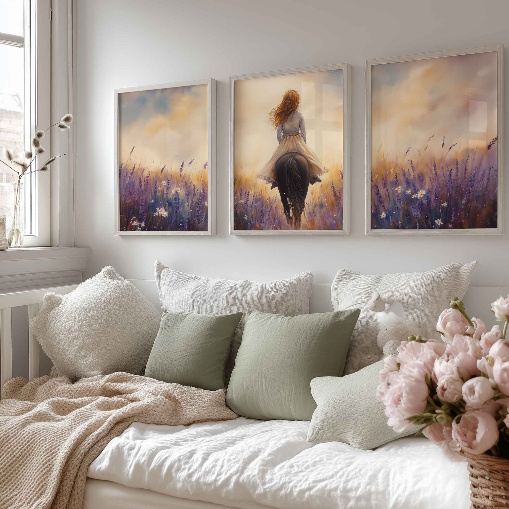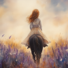 Terug naar collectie Posters Zacht Droombeeld: Vrouw te Paard in Bloemenveld