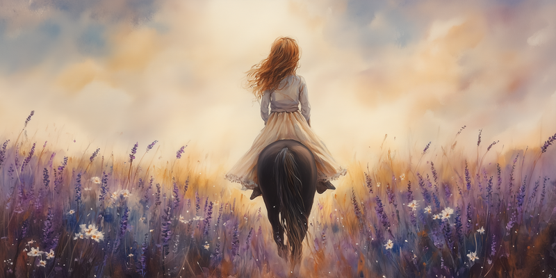 Zacht Droombeeld: Vrouw te Paard in Bloemenveld