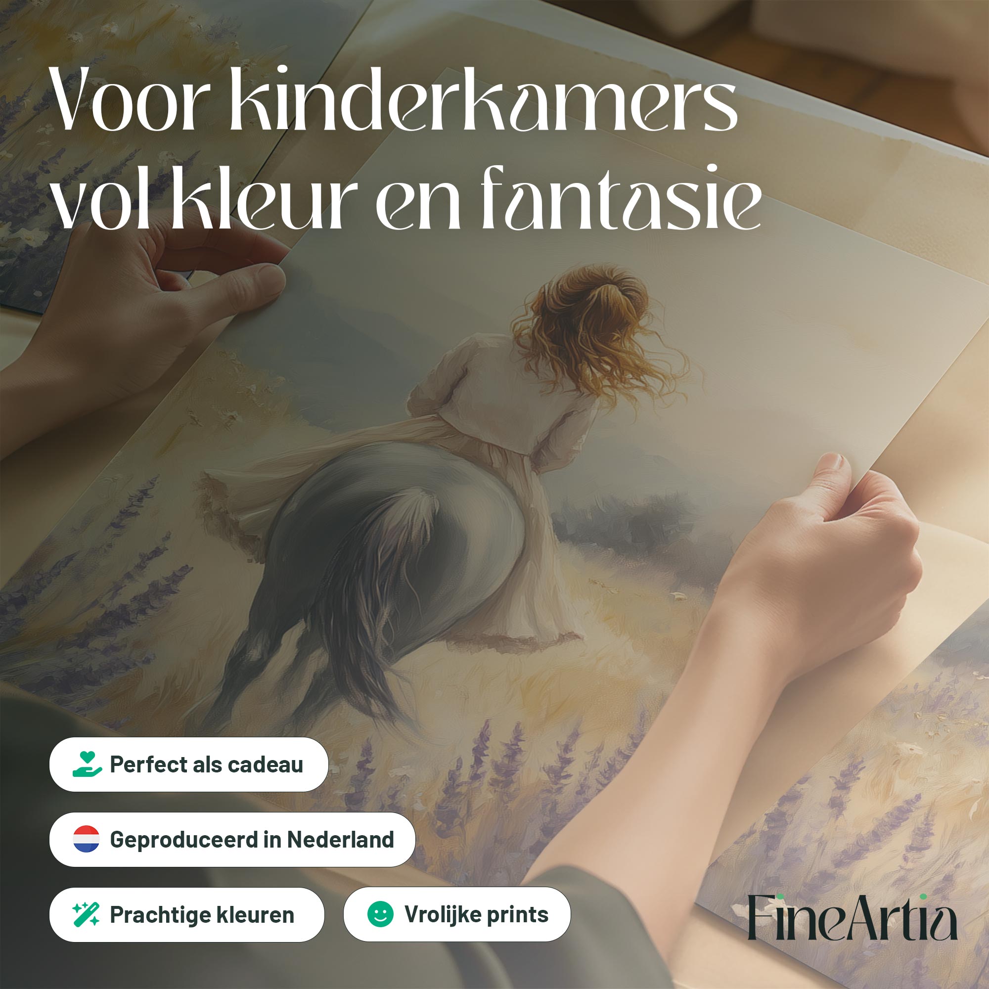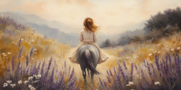 Zacht Droomlandschap: Dame te Paard in Bloemenveld