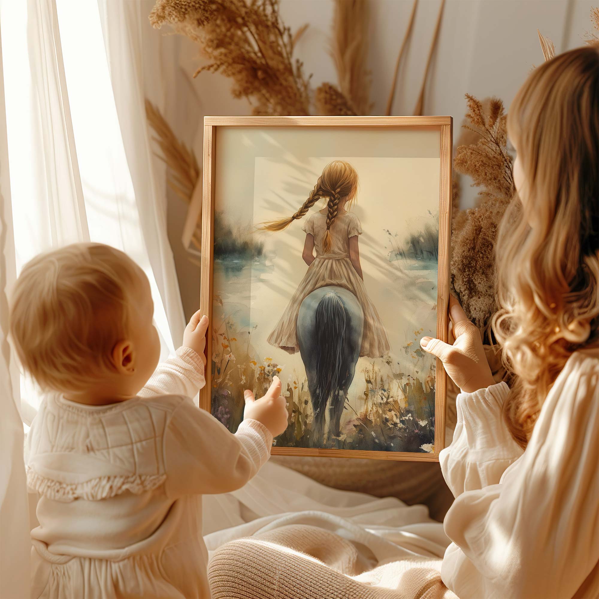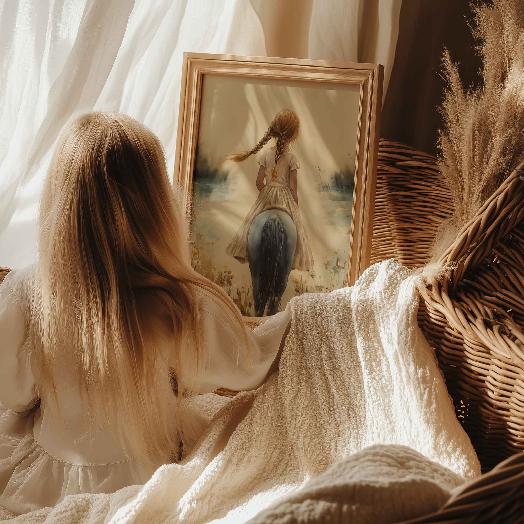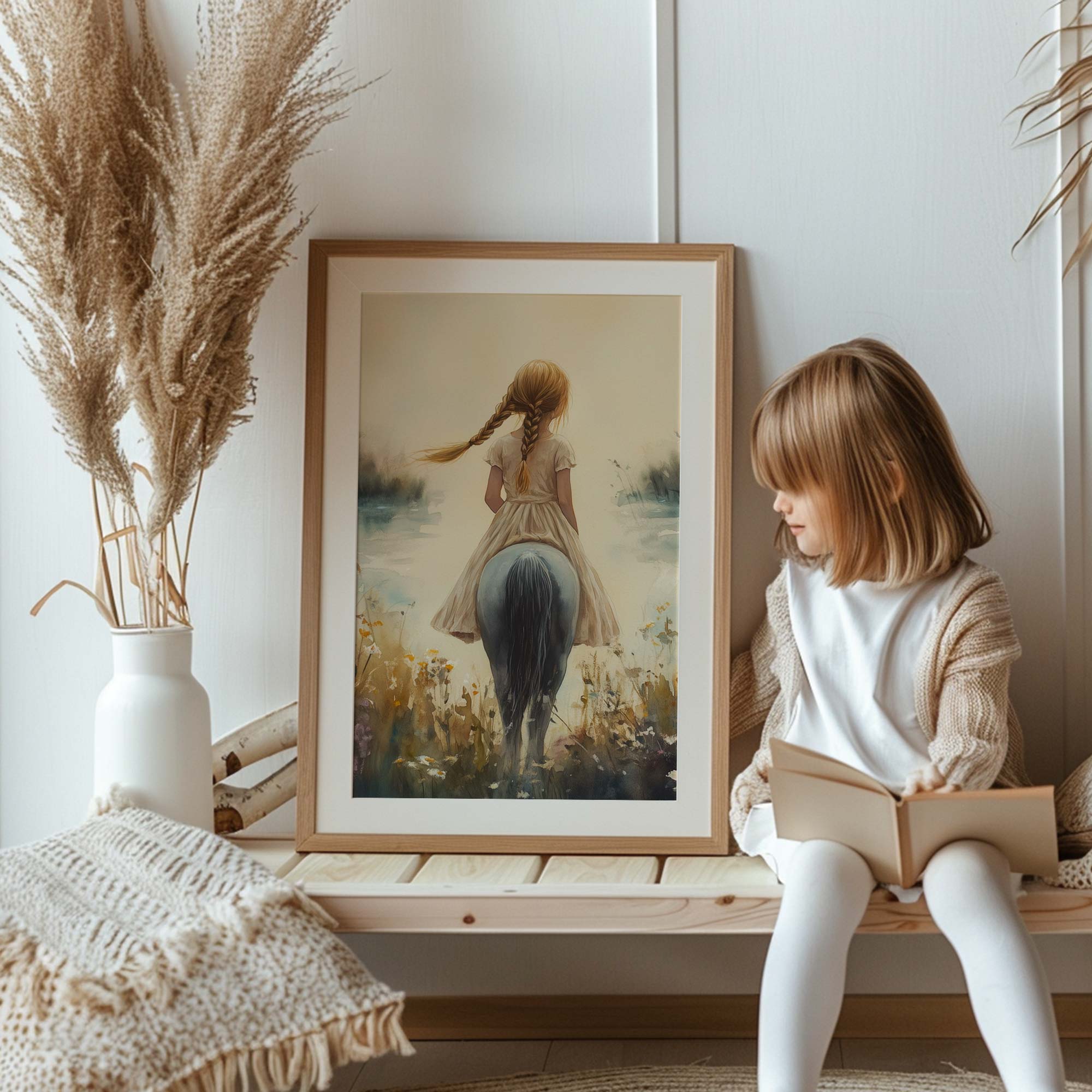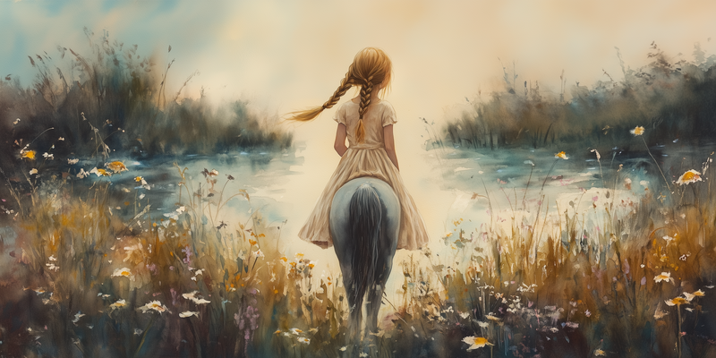 Zacht Droomlandschap: Meisje en Paard in Bloemenveld