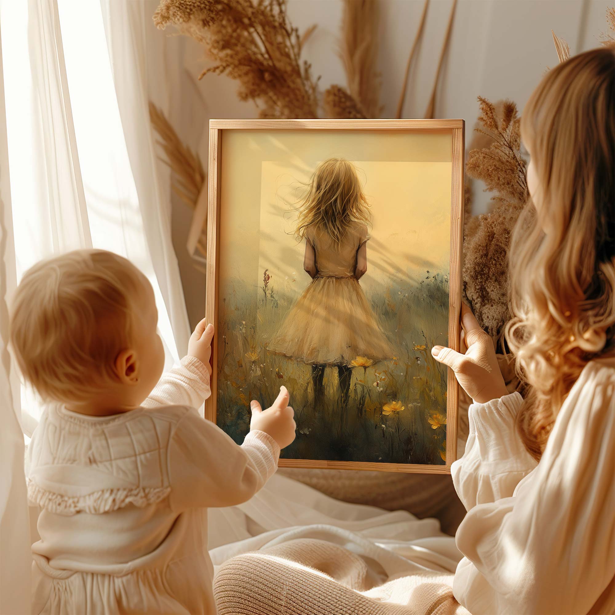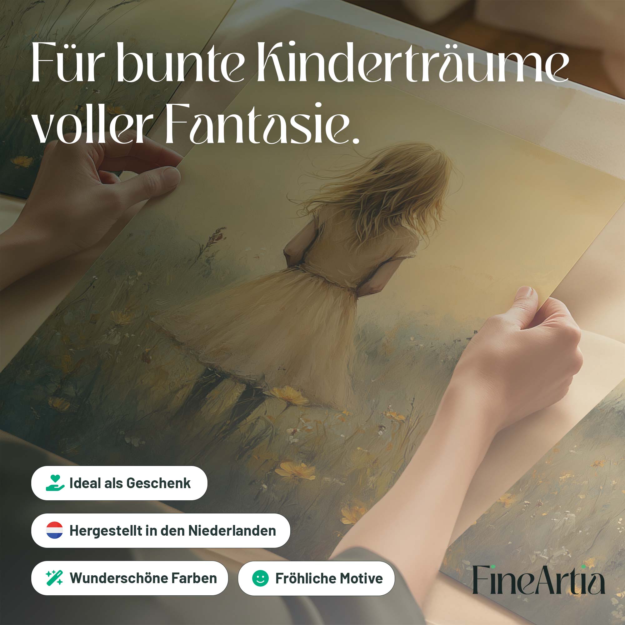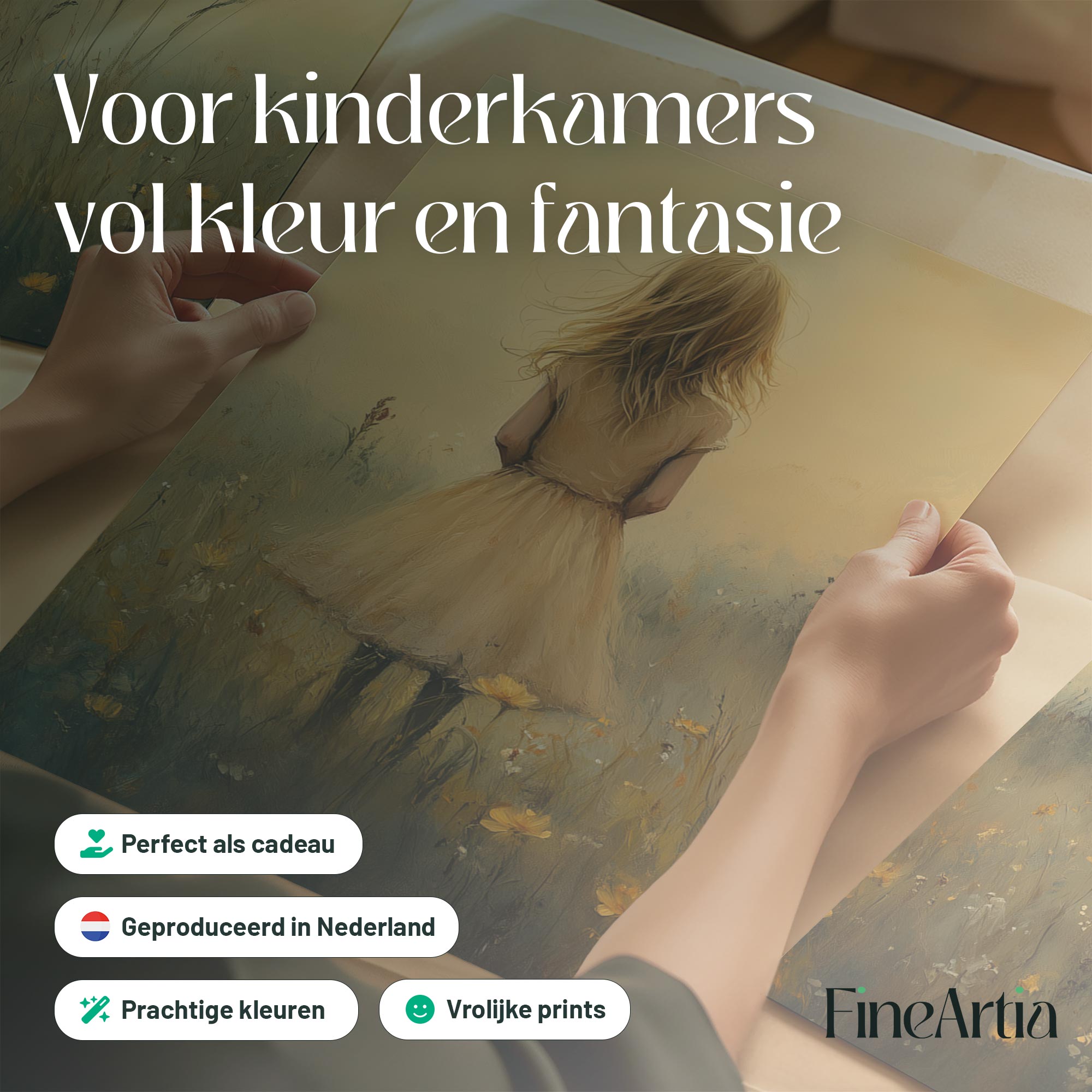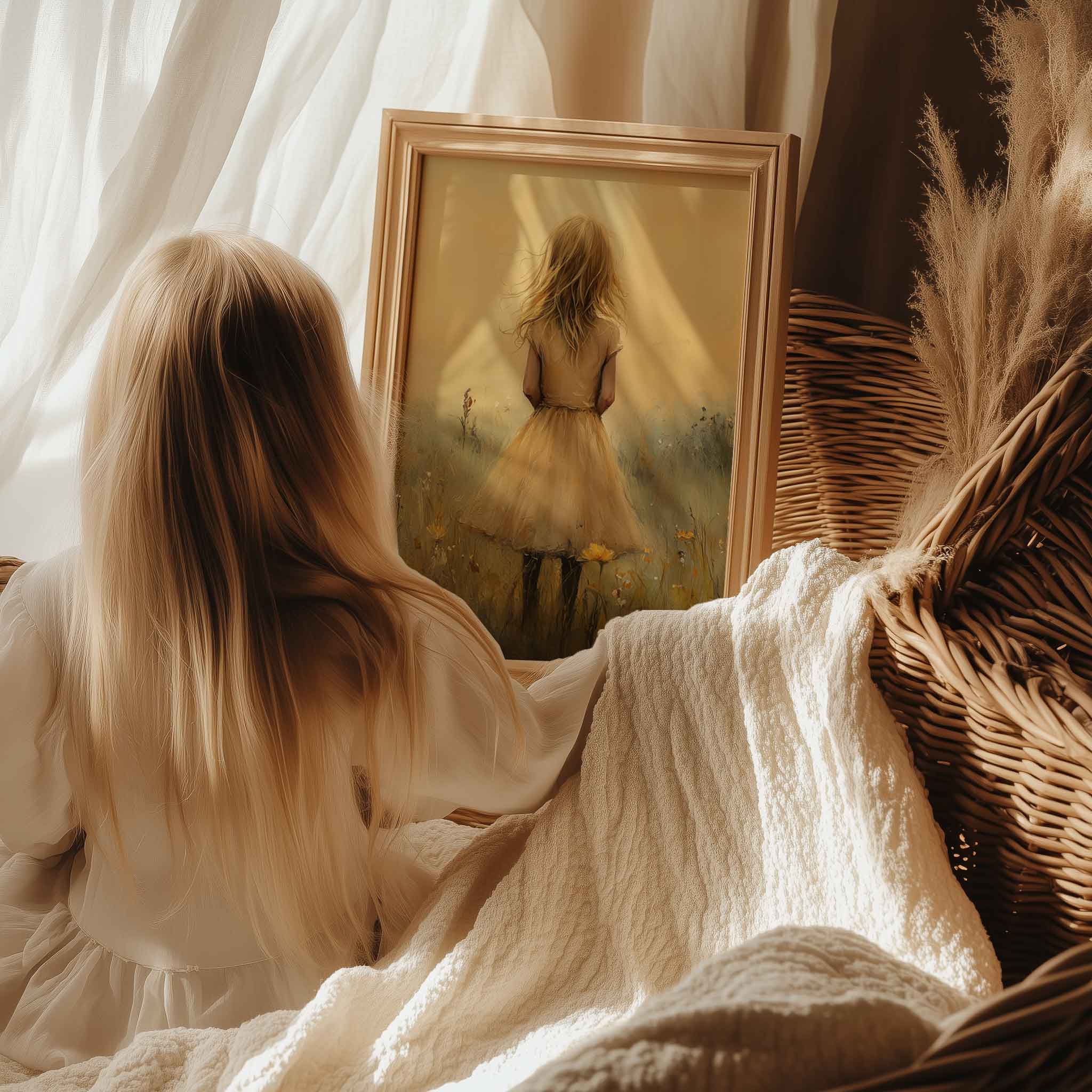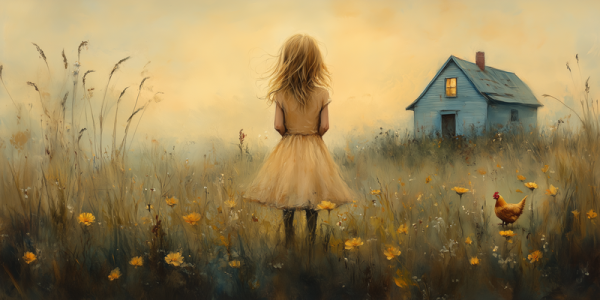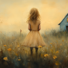 Zacht Geel Meisje in Bloemenveld met Blauw Huis
