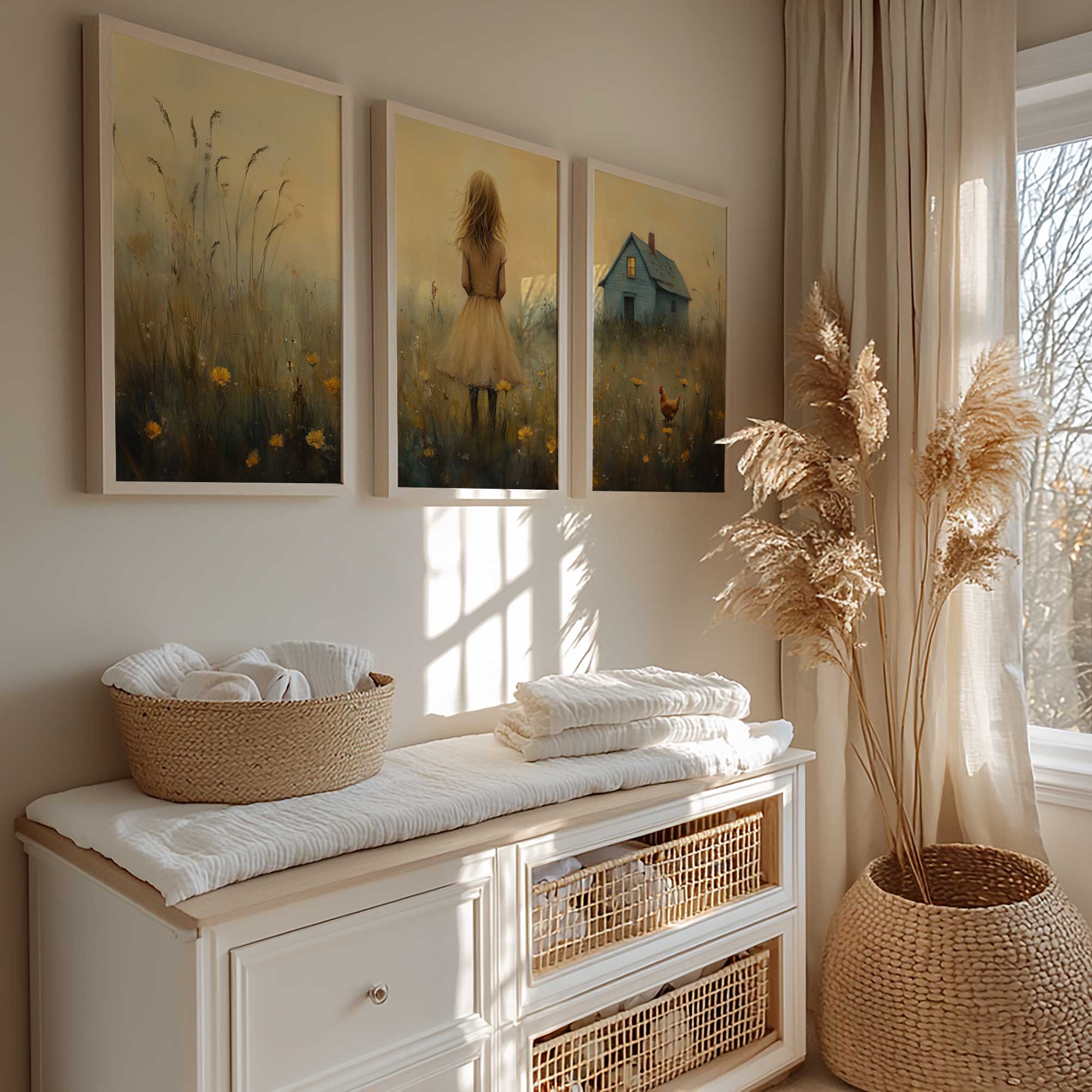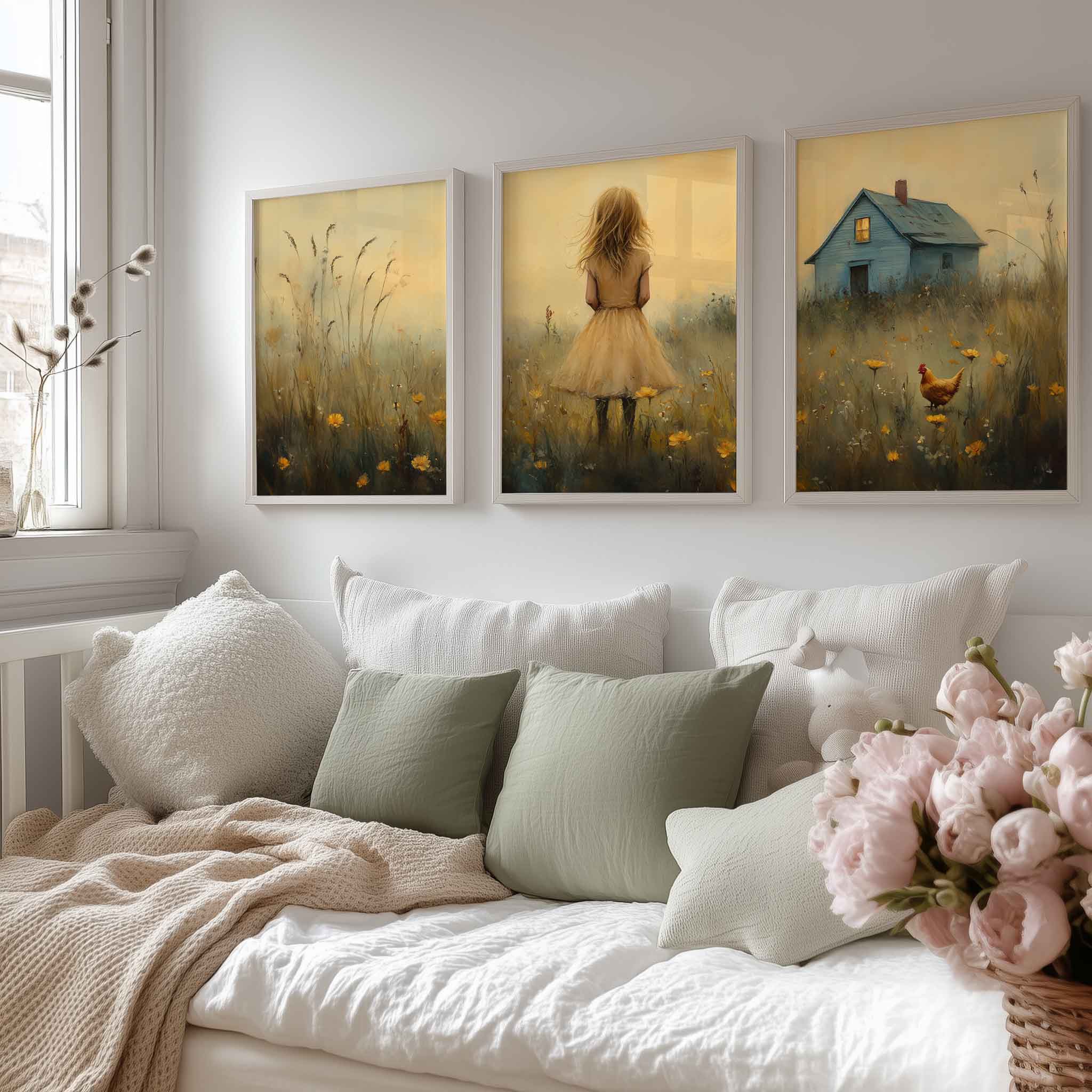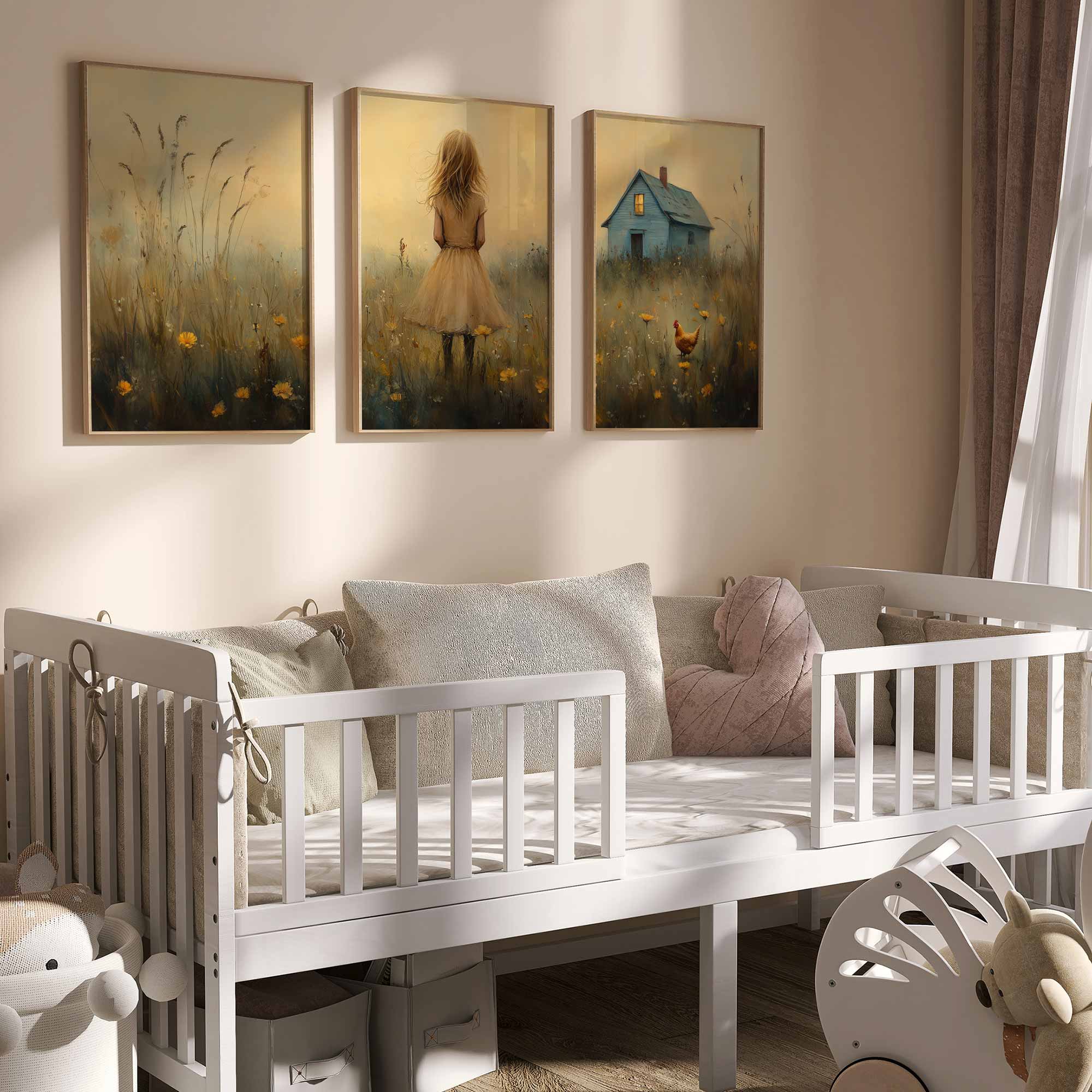 Zacht Geel Meisje in Bloemenveld met Blauw Huis